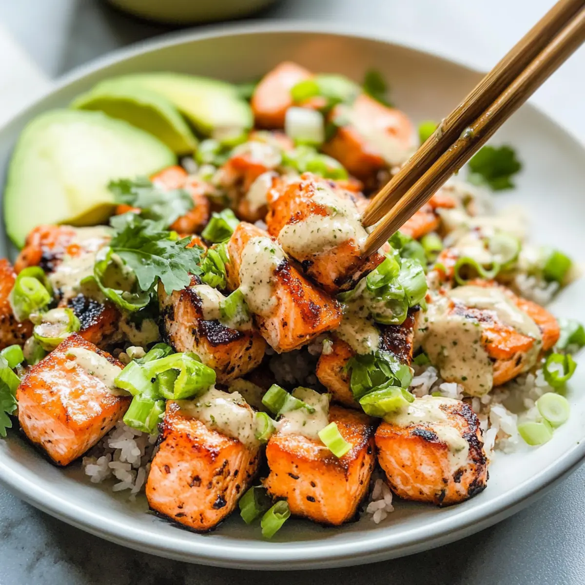 5. Once the salmon is cooked, plate it with rice, edamame, and diced avocado. Drizzle with Bang Bang sauce and garnish with cucumber, green onions, and cilantro.
