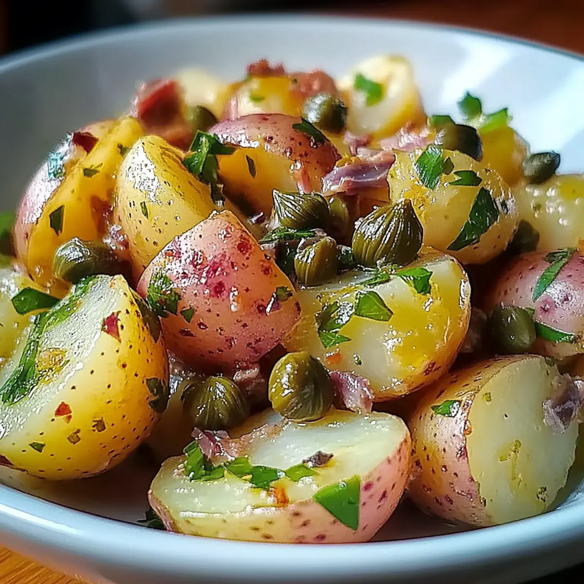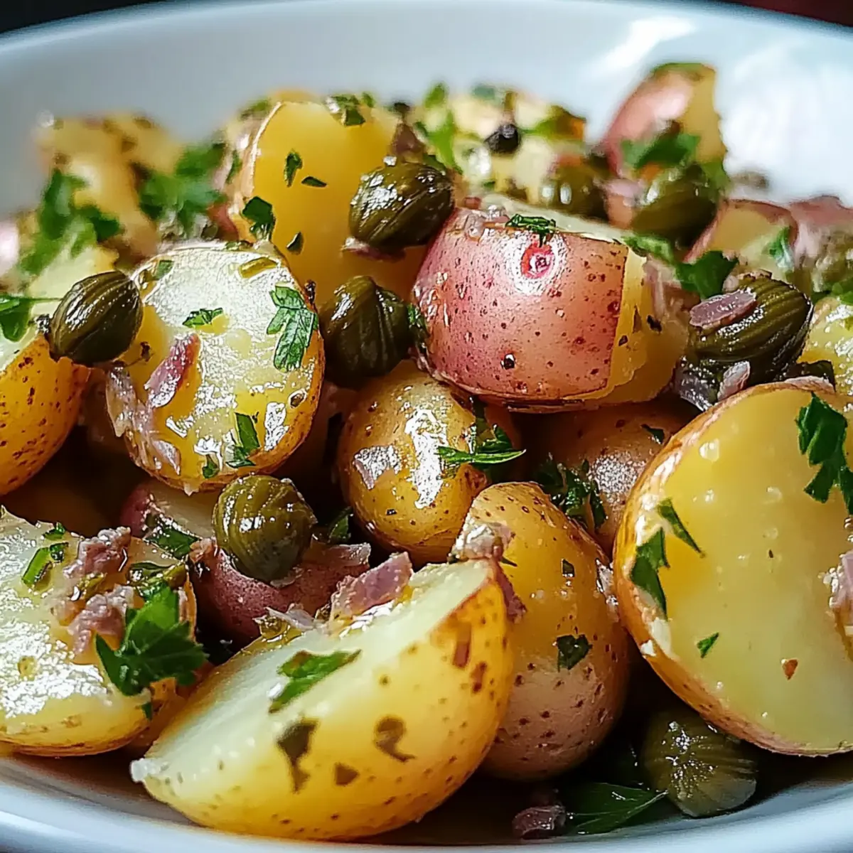 Jump to Recipe Print RecipeAs I stood in my kitchen, the sun streaming through the window, I felt that familiar spark of excitement—today, I was making Anchovy Caper Potato Salad. This Mediterranean-inspired dish is a delightful harmony of tender baby potatoes, briny anchovies, and zesty capers that elevates a simple side into something truly special. Unlike those heavy mayo-based versions, this salad shines with quality olive oil, making it heart-healthy and vibrant. It’s as perfect for summer barbecues as it is for weeknight dinners, offering a quick prep that’s sure to impress your guests and perfect for meal prep since it intensifies in flavor after chilling. Are you curious about how to put this delicious salad together? Keep reading to discover the details! What Makes This Salad a Must-Try? Uniqueness: This Anchovy Caper Potato Salad stands out for its bold Mediterranean flavors that redefine traditional potato salads. Health-Conscious: With heart-healthy fats from extra virgin olive oil and no mayo, it’s a guilt-free indulgence that fits perfectly into a healthy lifestyle. Easy to Prepare: The straightforward steps make it accessible for anyone, whether you’re a seasoned chef or just starting out in the kitchen. Flavor Boosting: Letting the salad chill enhances its flavor, perfect for make-ahead meals—just whip it up a day in advance for a tastier dish! Versatile Options: You can easily customize it with variations like Summer Mediterranean or Herb-Crusted, making it adaptable for any occasion! If you’re looking to accompany this dish with other fresh flavors, consider making a refreshing Tomato Salad Refreshing or a zesty Watermelon Cucumber Salad to elevate your meal further! Anchovy Caper Potato Salad Ingredients For the Salad Baby Potatoes – Choose waxy varieties like fingerlings or red potatoes for a creamy texture that holds up well. Anchovies – Packed in olive oil, they lend a wonderful umami richness to the dressing without a fishy taste. Capers – Their briny flavor enhances the salad; opt for firm capers in brine for the best texture. Fresh Parsley – Essential for both garnish and flavor; avoid dried parsley to maintain vibrancy. For the Dressing Extra Virgin Olive Oil – The heart-healthy fat in this recipe adds richness and depth; choose high-quality oil for the best results. Red Wine Vinegar – Adds a necessary acidity to balance the flavors; adjust to your taste for a refreshing lift. This Anchovy Caper Potato Salad is a delightful twist on the classic, making it perfect for those looking for a Mediterranean-inspired dish! Step‑by‑Step Instructions for Anchovy Caper Potato Salad Step 1: Prepare Potatoes Begin by filling a large pot with water and adding enough salt to make it taste like the sea. Bring the water to a rolling boil over high heat. Once boiling, add the halved baby potatoes and cook them for about 12 to 15 minutes. You’ll know they’re done when you can easily pierce them with a fork, but they should remain firm and not fall apart. Step 2: Make Dressing While the potatoes are cooking, grab a medium bowl and whisk together 1/2 cup of extra virgin olive oil and 2 tablespoons of red wine vinegar until the mixture is smooth and well-combined. The rich aroma of the olive oil should be enticing. Set the bowl aside as you prepare to add the anchovies and capers, allowing the dressing to infuse with flavor. Step 3: Mince Anchovies Take 4 to 6 anchovy fillets packed in olive oil and finely chop them on a cutting board until they form a paste. Add this anchovy paste to the bowl with the dressing, along with 2 tablespoons of capers and a small handful of chopped fresh parsley. Stir the mixture thoroughly so that all the ingredients are evenly incorporated into the flavorful dressing. Step 4: Combine Once the potatoes are perfectly cooked, carefully drain them in a colander and let them cool for about 5 minutes. This is the perfect time to allow them to absorb the flavors. Place the warm potatoes in a large mixing bowl and gently pour the creamy anchovy and caper dressing over them. Toss everything together softly to coat the potatoes evenly without breaking them apart. Step 5: Chill Salad After combining the salad, cover the bowl with plastic wrap or transfer it to a refrigerated container. Place the Anchovy Caper Potato Salad in the refrigerator for at least one hour. This chilling period lets the flavors meld beautifully, enhancing the overall taste. You’ll notice the salad becomes a harmonious blend of briny and fresh notes once it’s allowed to develop further. Make Ahead Options These Anchovy Caper Potato Salad is perfect for busy cooks looking to save time without sacrificing flavor! You can prepare the salad up to 24 hours in advance, allowing the vibrant flavors to blend beautifully while chilling. To make ahead, boil and cool the baby potatoes, then toss them lightly in the dressing to absorb some taste. Store the salad in an airtight container in the refrigerator for up to 3 days; this ensures it remains fresh and delicious. Just remember to give it a gentle stir before serving to reincorporate the dressing. With these simple prep tips, you’ll have a delightful side ready to impress with minimal last-minute effort! What to Serve with Anchovy Caper Potato Salad This vibrant potato salad deserves some delightful companions to create a memorable meal experience. Grilled Lemon Chicken: Juicy, zesty chicken pairs perfectly with the salty and savory flavors of the salad, enhancing each bite. Mediterranean Grilled Vegetables: Colors and textures from charred zucchini, bell peppers, and eggplant beautifully complement the salad’s creamy potatoes. Crispy Pita Chips: The crunchy texture of baked pita chips provides a satisfying contrast to the richness of the potato salad, making every forkful more exciting. Feta Cheese with Oregano: Crumbled feta adds a tangy creaminess, further enhancing the Mediterranean vibe and harmonizing 