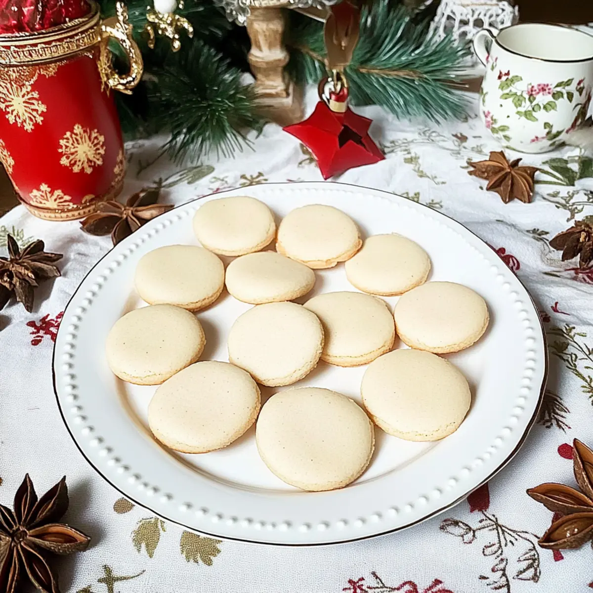 Jump to Recipe Print RecipeEvery holiday season, I find myself transported back to my childhood, where the aromatic scent of baking cookies filled my grandparent’s home. In the heart of these cherished moments was my beloved recipe for Anisplätzchen, or anise cookies, a festive tradition that never fails to delight. These simple yet exquisite cookies boast a unique flavor profile, blending sweetness with the distinctive warmth of anise, creating a symphony of taste that dances on the palate. Not only are they a breeze to whip up, making them perfect for last-minute baking, but they also bring a taste of nostalgia to gatherings with family and friends. As you prepare to indulge in these delightful treats, I wonder: What holiday memories do you associate with your favorite cookies? Why Anise Cookies are a Holiday Must? Nostalgic Experience: Each bite of these anise cookies transports you back to heartwarming holiday memories filled with joy and laughter. Simplicity: With just a few ingredients and straightforward steps, you can whip up a delightful batch without any hassle. Aromatic Delight: The unique flavor of anise creates a warm and inviting aroma, perfect for cozy gatherings. Versatile Pairing: Enjoy them alongside your favorite hot beverages, like black tea or hot cocoa. Crowd-Pleasing Treat: These cookies are a hit at any festive gathering, bringing smiles to faces young and old. Anise Cookies Ingredients For the Batter Eier – Essential for structure and moisture; use them at room temperature for the best results. Puderzucker – Adds the necessary sweetness and lightness; no substitutions are needed for this traditional recipe. Vanillezucker – Enhances both flavor and aroma; if you’re out, a splash of vanilla extract can work in a pinch. Gemahlener Anis – Provides the signature flavor of these anise cookies; ensure it’s fresh for maximum aroma. Mehl (Type 405) – Offers the needed structure; all-purpose flour can serve as a suitable substitute. Optional Topping Icing Sugar – Dust lightly over cooled cookies for a beautiful finish and extra sweetness. Embrace the warmth and nostalgia of baking these traditional anise cookies! Step‑by‑Step Instructions for Anise Cookies Step 1: Prepare the Base In a large mixing bowl, whisk together room-temperature eggs, powdered sugar, and vanilla sugar. Use an electric mixer on medium speed for about 10 minutes until the mixture is pale, creamy, and has doubled in volume. The mixture should form soft ribbons when you lift the whisk, indicating you’re ready to move on to the next step. Step 2: Incorporate Anise Gently stir in the ground anise into the egg-sugar mixture. Use a rubber spatula for a careful incorporation, ensuring that the aromatic spice distributes evenly throughout the batter. The warm scent of anise will begin to fill the air—this is a sign that the flavor profile for your anise cookies is coming together beautifully! Step 3: Add Flour Sift the flour directly over the egg-sugar mixture. Fold the flour in gently with a spatula to create a smooth, glossy batter, ensuring there are no dry pockets. This gentle folding is crucial, as overmixing can deflate your precious air bubbles, which contribute to the lovely texture of your anise cookies. Step 4: Shape Cookies Using a piping bag or a spoon, form small mounds of dough on a baking sheet lined with parchment paper. Make sure to leave ample space between each mound, as the cookies will spread while baking. The mounds should be about a tablespoon in size to maintain consistency; you want them to puff up beautifully while baking. Step 5: Drying Time Let the shaped cookies rest at room temperature for at least 4 hours, preferably overnight. This drying time is essential to develop the characteristic “feet”—the slight crinkle at the bottom of the cookies as they bake. Be patient; this step truly enhances the texture of your anise cookies. Step 6: Bake Preheat your oven to 140°C (284°F). Once heated, bake the cookies for about 15 minutes. Keep a close eye on them; you want them to be set yet still pale, not browned. The glossy surface should remain intact, hinting at the soft, chewy interior waiting to be enjoyed. Make Ahead Options These delightful anise cookies are perfect for meal prep, allowing you to savor the festive flavors with less last-minute rush! You can prepare the dough up to 24 hours in advance—just shape the cookies and let them dry at room temperature as directed. Once dried, transfer them to an airtight container and refrigerate if you’re waiting to bake them for more than a few hours. When you’re ready to enjoy your freshly baked anise cookies, simply preheat your oven and bake for about 15 minutes. Trust me, they’ll still turn out just as delicious, bringing that holiday cheer with minimal effort! Expert Tips for Anise Cookies Room Temperature Eggs: Ensure your eggs are at room temperature to help incorporate air and achieve a light texture in your anise cookies. Fresh Anise: Use freshly ground anise for the best flavor. Old spices can lose their potency and aroma, impacting cookie quality. Gentle Folding: When adding flour, fold gently to avoid deflating the mixture. Overmixing can lead to denser cookies instead of the desired airy texture. Drying Time: Don’t skip the resting period! Allowing shaped cookies to rest creates those lovely “feet” and improves texture. Oven Check: Keep an eye on the baking time; overbaking can cause the cookies to brown, altering their delightful flavor and texture. What to Serve with Anise Cookies Imagine sitting by the fire, with the comforting aroma of freshly baked cookies filling the room, creating the perfect atmosphere for festive gatherings. Steaming Black Tea: The earthy notes of black tea enhance the warm spices of the cookies, making for a soothing pairing. Rich Hot Cocoa: A creamy cup of hot cocoa complements the sweetness of the anise cookies, transforming snack time into a cozy trea