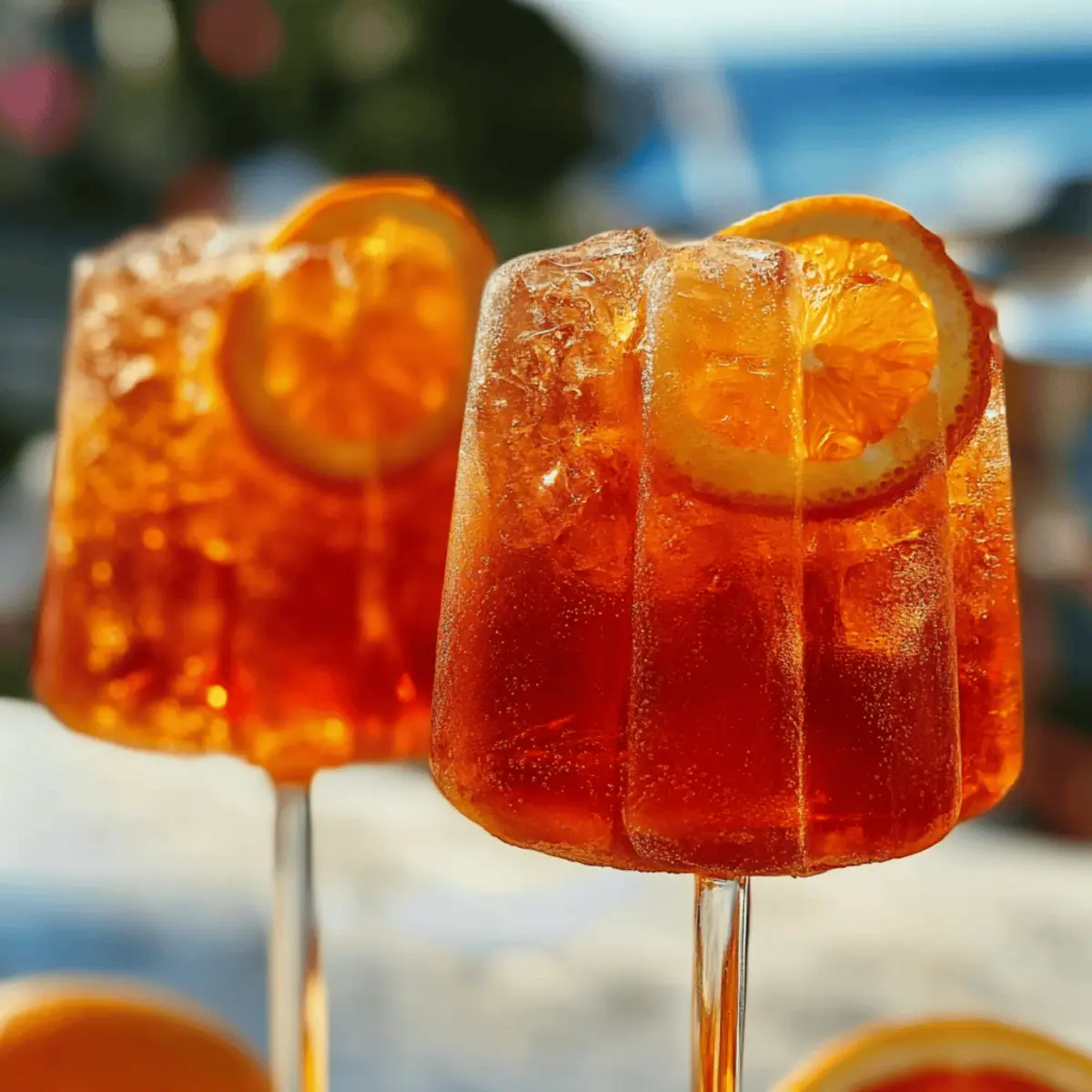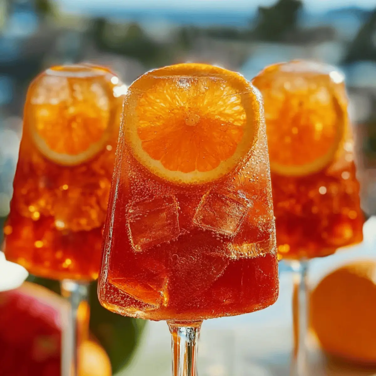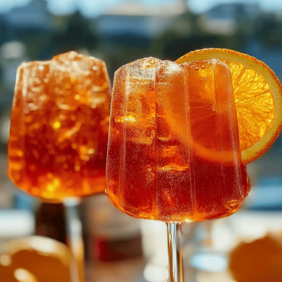 Jump to Recipe Print RecipeI was lounging by the pool, soaking up the sun, when a thought struck me: why not bring the joy of happy hour into frozen form? These delightful Aperol Spritz Pops are my answer. This boozy dessert captures the vibrant punch of my favorite summer cocktail, combining the bittersweet notes of Aperol with bubbly Prosecco and a splash of fresh orange juice. Not only are they super easy to whip up, but they also promise to impress your friends at any summer gathering. Perfect for cooling off on a scorching day, these pops are a refreshing treat that will have you savoring every bite. Curious about how to make these fun popsicles that keep the summer spirit alive? Let’s dive in! Why try these Aperol Spritz Pops? Refreshing addition to your summer lineup: Light and bubbly, these pops are the ultimate way to cool down on a hot day. Easy to make: With just a handful of ingredients, you can whip up a batch that rivals your favorite frozen treats. Perfect for parties: Impress your friends with a sophisticated dessert that brings a touch of cocktail fun indoors or poolside. Boozy flavor: Each bite bursts with the iconic taste of Aperol and fresh citrus, offering a delightful twist on the classic spritz. Versatile: With simple variations, you can get creative—try blending fruit or experimenting with different liquors for a unique twist! For more summer inspirations, check out these fun Oreo Cake Pops to sweeten your celebrations! Aperol Spritz Pops Ingredients A refreshing treat to savor! For the Pops • Aperol – Defines the pops’ taste with its unique bittersweet flavors; don’t skip this ingredient! • Prosecco – Adds a sweet, bubbly lift; feel free to substitute with any sparkling wine you like. • Sparkling Water – Provides extra fizz and lightness; club soda can work as a substitute for more bubble action. • Fresh Orange Juice – Infuses a bright, fruity flavor; bottled juice can be used, but fresh is always better! • Simple Syrup – Sweetens the mix to balance the bitterness; can be omitted or swapped for honey/agave for a different sweetness. • Lemon Juice – Boosts overall flavor brightness; fresh is preferred, but bottled in a pinch works too. • Thinly Sliced Orange – Garnishes the molds and adds a lovely touch; any citrus slice can work beautifully. • Popsicle Sticks – Essential for easy handling; any food-safe stick will do the trick. Enjoy the delightful boozy experience of these Aperol Spritz Pops this summer! Step‑by‑Step Instructions for Aperol Spritz Pops Step 1: Mix the Ingredients In a large mixing bowl, combine 1 cup of Aperol, 1 cup of Prosecco, 1 cup of sparkling water, 1 cup of fresh orange juice, 1/4 cup of simple syrup, and 2 tablespoons of lemon juice. Whisk gently until everything is well blended and the mixture is a vibrant color. This will create the flavorful base for your Aperol Spritz Pops. Step 2: Prepare the Molds Take your popsicle molds and place a thin slice of orange inside each one, allowing the bright color and citrus aroma to infuse the pops. Make sure the orange slices sit upright without spilling in the mixture. This adds a beautiful presentation when you enjoy your frozen treats. Step 3: Fill the Molds Carefully pour the Aperol mixture into each popsicle mold, being cautious not to overfill to avoid spillage during freezing. Leave about 1/4 inch of space at the top of each mold to allow for expansion as the pops freeze. With vibrant hues, the molds should look enticing already! Step 4: Insert Popsicle Sticks After filling the molds, gently insert a popsicle stick into each one, ensuring it’s centered. This will help you hold onto the Aperol Spritz Pops once they’re frozen and ready to enjoy. If the sticks wobble, allow the mixture to set for about 30 minutes before returning to the freezer. Step 5: Freeze the Pops Transfer the filled molds to the freezer and let them freeze for at least 8 hours, or until they are completely solid. Check for doneness by gently pressing against the sides of the mold; they should feel firm. This long freeze ensures that the Aperol Spritz Pops maintain their refreshing texture. Step 6: Release from Molds To serve your Aperol Spritz Pops, run warm water gently over the outside of the molds for about 10 seconds. The warmth will help release the pops from the molds without breaking them. Carefully pull them out, and you’ll see the gorgeous orange slices peeking through each delightful pop. Expert Tips for Aperol Spritz Pops • Don’t Overfill Molds: Leave some space at the top of the molds for expansion while freezing. This avoids messy spills and ensures perfectly shaped pops. • Use Fresh Ingredients: Opt for fresh orange juice and lemon juice when possible. They enhance the vibrant flavor of your Aperol Spritz Pops immensely! • Give it Time: Freeze the pops for the full 8 hours for the best texture. Rushing can lead to slushy pops instead of solid, refreshing treats. • Mix Thoroughly: When combining the ingredients, ensure everything is well blended for even flavor distribution. Stir gently but well to mix the boozy goodness! • Serve with Style: For added fun, serve your Aperol Spritz Pops in a bowl filled with ice, and pair them with an extra glass of Prosecco for a festive vibe. Aperol Spritz Pops: Creative Twists Feel free to personalize your Aperol Spritz Pops with these fun and exciting variations that will tempt your taste buds! Liqueur Swap: Change Aperol for Campari or another flavored liqueur for a different flavor profile. The bitterness will vary, adding a unique depth. Herb Infusion: Add fresh basil or mint before freezing for a refreshing herbal note that elevates the pops’ complexity. Imagine enjoying a garden-fresh burst with each bite! Berry Bliss: Blend in fresh strawberries or raspberries to create colorful, fruity pops. The sweetness of the berries complements the citrus perfectly. Zesty Citrus: Incorporate lime or grapefruit juic