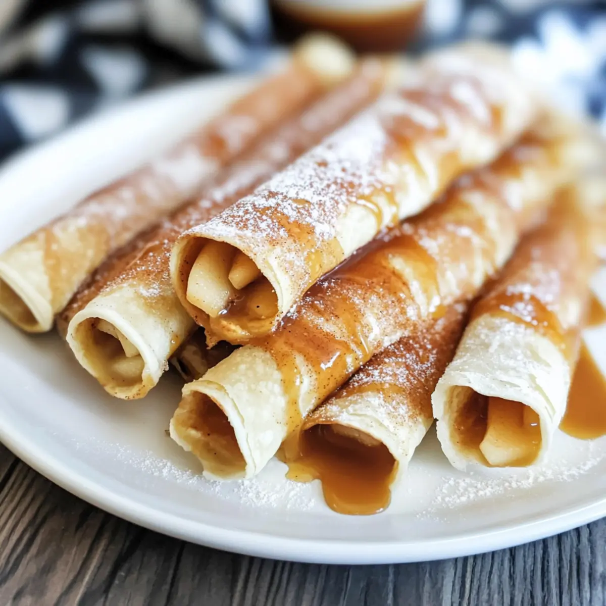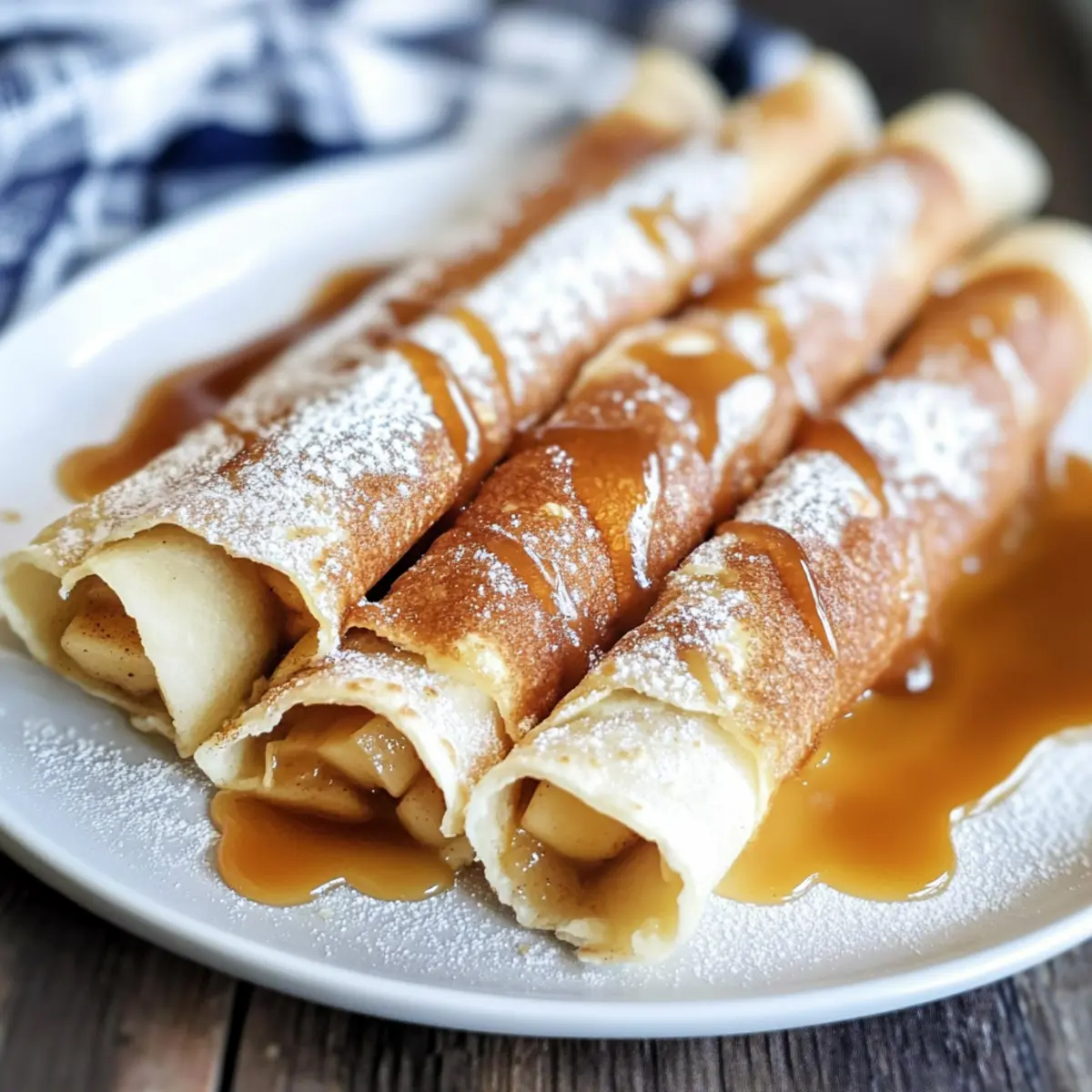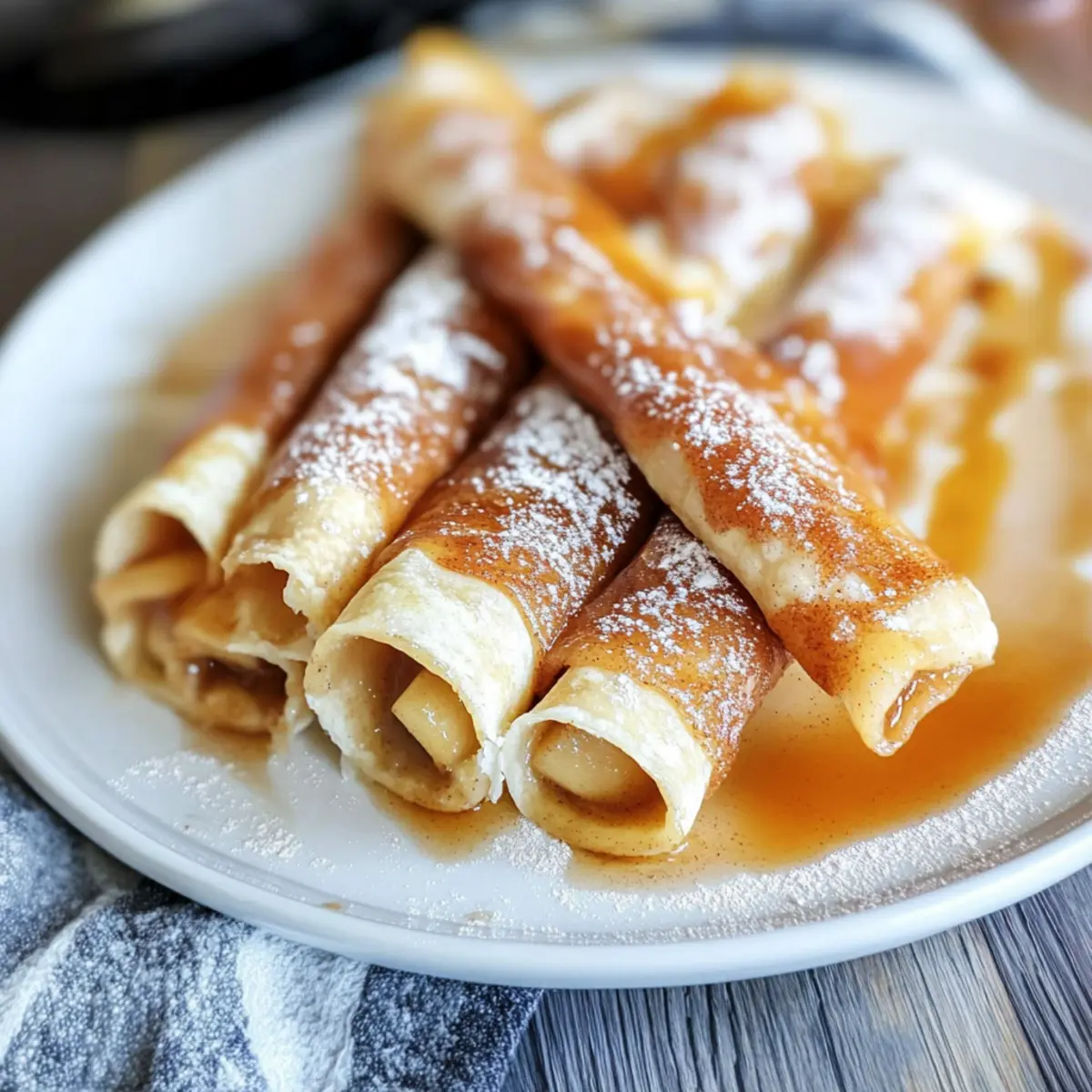 Jump to Recipe Print RecipeThe sweet scent of baked apples wafted through my kitchen, reigniting cherished memories of family gatherings. As I rolled up each tortilla, I couldn’t help but smile at the thought of serving these playful Apple Pie Taquitos—a delightful twist on the classic dessert. They’re not only a quick dessert to whip up, but they also make for an engaging finger food that everyone can enjoy while mingling. Picture this: crispy exteriors coated in fragrant cinnamon sugar, giving way to a gooey apple filling that’s as comforting as a warm hug on a chilly night. Whether you’re hosting a festive get-together or simply craving a homemade treat, these taquitos will surely impress and satisfy your sweet tooth. Ready to discover just how easy and fun it is to bring a taste of nostalgia into your own kitchen? Let’s dive in! Why Are Apple Pie Taquitos So Special? Crispy Joy: These Apple Pie Taquitos offer an irresistible crunch that contrasts with the soft, sweet apple filling inside. Quick to Make: With a simple assembly process, you can have these treats ready in no time. Crowd-Pleaser: Perfect for gatherings, they invite conversation and laughter as everyone digs in. Adaptable Delight: Use your favorite homemade apple filling or experiment with other fruits. Unforgettable Flavor: The warm blend of cinnamon and sugar creates an aromatic experience that warms the heart. Serve with a scoop of vanilla ice cream or a drizzle of caramel syrup for a decadent touch—just like with my Honey Pineapple Salmon recipe. Apple Pie Taquitos Ingredients For the Filling Apple Pie Filling – Sweet and tart filling providing flavor and moisture; you can substitute homemade apple filling for a fresher taste. For the Taquito Base Soft Flour Tortillas – Forms the base for the taquitos, creating a crispy exterior when baked; do not use corn tortillas. Melted Butter – Adds richness and helps the cinnamon sugar adhere to the taquitos. For the Coating Sugar – Provides sweetness and contributes to the caramelization of the outside. Cinnamon – Adds warmth and essential spice flavor to enhance the apple pie taste. Optional Drizzle Caramel Syrup – Adds extra sweetness and a delightful sauce for drizzling over the taquitos before serving. Step‑by‑Step Instructions for Apple Pie Taquitos Step 1: Preheat the Oven Begin by preheating your oven to 350°F (175°C). This step ensures that your Apple Pie Taquitos bake evenly and become delightfully crispy. While the oven heats, gather your ingredients and get ready to create a delicious dessert the whole family will love. Step 2: Prepare the Cinnamon Sugar Mixture On a flat plate, combine sugar and ground cinnamon, thoroughly blending them. You want a fragrant mix that will perfectly coat your Apple Pie Taquitos. This sweet coating will add a delightful crunch and warmth to each crispy bite. Step 3: Chop the Apple Filling Next, pour your apple pie filling onto a cutting board. Using a sharp knife, chop the filling into smaller, bite-sized pieces. This will make it easier to roll and enjoy the filling in your taquitos. Ensure the apples are evenly diced for a consistent texture throughout. Step 4: Assemble the Taquitos Take a soft flour tortilla and lay it flat on your workspace. Spoon approximately 3 tablespoons of the chopped apple pie filling horizontally across the center. Carefully roll the tortilla tightly, like a jelly roll, to keep all that delicious filling securely inside. Be sure to roll firmly but gently to prevent tearing. Step 5: Brush with Butter and Coat Once rolled, brush the outside of the taquito generously with melted butter. This step adds a rich flavor and helps the cinnamon-sugar mix adhere. After brushing, roll the taquito in the cinnamon-sugar mixture, ensuring every surface is coated for an irresistible sweet crunch. Step 6: Place in Baking Dish Arrange the coated taquitos seam-side down in a greased 9×13 inch baking dish, ensuring they are closely spaced but not touching. This will help them crisp up uniformly while baking. Repeat the rolling and coating process until all tortillas are filled and placed in the dish. Step 7: Bake to Perfection Carefully place the baking dish in your preheated oven and bake for about 15 minutes. Keep an eye on them as they bake; they should turn golden brown and crispy on top. This cooks the filling through and creates that desired crunchy exterior for your Apple Pie Taquitos. Step 8: Serve and Delight Once baked, let the taquitos cool slightly before serving. Drizzle warm caramel syrup over them for added sweetness and serve with optional vanilla ice cream. The combination of warm, crisp taquitos with the gooey apple filling and delicious toppings is sure to bring smiles to every face at your gathering! Expert Tips for Apple Pie Taquitos Use Fresh Apples: If you’re making homemade filling, use a mix of sweet and tart apples for better flavor balance in your Apple Pie Taquitos. Secure Rolling: Roll the tortillas tightly to prevent them from unraveling during baking; this ensures the filling stays inside. Avoid Sogginess: If using homemade apple pie filling, make sure it isn’t too watery to avoid soggy taquitos. Even Coating: For a uniform sugar and cinnamon coating, roll the taquitos in the mixture thoroughly after buttering. Tip for Storage: Store leftovers in an airtight container but enjoy within two days for the best texture and flavor. Storage Tips for Apple Pie Taquitos Room Temperature: Store Apple Pie Taquitos in an airtight container at room temperature for up to 2 days. Enjoy them fresh for the best taste and texture. Fridge: If you need to store them longer, place the taquitos in the fridge for up to 5 days. Reheat in the oven to regain crispness. Freezer: For longer storage, freeze the taquitos by wrapping them tightly in plastic wrap and then placing them in a freezer-safe bag. They can be stored for up to 3 months. Reheating: To reheat, place frozen taquitos in 