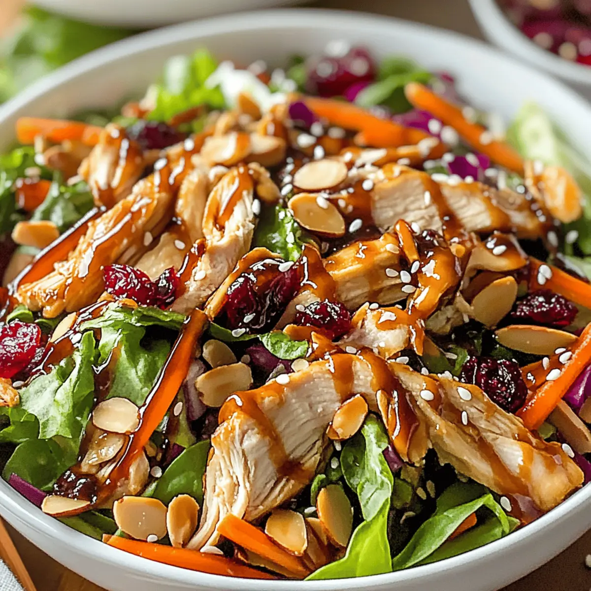 Vibrant Colors: The Asian Chicken Cranberry Salad boasts a stunning palette of greens, red cabbage, and bright cranberries that make every bite an eye-catching delight.