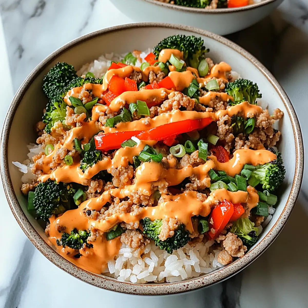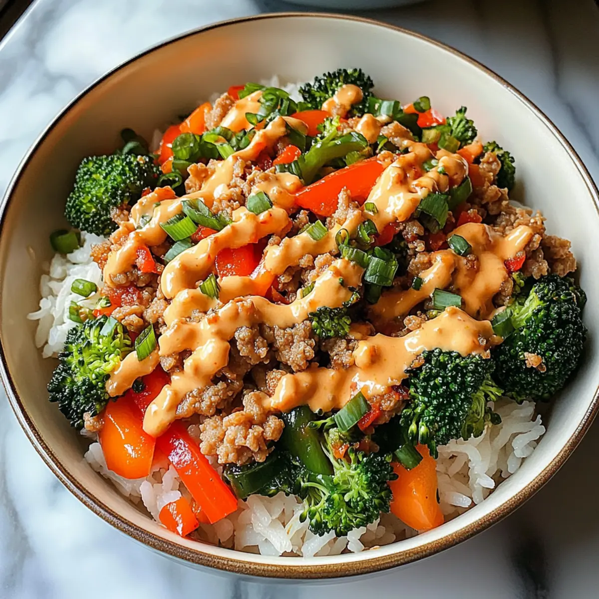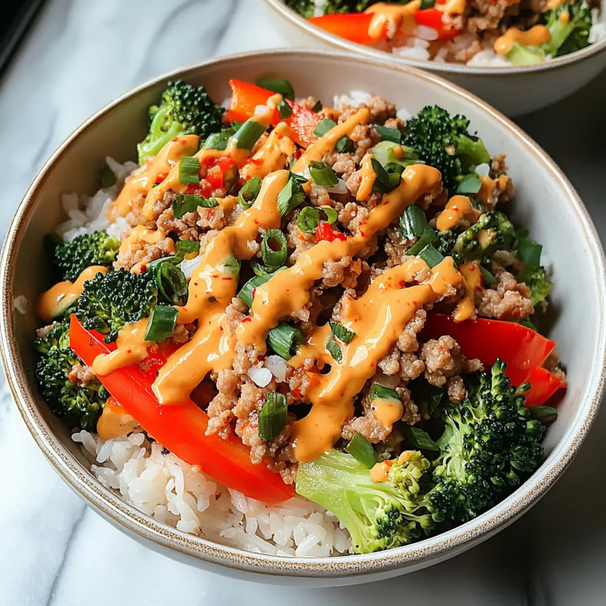 Jump to Recipe Print RecipeAs I stood in my kitchen the other evening, the tantalizing aroma of ground turkey sizzling mingled with the scent of fresh veggies, instantly transporting me to a cozy dinner with friends. Today, I’m excited to share my recipe for Bang Bang Ground Turkey Rice Bowls! This dish is not only a flavor explosion with its creamy, spicy sauce, but it’s also a quick and healthy meal perfect for those busy weeknights. With protein-packed ground turkey and an array of colorful vegetables, these bowls are as nutritious as they are satisfying. Plus, they make fantastic leftovers, ideal for meal prep! So, are you ready to dive into a bowl of deliciousness that will impress your taste buds and your loved ones? Why Choose Bang Bang Ground Turkey Rice Bowls? Flavor Explosion: The creamy, spicy bang bang sauce elevates every bite, making this dish unforgettable. Quick and Easy: Perfect for busy weeknights, this recipe can be whipped up in under 30 minutes! Nutritious: Packed with protein and colorful veggies, it’s a wholesome meal option for the whole family. Meal Prep Friendly: Great for leftovers, you can easily store portions for a quick meal later – meal prep enthusiasts will love it! Customizable: Feel free to swap ground turkey for chicken or even plant-based proteins, and throw in whatever veggies you have on hand. Dive into more creative variations with Ground Turkey Tacos or a comforting Turkey Stroganoff! Bang Bang Ground Turkey Rice Bowls Ingredients For the Turkey and Rice • Ground turkey – This lean protein is the star of the dish and can also be substituted with ground chicken, beef, or plant-based alternatives. • Jasmine rice – A fluffy foundation that complements the dish; cook according to package instructions. • Olive oil – Use for sautéing the turkey and vegetables, giving them a lovely flavor. • Salt and pepper – Essential seasonings; adjust to taste for the best flavor. For the Bang Bang Sauce • Mayonnaise – Adds creaminess to the sauce; you can substitute with Greek yogurt for a lighter option. • Sweet chili sauce – This ingredient brings sweetness and depth to your bang bang sauce. • Sriracha sauce – Provides a kick of heat; adjust the amount to control the spiciness according to your preference. • Soy sauce – Enhances the umami flavor; consider low-sodium soy sauce for a healthier twist. • Lime juice – Adds a refreshing acidity to balance the flavors; fresh lime juice is highly recommended. For the Vegetables • Red bell pepper – Gives a sweet crunch and vibrant color; feel free to swap with other colorful veggies. • Carrots – Adds a slight sweetness and extra nutrition; slice them thin for quick cooking. • Broccoli – Provides a nutritious element and vibrant contrast; use any seasonal veggie as a substitute. For Garnishing • Green onions – Add a fresh flavor and a pop of color to your dish; sliced finely for nice presentation. • Sesame seeds – Sprinkled on top for a nutty finish and added texture. These Bang Bang Ground Turkey Rice Bowls are not just a feast for the eyes, but also a quick and nourishing meal for busy weeknights. Enjoy crafting your own delicious bowls! Step‑by‑Step Instructions for Bang Bang Ground Turkey Rice Bowls Step 1: Cook the Jasmine Rice Begin by cooking the jasmine rice according to package instructions, usually requiring a 2:1 water-to-rice ratio. Bring the water to a boil, then reduce the heat, cover, and simmer for about 15 minutes, or until the rice is fluffy and all water is absorbed. Once done, set it aside to keep warm while you prepare the other components of the Bang Bang Ground Turkey Rice Bowls. Step 2: Prepare the Bang Bang Sauce In a mixing bowl, whisk together mayonnaise, sweet chili sauce, sriracha, and fresh lime juice until the mixture is smooth and creamy. Adjust the sriracha to your preferred spice level as you blend the flavors. This bang bang sauce is crucial for bringing your turkey rice bowls to life, so make sure it’s well combined and set aside for later use. Step 3: Sauté the Ground Turkey Heat a tablespoon of olive oil in a large skillet over medium-high heat. Once shimmering, add the ground turkey, breaking it apart with a spatula. Cook for about 5-7 minutes, stirring occasionally, until the turkey is browned and reaches an internal temperature of 165°F (74°C). The turkey should be no longer pink, indicating it’s perfectly cooked and ready for the next step. Step 4: Season the Turkey Once your turkey is fully cooked, pour in the soy sauce, followed by a pinch of salt and pepper to taste. Stir everything together, allowing the seasonings to meld with the turkey for about 1-2 minutes. This will enhance the umami flavors in your Bang Bang Ground Turkey Rice Bowls, preparing the filling for the delicious assembly ahead. Step 5: Add the Vegetables Next, toss in the chopped red bell pepper, sliced carrots, and broccoli florets into the skillet with the turkey. Continue cooking for another 5-7 minutes, stirring frequently, until the vegetables are tender-crisp and retain their vibrant color. This quick stir-fry helps to maintain the freshness of the veggies while infusing them with the turkey’s savory flavors. Step 6: Mix in the Bang Bang Sauce Reduce the heat to low and pour half of your prepared bang bang sauce over the turkey-vegetable mixture, stirring to coat everything evenly. Allow it to heat through for about 2 minutes, ensuring all the flavors blend beautifully. This step is vital for creating that creamy, spicy kick in your Bang Bang Ground Turkey Rice Bowls. Step 7: Assemble the Bowls To serve, scoop a generous portion of the fluffy jasmine rice into each serving bowl. Carefully top the rice with the turkey and vegetable mixture, allowing the colorful medley to shine on top of the rice. Drizzle with the remaining bang bang sauce to add an irresistible finish that ties all the flavors together. Step 8: Garnish and Serve F