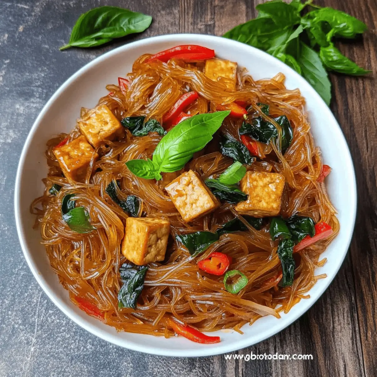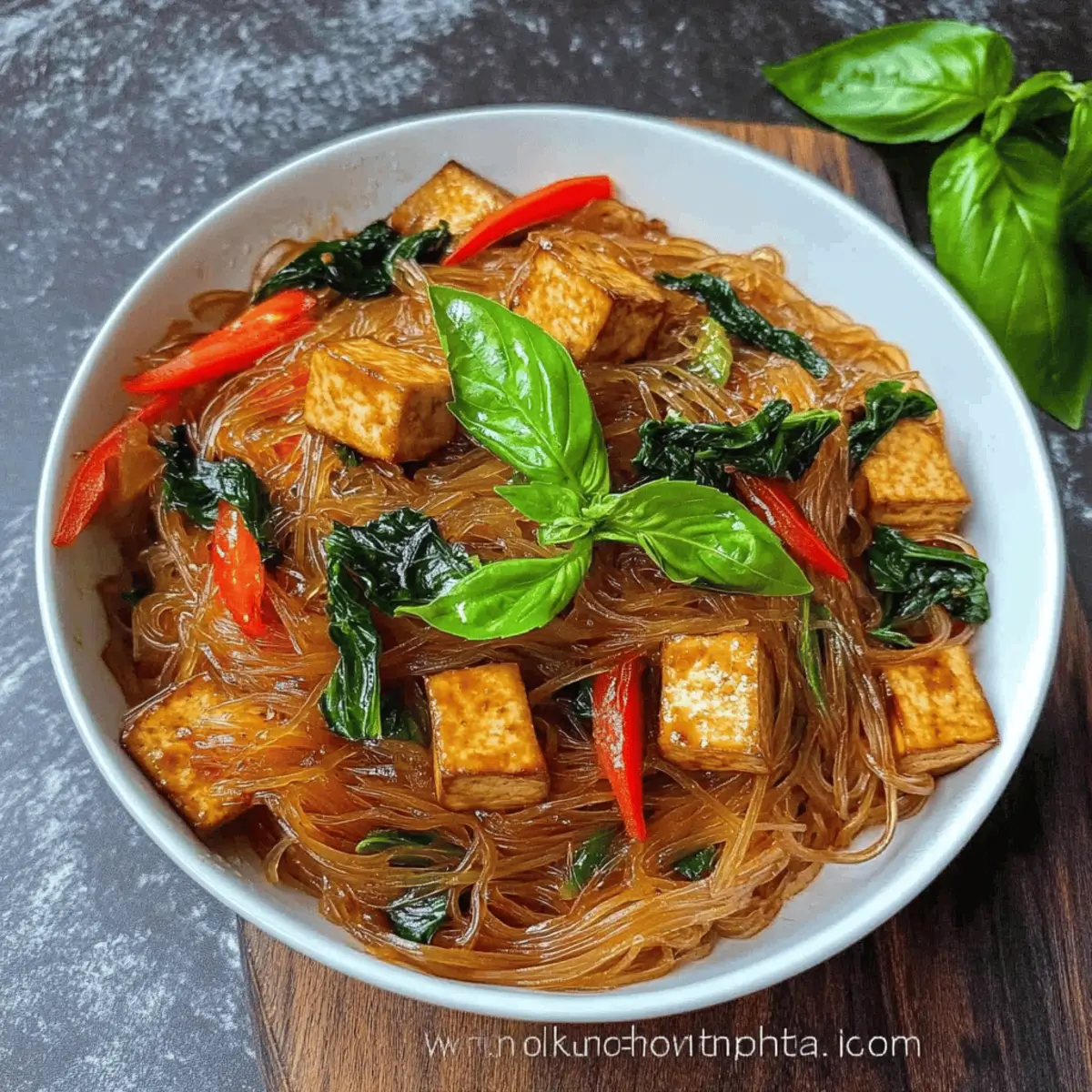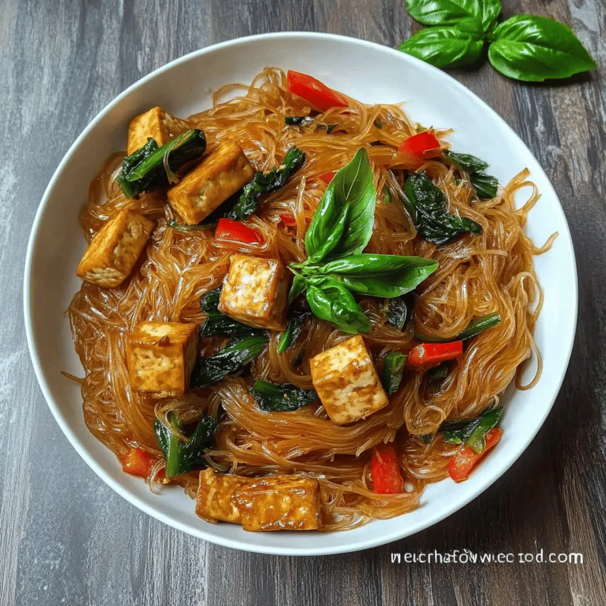 Jump to Recipe Print RecipeAs I stood over the bubbling pot, the alluring aromas of basil and tofu wafted through my kitchen, instantly transporting me to the vibrant streets of Asia where culinary delights await. This Basil and Tofu Vermicelli dish is not just another recipe; it’s a celebration of flavors that blend Thai and Filipino influences into a quick vegan fusion meal. Perfect for busy weeknights, this dish boasts an effortless prep time without compromising on taste. The chewy vermicelli soaked in a rich sauce complements the crispy tofu and fragrant basil, creating a satisfying dinner that’s both hearty and light. Curious to learn how to whip up this enticing feast that brings homemade comfort food to life? Let’s get cooking! Why is This Recipe a Must-Try? Quick and Easy: Preparing this Basil and Tofu Vermicelli is a breeze, perfect for busy weeknights when you crave something satisfying yet effortless. Flavor Fusion: The harmonious blend of Thai and Filipino flavors creates a dish that dances on your palate, elevating your dinner experience. Versatile Ingredients: Feel free to customize with your favorite vegetables or protein swaps, making it a meal you can reinvent again and again—just like my Spicy Honey Pepper Chicken! Nourishing and Healthy: With approximately 209 calories per serving, this dish offers a delightful balance of nutrients, keeping you energized and satisfied without the heaviness. Crowd-Pleasing: Whether you’re serving family or hosting friends, this vibrant dish is sure to impress, making it a fantastic addition to any meal rotation. Basil and Tofu Vermicelli Ingredients For the Noodles • Dry Vermicelli or Bean Threads (150 g) – The chewy base of the dish; consider using rice vermicelli for an alternate texture. For the Sauce • Soy Sauce (½ tbsp) – Adds a rich umami flavor; tamari is a great gluten-free substitute. • Vegetarian Oyster Sauce (2-3 tbsp) – Provides a savory depth; hoisin sauce can also work beautifully. • Coconut Sugar (1 tbsp) – Sweetens and balances flavors; brown sugar or maple syrup makes fine replacements. • Dark Soy Sauce (2 tsp) – Deepens both color and flavor; regular soy sauce is a lighter alternative. • Sriracha or Chili Sauce (½ to 1 tbsp) – A kick of heat; adjust according to your spice preference or use fresh chili. For the Tofu • Extra Firm Tofu (½ lb) – A protein powerhouse; remember to press it to enhance texture and flavor absorption. • Neutral Oil for Cooking – Essential for crispy tofu; coconut or grapeseed oil are excellent options. For the Vegetables • Bell Pepper (1, thinly sliced) – Adds a delightful crunch; any sweet pepper or veggies of your choice work well. • Onion (1, sliced) – Brings sweetness and aroma; shallots can add a milder flavor if you prefer. • Garlic (4 cloves, minced) – An essential flavor booster; adjust according to your garlic love! • Fresh Thai and Holy Basil (2 cups) – The star herb of this dish, offering aromatic charm—sweet basil can substitute, but expect a flavor shift. This Basil and Tofu Vermicelli dish is not just about combining ingredients; it’s about creating a delightful meal that showcases the beauty of Asian flavors at home! Step‑by‑Step Instructions for Basil and Tofu Vermicelli Step 1: Prepare Noodles Start by bringing a pot of water to a rolling boil. Once boiling, add the dry vermicelli or bean threads and let them soak for 8-10 minutes until they become chewy. Stir occasionally to prevent sticking. Once cooked, drain the noodles, rinse them under cold water to stop the cooking process, and set them aside for later. Step 2: Make Sauce In a mixing bowl, combine the soy sauce, vegetarian oyster sauce, coconut sugar, dark soy sauce, and sriracha. Whisk the mixture until the sugar dissolves completely and the sauce is well-blended. Taste and adjust the spice level as desired. This vibrant sauce will add depth and character to your Basil and Tofu Vermicelli. Step 3: Cook Tofu While the noodles and sauce are prepared, press the extra firm tofu to remove excess moisture, then cut it into bite-sized cubes. Heat a non-stick pan over medium-high heat and add a drizzle of neutral oil. Once hot, carefully add the tofu cubes, frying them until golden brown on all sides, about 8-10 minutes. Add a splash of soy sauce during cooking for extra flavor. Step 4: Sauté Vegetables Remove the crispy tofu from the pan and set it aside. If necessary, add a bit more oil to the pan, then toss in the sliced bell pepper, onion, and minced garlic. Stir-fry the vegetables over medium heat for about 4-5 minutes until they soften and become fragrant, ensuring the onions turn translucent and the peppers retain a bit of crunch. Step 5: Add Noodles and Sauce Gently add the soaked vermicelli noodles to the sautéed vegetables in the pan. Pour the prepared sauce over the mixture and toss everything together, making sure the noodles are fully coated. Cook for an additional 4-5 minutes, stirring continuously, until everything is heated through and well combined, ensuring the sauce evenly coats the noodles. Step 6: Finish and Serve Once heated through, stir in half of the fresh Thai and holy basil leaves, allowing their fragrance to infuse the dish. Remove the pan from heat and transfer the Basil and Tofu Vermicelli to serving plates. Top with the remaining basil before serving hot for a fresh, aromatic finish. Make Ahead Options These Basil and Tofu Vermicelli Noodles are perfect for meal prep enthusiasts! You can prepare the noodles up to 24 hours in advance—just soak them, drain, and toss them with a touch of oil before refrigerating to prevent sticking. The sauce can also be made 3 days ahead; simply store it in an airtight container in the fridge. You can chop the vegetables and press the tofu ahead of time, keeping them stored separately to maintain freshness. When you’re ready to enjoy, just sauté the veggies and tofu, add the noodles and sau
