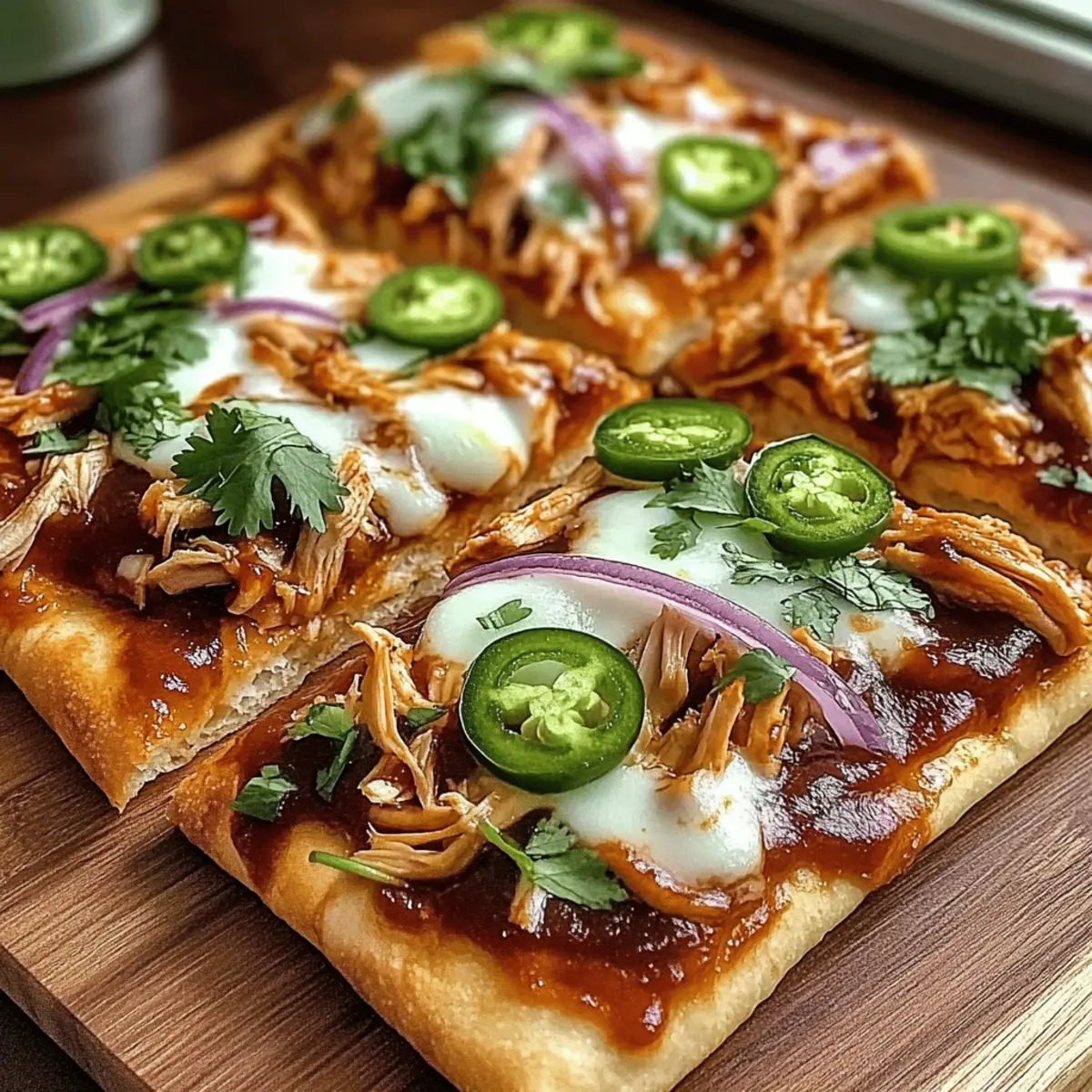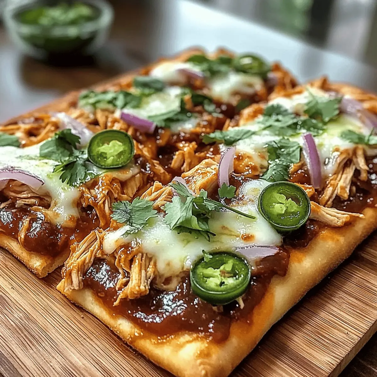 Jump to Recipe Print RecipeAs I flipped through my recipe book one afternoon, a tantalizing memory surfaced—the last BBQ chicken flatbread pizza I made, with its smoky sweetness and crispy edges. This quick meal merges tender, shredded chicken with vibrant toppings, all drizzled with zesty BBQ sauce over a perfectly baked flatbread. What I adore about this BBQ Chicken Flatbread Pizza is its incredible versatility; you can easily swap in your favorite toppings or create a vegetarian version using tofu. It’s a simple yet satisfying dish that’s ideal for both weeknight dinners and casual get-togethers, ready in less than 30 minutes. So, are you ready to dive into a flavor-packed adventure that’s both delicious and customizable? Let’s get cooking! Why You’ll Crave This Flatbread Pizza Quick Preparation: You can whip up this grill-inspired pizza in under 30 minutes, making it perfect for busy nights. Flavor Explosion: The fusion of smoky BBQ sauce with tender chicken and gooey mozzarella creates a mouthwatering experience that satisfies every craving. Customizable Toppings: From veggies to cheese substitutions, the freedom to personalize each pizza ensures everyone leaves happy. You can even try it with a Poblano Chicken Tacos twist! Healthier Alternative: Swap shredded chicken for tofu—it’s a delicious vegetarian option that doesn’t skimp on flavor! Crowd-Pleaser: Whether it’s a family dinner or a fun gathering, this pizza impresses guests every time, just like my Chicken Dumplings Cozy dish. Simple Clean-Up: Utilizing flatbreads means no dough-making mess; just bake, slice, and enjoy! BBQ Chicken Flatbread Pizza Ingredients For the Flatbread Base • Flatbreads/Naan – The crispy foundation; substitute pita bread for a similar delightful texture. For the Chicken Topping • Cooked Chicken (shredded, preferably rotisserie) – The main protein source, offers both flavor and texture; leftover grilled chicken or diced tofu makes a great vegetarian option. • BBQ Sauce (¾ cup) – A flavor enhancer that should have a nice balance of sweetness and smokiness; consider homemade for a personalized touch. For the Cheese and Veggies • Mozzarella Cheese (1½ cups, shredded) – This creamy cheese provides richness; blend it with cheddar or gouda for a deeper flavor experience. • Red Onion (½ cup, thinly sliced) – Adds crunch and flavor; can be substituted with shallots or left out for milder taste. • Cilantro (½ cup, chopped) – A fresh garnish; swap with parsley or green onions if you prefer. • Corn (½ cup, canned or grilled) – Adds a touch of sweetness and color; it’s optional but adds great texture. • Sliced Jalapeños (½ cup, optional) – For those who enjoy spice; omit if you’re looking for a milder pizza or replace with sweet bell peppers. For Assembly • Olive Oil – Enhances flavor and aids in crisping the flatbread crust, ensuring a delightful bite! Step‑by‑Step Instructions for BBQ Chicken Flatbread Pizza Step 1: Preheat Your Oven Begin by preheating your oven to 475°F (245°C). If you have a pizza stone, place it inside to heat up simultaneously; this will help create a perfectly crispy base for your BBQ Chicken Flatbread Pizza. Allow the oven to preheat for at least 15–20 minutes to ensure it reaches the right temperature. Step 2: Prepare the Chicken Mixture In a medium bowl, combine your shredded chicken and ½ cup of BBQ sauce, mixing thoroughly until each piece is evenly coated. Season the mixture with salt and pepper to enhance the flavors. This step is crucial as it ensures that the chicken adds a deliciously smoky taste to your flatbread pizza. Step 3: Set Up the Flatbreads Take your flatbreads and place them on a large baking sheet for easy handling. Lightly brush each flatbread with olive oil, which will not only enhance the flavor but also help to achieve a wonderfully crisp crust. This is an essential step before adding toppings for that delightful crunch. Step 4: Assemble the Toppings Evenly distribute the BBQ chicken mixture over each flatbread, ensuring that it covers the surface for maximum flavor in every bite. Next, sprinkle shredded mozzarella cheese generously on top, followed by sliced red onions, corn, and jalapeños if you like a bit of spice. The variety of toppings will add both texture and color to your BBQ Chicken Flatbread Pizza. Step 5: Bake to Perfection Carefully slide the baking sheet into the preheated oven and bake for approximately 10 to 12 minutes. Keep a close eye on your pizza during the last few minutes; it’s done when the cheese is bubbly and golden brown, and the edges of the flatbreads are crispy. This is the moment when your homemade BBQ Chicken Flatbread Pizza starts to tantalize your senses! Step 6: Garnish and Serve Once baked, remove the BBQ Chicken Flatbread Pizza from the oven and let it cool slightly. Sprinkle freshly chopped cilantro over the top for a vibrant garnish. Now, slice the flatbreads into servings and prepare to enjoy them warm, perhaps with some extra BBQ sauce on the side for those who crave more flavor. How to Store and Freeze BBQ Chicken Flatbread Pizza Fridge: Store any leftover BBQ Chicken Flatbread Pizza in an airtight container for up to 3 days. It helps maintain flavor and moisture while keeping it fresh. Freezer: If you want to freeze the pizza, wrap individual slices in plastic wrap and then place them in a freezer-safe bag for up to 2 months. This way, you can enjoy this delicious dish anytime! Reheating: When you’re ready to enjoy your leftover pizza, reheat it in the oven at 350°F (175°C) for about 10-15 minutes to restore crispiness, making it taste just as delightful as the first time. Tip: Consider separating any toppings that may not freeze well before packing away your BBQ Chicken Flatbread Pizza, ensuring each bite remains fresh when you reheat it. Make Ahead Options These BBQ Chicken Flatbread Pizzas are perfect for meal prep enthusiasts! You can pr