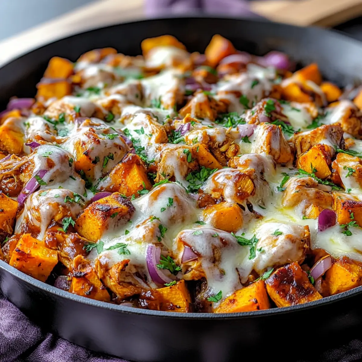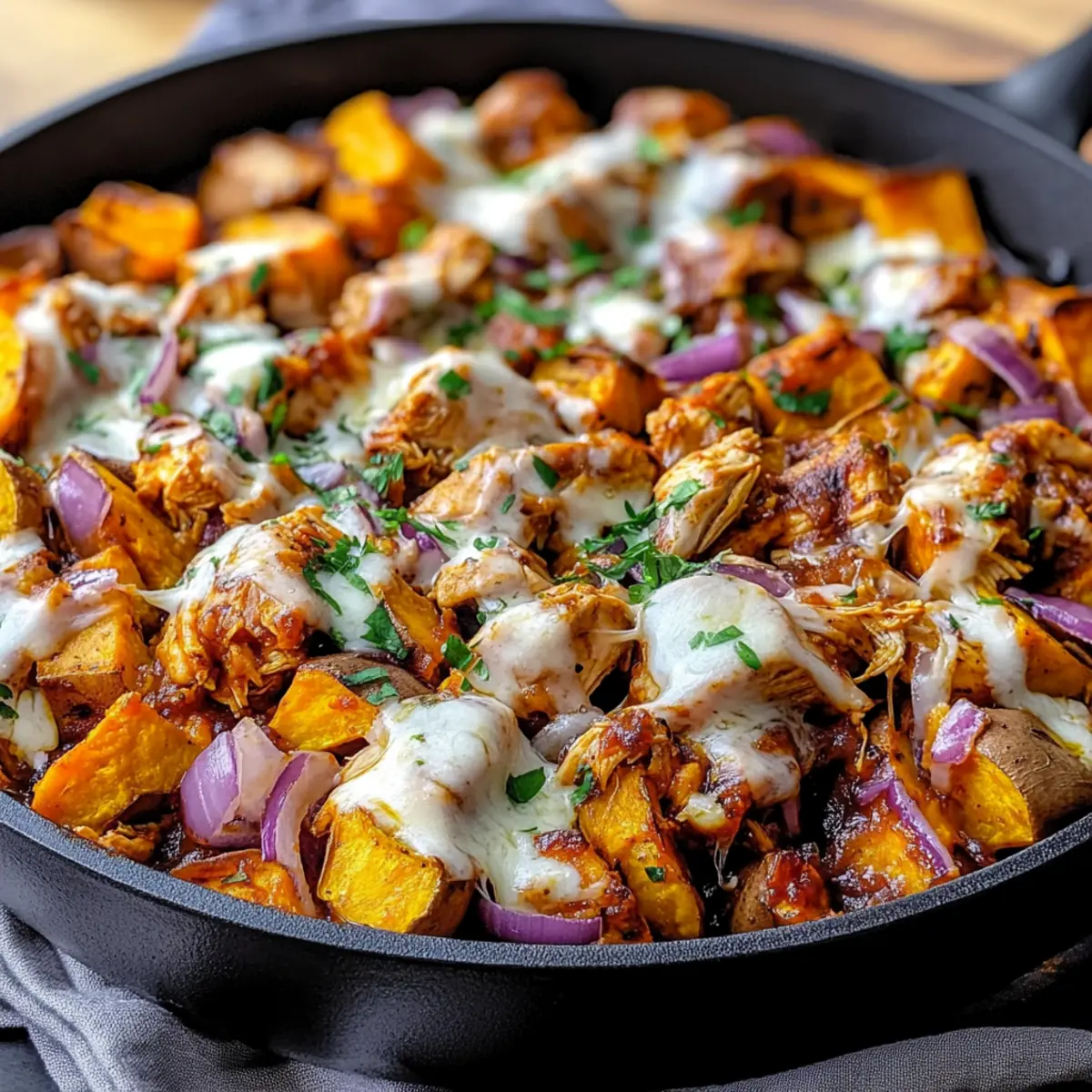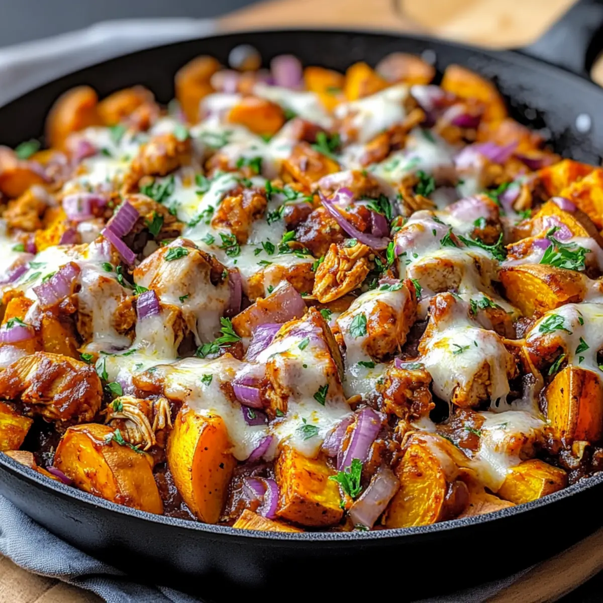 Jump to Recipe Print RecipeThe aroma of smoky BBQ fills the air as I sauté vibrant pieces of sweet potato, transforming my kitchen into a comforting haven. Just 30 minutes stand between you and this nourishing Easy BBQ Chicken Sweet Potato Skillet, a dish that perfectly balances flavor and ease. Picture tender chicken enveloped in rich BBQ sauce, seamlessly mixed with sweet potatoes and gooey melted cheese—all made in one pan for quick cleanup! This recipe brings two irresistible perks: it’s not only gluten-free but also a family-friendly option for those hectic weeknights when decisions feel overwhelming. With each bite, you’ll experience a hearty, fulfilling meal that leaves everyone asking for more. So, are you ready to elevate your dinner game and create a new family favorite? Why Will You Love This Skillet Recipe? Quick and Easy: This recipe shines with effortless meal prep—whip it up in just 30 minutes! One-Pan Wonder: Enjoy less cleanup as all ingredients come together perfectly in one skillet. Flavor Explosion: The combination of smoky BBQ chicken and sweet orange flesh of sweet potatoes is simply irresistible. Family-Friendly Delight: Kids and adults alike will love this hearty meal, making it a go-to for any weeknight. Versatile Enjoyment: Customize it by adding your favorite veggies or serving over rice; it’s adaptable to suit all tastes! If you love quick, satisfying meals, you might enjoy pairing this with our Hot Honey Chicken or exploring other one-pan options like Poblano Chicken Tacos. BBQ Chicken Sweet Potato Skillet Ingredients For the Base Sweet Potatoes – Adds natural sweetness and serves as the dish’s foundation; cut evenly for consistent cooking. Cooked Chicken – Provides essential protein and absorbs BBQ sauce flavors; can substitute with shredded rotisserie chicken for convenience. For Flavoring BBQ Sauce – Delivers a smoky, tangy depth; choose your favorite brand or type for the best flavor experience. Red Onion – Offers sharpness and sweetness to enhance overall flavor; chop it finely for quicker cooking. Corn – Adds sweetness and texture; use fresh, frozen, or canned varieties based on availability. For Creaminess Cheddar Cheese – Provides a creamy richness; substitute with dairy-free cheese for a lactose-free option. Olive Oil – Essential for sautéing ingredients and preventing them from sticking to the skillet. For Seasoning Salt & Black Pepper – Enhances the dish’s natural flavors; adjust to your taste preferences. Smoked Paprika – Adds a subtle smokiness that beautifully complements the BBQ sauce. For Garnish Green Onions – Adds a burst of freshness; can be substituted with chives if preferred. Step‑by‑Step Instructions for BBQ Chicken Sweet Potato Skillet Step 1: Cook Sweet Potatoes In a large skillet, heat 2 tablespoons of olive oil over medium heat. Add diced sweet potatoes and sauté for about 10 minutes, stirring occasionally, until they are fork-tender and lightly golden. The sweet potatoes should be soft yet retain their shape, forming a lovely base for your BBQ Chicken Sweet Potato Skillet. Step 2: Add Vegetables Next, sprinkle in half a chopped red onion and a cup of corn into the skillet with the cooked sweet potatoes. Stir everything together and cook for an additional 3-4 minutes, allowing the onion to become translucent and the corn to warm through. The aroma will fill your kitchen, signaling that the next step is near. Step 3: Stir in BBQ Chicken Now, add your cooked chicken—about 2 cups, shredded or diced—along with 3/4 cup of your favorite BBQ sauce. Mix everything thoroughly to coat the sweet potatoes and vegetables in the rich, tangy flavor of the sauce. Cook for 5-6 minutes, ensuring everything is heated through and bubbling gently, signifying it’s all ready for the final touches. Step 4: Top with Cheese Finally, sprinkle a generous amount of shredded cheddar cheese on top of the mixture in the skillet. Cover with a lid and turn the heat to low, allowing the cheese to melt for about 2-3 minutes. Once the cheese is melted and gooey, your BBQ Chicken Sweet Potato Skillet is ready to serve, bursting with flavor and warmth. How to Store and Freeze BBQ Chicken Sweet Potato Skillet Fridge: Store any leftovers in an airtight container for up to 3 days. Reheat in the microwave or skillet until heated through. Freezer: For longer storage, freeze portions in airtight freezer bags or containers for up to 2 months. Thaw overnight in the fridge before reheating. Reheating: Reheat in a skillet over medium heat for even warming. Adding a splash of water can help maintain moisture while reheating the BBQ Chicken Sweet Potato Skillet. Serving Suggestions: Pair with a fresh salad or steamed greens when serving leftovers for a delightful meal. Expert Tips for BBQ Chicken Sweet Potato Skillet Even Sizing: Cut sweet potatoes into uniform pieces for even cooking; this ensures all pieces become tender at the same time. Cheese Melting: Cover the skillet briefly when adding cheese to achieve a perfect melt and creamy texture; this prevents uneven melting and enhances flavor. Taste Adjustments: Feel free to adjust BBQ sauce levels based on personal taste; adding more can amp up the smoky flavor profile of the BBQ Chicken Sweet Potato Skillet. Chicken Shortcuts: Use pre-cooked or shredded rotisserie chicken to save time without compromising flavor; this is a great way to make weeknight dinners even quicker. Heat Level: For those who like a kick, consider adding diced jalapeños along with the onions, elevating the dish’s flavor and spice! What to Serve with BBQ Chicken Sweet Potato Skillet? Elevate your meal experience by pairing your skillet dish with delightful sides that enhance its comforting flavors. Creamy Coleslaw: The cool, crisp texture of coleslaw cuts through the richness of the BBQ chicken, offering a refreshing balance to each bite. Garlic Bread: Soft, buttery garlic bread is perfect for soaking up any e