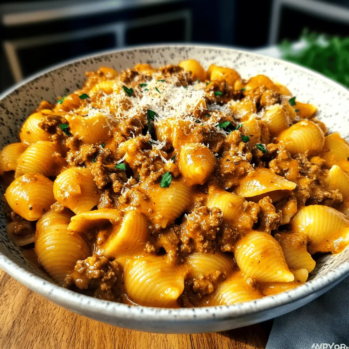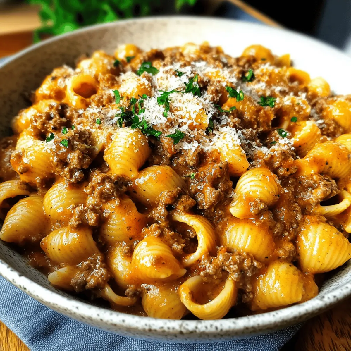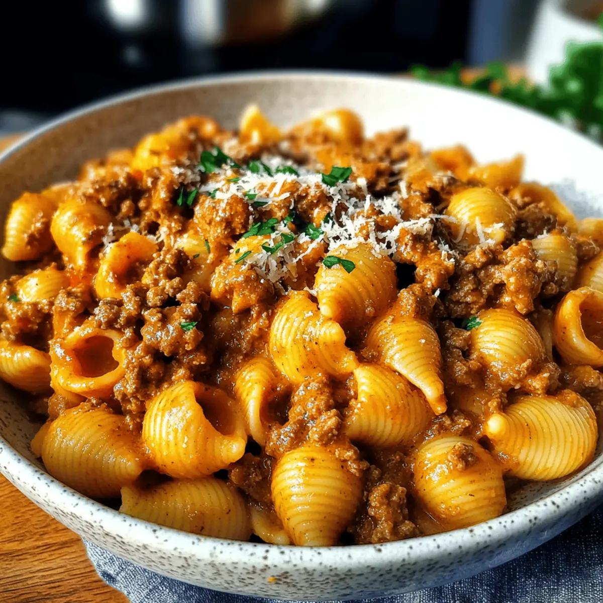 Jump to Recipe Print RecipeAs the aroma of sautéed garlic and onions drifts through my kitchen, I can’t help but feel that warm embrace of nostalgia. Today, I’m excited to share my Creamy Beef and Shell Pasta recipe—an absolute game-changer for those quick weeknight dinners when you crave a hearty meal that feels like a hug in a bowl. This dish is truly a comfort food staple, ready in just 30 minutes! The beauty of this pasta lies not only in its rich, creamy sauce cradled by tender shell pasta but also in its adaptability. Whether you’re using ground turkey, chicken, or even a plant-based alternative, you can make it your own! Plus, with options for different pasta types, you’ll always have a delicious dinner at your fingertips. What’s your favorite twist on this creamy classic? Why is this pasta recipe so special? Comforting and Creamy: This Creamy Beef and Shell Pasta wraps you in a warm embrace, making it the ultimate cozy dish. Quick Prep Time: Ready in just 30 minutes, it fits perfectly into your busy weeknights. Versatile Ingredients: Switch up proteins—ground turkey or chicken work great! You can even go plant-based for a lighter option. Flavorful Experience: The aromatic garlic and savory herbs create a rich taste that will delight your palate. Don’t forget to check out Chicken Broccoli Pasta for another quick and delicious meal option! Crowd-Pleasing Dish: It’s a family favorite that even the pickiest eaters will love. Beef and Shell Pasta Ingredients For the Pasta • Shell Pasta – The perfect vessel to hold the creamy sauce; substitute with penne or rotini for a different texture. For the Protein • Ground Beef – Adds a savory depth; feel free to switch to ground turkey, chicken, or a plant-based option for a lighter meal. For the Creamy Sauce • Heavy Cream – Creates a delightful richness; substitute with half-and-half for a lighter touch or coconut cream for a dairy-free version. • Parmesan Cheese – Provides a delicious cheesy flavor; try using Pecorino Romano or nutritional yeast for a dairy-free alternative. For the Aromatics • Onion – Essential for enhancing flavor; yellow or white onions caramelize beautifully. • Garlic – Infuses the dish with aromatic goodness; fresh minced garlic elevates the taste. For Flavor Enhancements • Beef Broth – Enriches the sauce; homemade is best, but store-bought works just fine. • Dried Oregano and Basil – Adds depth and warmth; using fresh herbs will intensify the flavors. • Olive Oil – Ideal for sautéing; switch to butter for a richer essence. For Seasoning • Salt and Pepper – Key seasonings to taste; adjust according to your preference to highlight the beef and shell pasta. Step‑by‑Step Instructions for Creamy Beef and Shell Pasta Step 1: Cook Pasta Bring a large pot of salted water to a boil over high heat. Once boiling, add the shell pasta and cook for 8-10 minutes until al dente, stirring occasionally. When done, drain the pasta in a colander and set aside, allowing the steam to escape while you prepare the sauce. Step 2: Sauté Aromatics In a large skillet, heat 2 tablespoons of olive oil over medium heat. Add the chopped onion and sauté for 3-4 minutes, or until softened and translucent. Stir in the minced garlic, cooking for an additional minute until aromatic, making your kitchen smell wonderful as you get ready for the creamy beef and shell pasta. Step 3: Cook Beef Add the ground beef to the skillet, using a spoon to break it apart as it browns. Cook for 6-8 minutes until the beef is no longer pink and nicely browned. If there’s excess fat, drain it to keep your creamy sauce light and delicious. The beef should be browned and crumbly, creating a savory base for your dish. Step 4: Season and Simmer Stir in the dried oregano, basil, salt, and pepper, mixing well to coat the beef. Pour in 1 cup of beef broth and bring the mixture to a gentle simmer over medium heat. Allow it to simmer for about 5 minutes, letting the flavors meld together as the sauce thickens slightly. Step 5: Make Sauce Lower the heat to medium-low and slowly stir in 1 cup of heavy cream and ½ cup of grated Parmesan cheese. Mix it well, allowing the sauce to bubble gently for 3-4 minutes or until it thickens to your desired consistency, creating a rich, creamy texture that will envelop the shell pasta beautifully. Step 6: Combine Finally, add the cooked shell pasta to the skillet, gently tossing it in the creamy beef sauce to coat every piece. Cook together for 1-2 minutes over low heat to ensure everything is warmed through. Serve hot, garnished with fresh parsley if desired, and enjoy the comforting flavors of your creamy beef and shell pasta! Expert Tips for Creamy Beef and Shell Pasta Cream Temperature Control: Add the cream gradually and avoid high heat to prevent curdling, ensuring a silky sauce for your beef and shell pasta. Fat Drainage: Always drain excess fat from cooked beef. This keeps your dish light and prevents greasiness, enhancing overall flavor. Veggie Boost: Incorporate extra vegetables like spinach, mushrooms, or bell peppers while sautéing aromatics for added nutrition and flavor in your creamy beef and shell pasta. Taste Test: Don’t forget to taste your sauce before serving! Adjust salt and pepper to highlight the rich flavors and make it pop. Pasta Timing: Make sure to cook pasta al dente. This helps it hold its shape and absorb the creamy sauce perfectly, elevating your meal. Storage Tips for Beef and Shell Pasta Fridge: Store leftover Creamy Beef and Shell Pasta in an airtight container for up to 3 days. Ensure it’s cooled to room temperature before refrigerating to maintain freshness. Freezer: For longer storage, freeze the pasta in portions for up to 3 months. Use freezer-safe bags or containers, and consider leaving some space for expansion. Reheating: When ready to enjoy, thaw frozen portions in the fridge overnight. Reheat gently on the stove over low heat, adding 