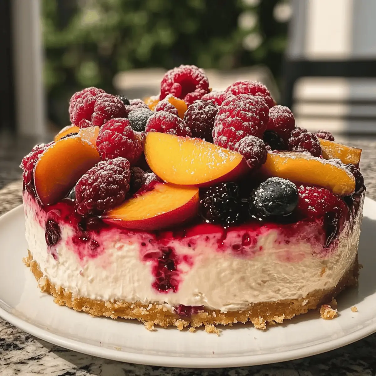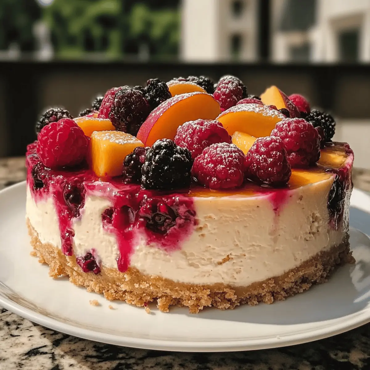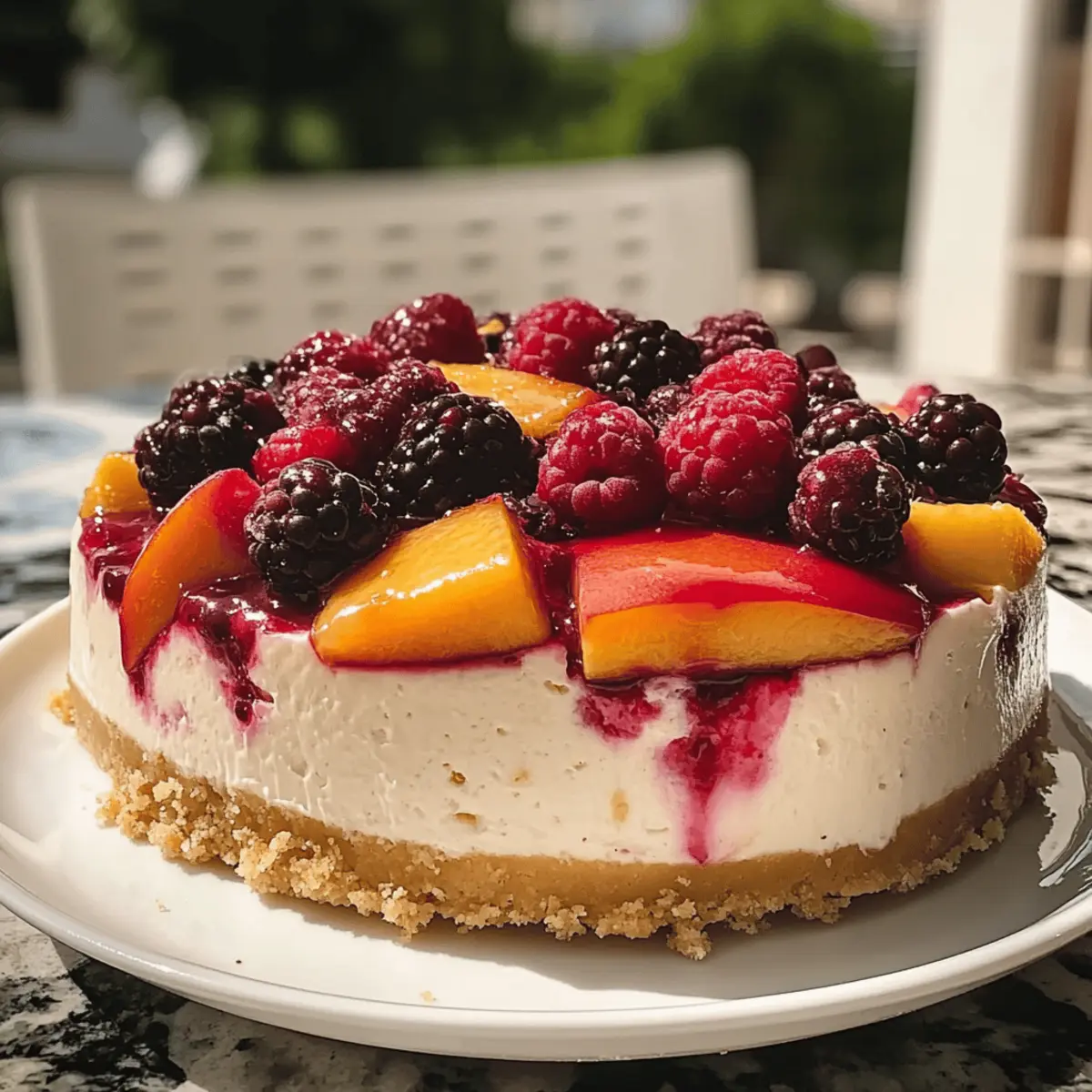 Jump to Recipe Print RecipeAs I pulled the fresh peaches from the farmer’s market, their sun-kissed sweetness made my heart skip a beat. This Creamy Summer Berry and Peach Cheesecake invites you to bring the essence of summer right into your kitchen. With a smooth, indulgent filling and a crunchy graham cracker crust, it’s the perfect antidote to those hot evenings when all you crave is something light yet satisfying. Plus, the vibrant topping of fresh berries and juicy peaches adds a refreshing twist that makes it a guaranteed crowd-pleaser! Did I mention that it’s also gluten-free friendly? So, gather your loved ones and get ready to create not just a dessert, but a delightful summer memory. What are you waiting for—let’s dive into this scrumptious recipe! Why is this cheesecake a summer must? Creamy Indulgence: The luscious filling combines the tanginess of cream cheese with the sweetness of ripe peaches, creating a smooth texture that melts in your mouth. Fruity Freshness: Topped with bright berries and juicy peaches, each slice bursts with flavor, perfectly capturing the essence of summer. Gluten-Free Option: This recipe easily accommodates gluten-free diets, allowing everyone to indulge without worry. Easy Prep: With simple ingredients and straightforward instructions, you can whip this up in no time—perfect for unexpected guests or casual gatherings! Crowd-Pleasing Delight: Whether for a summer barbecue or potluck, this cheesecake is sure to be the star of the dessert table. Versatile Variations: Feel free to switch out the fruits for other seasonal picks, like mango or kiwi, to keep it fresh and exciting, just like with my Cherry Cheesecake Puppy or Three Ingredient Peach recipes! Berry and Peach Cheesecake Ingredients For the Crust • Graham Cracker Crumbs – These provide a classic cheesecake flavor and crunchy texture. You can substitute with crushed cookies like Oreos for a different twist. • Granulated Sugar – Sweetens the crust, essential for balancing flavors. • Unsalted Butter – Binds the crumbs together for a rich, flavorful base. Melt before mixing. For the Filling • Cream Cheese – The star of the filling, creating that signature creamy texture. Neufchâtel cheese can be a lighter substitute if desired. • Sour Cream or Heavy Cream – Adds a luscious richness and tanginess. If avoiding dairy, use firm dairy-free cream cheese. • Eggs – Provide structure and stability for the cheesecake, ensuring it holds its shape. • Granulated Sugar – Sweetens the filling to complement the fresh fruits. • Vanilla Extract – Elevates the flavor profile without needing any substitutions. • Flour (optional) – Used for added stability; not required if making a gluten-free version. For the Topping • Fresh Berries (such as strawberries, blueberries, or raspberries) – These are the real stars of the show! They provide a juicy burst of flavor and color. • Fresh Peaches – Sweet and juicy, they enhance the cheesecake’s summer vibe. Frozen peaches can also be used if fresh ones aren’t available, just ensure they’re thawed and drained. This Berry and Peach Cheesecake is not just a dessert; it’s a delicious fiesta of summer flavors everyone will love! Step‑by‑Step Instructions for Berry and Peach Cheesecake Step 1: Preheat the Oven Begin by preheating your oven to 325°F (160°C). This ensures the perfect baking environment for your cheesecake. While the oven warms up, gather all your ingredients and equipment, including a 9-inch springform pan, mixing bowls, and an electric mixer. The right temperature is crucial for a smooth and creamy consistency in your Berry and Peach Cheesecake. Step 2: Prepare the Crust In a medium bowl, combine graham cracker crumbs, sugar, and melted butter. Mix until the crumbs are well-coated and resemble wet sand. Press this mixture firmly into the bottom of your springform pan to create an even crust. Bake for 10 minutes until lightly golden, then remove and let it cool completely before adding the filling. Step 3: Make the Filling In a large mixing bowl, beat softened cream cheese with an electric mixer until smooth and creamy. Gradually add granulated sugar while mixing at low speed. Next, add the eggs one at a time, mixing just until blended after each addition. Finally, incorporate vanilla extract and sour cream, ensuring everything is nicely combined to create the rich filling for your Berry and Peach Cheesecake. Step 4: Bake the Cheesecake Carefully pour the creamy filling over the cooled crust in your springform pan. Smooth the top with a spatula for a beautiful finish. Place it in the preheated oven and bake for 50 to 60 minutes. The center should be slightly jiggly but set; this is key for a perfectly textured cheesecake. Step 5: Cool Gradually Once baking is complete, turn off the oven and let the cheesecake cool inside for 1 hour with the door slightly ajar. This gradual cooling helps prevent cracks on the surface of your Berry and Peach Cheesecake. Afterward, transfer it to room temperature to cool completely before refrigerating. Step 6: Chill the Cheesecake Cover your cheesecake with plastic wrap and refrigerate for at least 4 hours, though overnight is ideal. This chilling time allows the flavors to deepen and solidifies the creamy texture, making it a delight to slice. Perfect timing while you plan for the big reveal at your summer gathering! Step 7: Top with Fresh Fruit Before serving, arrange your fresh berries and sliced peaches artfully on top of the cheesecake. For a touch of sweetness and gloss, you can gently brush warmed apricot jam over the fruit. This not only enhances the presentation but adds to the juicy, vibrant flavor of each bite of Berry and Peach Cheesecake. Step 8: Serve with Care To serve, carefully release the springform pan and slice the cheesecake into wedges. For the best texture, enjoy it chilled. This delightful dessert is perfect for summer events; share the joy and