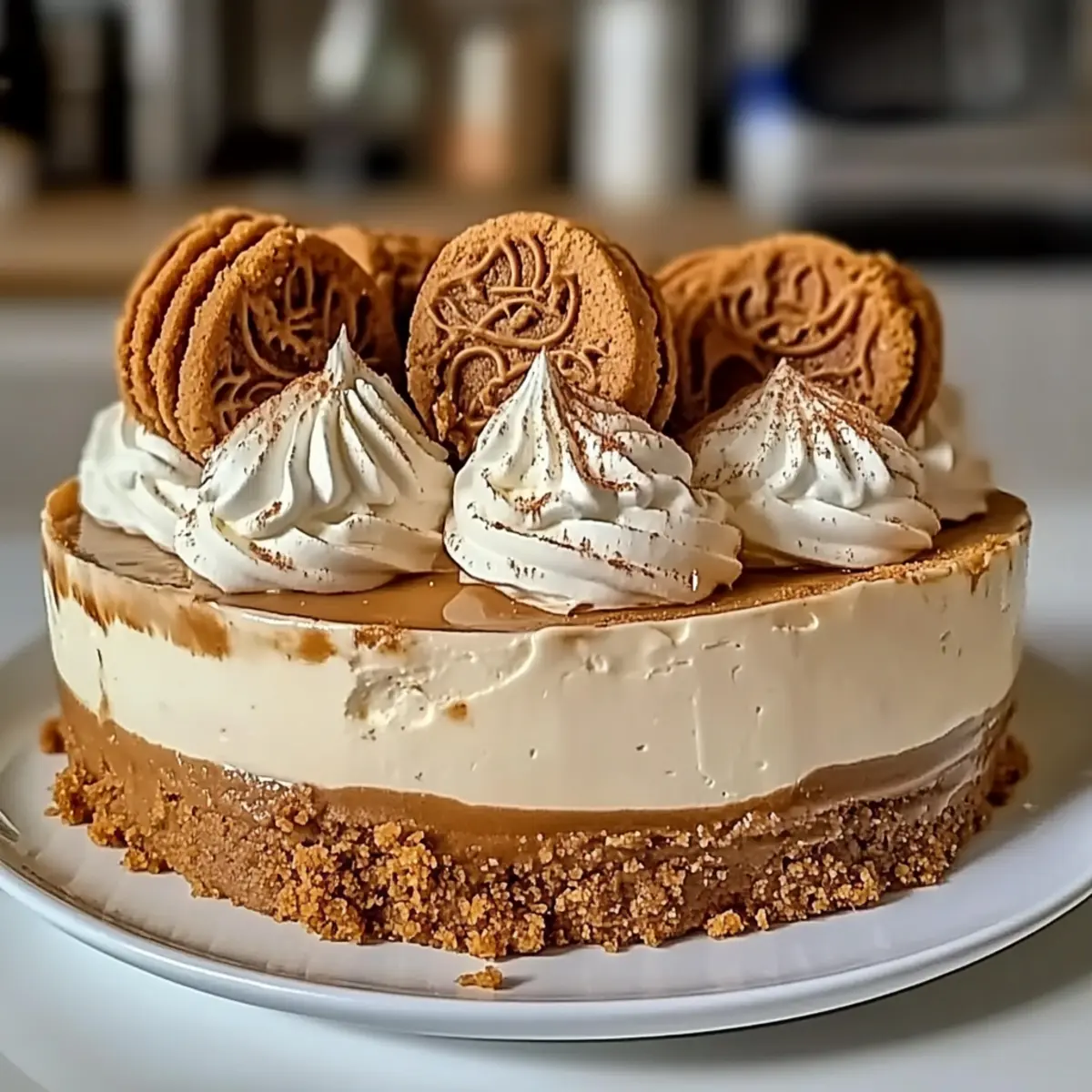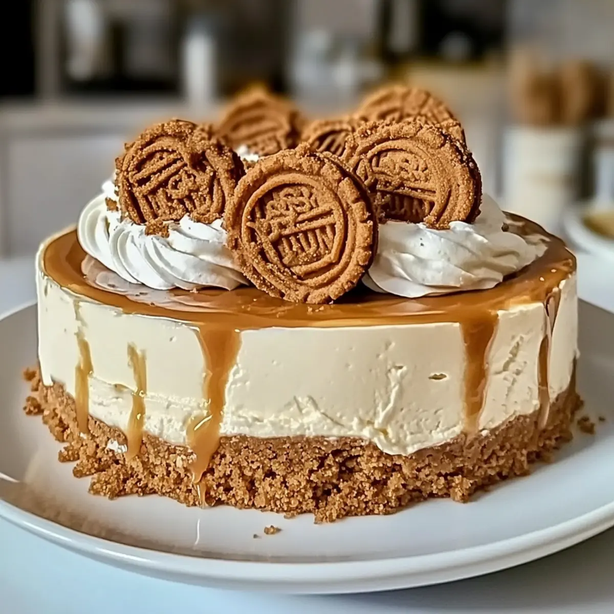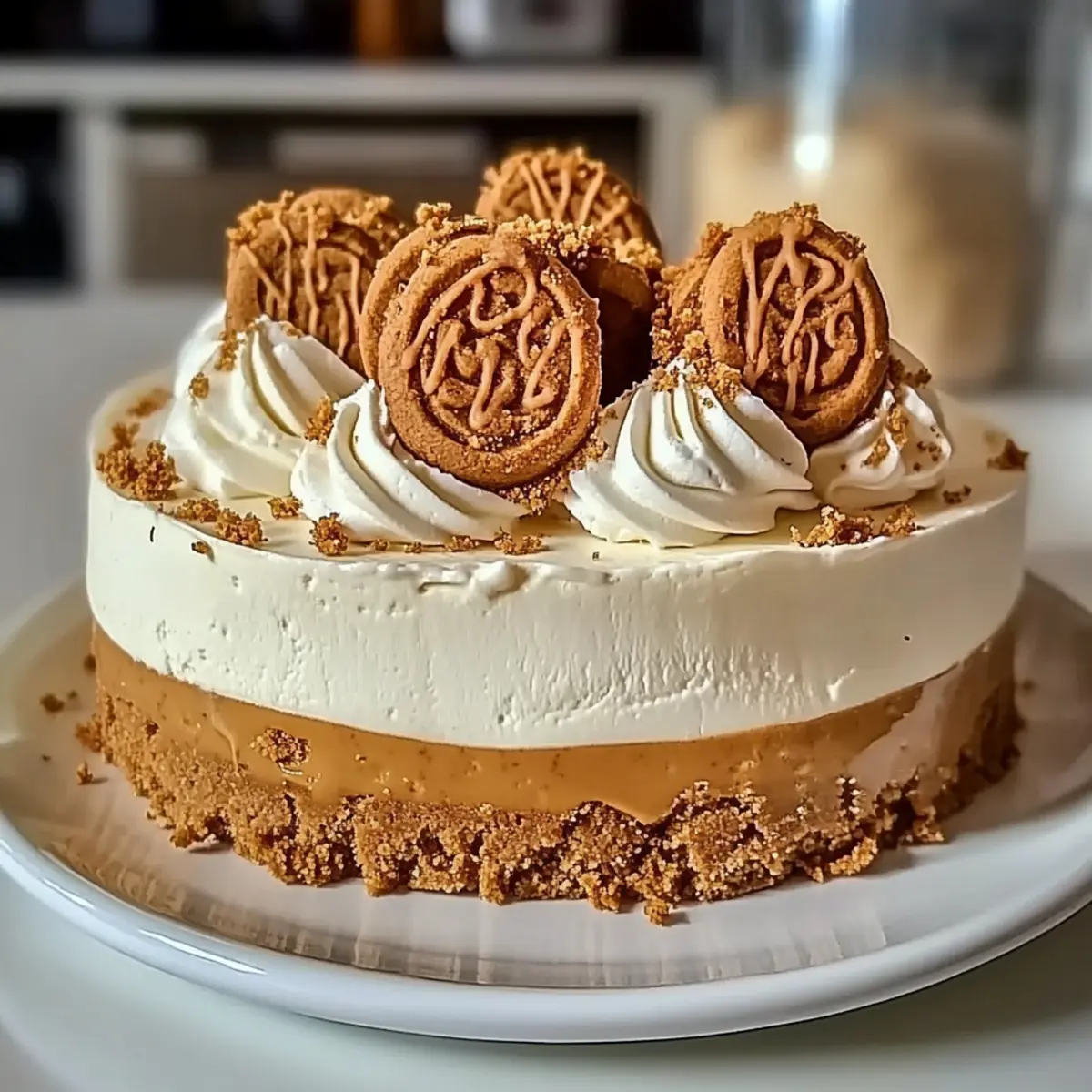Jump to Recipe Print RecipeAs I sifted through my pantry, I stumbled upon a jar of Biscoff cookie butter—its alluring aroma instantly whisked me back to my happiest baking memories. That’s when the idea hit me: why not craft a Rich Biscoff Cookie Butter Cheesecake? This dessert isn’t just a crowd-pleaser, perfect for family gatherings or special occasions; it’s also surprisingly simple to whip up, allowing you to spend more time enjoying the company of your loved ones rather than slaving away in the kitchen. With its creamy texture and delightful cookie-spice essence, this cheesecake is entirely customizable—easily transformed for any dietary need. Are you ready to dive into a slice of indulgence? Why is this cheesecake so irresistible? Decadent Flavor Explosion: This Biscoff Cookie Butter Cheesecake delivers a uniquely rich and spiced flavor that’s hard to resist. Effortlessly Simple: With just a few ingredients and straightforward steps, impressing friends and family has never been easier. Customizable Treat: Whether you’re in the mood for a nutty twist or a fruity fusion, this cheesecake is versatile enough to suit everyone’s palate. Perfect for Any Occasion: Ideal for special events or casual gatherings, it’s a dessert that brings people together. You might also enjoy our delightful Peanut Butter Banana Oatmeal Creme Pies for another crowd-pleasing option! Biscoff Cookie Butter Cheesecake Ingredients • Create your own dessert masterpiece with these essential elements! For the Crust Biscoff Cookie Crumbs – Base for the crust that provides a spiced, sweet flavor; substitute with graham crackers or digestive biscuits if desired. Biscoff Cookie Butter – Adds richness and enhances the cookie flavor; alternative: various cookie butters or nut butters can be used. Unsalted Butter – Binds the crust; adds richness; coconut oil can replace for a dairy-free option. Brown Sugar – Provides sweetness and depth to the crust; granulated sugar can be used as a substitute. For the Filling Cream Cheese – Main filling component, gives a creamy texture; Neufchâtel cream offers a lower-fat option. Granulated Sugar – Sweetens the filling and balances flavors; coconut sugar is a suitable alternative. Eggs – Provides structure and stability; essential for a creamy texture; aquafaba can be used as a vegan alternative. Sour Cream – Adds moisture and tanginess; Greek yogurt can be substituted. Heavy Cream – Adds richness; used for whipping topping; can replace with full-fat coconut milk for a dairy-free option. For the Topping Powdered Sugar – Sweetens and provides texture to the whipped topping; no substitutes recommended; essential for stabilization. Whole Biscoff Cookies – For garnish; adds visual appeal and additional flavor. Now you’re just a few ingredients away from creating your very own Biscoff Cookie Butter Cheesecake that will dazzle your family and friends! 🍰 Step‑by‑Step Instructions for Biscoff Cookie Butter Cheesecake Step 1: Prepare the Crust Preheat your oven to 350°F (175°C). In a mixing bowl, combine Biscoff cookie crumbs, melted butter, Biscoff cookie butter, brown sugar, and a pinch of salt. Use a fork to blend until moistened and crumbly. Press this mixture firmly into the bottom of a greased 9-inch springform pan. Bake for 10 minutes, then remove from the oven and allow it to cool completely. Step 2: Make the Filling In a large mixing bowl, beat the room temperature cream cheese on medium speed until creamy and smooth, about 2-3 minutes. Gradually pour in granulated sugar and Biscoff cookie butter, mixing until fully combined. Add eggs one at a time, mixing on low speed to prevent overmixing, until the batter is smooth. Gently fold in sour cream, heavy cream, and vanilla extract, ensuring a velvety consistency. Step 3: Bake the Cheesecake Wrap the bottom of the springform pan tightly with aluminum foil to prevent water from seeping in. Place the pan into a larger baking dish, then fill the dish with hot water until it reaches halfway up the side of the springform pan. Carefully pour the cheesecake filling over the cooled crust. Bake at 325°F (160°C) for 60–70 minutes, until the edges are set, but the center remains slightly jiggly. Step 4: Cool Gradually Once baked, turn off the oven but leave the cheesecake inside with the door slightly ajar for 1 hour. This gradual cooling process prevents cracks. Afterward, remove the cheesecake from the oven and allow it to cool at room temperature for about 30 minutes before transferring it to the refrigerator. Chill for at least 8 hours or overnight for best results. Step 5: Prepare Topping When ready to serve your Biscoff Cookie Butter Cheesecake, whip the chilled heavy cream in a bowl, gradually adding powdered sugar, until stiff peaks form. Carefully decorate the top of the chilled cheesecake with the whipped cream, and sprinkle with additional Biscoff cookie crumbs and whole Biscoff cookies for an appealing finish. What to Serve with Biscoff Cookie Butter Cheesecake Elevate your dessert experience with delightful pairings that perfectly complement the velvety richness of this cheesecake. Fresh Berries: The tartness of strawberries or raspberries offers a refreshing contrast to the sweetness of the cheesecake. Their pop of color makes the dessert visually stunning. Coffee or Espresso: A rich cup of coffee or a bold espresso enhances the flavors, creating a delightful balance with the creamy sweetness. Whipped Cream: Light and airy, it adds volume and a touch of sweetness, making each slice even more indulgent and luxurious. Chocolate Ganache: Adding a drizzle of rich chocolate brings a decadent flair; the combination of chocolate and spiced cookie notes will have everyone coming back for more. Spiced Ginger Cookies: The spicy kick complements the Biscoff flavors, uniting textures and tastes for a crowd-pleasing treat that leaves a lasting impression. Vanilla Ice Cream: The smooth creamines