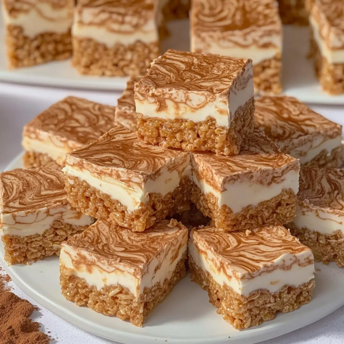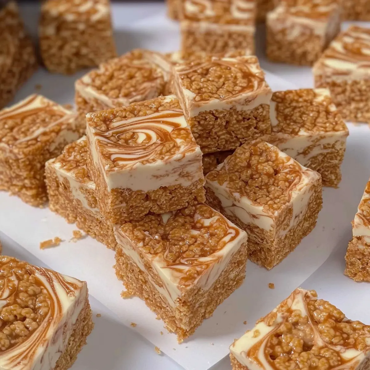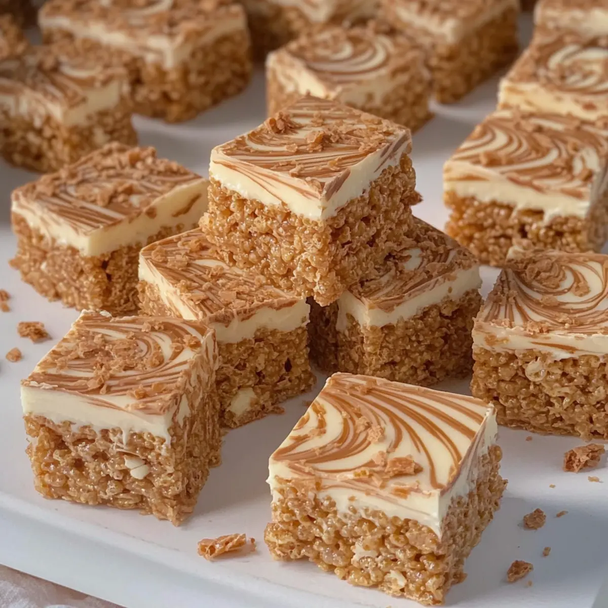 Jump to Recipe Print RecipeThere’s something magical about the simple delight of a well-made Rice Krispie Treat. Now, imagine elevating this classic snack into a no-bake sensation that satisfies your sweet tooth—a dreamy confection that combines the beloved crunch of Rice Krispies with the rich, caramel notes of Biscoff spread. My No-Bake Biscoff Rice Krispie Treats not only capture that nostalgic chewiness but also bring a fun twist to a favorite dessert. Plus, they come together in no time, making them perfect for a quick treat or a crowd-pleasing dessert at your next gathering. Ready to step up your sweet game and impress your friends? Let’s dive in and find out how a few simple ingredients can transform into a delightful snack that will keep everyone coming back for more! Why are Biscoff Rice Krispie Treats irresistible? Easy, No-Bake Delight: Whip up these treats in minutes without the fuss of an oven. Flavor Explosion: The combination of creamy Biscoff spread and crunchy Rice Krispies creates an unforgettable taste experience. Versatile Variations: Customize easily with milk, dark chocolate, or vegan substitutions to appeal to every palate. Perfect for Sharing: Great for parties or coffee dates—everyone will love them! Serve alongside a warm cup of coffee or at your next picnic for the perfect sweet addition. You’ll also want to check out some of my other favorites like Chocolate Peanut Butter Rice Crispy Treats for more no-bake inspiration! Kid-Friendly Fun: Easy enough for little chefs to help make, creating lasting memories in the kitchen. Biscoff Rice Krispie Treats Ingredients For the Base • Rice Cereal – Provides structure and crunch; feel free to use gluten-free rice cereals for a gluten-free treat. • Salt – Enhances the flavors of the other ingredients, making them pop! • Butter (Unsalted) – Binds the mixture and adds richness; consider dairy-free butter for a vegan option. • White Marshmallows – Creates that classic chewy base; opt for gelatin-free marshmallows to fit vegetarian diets. For the Flavor • Biscoff Spread – Adds a unique caramel and spice flavor profile; you can substitute with other cookie butters if desired. • White Chocolate – Drizzled on top for extra sweetness and visual appeal; milk or dark chocolate can be swapped based on preference. For the Topping • Crushed Biscoff Biscuits – Provides a crunchy topping; totally optional, but adds a delightful texture and look! With these ingredients in hand, you’ll be well on your way to creating delectable Biscoff Rice Krispie Treats that are sure to impress! Step‑by‑Step Instructions for Biscoff Rice Krispie Treats Step 1: Prepare the Baking Tin Begin by lining a 9-inch square baking tin with parchment paper, making sure to leave some overhang for easy removal later. Lightly grease the parchment with a bit of butter to help the treats stick less and set aside. This step ensures your Biscoff Rice Krispie Treats will release easily when it’s time to cut them into squares. Step 2: Combine Rice Cereal and Salt In a large mixing bowl, combine the rice cereal with a pinch of salt, which will enhance the flavors of the treats. Stir gently to combine and set this mixture aside, allowing the salt to blend evenly. This will prepare your base for the delicious chewy mixture that will soon come together. Step 3: Melt the Butter and Marshmallows In a medium saucepan over low to medium heat, melt the unsalted butter along with the Biscoff spread and white marshmallows. Stir continuously until everything is fully blended and smooth, approximately 3-5 minutes. Be cautious not to use high heat, as it can cause the mixture to harden. The resulting combination will have a silky texture perfect for coating the cereal. Step 4: Mix in the Rice Cereal Once melted, pour the buttery Biscoff and marshmallow mixture over the rice cereal in your mixing bowl. Use a spatula to fold the ingredients together until the cereal is evenly coated. This should take about 2-3 minutes. The mixture will be sticky and fragrant, transforming into a delightful base for your Biscoff Rice Krispie Treats. Step 5: Press into the Tin Transfer the coated cereal mixture into the prepared baking tin, using your spatula or hands to firmly press it down and smooth the surface. Aim for an even layer that fills the tin with a solid base, working to compress it well. Allow it to set at room temperature for at least 1 hour until firm, ensuring easy cutting later. Step 6: Melt the White Chocolate While the Biscoff Rice Krispie Treats are setting, melt the white chocolate in a microwave-safe bowl. Heat in 30-second bursts, stirring in between until smooth and fully melted, taking about 1-2 minutes total. Once ready, this creamy chocolate will create a delightful drizzle over your treats, adding sweetness and visual appeal. Step 7: Drizzle the Melted Chocolate Carefully pour the melted white chocolate over the set Biscoff Rice Krispie Treats, using a spatula to spread it evenly across the surface. Allow the chocolate to drizzle enticingly over the edges. This step not only enhances the flavor but also adds an eye-catching layer to your treats, elevating your presentation. Step 8: Finish with Biscoff Drizzle and Toppings Warm the remaining Biscoff spread slightly to make it easier to drizzle, then swirl it generously over the white chocolate layer. Use a knife or toothpick to create fun swirls for a decorative touch. Finally, sprinkle crushed Biscoff biscuits on top for a crunchy finish while everything is still warm, and allow it to set completely before slicing into squares. Storage Tips for Biscoff Rice Krispie Treats Room Temperature: Keep your Biscoff Rice Krispie Treats in an airtight container at room temperature for up to 1 week. This helps retain their chewy texture and delightful flavor. Fridge: If you prefer a firmer texture, store the treats in the refrigerator for up to 2 weeks. Make sure they are well-wrapped or in a 