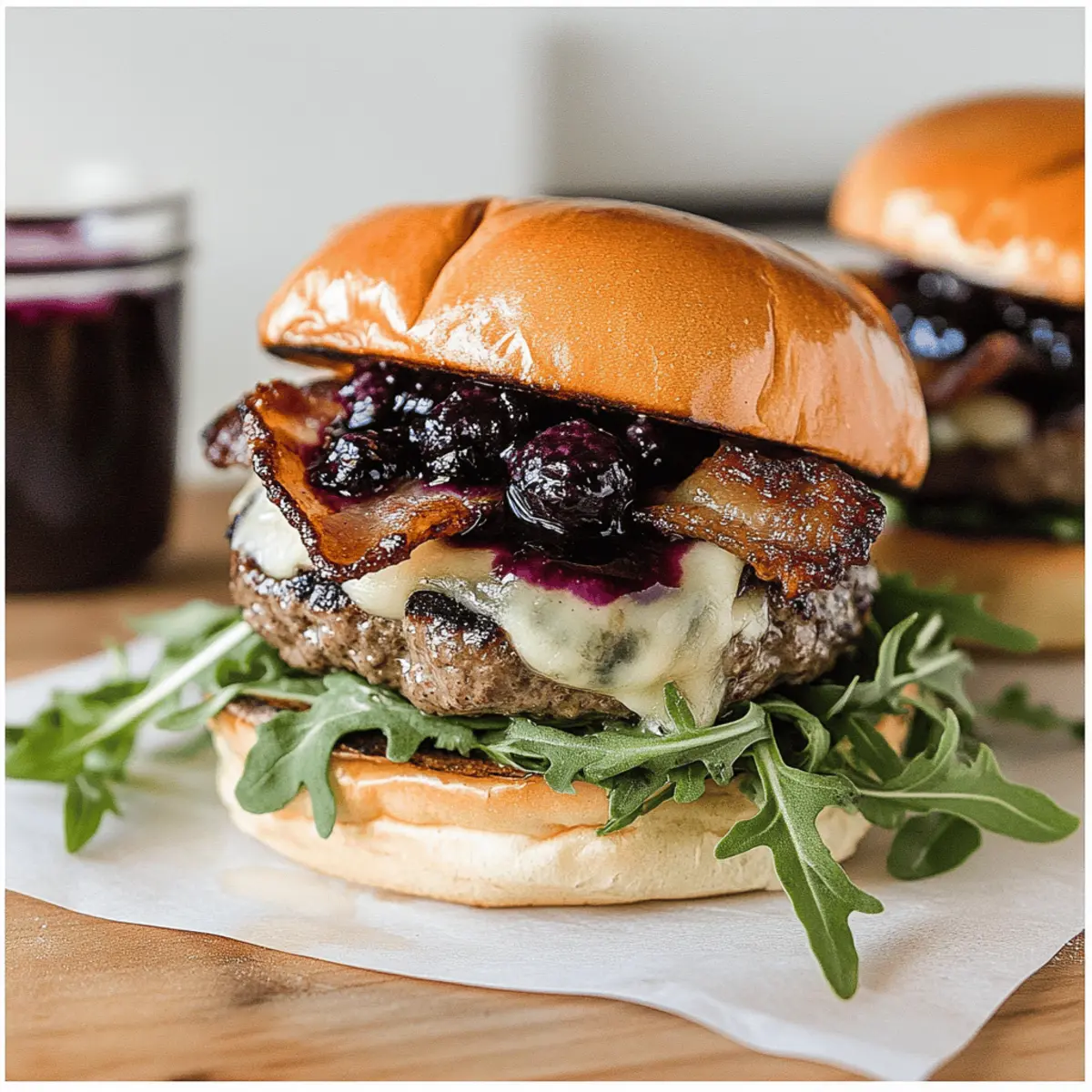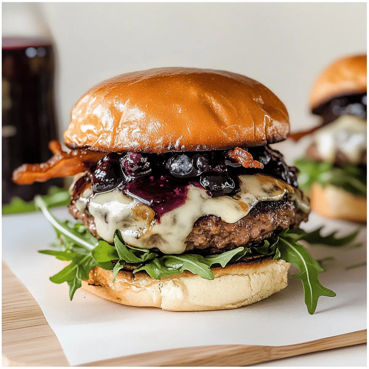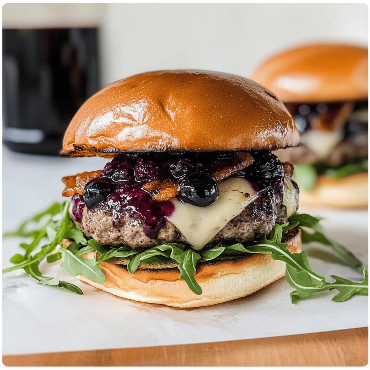 Jump to Recipe Print RecipeAs I stood in my kitchen, the air filled with the sweet notes of fresh blueberries and vibrant basil, I had a lightbulb moment: why not combine these two beautiful flavors in a burger? Enter the Blueberry Basil Gourmet Burger—a unique summer creation that’s bound to impress family and friends at your next barbecue. This recipe is not only a treat for adventurous eaters, but it also brings the simplicity of homemade goodness to your table. With juicy patties adorned with creamy Havarti cheese and crispy bacon, each bite delivers an exciting contrast of textures. Plus, the blueberry balsamic thyme sauce adds an irresistible twist that’s both refreshing and indulgent. Ready to elevate your grilling game? Let’s dive into this delicious journey! Why Try the Blueberry Basil Burger? Unforgettable Flavor: This burger showcases a unique combination of sweet blueberries and fragrant basil, offering a delightful surprise that will tantalize your taste buds. Perfect for Summer: It’s the ideal barbecue dish that combines seasonal freshness with gourmet flair, making it a must-try for sunny days. Versatile Ingredients: You can easily customize the toppings; swap Havarti for goat cheese or mix in different herbs to match your taste. Crowd-Pleaser: Impress your guests with a talked-about recipe that stands out among traditional summer burgers. Pair it with Blueberry Cream Cheese for a complete blueberry experience! Quick and Easy: With a simple assembly process, you can have this gourmet burger on your table in under an hour, allowing you to enjoy quality time with friends. Blueberry Basil Gourmet Burger Ingredients For the Burger High-Quality Burger Patties – Fresh from a butcher ensures the best flavor in your Blueberry Basil Gourmet Burger. Brioche Buns – This soft, slightly sweet bread provides a lovely contrast to the savory ingredients. Cream Havarti Cheese – Melts beautifully to add a rich and creamy element to the burger. For the Toppings Arugula – Its peppery flavor complements the sweetness of the blueberries perfectly. Crispy Bacon – Adds a delightful crunch and savory smokiness to enhance the overall flavor. For the Sauces Blueberry Balsamic Thyme Sauce Fresh or Frozen Blueberries – Provides sweetness and a vibrant color for an appealing sauce. Sugar – Balances the acidity, ensuring a tasty blend of sweet and tangy flavors. Balsamic Vinegar – Adds depth and a hint of acidity that cuts through the richness of the burger. Thyme Leaves – Fresh herbs for an earthy note that rounds out the sauce beautifully. Lemon Juice – Brightens the sauce and heightens all the flavors. Basil Garlic Aioli Mayonnaise – Creates a creamy base for this flavorful condiment. Fresh Basil – Infuses the aioli with aromatic herb goodness that pairs perfectly with the burger. Garlic – Adds zing and depth to enhance every bite of the burger. Extra Virgin Olive Oil – Provides a smooth richness that ties the aioli together. Lemon Juice – Keeps the aioli bright and tangy, balancing the richness. Seasoning Sea Salt, Pepper, Garlic Salt, Onion Powder – Essential seasonings to bring out the burger’s natural flavors. Adjust according to your taste! Step‑by‑Step Instructions for Blueberry Basil Gourmet Burger Step 1: Prepare Blueberry Balsamic Thyme Sauce In a medium saucepan, combine fresh or frozen blueberries, sugar, balsamic vinegar, thyme leaves, and lemon juice. Over medium heat, bring the mixture to a bubbling simmer, stirring occasionally. Allow it to cook for about 15 minutes until it thickens and reduces slightly, then remove from heat. Let the sauce cool before refrigerating it to enhance the flavors until you’re ready to assemble your Blueberry Basil Gourmet Burger. Step 2: Make Basil Garlic Aioli While the blueberry sauce cools, prepare the basil garlic aioli. In a food processor, blend together mayonnaise, fresh basil, minced garlic, extra virgin olive oil, and lemon juice until smooth and creamy. This process should take about 1-2 minutes. Transfer the aioli to a bowl and chill it in the refrigerator while you cook the bacon and burger patties, allowing the flavors to meld beautifully. Step 3: Cook Bacon In a skillet over medium heat, cook your bacon strips until they are crispy, turning occasionally to ensure even cooking. This will take about 8-10 minutes depending on the thickness of the bacon. Once done, remove the bacon and place it on a paper towel-lined plate to drain excess fat. The crispy bacon will add a savory crunch to your Blueberry Basil Gourmet Burger. Step 4: Cook Burger Patties Preheat your grill to medium-high heat, approximately 400°F (200°C). Season the high-quality burger patties with sea salt, pepper, garlic salt, and onion powder on both sides. Grill the patties for about 6 minutes on each side, or until they reach your desired doneness, typically medium (about 160°F). During the last few minutes, add slices of creamy Havarti cheese on top to melt. Step 5: Assemble Burger To assemble your Blueberry Basil Gourmet Burger, start with the bottom half of a brioche bun. Layer a handful of arugula for a peppery bite, followed by the juicy burger patty with melted cheese. Next, generously spoon the blueberry balsamic thyme sauce over the cheese, followed by a couple of crisp bacon strips. Finally, spread the basil garlic aioli on the top bun and place it on the assembled burger, ready to serve! Expert Tips for Blueberry Basil Gourmet Burger Quality Matters: Ensure your burger patties are high-quality and freshly ground for maximum juiciness and flavor in your Blueberry Basil Gourmet Burger. Chill Sauces: After preparing your blueberry balsamic thyme sauce and basil garlic aioli, allow them to chill. This helps meld the flavors together beautifully. Resting Time: Don’t skip the resting period after cooking the patties. Let them sit for a few minutes to lock in juices for a more succulent bite. Brioche Alternatives: If you