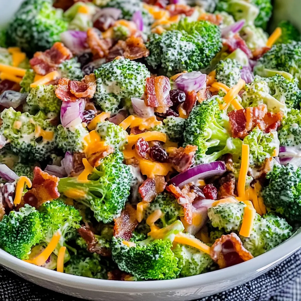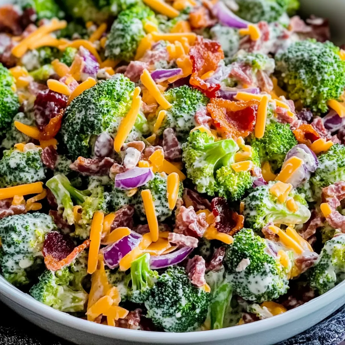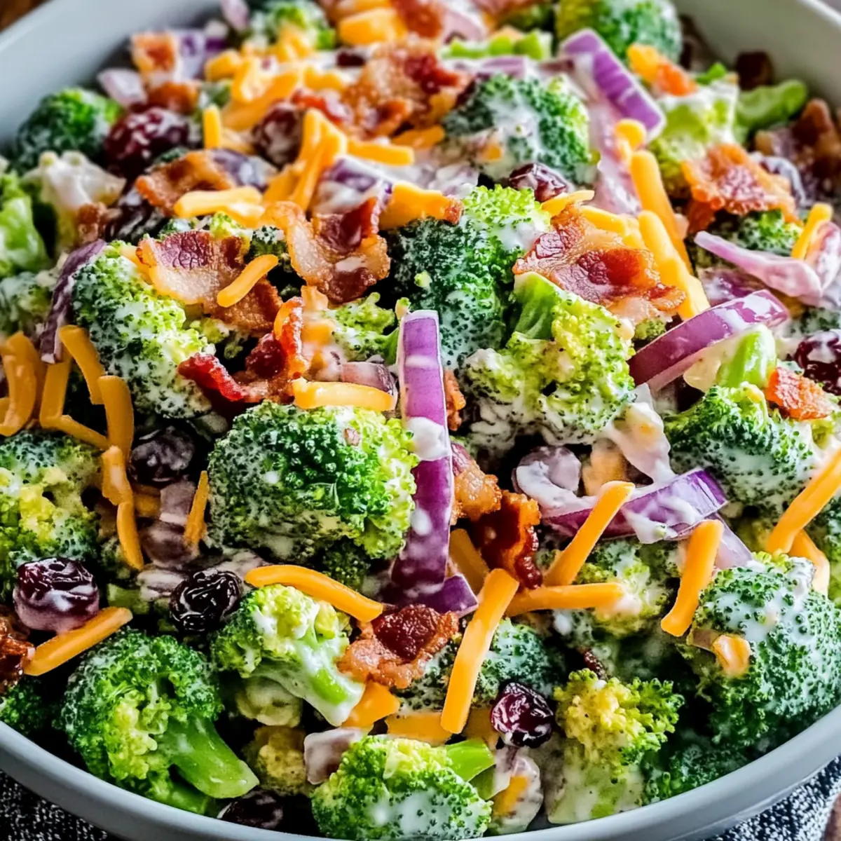 Jump to Recipe Print RecipeAs I rummaged through my fridge, I stumbled upon a beautiful head of broccoli that begged to be turned into something spectacular. That’s when I decided to whip up the Best Broccoli Salad, a deliciously crisp dish that brings smiles to faces young and old alike. This salad is not only quick to prepare in just 10 minutes, but it’s also effortlessly customizable to suit your family’s taste buds. Packed with fresh broccoli, crispy precooked bacon, and a creamy dressing, it’s perfect for potlucks, barbecues, or a light lunch that won’t weigh you down. Plus, it’s gluten-free and vegetarian-friendly if you opt for plant-based substitutes. Who knew a salad could be so versatile and appealing? Ready to dive into the crunch? Let’s get started! Why Is This Broccoli Salad Unique? Flavor-Bursting: This Best Broccoli Salad combines fresh, crunchy broccoli with savory bacon and sweet cranberries, resulting in a dish that’s truly irresistible. Quick & Easy: Whip it up in just 10 minutes – perfect for busy weeknights or spontaneous gatherings. Customizable: Tailor the ingredients to suit every palate, including vegetarian and gluten-free options. Healthy Choice: Packed with nutrients, it’s a guilt-free indulgence the whole family will love. Serve it alongside dishes like Pesto Chicken Broccoli or a fresh Tomato Salad Refreshing to create a vibrant meal! Broccoli Salad Ingredients For the Salad • Broccoli – Use fresh for the best flavor and crunch in your Broccoli Salad. • Precooked Bacon – Choose crispy bacon to enhance the savory bites and texture. • Red Onion – Adds a sharp bite that beautifully complements the sweetness. • Cheddar Cheese – Provides creaminess and a rich flavor, making every bite delightful. • Sunflower Seeds – Contributes a nutty crunch that contrasts with the creamy dressing. • Dried Cranberries – Adds a touch of sweetness and a chewy texture for balance. For the Dressing • Mayonnaise – Forms the base of the dressing; substitute with Greek yogurt for a lighter option. • Apple Cider Vinegar – Offers acidity to balance flavors, enhancing the overall taste. • Honey – Adjust the sweetness based on your preference for the perfect finishing touch. • Salt & Pepper – Essential for seasoning; don’t forget to add to taste! Step‑by‑Step Instructions for The Best Crunchy Broccoli Salad Step 1: Prepare the Broccoli Begin by washing a fresh head of broccoli thoroughly under cold water. Next, chop the broccoli into bite-sized florets, ensuring they are uniformly sized for even mixing. If you prefer a softer texture, blanch the florets in boiling water for 2 minutes, then plunge them into an ice bath for immediate cooling. Drain well and set the broccoli aside in a mixing bowl. Step 2: Combine Salad Ingredients In a large mixing bowl, combine the chopped broccoli with crispy precooked bacon pieces, finely diced red onion, shredded cheddar cheese, crunchy sunflower seeds, and sweet dried cranberries. Toss all the ingredients gently until evenly distributed, allowing the vibrant colors and textures to blend beautifully. Step 3: Whisk the Dressing In a separate small bowl, whisk together the mayonnaise, apple cider vinegar, honey, and a pinch of salt and pepper. Continue whisking until the mixture is smooth and creamy. This dressing will bring everything together, so take your time to achieve a rich consistency that will coat the broccoli salad perfectly. Step 4: Dress the Salad Pour the prepared dressing over the broccoli mixture in the large bowl. Using a spatula or large spoon, gently fold the dressing into the salad until all the ingredients are well coated. Take a moment to admire the creamy, colorful medley as you combine the flavors; this is where the magic of the Best Broccoli Salad truly begins. Step 5: Chill Before Serving Cover the bowl with plastic wrap or transfer the salad to an airtight container. Refrigerate the broccoli salad for at least 30 minutes. This resting period allows the flavors to meld beautifully, enhancing the overall taste. When ready, remove it from the fridge and give it a gentle toss before serving to refresh the textures. Step 6: Final Touches and Serve Taste the salad and adjust the seasoning with extra salt or pepper if needed. If you’re looking for an additional burst of flavor, consider squeezing a bit of fresh lemon juice over the top. Serve the Best Crunchy Broccoli Salad as a delicious side dish or light meal, and enjoy the vibrant flavors and textures with family and friends! Make Ahead Options These Best Broccoli Salad preparations are ideal for meal prep enthusiasts! You can chop the broccoli and mix it with the bacon, red onion, cheese, sunflower seeds, and cranberries up to 24 hours in advance. Just refrigerate the salad base in an airtight container to preserve freshness. For the dressing, whisk the mayonnaise, vinegar, honey, and seasonings, and store it separately. When ready to serve, simply combine the salad mix with the dressing and refrigerate for an additional 30 minutes to allow the flavors to meld. This way, you’ll enjoy a delightful, crunchy broccoli salad just as delicious as if freshly made—perfect for busy weeknights or impromptu gatherings! Expert Tips for the Best Broccoli Salad • Fresh is Best: Use fresh broccoli for maximum crunch and flavor. Avoid pre-cut broccoli, which can lose its freshness. • Chill Time Matters: Refrigerating the broccoli salad for at least 30 minutes lets the flavors meld beautifully, enhancing taste and texture. • Balanced Sweetness: Adjust the honey in the dressing according to your taste. Too much can overpower; start with a little and add more if needed. • Dressing Carefully: Be cautious when adding dressing; start small to avoid a soggy salad. You can always add more if needed. • Creative Additions: Feel free to customize your Broccoli Salad! Consider adding nuts or fruits like apples to play with flavo