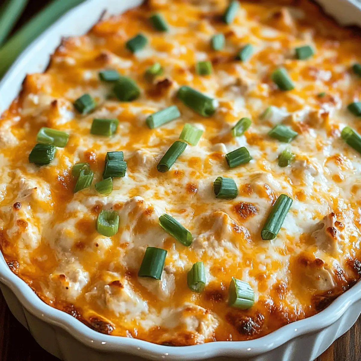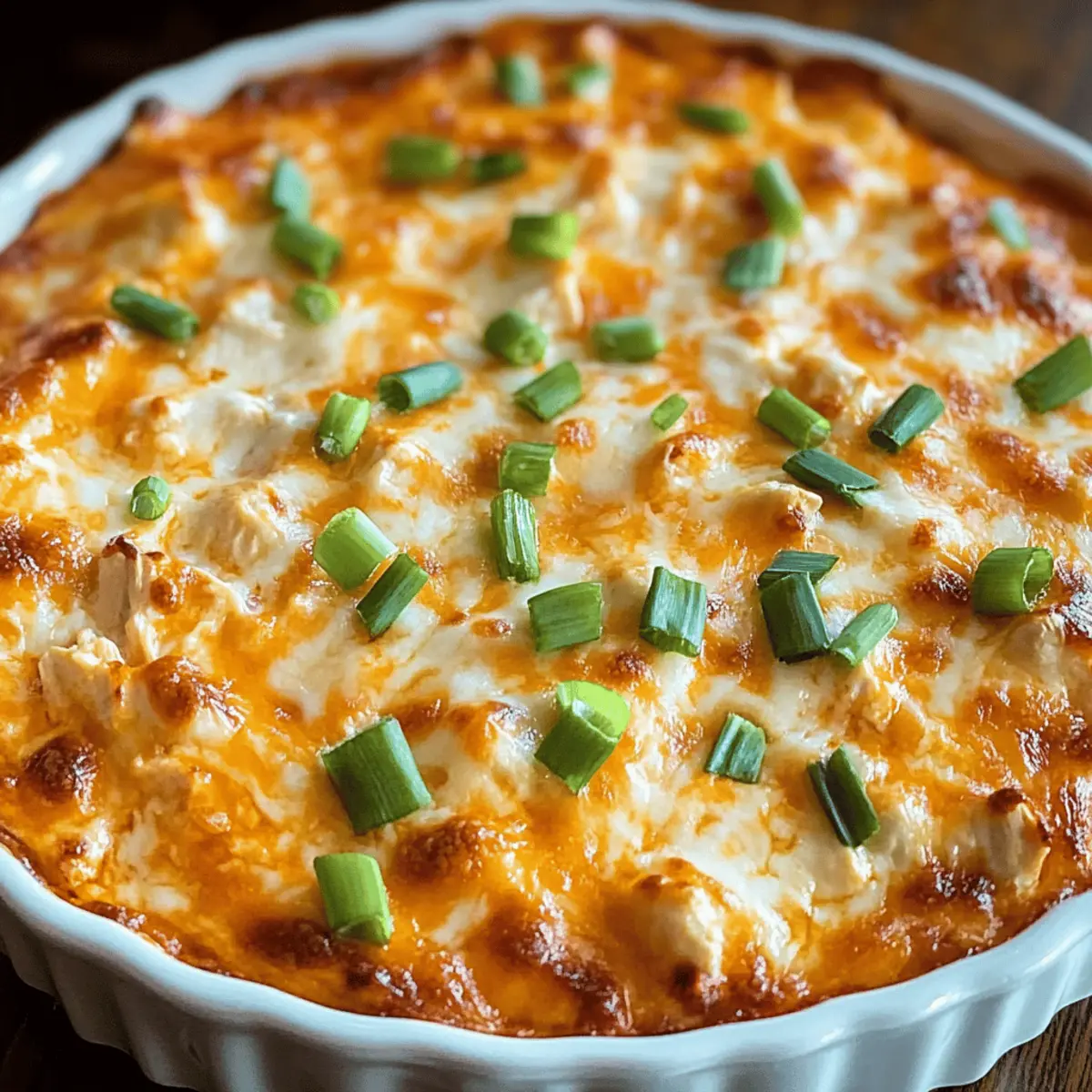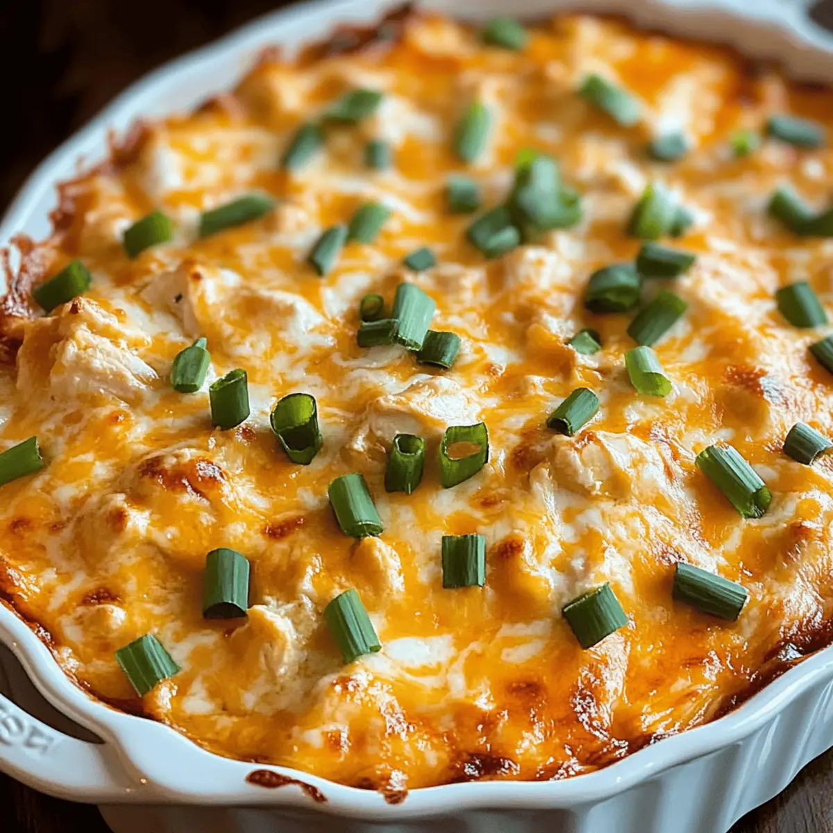 Jump to Recipe Print RecipeThe aroma of hot sauce mingling with melted cheese is enough to make any gathering instantly come alive. If you’re looking for a way to elevate your next game day or potluck, this Creamy Buffalo Chicken Dip is sure to be your secret weapon. It’s a delightful blend of tender shredded chicken, tangy ranch, and just the right kick of heat, creating a creamy masterpiece that pleases every palate. Not only is this spicy chicken dip a crowd-pleaser, but it also comes together in mere minutes, freeing you up for more important things—like enjoying the company of friends and family. Whether you keep the spice level mild or turn up the heat, this dish allows for plenty of personal twists. Ready to dive into this cheesy buffalo dip sensation? Let’s get cooking! Why is Buffalo Chicken Dip a Must-Try? Irresistible Flavor: This Buffalo Chicken Dip combines creamy cheese with spicy hot sauce, resulting in a flavor explosion that’s hard to resist. Quick and Easy: With minimal prep and cooking time, you can whip this up faster than ordering takeout, making it perfect for surprise gatherings. Versatile Serving Options: Pair this dip with tortilla chips, fresh veggies, or even spread it on wraps for a delightful twist. Crowd Favorite: Whether it’s game day, a potluck, or a cozy movie night, this dip is guaranteed to become the star of the show! Make-Ahead Convenience: Assemble the dip a day in advance and simply bake when you’re ready for an effortless entertaining experience. If you’re looking for more exciting chicken recipes, check out my Buffalo Chicken Pasta for another crowd-pleaser! Buffalo Chicken Dip Ingredients For the Dip • Chicken breasts – Primary protein; a rotisserie chicken can save you time. • Cream cheese – Adds creaminess; be sure to soften it to room temperature for easier mixing. • Ranch dressing – Provides tangy flavor; feel free to substitute with homemade if you prefer. • Hot sauce (e.g., Frank’s RedHot) – Brings the heat; adjust the amount to match your spice threshold. • Black pepper – Enhances the overall flavor; freshly ground offers the best taste. • Garlic powder – Contributes aromatic depth; fresh minced garlic can offer a stronger kick. • Green onion – Adds freshness and crunch; substitute with chives for a milder alternative. • Mozzarella cheese – Melts beautifully; you can add extra for an even stretchier topping. • Cheddar cheese – Introduces sharpness; opt for a sharp variety for more flavor depth. Optional Garnish • Additional green onion – For a burst of color and flavor; sprinkle it on top before serving. Indulge in your homemade Buffalo Chicken Dip with these fantastic ingredients! Step‑by‑Step Instructions for Buffalo Chicken Dip Step 1: Cook and Shred the Chicken Begin by boiling the chicken breasts in a large pot of water over medium heat for about 25 minutes, or until fully cooked. Once done, remove the chicken and let it cool slightly before shredding it into bite-sized pieces using two forks or a stand mixer with a paddle attachment for quick shredding. Step 2: Prep the Oven While you are shredding the chicken, preheat your oven to 350°F (175°C). This ensures that your Buffalo Chicken Dip will bake evenly and achieve that delightful bubbly texture. Gather a 9×13-inch baking dish and set it aside to prepare for the dip assembly. Step 3: Make the Sauce In a medium saucepan over low heat, combine the softened cream cheese, ranch dressing, hot sauce, black pepper, and garlic powder. Stir the mixture frequently with a whisk for about 5–7 minutes, or until the cream cheese is fully melted and the sauce is velvety smooth. This creamy base will bring the Buffalo Chicken Dip to life. Step 4: Combine with Chicken and Cheese Once the sauce is well-blended, add the shredded chicken, chopped green onion, mozzarella cheese, and cheddar cheese into the saucepan. Stir everything together gently until the chicken is thoroughly coated in the cheesy sauce mixture, allowing the flavors to meld beautifully. Step 5: Assemble the Dip Spread the creamy mixture evenly into your prepared baking dish, smoothing the top with a spatula. For an extra cheesy finish, sprinkle additional mozzarella and cheddar cheese on top, ensuring a gorgeous melt during baking. This layer will create a delicious, gooey topping for your Buffalo Chicken Dip. Step 6: Bake and Broil Place the baking dish in the preheated oven and bake for 20–30 minutes, or until the dip is hot and bubbly, with the cheese melted. For a golden crust, switch the oven to broil for an additional 2–3 minutes, keeping a close eye to prevent burning. The dip should be beautifully browned and irresistible. Step 7: Serve Hot Remove the Buffalo Chicken Dip from the oven and let it cool for a few minutes before serving. It’s best enjoyed warm alongside tortilla chips, veggie sticks, or wrapped in tortillas. Gather your friends and family, and dive into this cheesy, spicy delight that is sure to impress! Buffalo Chicken Dip Variations & Substitutions Feel free to get creative with this dip—your taste buds will thank you! BBQ Flavor: Swap hot sauce for BBQ sauce for a sweeter, milder dip that still rocks the flavor. Cheese Variety: Incorporate pepper jack cheese for heat or gouda for a smoky twist; each addition brings a new layer of deliciousness. Veggie Boost: Add chopped celery or diced bell peppers for extra crunch; these veggies invite a freshness that balances the creaminess. Spice Level: Adjust the amount of hot sauce for your desired heat, or use a mild wing sauce for a gentler kick that’s still satisfying. Herb Infusion: Toss in fresh herbs like cilantro or parsley for a burst of color and flavor; they add a lovely brightness that can elevate every bite. Creamy Substitutes: For a lighter version, use Greek yogurt in place of cream cheese. This tweak adds tang without sacrificing creaminess. Dairy-Free: Use dairy-free cheese alter