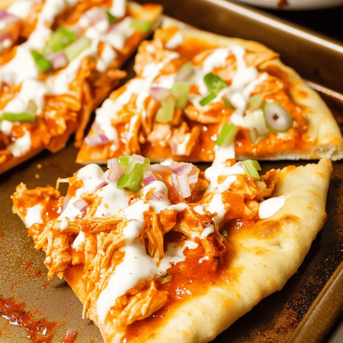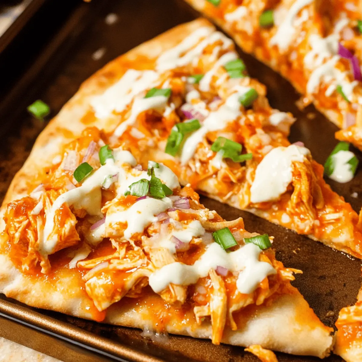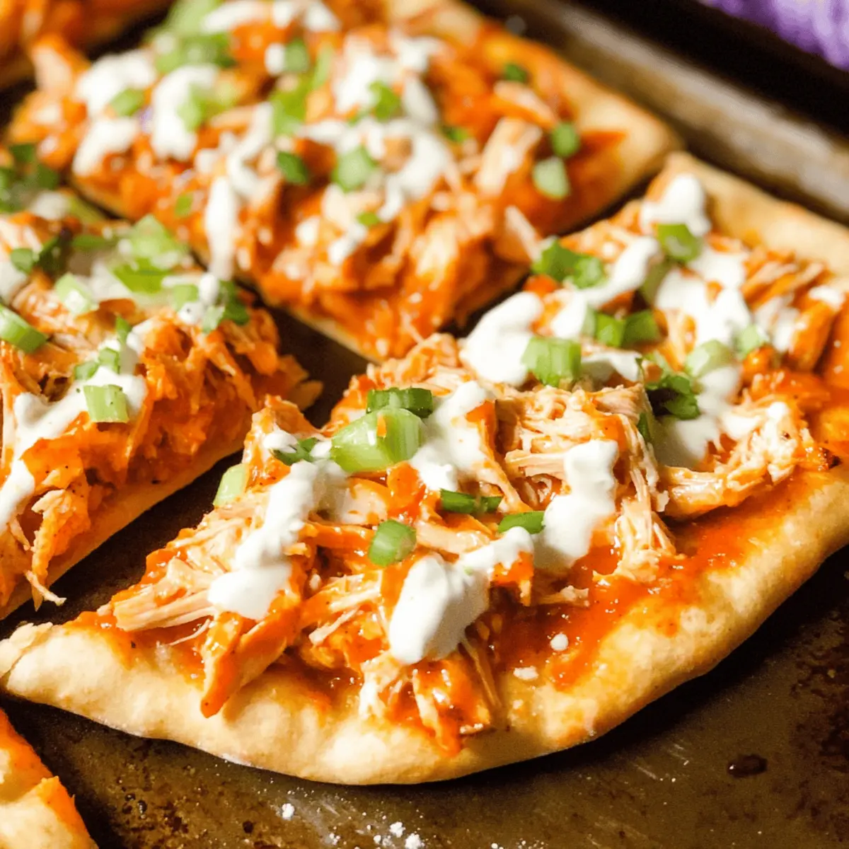 Jump to Recipe Print RecipeA delicious dinner or appetizer can sometimes emerge from the most unexpected combinations. Take, for instance, the Buffalo Chicken Flatbread—a delight that transforms humble naan into an explosion of flavor! With tender rotisserie chicken swirled in zesty buffalo sauce, topped with gooey mozzarella, and drizzled with creamy ranch dressing, this dish is not only a crowd-pleaser but also a quick and easy meal that anyone can whip up in just 30 minutes. Whether you’re enjoying a cozy family night or gearing up for game day, the customizable nature of this flatbread means you can tailor it to your taste. Will you keep it classic, or dare to toss on some extra toppings? Let’s dive in! Why Is Buffalo Chicken Flatbread Irresistible? Simplicity, this dish is so easy that even novice cooks can impress their guests in just 30 minutes! Flavor Explosion, the combination of zesty buffalo sauce and gooey cheese tantalizes the taste buds with every bite. Customizable, feel free to swap in your favorite toppings like bell peppers or jalapeños for a personal twist. Crowd-Pleasing, perfect for family dinners or game day snacks, everyone will be reaching for seconds! Healthy Option, using rotisserie chicken allows for a protein-packed meal without extra cooking time. Enjoy this hearty delight alongside fresh veggies and extra ranch for dipping! Buffalo Chicken Flatbread Ingredients For the Flatbread Base • Naan Bread – The perfect base for your flatbread; can substitute with pita or classic pizza dough for variation. For the Chicken Topping • Shredded Rotisserie Chicken – Provides a flavorful protein; any type of cooked chicken works wonders here. • Buffalo Sauce – Delivers that signature heat; feel free to swap it for barbecue sauce if you prefer a milder flavor. For the Cheesy Goodness • Mozzarella Cheese – Offers that creamy melt; try using cheddar or pepper jack for a twist on the flavor profile. For Garnishing • Ranch Dressing – Creamy topping that balances the spice; blue cheese dressing is a great alternative if you’re feeling adventurous. • Red Onion (optional) – Adds a nice crunch and bite; substitute with green onions for a fresh pop. Seasonings • Garlic Powder – Brings out the savory notes; can replace with onion powder for a different flavor kick. • Salt and Pepper – Essential for flavor enhancement; don’t hesitate to add your favorite spices like red pepper flakes for more heat! Enjoy the magic of Buffalo Chicken Flatbread, a delightful blend that transforms simple ingredients into a feast for the senses! Step‑by‑Step Instructions for Buffalo Chicken Flatbread Step 1: Preheat the Oven Begin by preheating your oven to 400°F (200°C). This will ensure it reaches the perfect temperature while you prepare the rest of the ingredients. Grab a baking sheet and line it with parchment paper for easy cleanup later. Step 2: Combine Chicken and Sauce In a medium bowl, take your shredded rotisserie chicken and pour in 1/4 cup of buffalo sauce. Mix well until the chicken is thoroughly coated in the zesty sauce. The vibrant color will signal it’s ready for the flatbread, adding flavor and a kick that makes this Buffalo Chicken Flatbread irresistible. Step 3: Prepare the Flatbread Base Place the naan bread flat on the prepared baking sheet. Lightly spray or brush the top with olive oil for added crispness and flavor. This step is essential for achieving that golden-brown edge and enhancing the overall texture of your Buffalo Chicken Flatbread. Step 4: Layer the Chicken Mixture Evenly distribute the buffalo chicken mixture over the naan bread, spreading it out to ensure every bite is filled with deliciousness. Make sure to reach the edges for maximum flavor. The vibrant colors of the chicken against the naan will make you eager to continue creating this savory dish. Step 5: Add Cheese and Toppings Sprinkle shredded mozzarella cheese generously over the buffalo chicken. If you’re using red onion or other toppings, add them now, and then season with garlic powder, remaining buffalo sauce, salt, and pepper. The gooey cheese will melt beautifully, turning your flatbread into a comforting delight. Step 6: Bake to Perfection Slide the baking sheet into the preheated oven and bake for 18–20 minutes. Keep an eye on it as it cooks; you want the cheese to be melty and bubbly, while the edges of the naan become crispy. The aroma of buffalo chicken will fill your kitchen! Step 7: Final Touches Once your Buffalo Chicken Flatbread is done baking, carefully remove it from the oven. Drizzle ranch dressing over the top and, if desired, add chopped green onions for freshness. This final touch elevates the dish beautifully, adding an extra layer of flavor and creaminess. Step 8: Slice and Serve Using a sharp knife, slice the flatbread into quarters for easy serving. Gather your friends and family around as you present this delicious Buffalo Chicken Flatbread, the perfect meal or snack to enjoy together! Make Ahead Options These Buffalo Chicken Flatbreads are perfect for meal prep, allowing you to enjoy deliciousness with minimal effort during busy weeknights! You can prepare the buffalo chicken mixture (shredded chicken with buffalo sauce) up to 24 hours in advance. Simply store it in an airtight container in the refrigerator to maintain its flavor and freshness. You can also pre-assemble the flatbreads by layering the naan with the chicken mixture and cheese, then cover and refrigerate for up to 3 days. When you’re ready to serve, just pop them in the oven for 18-20 minutes until the cheese is bubbly and the naan is crispy—just as delicious as if made fresh! Buffalo Chicken Flatbread Variations Feel free to let your creativity shine with these delightful twists on the classic Buffalo Chicken Flatbread! Dairy-Free: Use non-dairy cheese alternatives and substitute ranch with a plant-based option for a creamy finish without dairy. Spicy Kick: Add