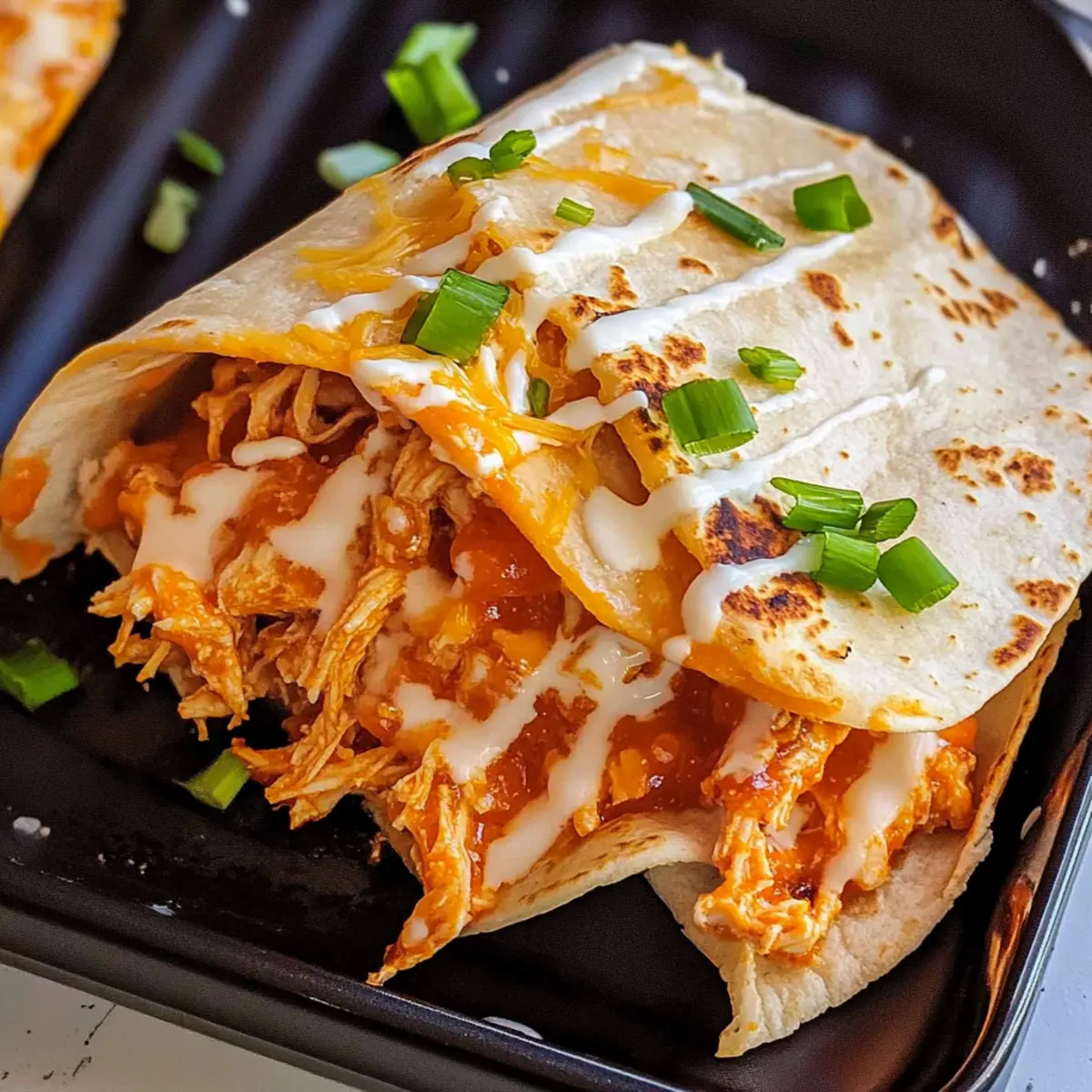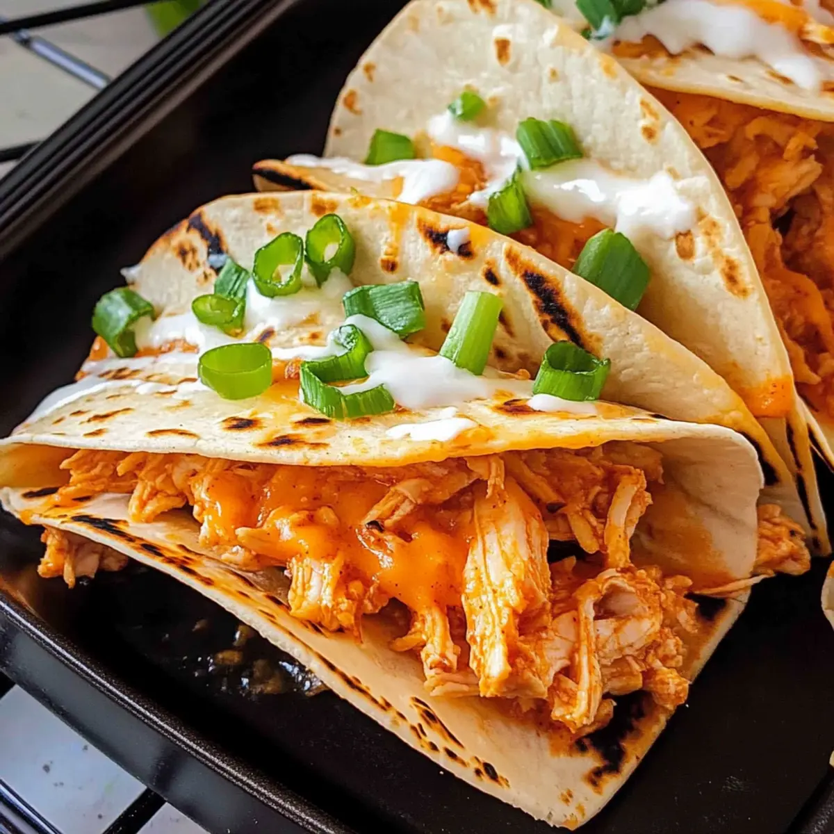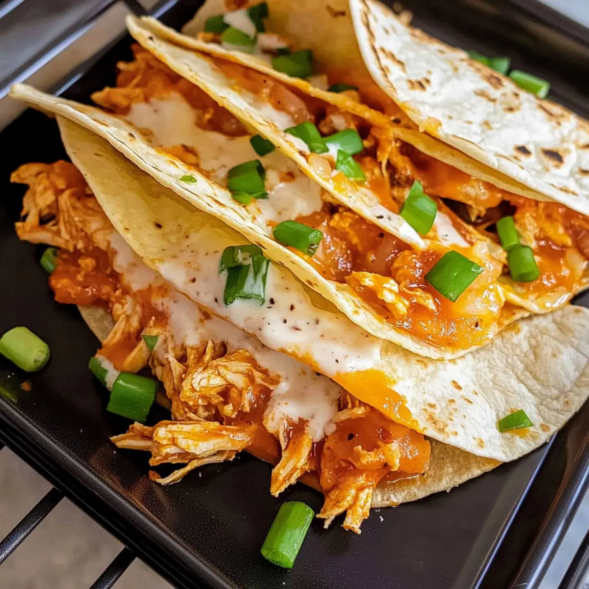 Jump to Recipe Print RecipeWho knew that taco night could become a spicy sensation in less than half an hour? My Spicy Buffalo Chicken Tacos are a game-changer in the kitchen, offering a delicious twist that will have your taste buds dancing without the fuss of marinating or grilling. Picture tender shredded chicken smothered in zesty buffalo sauce, paired with gooey cheddar cheese and a cool drizzle of ranch dressing—all wrapped in warm, crunchy tortillas. This recipe not only delivers mouthwatering flavor but also ensures you can whip up a crowd-pleasing dinner or snack on busy weeknights. Curious about how to elevate your taco game and bring a bit of fun to your table? Let’s dive into the details! Why are Buffalo Chicken Tacos a Must-try? Simplicity: Whip these up in under 30 minutes! No marinating or grilling is needed, making them perfect for those hectic weeknights. Bold Flavors: Expect a flavor explosion with zesty buffalo sauce, creamy ranch dressing, and melty cheese—all wrapped in warm tortillas. Versatile Options: Feel free to customize! Swap chicken for beef or pork, or try different toppings for your personal twist on this classic dish. Crowd-Pleaser: Whether it’s a game day feast or a family dinner, these tacos are sure to satisfy everyone at the table. For more fun taco recipes, check out these Crockpot Chicken Tacos and Poblano Chicken Tacos. Nutritional Goodness: With each taco delivering around 359 calories, you’re balancing indulgence with a decent protein hit from the chicken and cheese. Enjoy guilt-free! Buffalo Chicken Tacos Ingredients • Perfect your taco night with these essential ingredients! For the Filling Shredded Cooked Chicken – This provides the main protein and base flavor; for a quicker option, use rotisserie chicken! Buffalo Sauce – Adds a spicy depth to your tacos; adjust the amount to control the heat level for your taste. Shredded Cheddar Cheese – This creamy addition enhances flavor; feel free to swap in pepper jack for an extra kick! For the Wrapping Flour Tortillas – Soft, warm tortillas hold everything together; corn tortillas are a fantastic gluten-free alternative. For the Drizzle Ranch Dressing – Balances the spice with creaminess; blue cheese dressing offers a classic pairing that complements the buffalo flavors. For the Garnish Chopped Green Onions – They add a fresh, vibrant touch; cilantro can be substituted for a different flavor twist. Step‑by‑Step Instructions for Buffalo Chicken Tacos Step 1: Heat the Chicken In a medium skillet over medium heat, add your shredded cooked chicken and pour in the buffalo sauce. Stir well to combine, cooking for about 5 minutes until the chicken is heated through and evenly coated with the sauce. You’ll know it’s ready when the mixture starts to bubble slightly and clings to the chicken, emitting a fragrant, spicy aroma. Step 2: Warm the Tortillas While the chicken heats, wrap your flour tortillas in a damp paper towel. Microwave them on high for about 30 seconds until they are warm and pliable—this helps prevent tearing when you assemble your tacos. Alternatively, you can warm them on a griddle for about 1 minute per side over medium heat until just soft. Step 3: Prepare the Tortilla Base Once the tortillas are warmed, spread a generous layer of ranch dressing onto one side of each tortilla. This will provide a creamy contrast to the spicy buffalo chicken. Make sure to cover the surface evenly for full flavor, enhancing your Buffalo Chicken Tacos with a deliciously cool bite. Step 4: Fill the Tacos Spoon the warm buffalo chicken filling onto one half of each tortilla, then sprinkle a layer of shredded cheddar cheese over the top. An even distribution allows the cheese to melt uniformly once you start cooking. Ensure you don’t overload the tortillas, leaving enough space to dip or fold them without spilling. Step 5: Cook the Tacos Carefully fold each tortilla in half over the filling. In a non-stick skillet, add a drizzle of oil and place the folded tacos seam-side down. Cook on medium heat for 2-3 minutes per side, or until the tortillas are golden brown and crispy, and the cheese is melted. You’ll know they’re done when they are warm to the touch and the edges appear perfectly toasted. Step 6: Garnish and Serve Once cooked, remove the tacos from the skillet and place them on a serving platter. Garnish each taco with chopped green onions for a pop of color and a hint of freshness. Serve your Buffalo Chicken Tacos immediately, allowing everyone to dive into the crunchy, flavorful goodness that’s sure to bring everyone to the table! Storage Tips for Buffalo Chicken Tacos Fridge: Store assembled tacos in an airtight container for up to 3 days. Make sure they are tightly sealed to retain freshness and prevent sogginess. Freezer: For longer storage, freeze the buffalo chicken filling in an airtight container for up to 1 month. Thaw it overnight in the fridge before reheating. Reheating: To reheat, gently warm the tacos in a non-stick skillet over medium heat until they’re heated through, about 4-5 minutes. This keeps the tortillas crispy while the buffalo chicken stays moist. Leftover Chicken: If you have leftover buffalo chicken filling, it can be used in other dishes like salads or wraps, adding versatility to your meal prep! Buffalo Chicken Tacos Variations & Substitutions Inviting your creativity in the kitchen is just a sprinkle away! Here are delightful ways to customize your Buffalo chicken tacos for an exciting twist. Protein Swap: Use pulled pork or shredded beef for a different protein option! The richness of these meats pairs surprisingly well with buffalo sauce. Gluten-Free Option: Replace flour tortillas with corn tortillas for a delicious gluten-free meal. Enjoy all the same flavors without the gluten! Spicy Kick: Add diced jalapeños or a splash of sriracha for an extra heat boost. Spice-lovers will delight in this fiery enhancement! Cheesy Variety: Sw