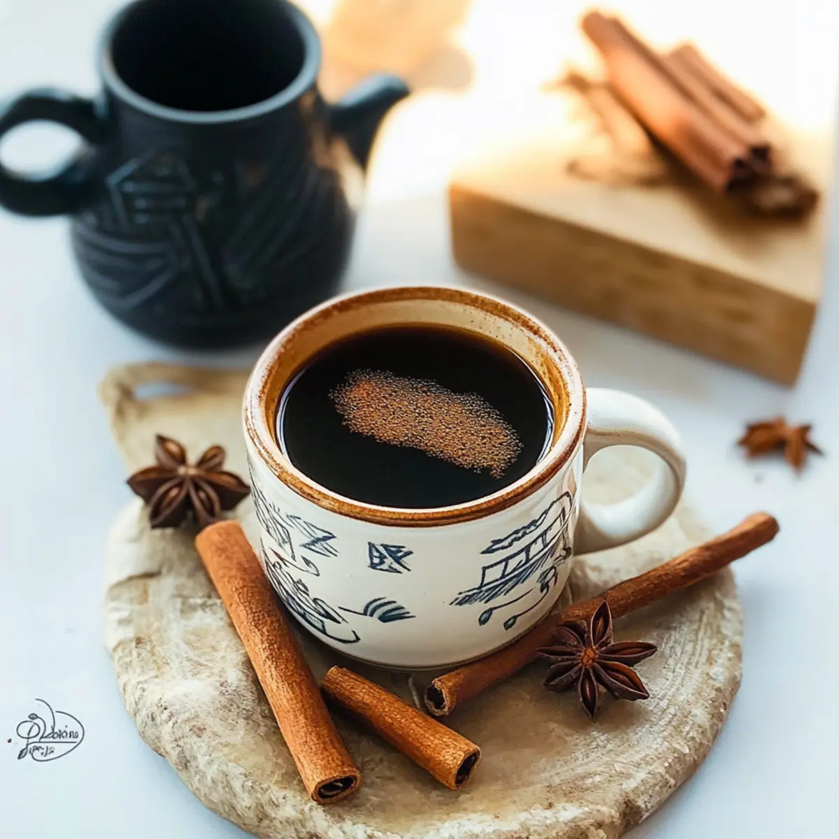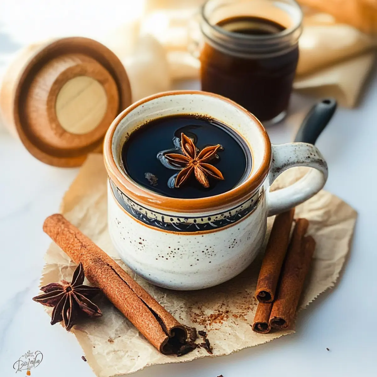 Jump to Recipe Print RecipeA delightful aroma wafts through my kitchen, instantly transporting me to the vibrant streets of Mexico. My latest obsession? Café de Olla, the traditional Mexican coffee that’s as comforting as it is delicious. With its rich spices like cinnamon, star anise, and cloves balanced perfectly with the unique sweetness of piloncillo, this brew is guaranteed to awaken your senses. What I love most is that it takes just under 15 minutes to prepare, making it a quick yet indulgent option for any coffee lover. Plus, it’s easily adaptable for those who enjoy experimenting with flavors or need dietary adjustments. Ready to discover how to make this heartwarming beverage? Let’s dive in! Why is Café de Olla So Special? Rich Flavor Profile: Café de Olla boasts a unique blend of spices that create an aromatic experience like no other. The warmth of cinnamon, the depth of cloves, and the sweet notes of piloncillo come together for a satisfying sip. Quick to Prepare: In just under 15 minutes, you can brew a deliciously comforting cup that rivals your favorite café. Perfect for busy mornings or cozy evenings, you won’t need to settle for fast food coffee again! Versatile Sweeteners: Customize your drink! Whether you prefer traditional piloncillo or healthier options like erythritol or monk fruit, this recipe adapts to suit your taste and dietary needs seamlessly. Cultural Connection: Embrace a piece of Mexican heritage with each cup. Café de Olla is a drink infused with rich traditions, making it not just a beverage, but an experience worth savoring. Perfect Pairing: Serve it hot and elevate your coffee game by enjoying it alongside sweet treats for an authentic experience. Cheers to making everyday moments extraordinary with this delightful brew! Café de Olla Ingredients For the Brew • Water – The essential base for your coffee; no substitutions necessary. • Cinnamon Stick – Infuses warm spice and aroma; can substitute with ground cinnamon (adjust quantity). • Star Anise – Adds a distinct licorice-like flavor; substitute with ½ teaspoon of anise extract if needed. • Cloves – Provides depth and warmth; can use allspice as an alternative. • Sweetener (Piloncillo) – Offers traditional sweetness and depth; substitute with ½ cup of brown sugar or erythritol/monk fruit for a low-calorie option. • Ground Coffee – The heart and soul of your café de olla; use your favorite coffee blend to suit your palate. Optional Additions • Orange Peel – For an unexpected citrus aroma, add during brewing for an elevated flavor. • Milk – If preferred, add a splash for creaminess, though it’s delightful without. Enjoy this delightful Café de Olla as a rich, spiced Mexican coffee that transforms any coffee moment into a warm embrace! Step‑by‑Step Instructions for Cafe de Olla (Mexican coffee) Step 1: Combine Base Ingredients In a large pot, pour in 4 cups of water and add a cinnamon stick, 2 whole star anise, 3-4 cloves, and your chosen sweetener, preferably piloncillo. Over medium heat, bring this mixture to a rolling boil, stirring occasionally until the sweetener fully dissolves, which takes about 3-5 minutes. Your kitchen should be filled with a delightful aroma by now. Step 2: Incorporate Coffee Grounds Once the mixture is boiling, promptly add ½ cup of ground coffee. Stir it gently for a moment, then turn off the heat immediately. Cover the pot with a lid and let it steep for 5-10 minutes, allowing the flavors of the spices and coffee to meld together. The coffee will develop a rich, inviting hue as it brews. Step 3: Strain and Serve After steeping, carefully strain the coffee into mugs using a fine-mesh strainer to capture the spices and grounds. If you prefer a creamier texture, feel free to add a splash of milk at this point. The warm, aromatic brew of Cafe de Olla is now ready to be enjoyed—it’s the perfect cozy drink for any occasion! Café de Olla (Mexican Coffee) Variations Feel free to make this delightful brew your own by adding your favorite flavors or making simple substitutions. Sweetener Swap: Use brown sugar or honey for a different sweetness profile; both complement the spices beautifully. Orange Peel: Add a strip of orange peel during brewing for a zesty twist; it enhances the coffee’s warm aromas. Ground Nutmeg: A pinch of nutmeg can add complexity; it pairs wonderfully with the existing spices for a cozy flavor hug. Dairy-Free Option: Substitute traditional milk with almond or oat milk for a creamy, lactose-free experience that doesn’t compromise on flavor. Brown Sugar Substitute: For a low-calorie version, swap piloncillo with erythritol or monk fruit; enjoy the same delicious taste without the added sugar. Extra Spice: If you love bold flavors, increase the amount of cinnamon or add a dash of cayenne pepper for a delightful kick. Mocha Twist: Blend in a teaspoon of cocoa powder for a chocolaty version; it creates a luscious coffee that coffee and chocolate lovers will adore. Cold Brew Version: For a refreshing take, brew your café de olla concentrate and serve it over ice; perfect for warm days! Experimenting with these variations allows you to enjoy personalized cups of café de olla each time. Want more ways to enjoy unique flavors? Consider exploring Dairy-Free Milk Alternatives or Creative Sweetening Options to take your coffee adventures even further! Make Ahead Options Café de Olla is perfect for meal prep enthusiasts, making it an ideal choice for busy days! You can prepare the spiced base (water, cinnamon stick, star anise, cloves, and your chosen sweetener) up to 24 hours in advance; simply boil them and allow to cool before refrigerating. When ready to enjoy your refreshing Mexican coffee, heat the base on the stove, stir in the ground coffee, and steep for 5-10 minutes. This method ensures that your Café de Olla retains its rich flavors and aromatic spices, providing a delightful coffee experience ju