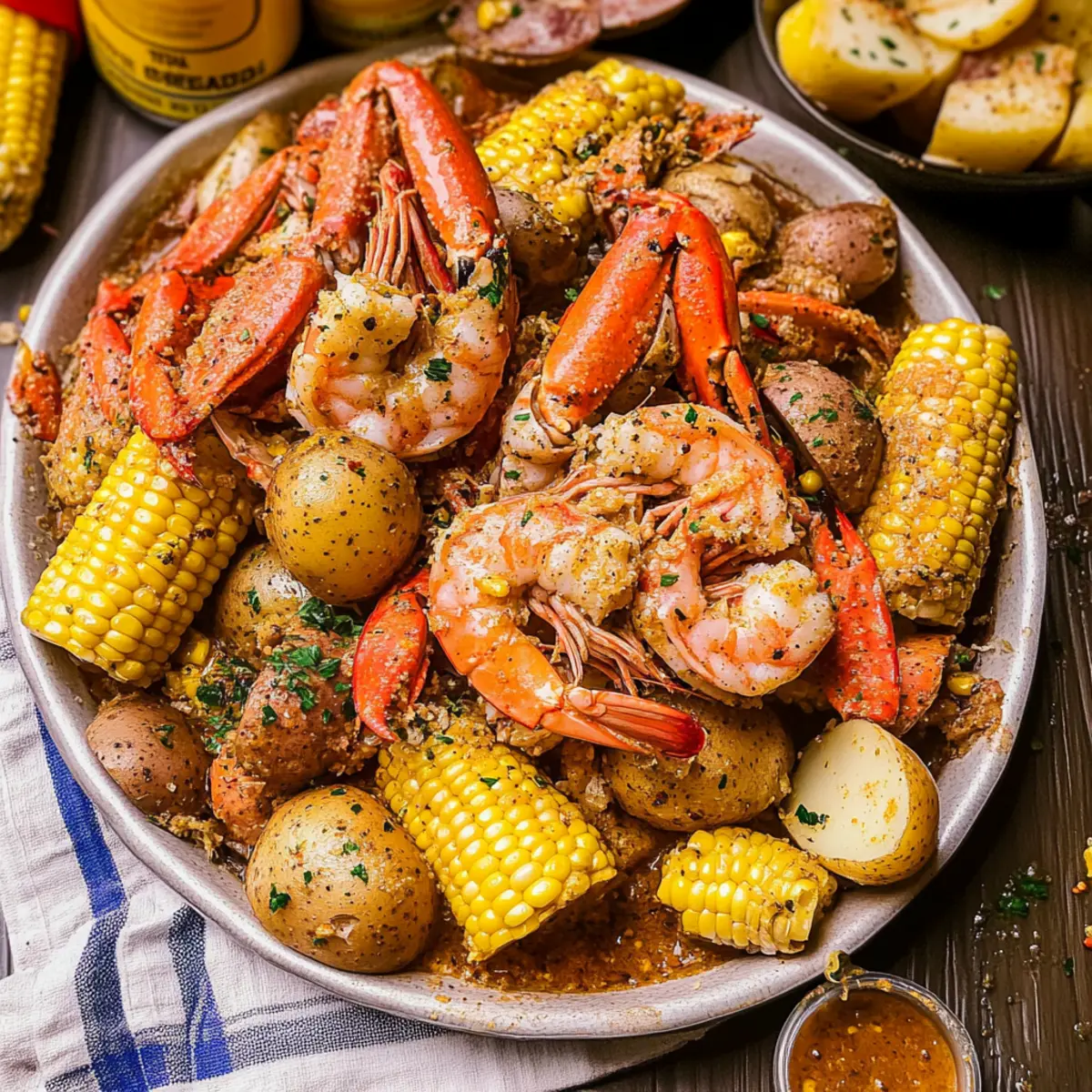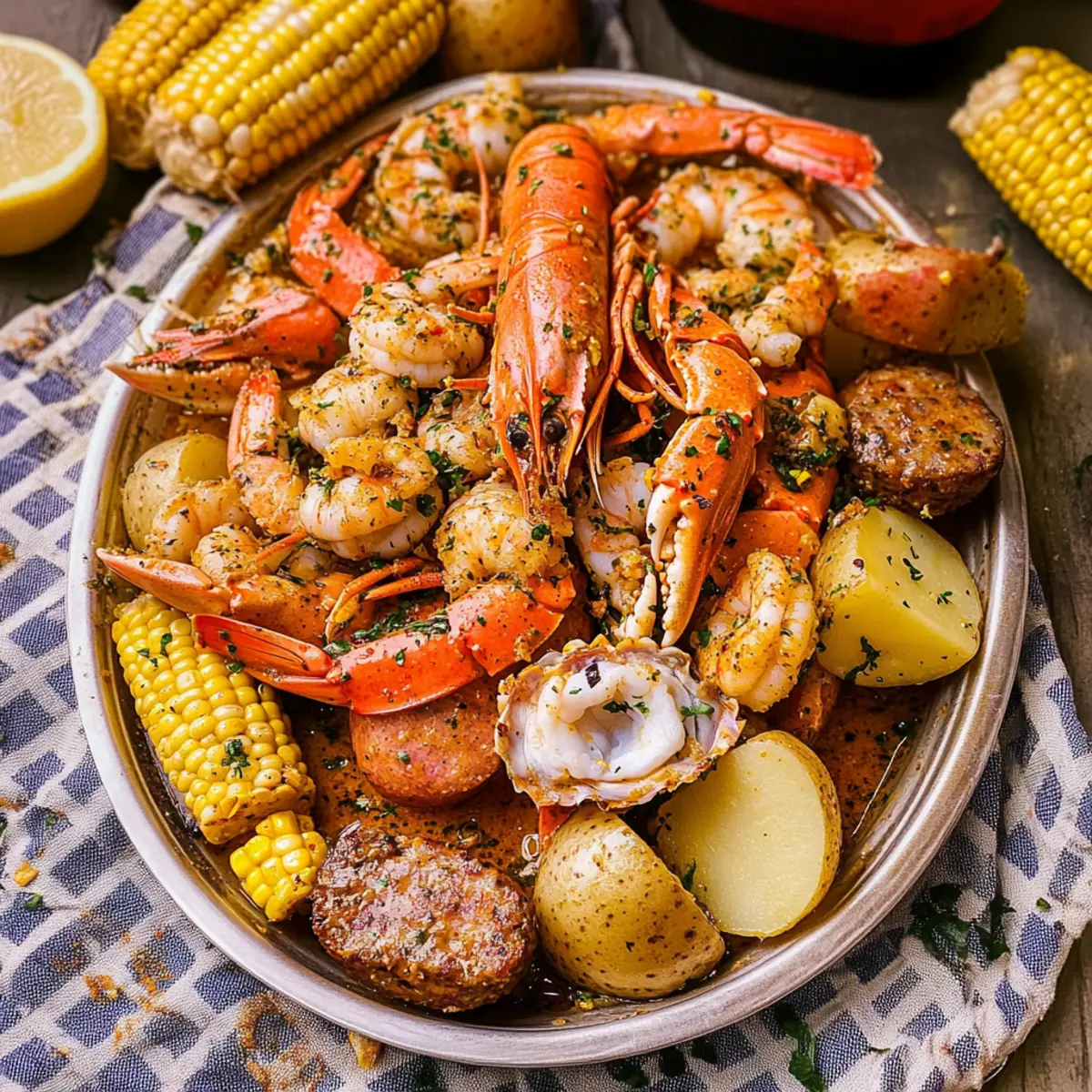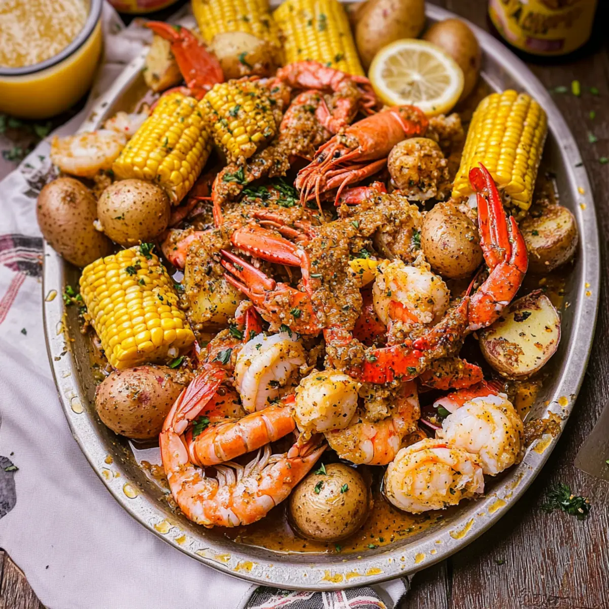 Jump to Recipe Print RecipeAs the sun dips low on a warm summer evening, there’s nothing quite like the anticipation of gathering with friends and family around a sprawling table filled with a Cajun Seafood Boil with Garlic Butter Sauce. This dish isn’t just a meal; it’s a celebration of flavor and togetherness, brimming with fresh jumbo shrimp, tender crab, smoky andouille sausage, hearty potatoes, and sweet corn on the cob. What makes this boil particularly captivating is the rich, spicy Cajun broth that envelops each ingredient, creating an exciting experience that’s perfect for large gatherings. Plus, it’s incredibly customizable—swap in your favorite seafood or adjust the spices to match your personal taste. Get ready to dive into a messy yet delightful feast that brings everyone to the table. Are you ready to unlock the secrets of a classic South-inspired dish? Why is Cajun Seafood Boil so popular? Irresistible Flavors: The combination of juicy shrimp, tender crab, and smoky sausage creates an explosion of taste that captivates. Customization Galore: Swap in your favorite seafood or spices to make it your own—there’s no wrong way to go with this dish! Community-Focused Dining: Perfect for gatherings, this boil encourages sharing and laughter, making it a true crowd-pleaser for summer celebrations. Quick and Easy: With simple steps and minimal prep, you can get this flavor-packed meal on the table in no time. Satisfying and Hearty: Each bite is a delightful balance of proteins and veggies, leaving everyone at the table fully satisfied. Don’t forget to serve it alongside some Cheddar Garlic Herb Potato Soup for an extra comforting touch! Cajun Seafood Boil Ingredients For the Seafood • Jumbo Shrimp – Adds a sweet and tender texture; fresh or frozen works well. • Crab (Snow Crab Clusters) – Contributes a rich flavor; ensure to use pre-cooked crab for convenience. For the Sausage and Potatoes • Andouille Sausage – Provides smoky depth and spice to the boil, enhancing the overall flavor. • Potatoes – Acts as a hearty filler; any waxy variety, like red or gold, will do beautifully. For the Veggies • Corn on the Cob – Adds sweetness and crunch; break it into halves for easier serving. • Eggs (hard-boiled) – Introduces protein and richness; prepare separately to serve alongside the boil. For the Seasoning • Cajun Seasoning – Key for flavor; try Old Bay seasoning for a similar spice profile if necessary. • Beer – Enhances the broth’s flavor; feel free to omit if you prefer it alcohol-free. Lagers or IPAs are highly recommended. For the Finishing Touch • Garlic Butter Sauce – Offers a rich and savory coating for the seafood and veggies, ensuring each bite is delectable. Get ready to impress your loved ones with this delicious Cajun Seafood Boil with Garlic Butter Sauce! Step‑by‑Step Instructions for Cajun Seafood Boil with Garlic Butter Sauce Step 1: Prepare the Broth In a large pot, bring about 4-5 quarts of water to a rolling boil over high heat. Once boiling, stir in ¼ cup of Cajun seasoning and a can of beer (if using) for extra flavor. Add 6 minced garlic cloves and let the mixture boil for a few minutes, creating a vibrant Cajun broth that will infuse your seafood boil with rich flavor. Step 2: Boil the Potatoes Carefully add 2 pounds of chopped potatoes to the boiling broth. Allow them to cook for about 10-15 minutes, or until they’re just fork-tender but not fully cooked—this ensures they absorb the wonderful Cajun flavors while still holding their shape. Stir occasionally to prevent sticking, and adjust the heat to maintain a simmer. Step 3: Incorporate the Sausage After the potatoes begin to soften, introduce 1 pound of sliced andouille sausage into the pot. Continue cooking for another 5 minutes, allowing the sausage to impart its smoky flavor to the broth. You’ll notice the mixture bubbling and getting aromatic, setting the stage for the seafood to come. Step 4: Add Seafood Gently add 1 pound of snow crab clusters and 1 pound of jumbo shrimp to the pot. Cook for approximately 3-5 minutes, or until the shrimp turn a vibrant pink and opaque throughout. Be mindful not to overcook, as the seafood can become rubbery. This step is where the Cajun Seafood Boil comes to life! Step 5: Final Additions Once the shrimp are cooked, introduce 4 halved ears of corn and 6 hard-boiled eggs to the pot. Simmer everything together for just 2-3 minutes, allowing the corn to heat through and the eggs to soak up any remaining Cajun flavors. The vibrant colors of the veggies and seafood will make your dish beautifully appealing. Step 6: Serve the Boil Carefully drain the pot, shaking off excess liquid, and transfer the seafood and vegetables onto a large serving platter. Drizzle the Cajun Seafood Boil with Garlic Butter Sauce generously over the top, ensuring each piece is coated. For a traditional touch, consider spreading newspapers over the table for casual dining, and enjoy the delicious, communal feast! Cajun Seafood Boil with Garlic Butter Sauce: Variations Feel free to add personal touches to create your own memorable version of this delightful dish! Crab Swap: Replace snow crab with succulent lobster tails or tender crawfish for a different take on this classic. Seafood Medley: Mix in mussels or clams for added variety—just ensure they’re fresh and check for doneness. Dairy-Free: Use a dairy-free garlic butter alternative if you’re avoiding dairy, and still enjoy that rich flavor. Zesty Twist: Add slices of lemon or lime before serving for a burst of freshness that brightens the entire dish. Spice Level: Adjust the Cajun seasoning based on preference; try adding cayenne pepper for those who love the heat! Vegetarian Version: Swap seafood for hearty mushrooms and artichokes, simulating the boil with similar flavors and textures. Beer-Free Broth: If you prefer non-alcoholic options, use vegetable broth or water infused with a