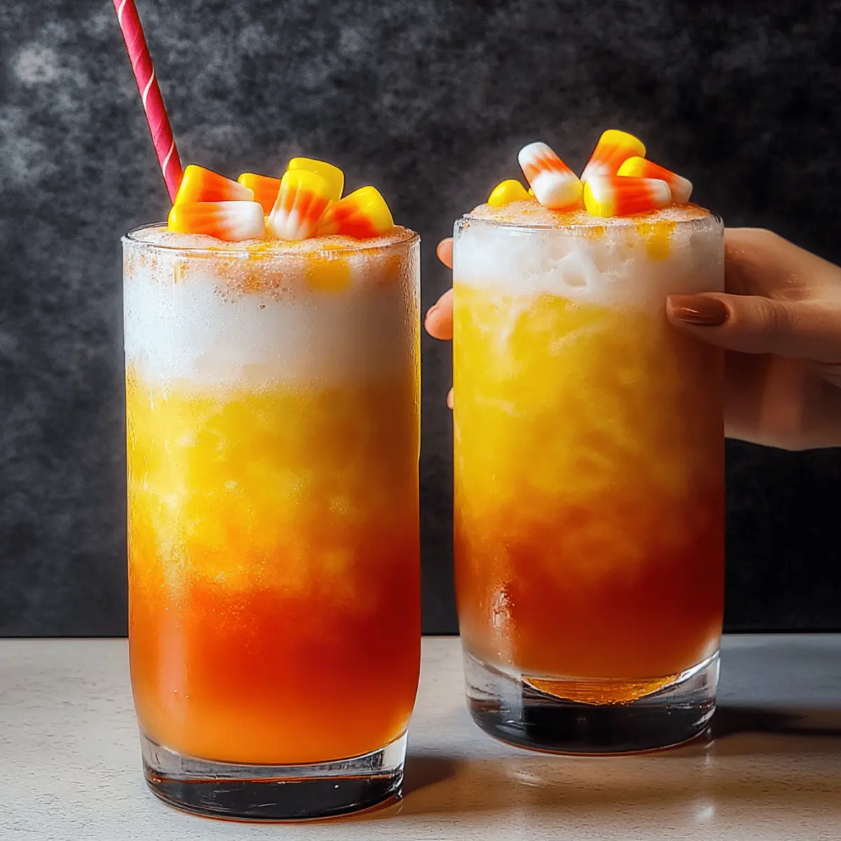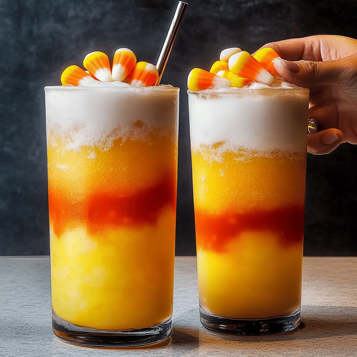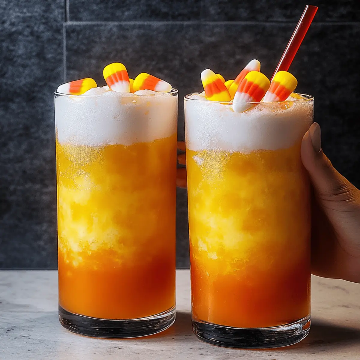 5. Garnish with candy corn on the rim or floating on top. Optional additions include fresh fruit slices or whipped cream.