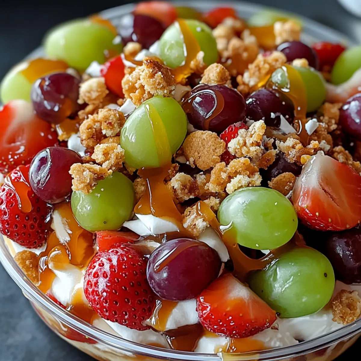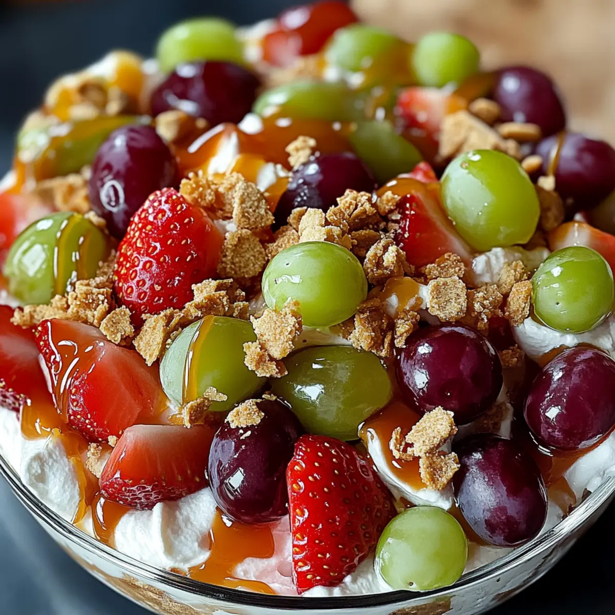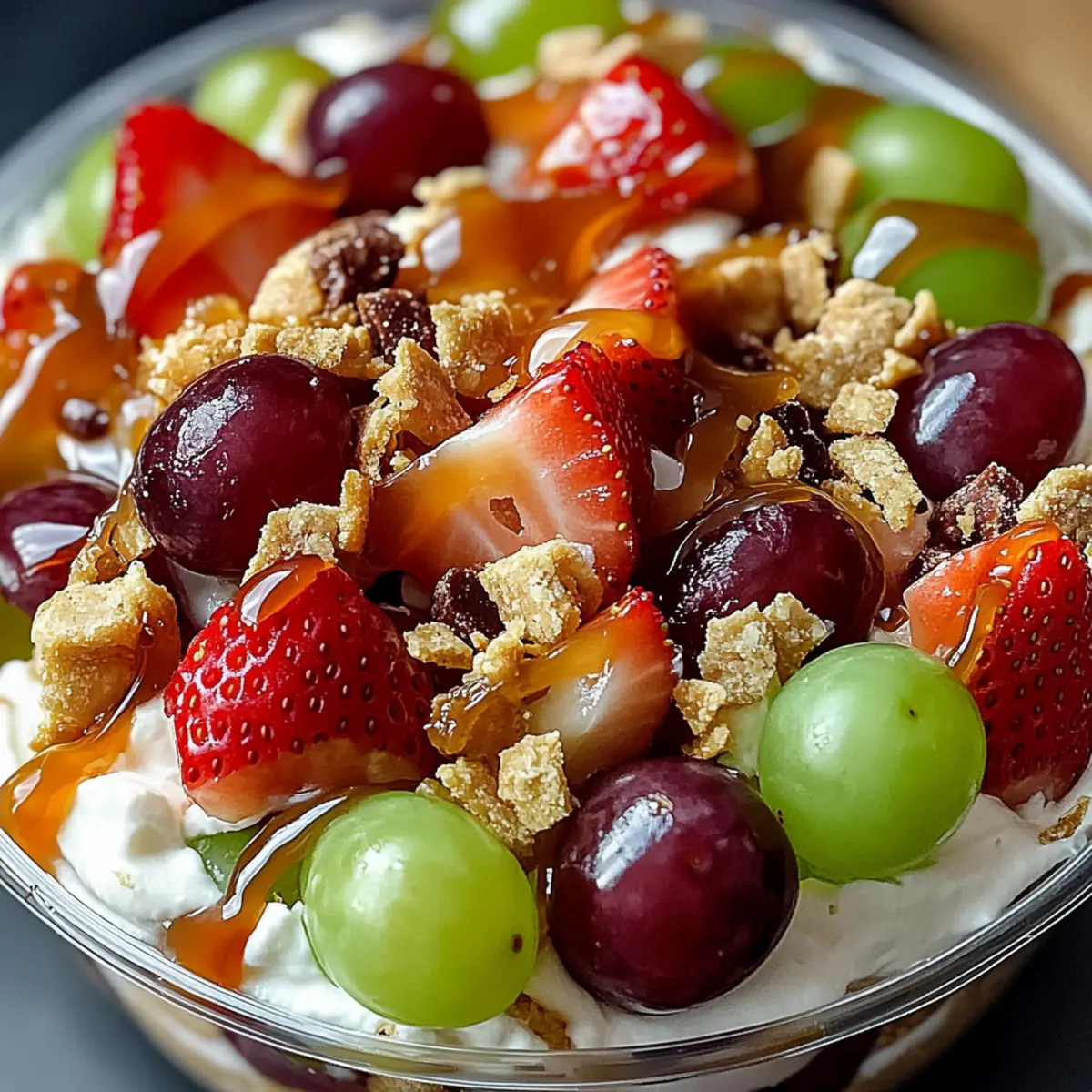 A luscious Caramel Crunch Cheesecake Fruit Salad that combines creamy cheesecake bites with vibrant fruits and caramel for a delightful dessert experience.