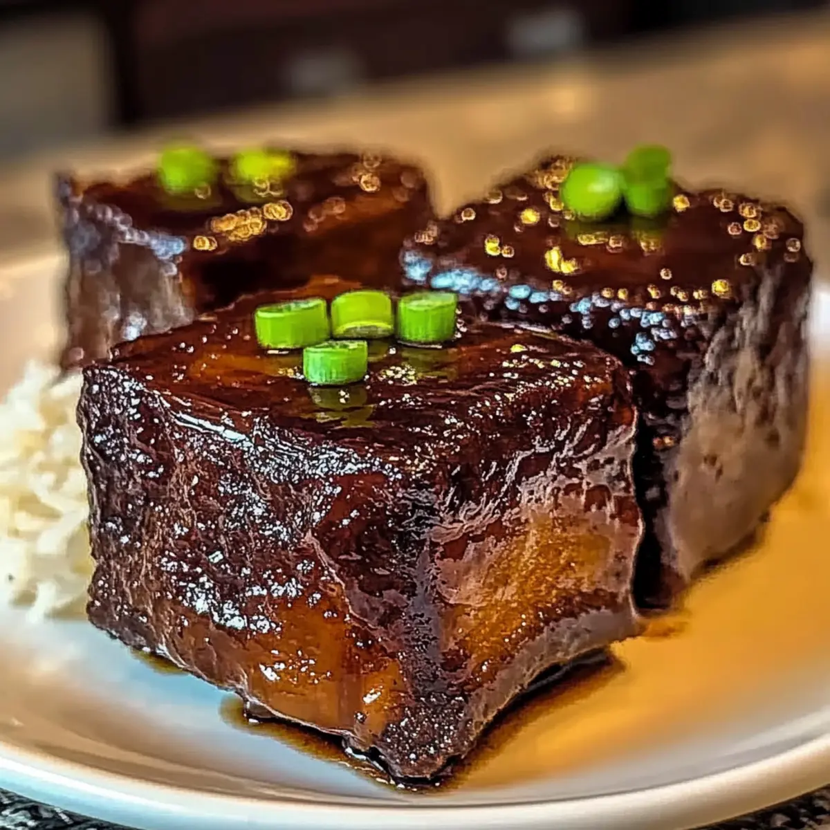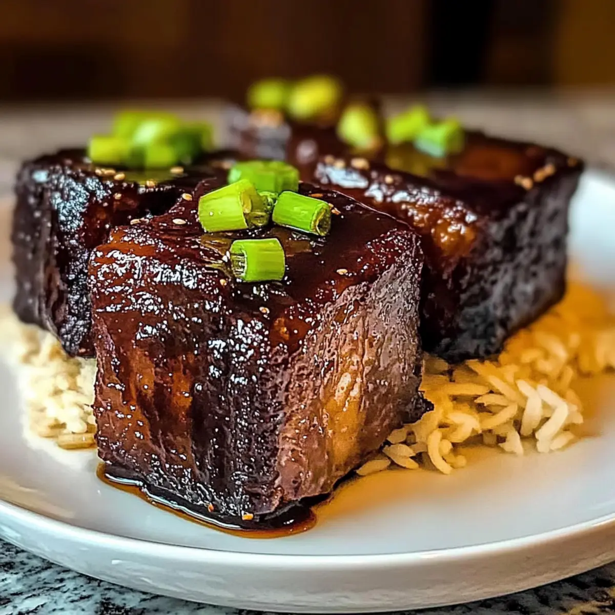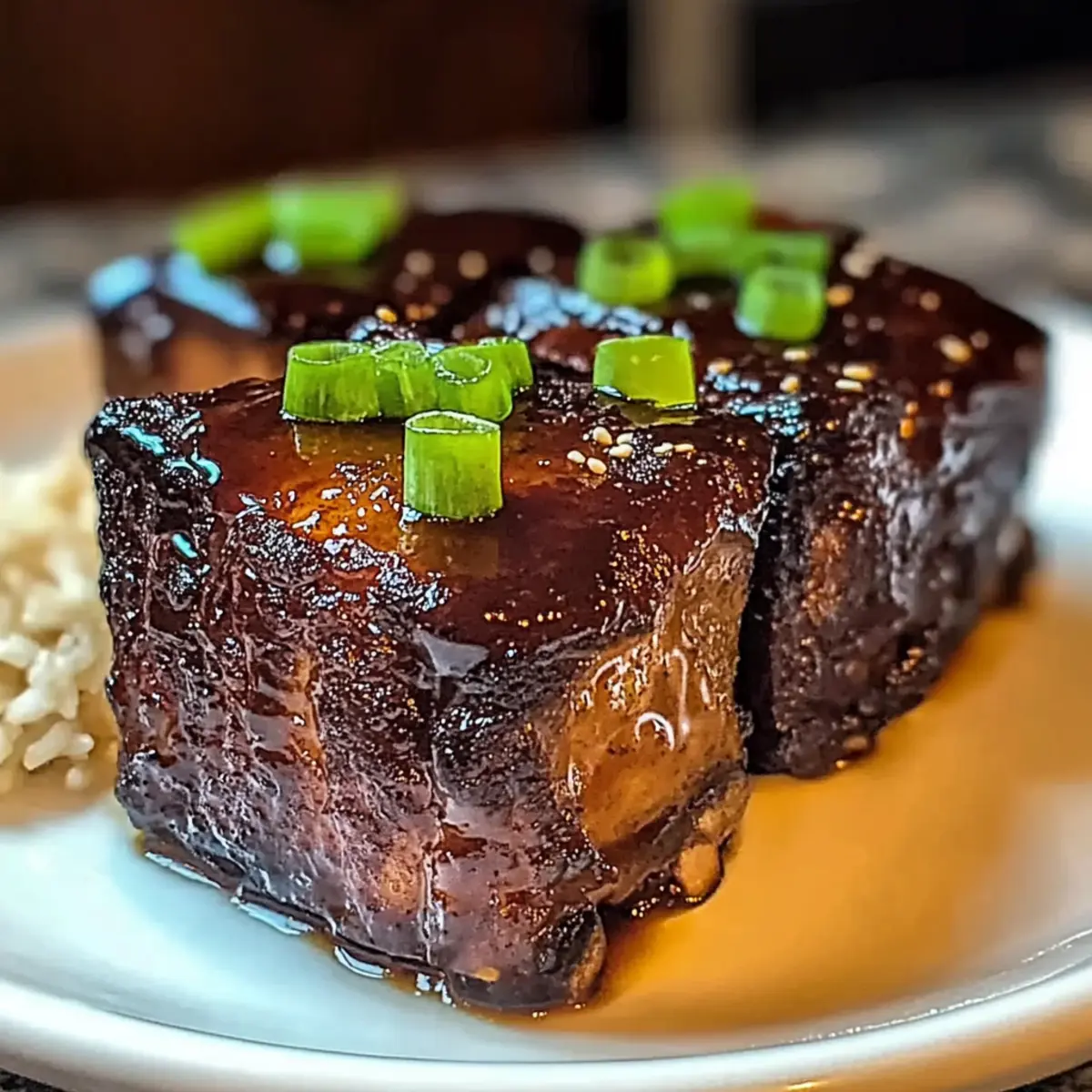 Jump to Recipe Print RecipeAs I entered my kitchen on a chilly evening, the aroma of caramelizing short ribs quickly transformed it into a warm haven, reminiscent of bustling Asian streets. My heart danced with anticipation as I prepared to make these Melt-in-Your-Mouth Caramelized Slow Roast Asian Beef Short Ribs. This recipe is a treasure for home chefs seeking ultimate comfort food—it’s not just about the incredible flavor; it also offers an easy, gluten-free option with tamari. Imagine serving these succulent ribs to delighted guests or savoring them after a long work week—pure joy! Are you ready to discover the perfect dish that will elevate your weeknight dinners into memorable feasts? Why is This Recipe a Must-Try? Melt-in-Your-Mouth deliciousness: These short ribs are so tender, they’ll practically fall off the bone, creating a sumptuous dining experience. Savory-Sweet Harmony: The blend of soy sauce, hoisin sauce, and brown sugar results in a glaze that’s sweet with a touch of umami—pure culinary magic! Simple Preparation: With straightforward steps and minimal fuss, you can prepare this dish that tastes gourmet without spending all day in the kitchen. Versatile Serving Options: Enjoy these ribs over fragrant jasmine rice, or pair them with noodles or steamed vegetables for a balanced meal that everyone will love. Gluten-Free Friendly: Want to accommodate dietary preferences? Simply swap soy sauce for tamari and you’re good to go! If you need more comforting flavors, check out our recipe for Ground Beef Burrito as well. This dish is sure to impress your family and friends, making any gathering feel like a special occasion! Caramelized Slow Roast Asian Beef Short Ribs Ingredients For the Ribs • Bone-in Beef Short Ribs – Choose well-marbled cuts for rich flavor and tenderness. • Sliced Onion (1 small) – Essential for authenticity, adds aromatic flavor during roasting. • Green Onions (2-3, cut into 2-inch pieces) – Optional for garnish and an extra flavor enhancement. For the Marinade • Soy Sauce (1/2 cup) – Adds depth of umami; substitute tamari for a gluten-free version. • Hoisin Sauce (1/4 cup) – Provides sweet and tangy richness, no direct substitution recommended. • Mirin (1/4 cup) – Offers subtle sweetness and acidity; perfect for boosting flavor. • Brown Sugar (1/4 cup) – Enhances caramelization; coconut sugar or maple syrup can be used instead. For Seasoning • Garlic (4 cloves, minced) – Adds warm, aromatic notes crucial for flavor, no substitutions. • Fresh Ginger (1 tbsp, grated) – Enhances the overall flavor depth; ground ginger may work as a substitute. • Chili Flakes or Sriracha (½-1 tsp, optional) – Adds heat, or omit if preferring no spice. For the Glaze • Cornstarch (1 tsp mixed with 1 tbsp water) – Optional thickener for the glaze, omit for a thinner sauce. This Caramelized Slow Roast Asian Beef Short Ribs recipe promises a delightful culinary adventure with its rich flavors and comforting essence! Step‑by‑Step Instructions for Caramelized Slow Roast Asian Beef Short Ribs Step 1: Prep the Ribs Begin by preparing your bone-in beef short ribs. Trim any excess fat for improved texture and flavor, then pat the ribs dry with paper towels. Generously season each side with salt and pepper to enhance the taste of the meat. This step sets the foundation for your delicious Caramelized Slow Roast Asian Beef Short Ribs. Step 2: Sear the Ribs Heat a large skillet over medium-high heat and add a small amount of oil. Once the oil is shimmering, place the short ribs in the skillet, making sure they are not overcrowded. Sear the ribs for about 5-7 minutes on each side until they develop a beautiful golden-brown crust. This browning is essential for building deep, rich flavor in your dish. Step 3: Prepare the Marinade While the ribs are searing, grab a mixing bowl and combine soy sauce, hoisin sauce, mirin, brown sugar, minced garlic, grated ginger, and optional chili flakes. Whisk the ingredients together until well blended, creating a fragrant marinade that will infuse your Caramelized Slow Roast Asian Beef Short Ribs with delightful flavors. Step 4: Roast the Ribs Once the ribs are seared, transfer them to a Dutch oven. Pour the marinade over the ribs and scatter the sliced onion evenly around the meat. Cover the pot with a lid and place it in a preheated oven set to 275-300°F (135-150°C). Roast the ribs for 3-4 hours, basting them with the marinade every hour to ensure they stay juicy and flavorful. Step 5: Reduce the Glaze After the ribs have become fork-tender, carefully remove them from the oven and set them aside. Pour the braising liquid into a skillet and bring it to a gentle simmer over medium heat. Allow it to reduce for about 10-15 minutes, stirring occasionally until it thickens into a glossy glaze that will elevate your Caramelized Slow Roast Asian Beef Short Ribs even further. Step 6: Broil for Caramelization Preheat your broiler while the glaze is reducing. Once the glaze has reached your desired thickness, place the short ribs on a baking sheet lined with foil. Broil them on a high setting for about 2-3 minutes, keeping a close eye to prevent burning. This step will give the ribs a beautiful caramelization and enticing visual appeal. Step 7: Serve and Garnish Allow the ribs to rest for a few minutes after broiling, which helps retain their juices. Serve these luxuriously tender Caramelized Slow Roast Asian Beef Short Ribs over a bed of steaming jasmine rice or noodles. Drizzle the reduced glaze over the top and garnish with green onions or sesame seeds for an extra touch of flavor and color. Make Ahead Options These Caramelized Slow Roast Asian Beef Short Ribs are ideal for busy home cooks looking to save time during the week! You can marinate the ribs up to 24 hours in advance to deepen their flavor. Simply prepare the marinade and coat the ribs, then store them covered in the refrigerator. The seari