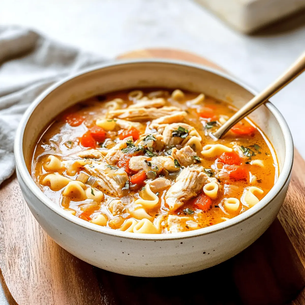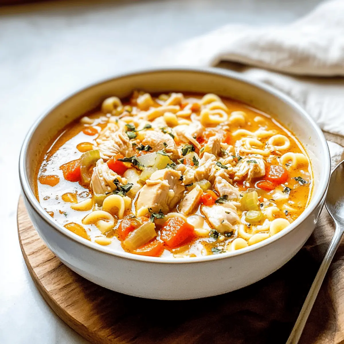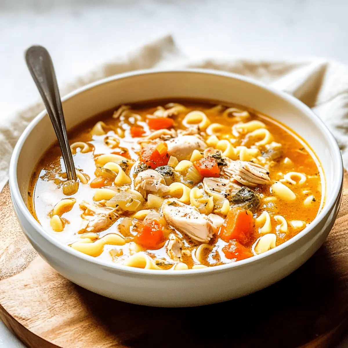 Jump to Recipe Print RecipeOn chilly evenings, there’s nothing quite like the warm embrace of a steaming bowl of soup. That’s where my Hearty Carrabba’s Copycat Chicken Soup comes into play—a comforting Italian classic that’s perfect for family dinners or cozy nights in. With tender chunks of chicken, vibrant vegetables, and delightful ditalini pasta simmering in a homemade broth, this one-pot meal is not only easy to prepare but also a wholesome way to nourish your loved ones. Plus, it’s a fantastic alternative to fast food when time is short and comfort is needed. Are you ready to dive into a recipe that’s bound to become a cherished favorite? Let’s get started! Why is this soup a must-try? Comforting Warmth: This hearty Carrabba’s Copycat Chicken Soup wraps you in a cozy embrace, perfect for cold nights. Easy One-Pot Recipe: With minimal cleanup, you’ll have more time to enjoy meals with family, unlike takeout options. Vibrant Flavors: The combination of flavorful chicken, fresh vegetables, and ditalini pasta creates a deliciously robust taste that’s sure to please. Versatile Variations: Feel free to switch things up with different pasta shapes or add additional greens like spinach for a nutritious boost! Crowd-Pleasing Dish: Whether it’s a weeknight dinner or a gathering, everyone will enjoy this comforting bowl of goodness, much like my Hot Honey Chicken or Chicken Dumplings Cozy recipes! Carrabba’s Copycat Chicken Soup Ingredients For the Soup Base • Chicken Thighs – Provides flavorful, tender meat for the soup. Substitution: Bone-in, skin-on chicken for richer broth. • Onion – Adds aromatic depth to the soup base. Substitution: Shallots for a milder flavor. • Celery – Contributes crunch and flavor. Substitution: Fennel for a different taste. • Carrots – Adds sweetness and color. No substitutions suggested. • Bell Pepper – Enhances flavor and nutrition. Substitution: Any color bell pepper or omit if preferred. • Potatoes – Adds substance and creaminess to the soup. Substitution: Sweet potatoes for a healthier twist. • Tomatoes (canned) – Provides acidity and body to the broth. Fresh tomatoes can be used if available. • Bay Leaves – Infuses the soup with herbal notes. Reminder: Remove before serving. • Garlic – Enhances savory flavor. Substitution: Garlic powder for convenience. • Chicken Stock/Broth – Forms the soup’s base. Use low-sodium varieties for healthier options. • Water – Adjusts broth consistency. For the Pasta • Dry Ditalini Pasta – Adds heartiness to the soup. Substitution: Any small pasta shape like orzo or elbows. For Garnish • Italian Parsley – Freshens the soup before serving. Substitution: Other fresh herbs like basil or thyme. Dive into a bowl of Carrabba’s Copycat Chicken Soup, where each spoonful delivers comforting warmth and rich Italian flavors! Step‑by‑Step Instructions for Carrabba’s Copycat Chicken Soup Step 1: Prepare the Ingredients In a large soup pot (6-quart or larger), combine diced chicken thighs, chopped onion, sliced celery, diced carrots, and bell pepper. Add peeled and cubed potatoes, canned tomatoes, bay leaves, minced garlic, chicken stock, and water. Ensure you have everything chopped and ready so that the flavors meld beautifully as the soup cooks. Step 2: Bring to a Boil Cover the pot and turn the heat to high, bringing the mixture to a rolling boil. Once boiling, reduce the heat to a gentle simmer, partially covering the pot. Allow the soup to simmer for about 30 minutes, stirring occasionally, until the chicken is tender and cooked through, giving the broth time to develop rich flavors. Step 3: Shred the Chicken After simmering, carefully remove the chicken thighs from the pot using tongs or a slotted spoon. Place them on a cutting board, letting them cool slightly. Once manageable, shred the chicken with forks or your hands and discard any skin and bones. Return the shredded chicken back into the pot, ensuring a hearty mix in your Carrabba’s Copycat Chicken Soup. Step 4: Add the Pasta Stir in the dry ditalini pasta and return the pot to a gentle boil. Reduce heat back to simmer and cook for an additional 13-15 minutes, stirring occasionally, until the pasta is tender yet al dente. Keep an eye on the pot to ensure the pasta remains chewy and doesn’t overcook, maintaining the soup’s delightful texture. Step 5: Final Touches Once the pasta is cooked through, carefully remove and discard the bay leaves from the soup. Stir in freshly chopped Italian parsley for a burst of flavor and color before serving. This final step elevates your Carrabba’s Copycat Chicken Soup, making it a vibrant and inviting dish ready to warm your family on chilly evenings. Carrabba’s Copycat Chicken Soup Variations Feel free to get creative—these delicious twists will enhance your soup experience and cater to your family’s tastes! Rotisserie Chicken: Use shredded rotisserie chicken for a quicker, even more convenient option, allowing you to enjoy that comforting soup in no time. Pasta Alternatives: Try different small pasta shapes like orzo or elbows for a fun twist on texture, keeping the dish lively and exciting. Greens Galore: Add handfuls of fresh spinach or kale to the soup during the last few minutes of cooking for a vibrant splash of green and extra nutrients. Spicy Kick: Include a diced jalapeño or a pinch of red pepper flakes for a spicy variation that adds warmth and zest to each spoonful. Herbal Infusion: Experiment with fresh herbs like basil or thyme instead of parsley, which can bring new flavor dimensions to your usually comforting dish. Nutty Flavor: Stir in a bit of pesto toward the end of cooking to introduce a delightful nuttiness that enhances the dish’s Italian flair; you might find it reminiscent of my Pesto Chicken Broccoli! Bean Boost: Toss in a can of rinsed white beans or chickpeas for added protein and heartiness, making this dish even m