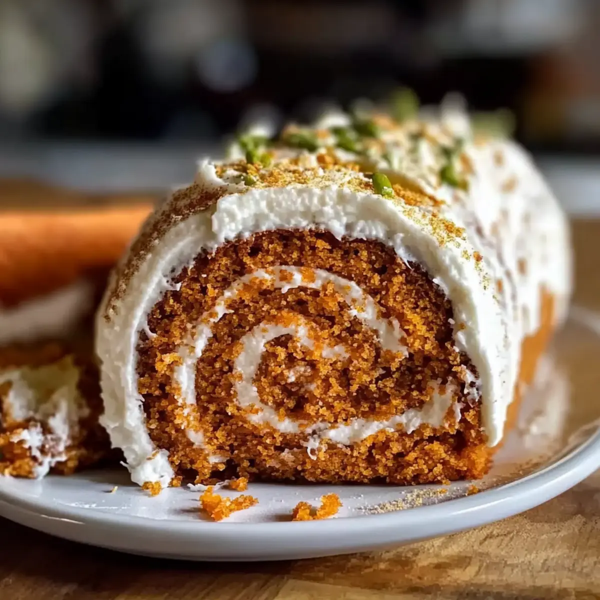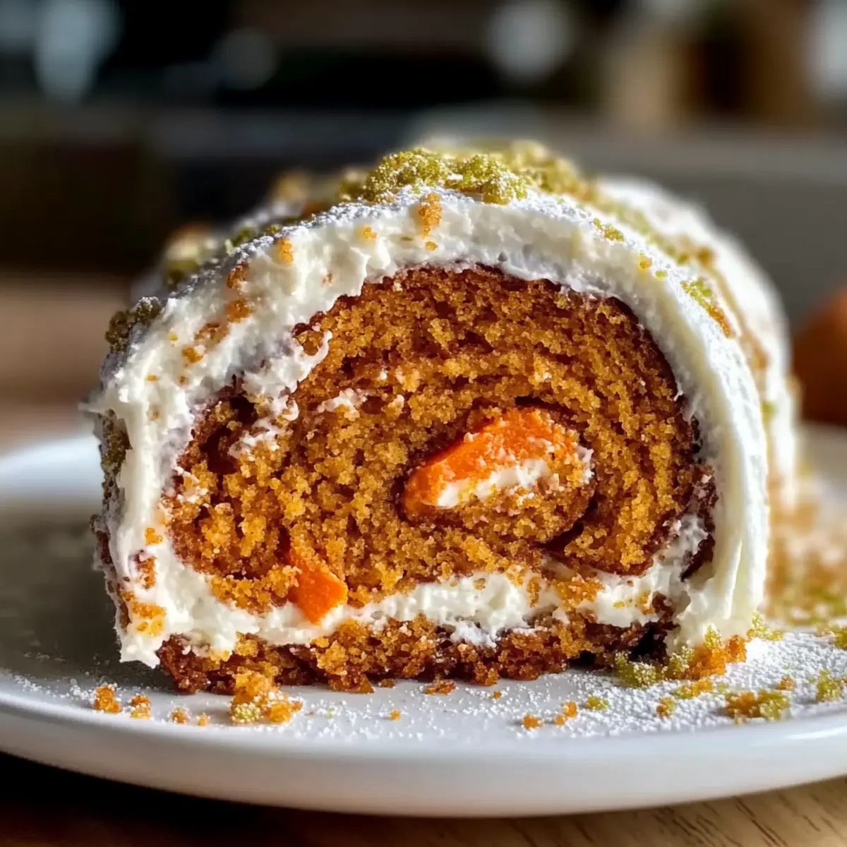 Jump to Recipe Print RecipeAs I stood in my kitchen, the heavenly aroma of warm spices filled the air, instantly whisking me back to family gatherings and festive feasts. Today, I’m excited to share my go-to recipe for a Carrot Cake Roll with Cream Cheese Frosting—a delightful twist on the classic dessert that not only dazzles the eye but also pleases the palate. This recipe is a fantastic way to wow your guests with minimal effort, as it’s both quick to prepare and embraces the cozy flavors of home baking. Whether you’re celebrating a special occasion or just indulging in a sweet treat for yourself, this rolled dessert adds a touch of elegance to any table. Curious about how to roll with it? Let’s dive in! Why is This Carrot Cake Roll Irresistible? Delectable Flavor Explosion: The fusion of warm spices and rich cream cheese frosting creates an unforgettable taste experience that keeps you coming back for more. Effortless Elegance: Impress your guests with stunning dessert presentation—this roll looks like a fancy treat but is simple to make! Versatile Variations: Feel free to customize! Add coconut or citrus for a twist, or try sugar substitutes to suit your dietary needs. Make Ahead Magic: Prepare this cake in advance for easy entertaining. Just frost it and pop it in the fridge until it’s time to serve. Pair it with a cup of coffee or some spiced cider, and you’ve got a winning dessert that matches perfectly with any of your favorite dishes like Moist Strawberry Shortcake or Blueberry Cream Cheese. Enjoy every slice! Carrot Cake Roll with Cream Cheese Frosting Ingredients Get ready to bake this delightful dessert! For the Cake • Eggs – Essential for structure and leavening, giving the cake a light texture. • Granulated Sugar – Adds sweetness and moisture, making the cake irresistible. • Brown Sugar – Enhances flavor depth with its rich molasses notes. • Vegetable Oil – Keeps the cake tender and moist, preventing it from drying out. • Vanilla Extract – Elevates the overall flavor profile with a sweet touch. • All-Purpose Flour – The backbone of the cake, providing necessary structure. • Baking Powder – Acts as a leavening agent to ensure a fluffy rise. • Ground Spices (Cinnamon, Nutmeg, Ginger) – Infuse the cake with warm, aromatic flavors typical of a classic carrot cake. • Salt – Balances sweetness and enhances overall flavor. • Grated Carrots – Adds moisture, sweetness, and texture; pre-shredded carrots work perfectly. For the Frosting • Cream Cheese – The star of the frosting, offering a creamy and tangy flavor that complements the cake. • Unsalted Butter – Adds richness and helps achieve a smooth frosting texture. • Powdered Sugar – Sweetens and thickens the frosting; mix gently for the best consistency. Dive into the deliciousness of this Carrot Cake Roll with Cream Cheese Frosting, and enjoy a taste that’s sure to impress! Step‑by‑Step Instructions for Carrot Cake Roll with Cream Cheese Frosting Step 1: Preheat the Oven Begin by preheating your oven to 375°F (190°C). While it heats, line a jelly roll pan (about 15×10 inches) with parchment paper, ensuring it fits snugly. This preparation is crucial for the Carrot Cake Roll to bake evenly and release effortlessly later. Step 2: Mix the Wet Ingredients In a large mixing bowl, beat together four eggs with both granulated and brown sugars using an electric mixer on medium speed for 3-5 minutes until the mixture turns pale and fluffy. Slowly add in ⅓ cup of vegetable oil and 1 teaspoon of vanilla extract, mixing until combined; this will enhance the moistness and flavor of your cake. Step 3: Combine the Dry Ingredients In a separate bowl, whisk together 1 cup of all-purpose flour, 1 teaspoon of baking powder, 1 teaspoon each of ground cinnamon, nutmeg, and ginger, plus a pinch of salt. This blend of spices forms the base for the Carrot Cake Roll, infusing it with warmth and aroma. Once combined, gently fold it into the wet mixture, ensuring no pockets of flour remain. Step 4: Add the Carrots Fold in 1 ½ cups of grated carrots into the batter with a spatula, mixing until just combined. The grated carrots add moisture and texture to the cake, making it flavorful and tender. Avoid over-mixing to keep the cake light and fluffy, crucial for a successful roll. Step 5: Bake the Cake Spread the batter evenly into the prepared jelly roll pan, smoothing the top with a spatula. Bake in your preheated oven for 12-15 minutes, or until the cake springs back when lightly pressed and a toothpick inserted in the center comes out clean. This will ensure your Carrot Cake Roll has the perfect texture. Step 6: Cool and Roll the Cake As soon as you remove it from the oven, run a knife around the edges to loosen it. Carefully invert the cake onto a clean, powdered sugar-dusted kitchen towel, peeling off the parchment paper. Gently roll the cake up in the towel while it’s still warm, which helps prevent cracking. Set it aside to cool completely in this rolled shape. Step 7: Prepare the Cream Cheese Frosting While the cake cools, prepare your cream cheese frosting. In a mixing bowl, beat 8 ounces of softened cream cheese and ¼ cup of unsalted butter until smooth and creamy. Gradually add in 2 cups of powdered sugar, mixing on low speed until combined and fluffy. This rich frosting will beautifully complement your Carrot Cake Roll. Step 8: Assemble the Cake Roll Once the cake has cooled thoroughly, gently unroll it from the towel. Spread the cream cheese frosting evenly over the surface, right up to the edges. This will ensure every slice of your Carrot Cake Roll has that delightful creamy layer. Step 9: Roll and Slice Carefully re-roll the cake without the towel, shaping it tightly yet gently. Place the cake seam-side down on a serving platter. Slice the Carrot Cake Roll into neat pieces and serve, revealing the beautiful swirl of cake and creamy frosting inside. Step 10: Enjo