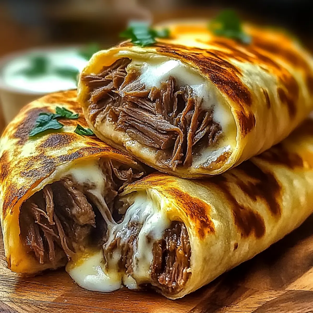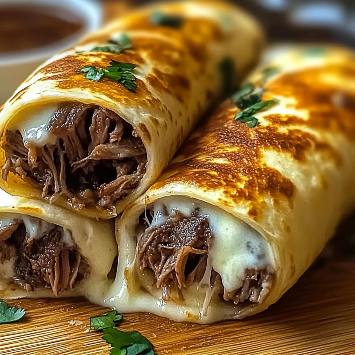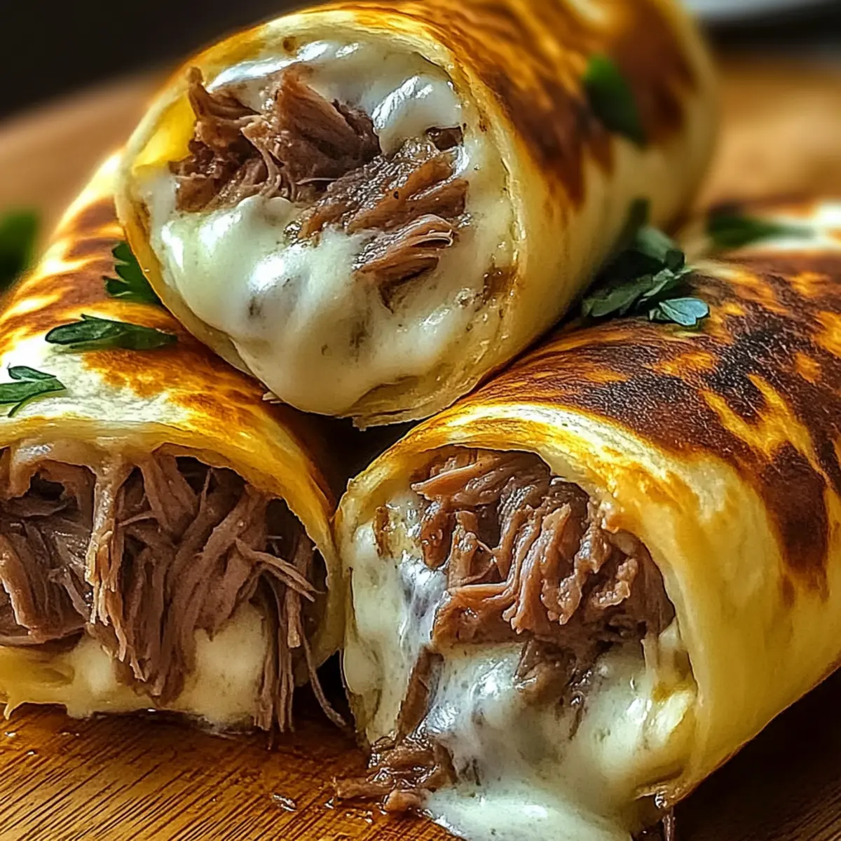 Jump to Recipe Print RecipeAs I rummaged through my fridge one busy evening, I stumbled upon a leftover roast beef that made my heart dance with possibilities. That spark of creativity led me to concoct these Quick and Cheesy French Dip Tortilla Roll Ups—each one a delightful handheld version of the classic sandwich, filled with savory beef and a melty cheese of your choice. Ready in just 25 minutes, they are perfect for hectic weeknights or casual gatherings with friends. Plus, the beauty of this recipe is its flexibility; you can easily customize the fillings to satisfy any palate, while keeping it low lactose for those who need it. Ready to roll up your sleeves and bring some comfort to your dinner table? Let’s dive in! Why Try Cheesy French Dip Roll Ups? Quick and Easy: In just 25 minutes, you’ll have a delicious meal that’s perfect for those hectic weeknights. Customizable: Tailor the fillings to match your taste—try adding jalapeños for a spicy kick or swap in your favorite cheese for a unique twist! Low Lactose: Enjoy a comforting dish that suits your dietary needs without sacrificing flavor. Crowd-Pleaser: These roll-ups are great for gatherings; serve them alongside your favorite dip or a simple salad for a complete meal. Versatile Dipping Sauce: Pair them with a rich au jus that elevates the experience—a perfect complement to these cheesy bites! So why not roll up some joy tonight? Curious for more fun ideas? Check out Shrimp Tempura Roll for an extra treat! Cheesy French Dip Tortilla Roll Ups Ingredients For the Roll Ups Roast Beef – Provides a savory filling; use deli-style or leftover roast for convenience. Shredded Mozzarella or Provolone – Adds an ooey-gooey texture; mozzarella offers stretch while provolone enhances flavor. Flour Tortillas – Serves as the wrap; choose soft yet sturdy tortillas to hold the fillings. Melted Butter – Used for brushing; it achieves a golden-brown, crispy exterior. Garlic Powder – Enhances flavors with a savory kick; use fresh garlic for a more robust taste. Onion Powder – Adds sweetness and depth; adjust to your taste preference. Dried Parsley – For garnish; gives a fresh touch to the finished roll-ups. For the Au Jus Beef Broth – Forms the base of the au jus, delivering savory richness; consider low-sodium options for a healthier option. Worcestershire Sauce – Contributes depth of flavor; a little goes a long way! Soy Sauce – Adds umami complexity; swap for tamari or coconut aminos for gluten-free. Salt & Pepper – For seasoning; adjust to taste, especially if using pre-seasoned broth. Get ready to enjoy these delightful Cheesy French Dip Tortilla Roll Ups—they’re bound to become a family favorite! Step‑by‑Step Instructions for Cheesy French Dip Tortilla Roll Ups Step 1: Preheat Your Oven Begin by preheating your oven to 375°F (190°C). While the oven warms up, line a baking sheet with parchment paper to prevent the cheesy French dip tortilla roll ups from sticking. This step ensures that your roll ups will bake evenly and achieve that perfect golden-brown crispiness. Step 2: Assemble the Tortillas Take your flour tortillas and lay them flat on a clean surface. Down the center of each tortilla, layer a generous amount of savory roast beef, followed by a mound of shredded mozzarella or provolone cheese. Consider adding jalapeños for an extra kick! Be sure not to overload them to make rolling easier. Step 3: Roll Up the Tortillas Starting at the bottom edge, fold the sides of each tortilla inward and roll it tightly from bottom to top. This will secure the filling nicely. Ensure that the seam side is facing down when you finish rolling to keep the contents from spilling out while baking the cheesy French dip tortilla roll ups. Step 4: Brush with Butter Melt your butter in a small bowl and then use a pastry brush to lightly coat the outside of each roll up. Sprinkle garlic powder, onion powder, and dried parsley over the top for an added burst of flavor. This step is what gives your roll ups that beautiful, golden-brown exterior. Step 5: Bake the Roll Ups Place the prepared roll ups seam-side down on your lined baking sheet. Bake them in your preheated oven for 12-15 minutes or until they are golden brown and the cheese is bubbling inside. Keep an eye on them during the last few minutes for the ultimate crispy finish. Step 6: Prepare the Au Jus While your cheesy French dip tortilla roll ups are baking, grab a saucepan and pour in the beef broth, Worcestershire sauce, soy sauce, garlic powder, onion powder, salt, and pepper. Simmer this mixture over medium heat for 5-7 minutes, stirring occasionally, until it thickens slightly and flavors meld beautifully. Step 7: Serve and Enjoy Once the roll ups are golden and aromatic, remove them from the oven and let them cool for a minute. Slice each roll up in half and serve warm alongside the au jus for dipping. The combination of the savory roll ups and rich dipping sauce is the perfect way to wrap up a busy weeknight dinner. Expert Tips for Cheesy French Dip Tortilla Roll Ups Use Fresh Tortillas: Ensure your tortillas are fresh and pliable to avoid tearing. A quick warm-up in the microwave can help! Cheese Choices: Experiment with different cheeses like cheddar or pepper jack to elevate flavors. Swap for lactose-free options if needed. Roll Tightly: Be sure to roll the tortillas firmly but not too tight, allowing space for the cheese to melt. This prevents any awkward breakage. Watch the Bake: Keep an eye on the roll ups as they bake. If they brown too quickly, cover them loosely with foil to ensure they cook evenly. Au Jus Variations: For a richer dipping sauce, consider adding a splash of red wine or balsamic vinegar to the au jus mixture. Customize Fillings: Feel free to add sliced jalapeños or roasted red peppers for a spicy twist in your cheesy French dip tortilla roll ups. Make Ahead Options These Cheesy French Dip Tortilla Roll Ups are perfect for bus