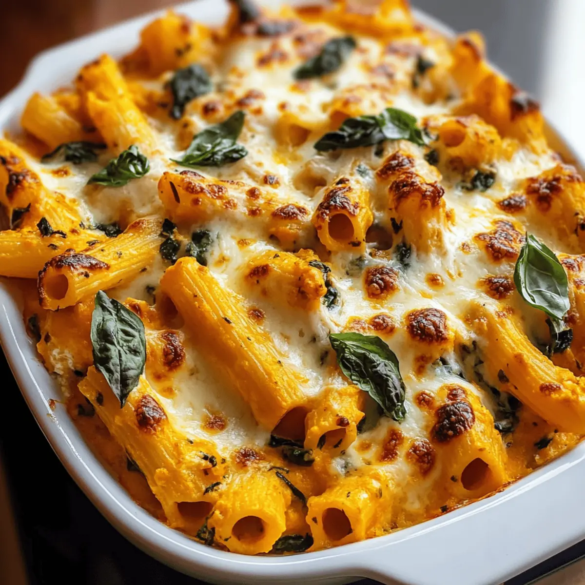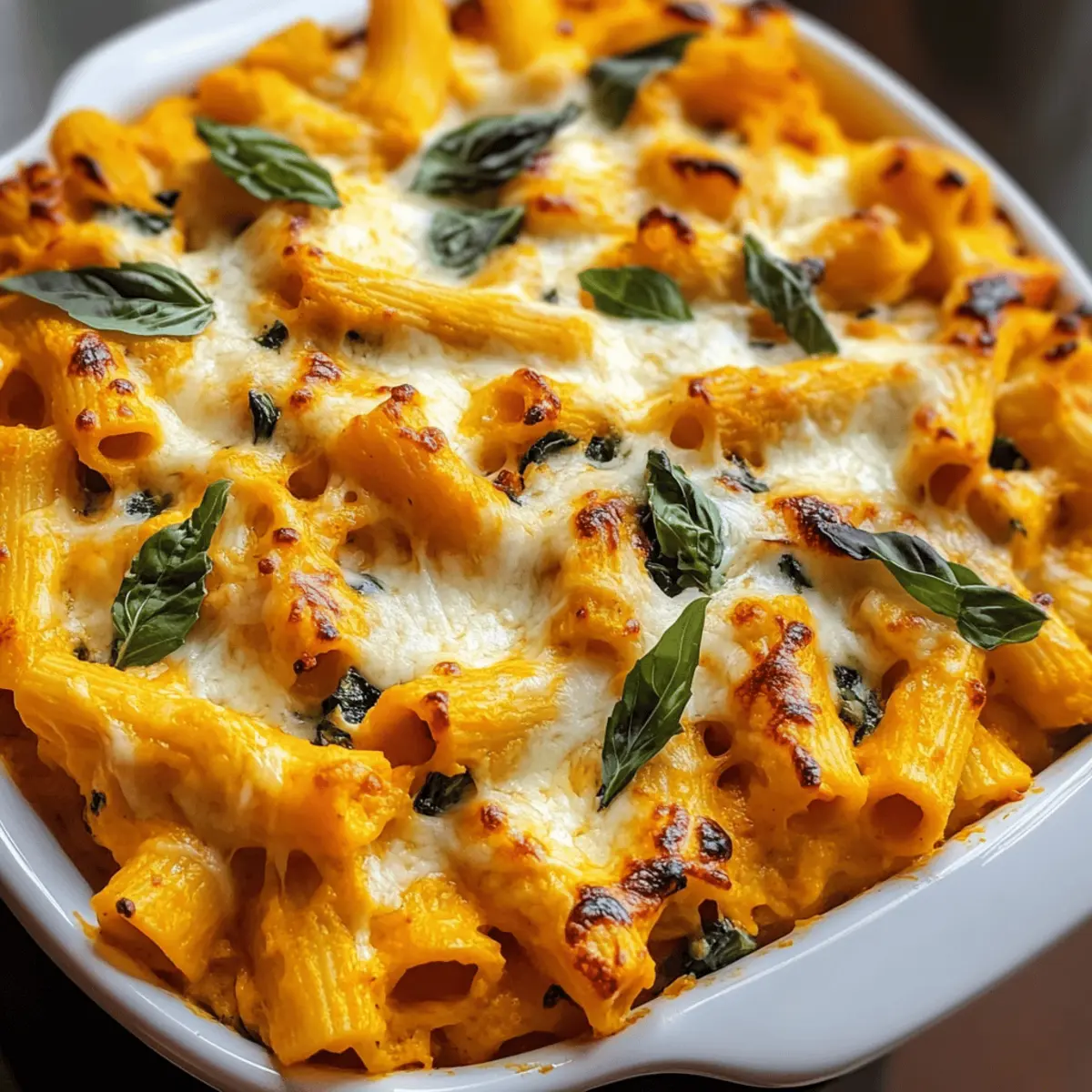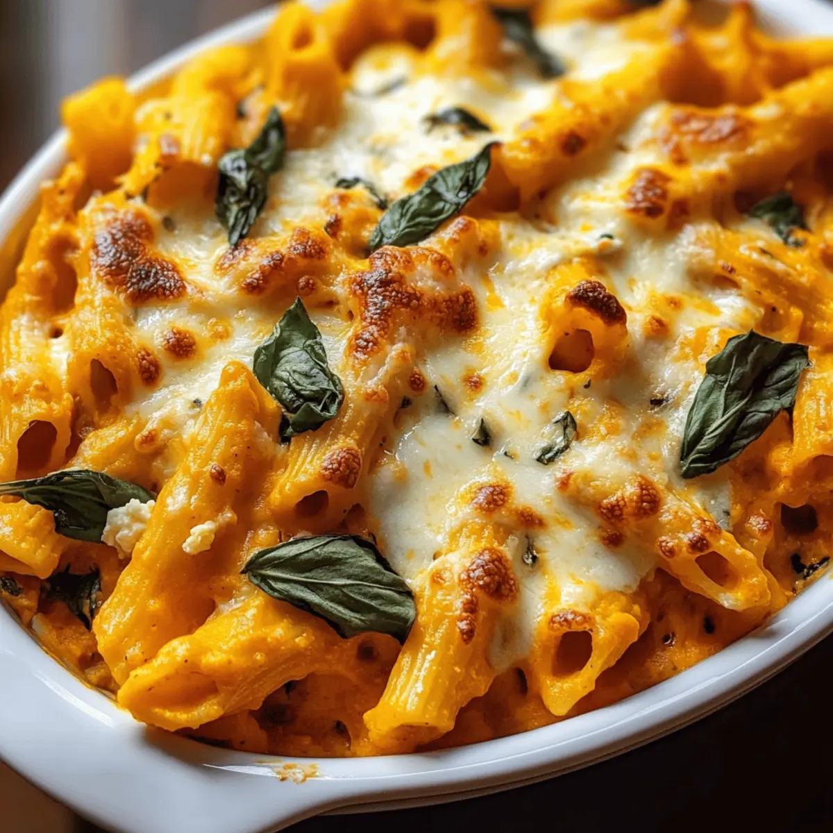 Jump to Recipe Print RecipeAs I stirred the familiar blend of flavors, the aroma of roasted pumpkin began to sweep through my kitchen, wrapping me in a warm embrace of autumn nostalgia. This Cheesy Pumpkin Ricotta Pasta Bake is a delightful creation that merges the creamy richness of ricotta with the earthy sweetness of pumpkin puree, offering a comforting dish that’s perfect for those chillier nights. This recipe isn’t just cozy; it’s also a breeze to whip up, making it a wonderful choice for both beginner cooks and seasoned chefs alike. Plus, it’s a crowd-pleaser that can easily be adapted into a vegetarian option or customized with your favorite pasta. Are you ready to bring a touch of fall into your kitchen and treat your loved ones to a hearty, delicious meal? Why is this pasta bake a must-try? Indulgent Comfort: This Cheesy Pumpkin Ricotta Pasta Bake is the ultimate cozy meal that brings the warmth of autumn to your dinner table. Versatile Ingredients: With easy substitutions, you can create a dish that aligns perfectly with your dietary preferences. Effortless Preparation: Designed for both novice and experienced cooks, it promises a delicious outcome without complicated techniques. Crowd-Pleasing Flavor: The combination of creamy ricotta and sweet pumpkin puree will win over both family and friends, making it ideal for gatherings! Looking for more comforting dishes? Try our Pumpkin Cream Cheese Swirl Muffins or Cheesy One Pot Pasta for a full autumn-inspired menu! Cheesy Pumpkin Ricotta Pasta Bake Ingredients • Here’s everything you need to create this warm, cozy dish. For the Pasta Pasta – Use sturdy shapes like penne or rigatoni for excellent sauce adherence; fusilli or shell pasta are great alternatives. For the Sauce Pumpkin Puree – Adds natural sweetness and vibrant autumn color; sweet potato puree can be used for a unique twist. Ricotta Cheese – Brings a creamy texture that blends beautifully; swap with cream cheese for a heavier consistency. Mozzarella Cheese – Delivers that melty goodness; consider provolone for a sharper taste. Parmesan Cheese – Provides depth and a crunchy finish when baked; Grana Padano is an excellent substitute for similar flavor. Spinach – Introduces vibrant color and nutrients into the dish; kale or Swiss chard work wonderfully as alternatives. Onion – Infuses aromatic sweetness; shallots can soften the flavor profile if preferred. Garlic – Enhances the overall flavor; fresh garlic is always better than powdered for this recipe. Nutmeg – Elevates the pumpkin’s natural sweetness and adds warmth; omit or switch to cinnamon for a different note. Salt & Black Pepper – Essential for balancing all the flavors. For the Baking Broth (Vegetable or Chicken) – Adjusts sauce thickness and enriches flavor; homemade broth makes for a richer experience. Olive Oil – Used as the sauté base to enhance the flavor of onion and garlic; avocado oil can provide a different taste. Basil Leaves – Optional garnish that adds freshness; substitute with parsley for a lighter herb option. Enjoy creating your Cheesy Pumpkin Ricotta Pasta Bake—a delightful comfort food that’s both nourishing and satisfying! Step‑by‑Step Instructions for Cheesy Pumpkin Ricotta Pasta Bake Step 1: Preheat the Oven Begin by preheating your oven to 375°F (190°C). This step is crucial as it ensures your Cheesy Pumpkin Ricotta Pasta Bake cooks evenly and develops that lovely golden crust on top. While the oven warms up, you can prepare the pasta and sauce, making the process smoother and more efficient. Step 2: Cook the Pasta In a large pot of boiling salted water, cook your chosen sturdy pasta (like penne or rigatoni) according to package instructions until al dente, usually about 8–10 minutes. Once cooked, drain the pasta and set it aside in a large mixing bowl. This waiting step will allow the pasta to soak up the savory sauce later. Step 3: Sauté the Aromatics In a skillet over medium heat, add a couple of tablespoons of olive oil and heat until shimmering. Sauté one diced onion until it becomes translucent, about 5 minutes. Then, add minced garlic and cook for an additional minute, stirring constantly until fragrant. This combination will create a flavorful base for your sauce. Step 4: Create the Sauce Stir in the pumpkin puree, ricotta cheese, freshly grated nutmeg, salt, and black pepper into the sautéed mixture. Mix everything until smooth and creamy over medium heat, allowing the flavors to meld together for 2-3 minutes. This step is what makes your Cheesy Pumpkin Ricotta Pasta Bake rich and comforting. Step 5: Adjust Consistency Gradually mix in vegetable or chicken broth until the sauce reaches your desired consistency; it should be creamy but not too thick. Continue to stir for another 2–3 minutes, letting the sauce warm through. The result should be a velvety blend that you can easily coat the pasta with in the next step. Step 6: Incorporate Spinach Add a few handfuls of fresh spinach to the sauce, stirring until wilted, which should take just 2-3 minutes. The vibrant green color will brighten the sauce and provide vital nutrients, making the Cheesy Pumpkin Ricotta Pasta Bake not just tasty but healthy too. Step 7: Combine Pasta and Sauce In the large bowl with your drained pasta, pour in the creamy pumpkin and ricotta sauce. Toss everything together until each piece of pasta is thoroughly coated in the luscious sauce, ensuring each bite of the Cheesy Pumpkin Ricotta Pasta Bake is packed with flavor and creaminess. Step 8: Transfer to Baking Dish Grease a baking dish with olive oil or cooking spray and carefully spoon the pasta mixture into it. Smooth down the top with a spatula to create an even layer, allowing for consistent cooking and a lovely presentation once baked. This will help the cheesy crust form beautifully. Step 9: Add the Cheese Topping Generously sprinkle shredded mozzarella and grated Parmesan cheese over the top of 