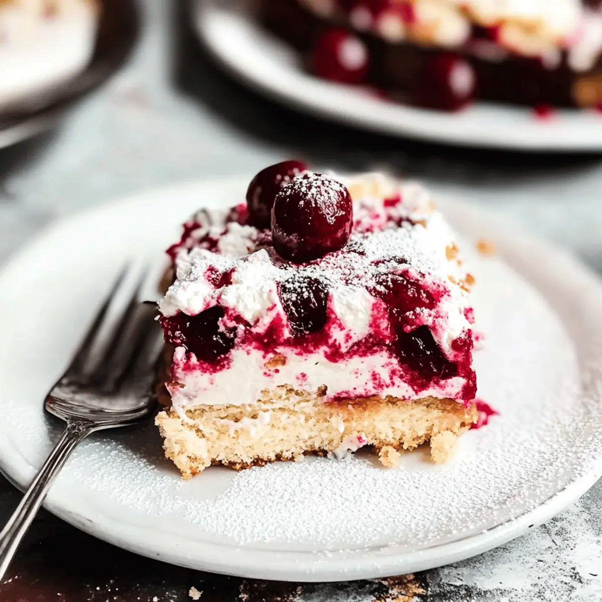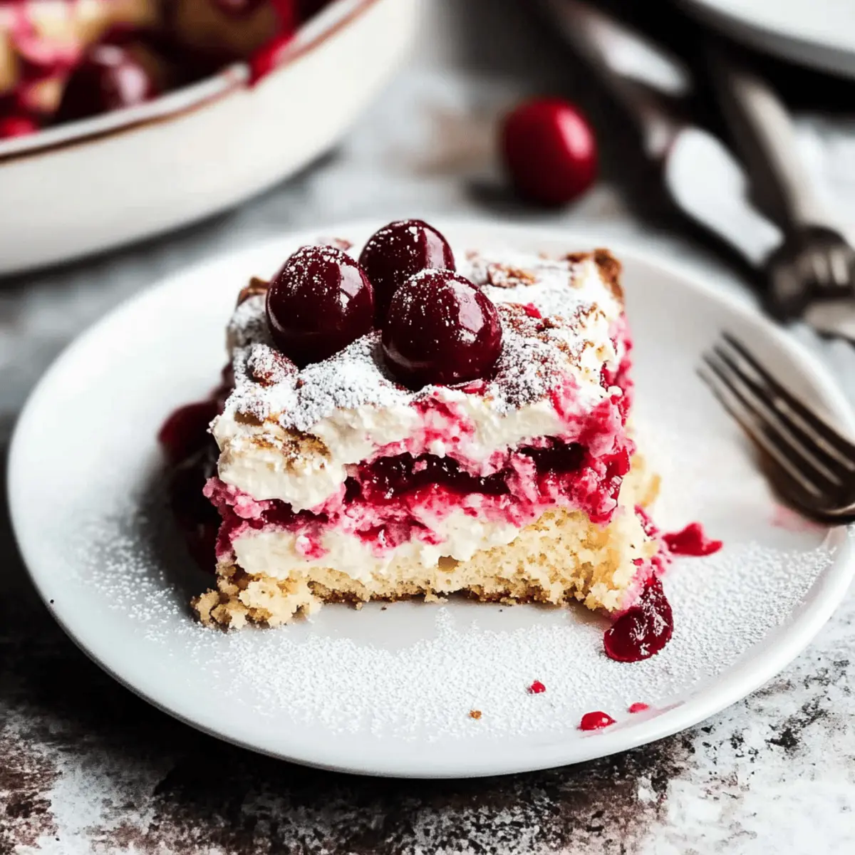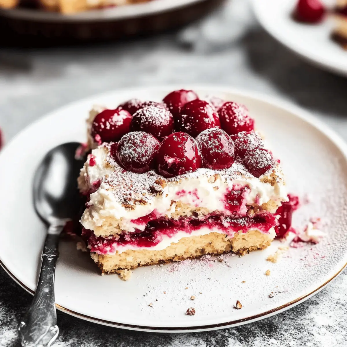 Jump to Recipe Print RecipeAs I navigated through a sun-drenched afternoon, the idea of a cool, no-bake dessert struck me—a Cherry Almond Tiramisu. This delightful summer treat brings together layers of amaretto-dipped lady fingers and a luscious cherry filling, topped off with a velvety mascarpone cream. What makes this Cherry Almond Tiramisu truly irresistible is not just its refreshing taste, but the fact that it’s perfect for those sweltering days when you want a homemade dessert without the heat of the oven. Plus, with easy options for a non-alcoholic variation, it’s a crowd-pleaser for everyone! Ready to elevate your dessert game and impress your friends and family? Let’s dive into the layers of this delightful creation. Why is Cherry Almond Tiramisu a Must-Try? Refreshing and oh-so-light, this no-bake dessert is perfect for summer gatherings. Versatile enough to allow for non-alcoholic options, everyone can enjoy it. Layered perfection of lady fingers, cherry filling, and silky mascarpone creates a dreamy contrast of flavors and textures. Quick to prepare, this treat requires minimal effort while maximizing taste—a win for any home cook! Feeling adventurous? You can also check out our Cherry Cheesecake Puppy recipe for another delightful summer dessert! Cherry Almond Tiramisu Ingredients • Dive into the delightful layers of this no-bake Cherry Almond Tiramisu! For the Cherry Mixture Pitted Sweet Cherries (1½ cups, roughly chopped) – Adds natural sweetness and vibrant flavor; frozen cherries can be a great substitute if fresh ones aren’t available. Granulated Sugar (4 tablespoons total) – Sweetens both the cherry compote and the mascarpone cream perfectly. Cornstarch (1 teaspoon) – Acts as a thickener, giving the cherry mixture that perfect consistency. Water (4 teaspoons total) – Helps create the simple syrup and thins out your cherry mixture just right. For the Amaretto Mixture Amaretto (¼ cup) – Imparts a wonderful almond flavor that enhances the cherries; replace with additional water and almond extract for a non-alcoholic option. For the Tiramisu Assembly Lady Fingers (15 pieces) – These delightful treats absorb all the beautiful flavors while providing wonderful texture. Mascarpone Cheese (8 oz, cold) – Creates the creamy base for the filling; using cold ingredients results in a lighter texture. Heavy Whipping Cream (¾ cup total) – Used for both the mascarpone layer and a whipped cream topping; whip until fluffy! Vanilla Paste or Extract (1 teaspoon) – Adds a depth of flavor that ties everything together beautifully. Powdered Sugar (2 tablespoons) – Sweetens the whipped cream topping; feel free to skip for a less sweet flavor. For the Optional Toppings Freeze-Dried Cherries or Cocoa Powder (optional) – Perfect for dusting on top, offering extra flavor and visual appeal to your Cherry Almond Tiramisu. Feel free to remove or adjust any optional ingredients to suit your taste. The key here is to enjoy the making—and of course, the eating—of this luscious dessert! Step‑by‑Step Instructions for Cherry Almond Tiramisu Step 1: Prepare Cherry Mixture Start by pitting and roughly chopping 1½ cups of sweet cherries. In a saucepan over medium heat, combine the chopped cherries with 4 tablespoons of granulated sugar. Cook for about 5-7 minutes until the cherries release their juices and the mixture starts to bubble. Stir occasionally, allowing the cherries to soften and melt into a delightful compote. Step 2: Thicken Mixture In a small bowl, mix 1 teaspoon of cornstarch with 4 teaspoons of water until smooth. Gradually stir this mixture into the cherry mixture while on low heat. Continue cooking for an additional 2-3 minutes until it thickens and coats the back of a spoon. Once thickened, remove it from heat and let it cool in the refrigerator while you prepare the rest of the Cherry Almond Tiramisu. Step 3: Make Amaretto Mixture In a small saucepan, combine 4 teaspoons of water with 2 tablespoons of sugar. Heat gently over low heat, stirring until the sugar is completely dissolved. Allow this to cool slightly, then stir in ¼ cup of amaretto or your non-alcoholic alternative made from water and almond extract. This mixture will help flavor the lady fingers, so set it aside. Step 4: Prepare Mascarpone Cream In a stand mixer, add 8 oz of cold mascarpone cheese along with 2 tablespoons of granulated sugar, 3 egg yolks, ¾ cup of heavy whipping cream, and 1 teaspoon of vanilla paste. Beat on high speed for about 2-3 minutes until it becomes fluffy and holds soft peaks. The creamy consistency is key to achieving that delightful layer in your Cherry Almond Tiramisu. Step 5: Assembly Take your lady fingers and quickly dip each one into the prepared amaretto mixture, ensuring they are evenly soaked but not soggy. Layer them in a loaf pan, followed by a generous spread of the cooled cherry mixture. On top of that, add a layer of the mascarpone cream. Repeat the process until all ingredients are used, typically two or three layers, finishing with the mascarpone cream. Step 6: Chill Cover the assembled Cherry Almond Tiramisu with plastic wrap and refrigerate for at least 4 hours, though overnight is best. This chilling time allows the flavors to meld beautifully, and the lady fingers to soften into a luscious layer that sets the stage for a truly refreshing dessert. Step 7: Serve When you’re ready to serve, remove the Cherry Almond Tiramisu from the fridge. Optionally, you can whip ¾ cup of heavy cream with 2 tablespoons of powdered sugar until fluffy and spread it on top of the tiramisu. Dust with freeze-dried cherry powder or cocoa powder for an elegant touch. Slice and enjoy this delightful no-bake dessert with family or friends! Make Ahead Options These Cherry Almond Tiramisu are an absolute game-changer when it comes to meal prep! You can prepare the cherry mixture and mascarpone cream up to 24 hours in advance, allowing the flavors to meld b