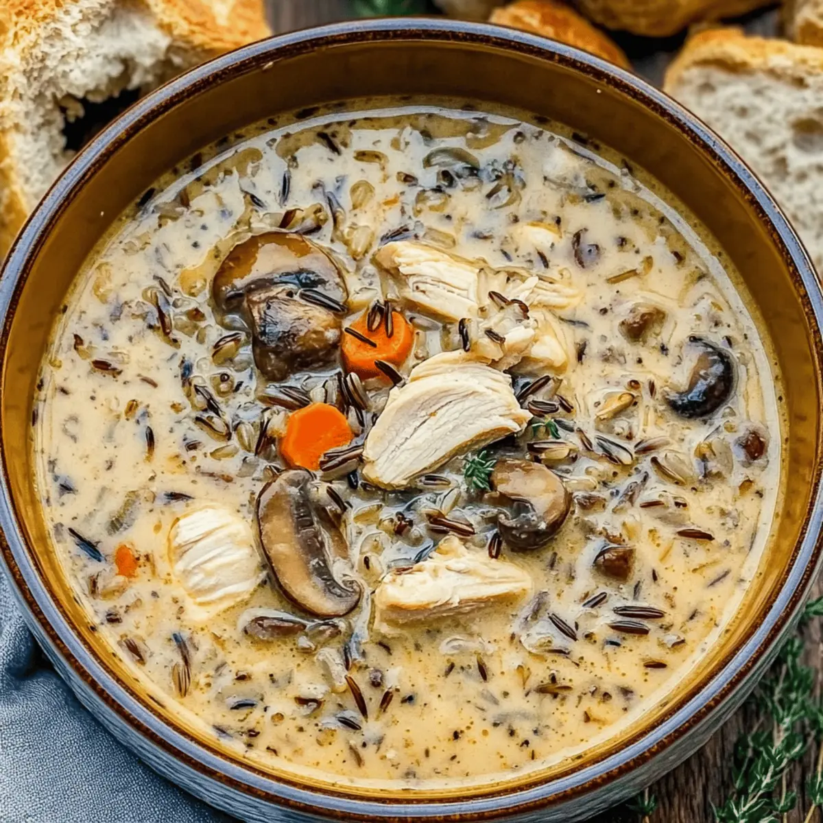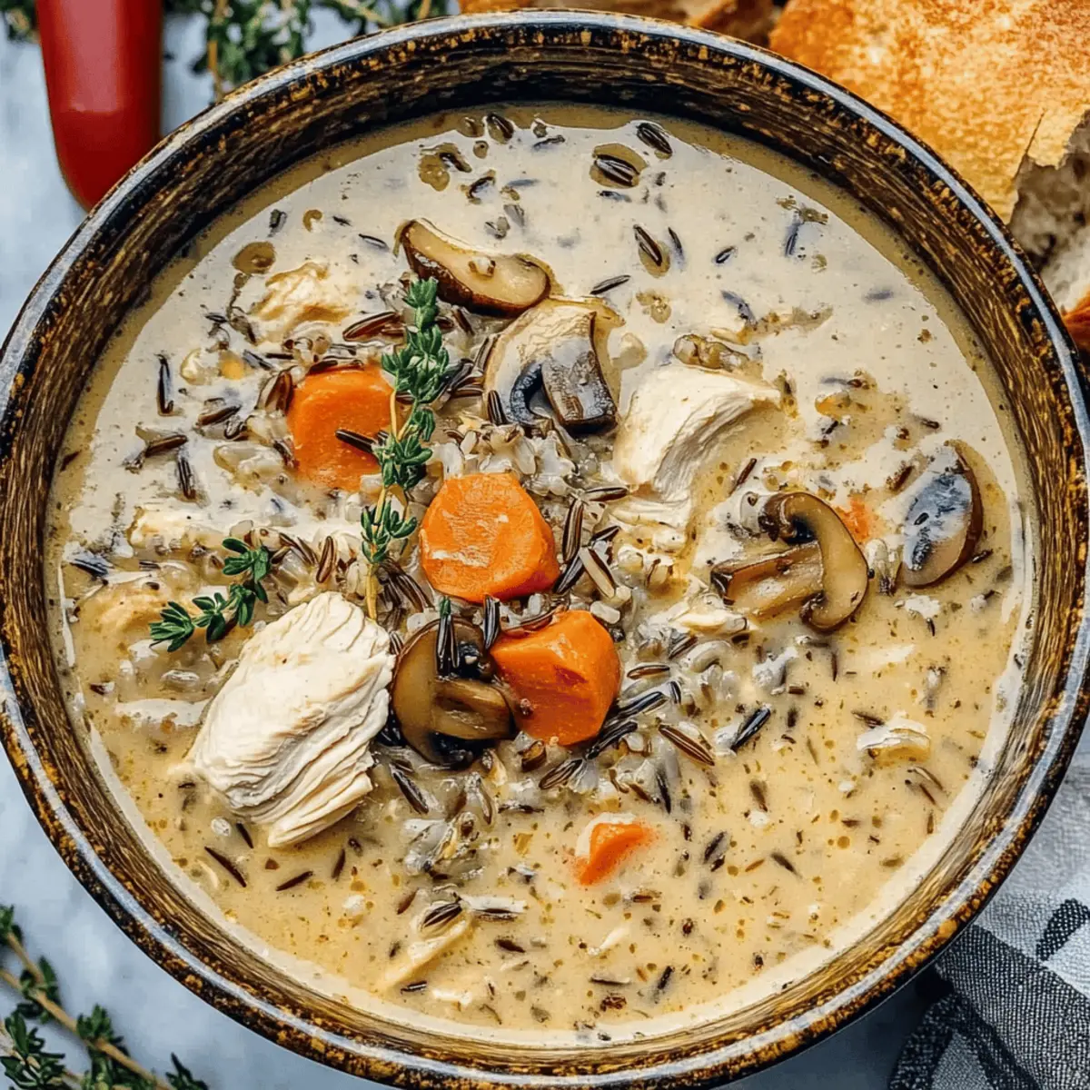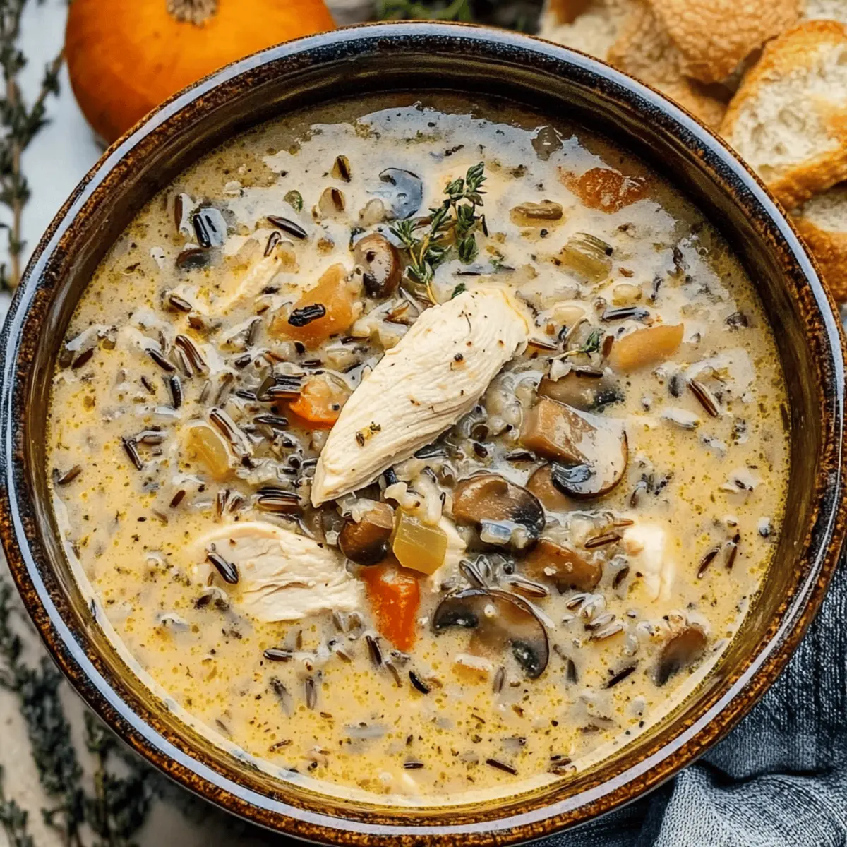 Jump to Recipe Print RecipeAs the wind howls outside, there’s nothing quite like the aroma of a simmering pot of Creamy Chicken and Mushroom Wild Rice Soup wafting through your home. This cozy meal not only wraps you in warmth but also delights with its combination of tender chicken, earthy mushrooms, and the nutty excellence of wild rice. The best part? It’s incredibly simple to prepare and can be made in a slow cooker, making it perfect for busy evenings. Plus, you can whip up a big batch and freeze it for those days when cooking feels like a daunting task. Are you ready to turn your kitchen into a haven of comfort? Let’s dive into this heartwarming recipe! Why Will You Love This Soup? Comforting: A bowl of this soup is like a hug on a chilly evening, offering warmth with each spoonful. Versatile: Whether you’re using rotisserie chicken or a fresh catch from the market, the choice is yours! Effortless Preparation: With just a few simple steps, you can have a delicious meal ready, making it ideal for busy days. Freezer-Friendly: Make a big batch and freeze portions for quick dinners whenever you need them. Flavor Explosion: The rich combination of mushrooms, spices, and chicken broth creates a cozy depth that keeps your taste buds dancing. Pair it with a side of crusty bread or a fresh salad for the perfect meal, and you’ll find this bowl of soup becomes a regular in your dinner rotation! Chicken and Mushroom Wild Rice Ingredients For the Soup Base • Butter – Adds richness and flavor; substitute with olive oil for a lighter touch. • Onion – Provides sweetness and depth; use shallots for a milder flavor. • Celery – Contributes freshness and crunch; fennel works as a great substitute for anise notes. • Carrots – Adds sweetness and color; swap them for parsnips for a unique twist. • Fresh Mushrooms – Enhances umami richness; varieties like cremini or shiitake are great choices. For Thickening and Flavor • All-Purpose Flour – Used for thickening the soup; opt for cornstarch or gluten-free flour for dietary preferences. • Chicken Broth – The flavorful base of your soup; vegetable broth can lighten it up if needed. • Cooked Wild Rice – Provides a delightful texture and nutty flavor; brown rice can be substituted, adjusting cooking times accordingly. • Boneless, Skinless Chicken Breasts – The heart of the dish; rotisserie chicken can be an excellent time-saver. For Seasoning • Salt – Enhances flavors; adjust based on dietary needs or use low-sodium versions. • Curry Powder – Adds warmth and complexity; omit or reduce for a milder taste. • Mustard Powder – Introduces tanginess; Dijon mustard can replace it, but in smaller amounts. • Dried Parsley – Offers herbaceous notes; fresh parsley can enhance the flavor even more. • Ground Black Pepper – Adds necessary spice; white pepper can serve as an alternative. For Crunch and Creaminess • Slivered Almonds – Provides crunch and nuttiness; pine nuts can also work or you can omit them for a nut-free option. • Dry Sherry – Adds depth; if you don’t have it, consider vermouth or simply omit it. • Half-and-Half – Creates a creamy texture; use heavy cream for richness or milk for a lighter soup. Ready to savor the comforting shades of this Chicken and Mushroom Wild Rice soup? Let’s get cooking! Step‑by‑Step Instructions for Creamy Chicken and Mushroom Wild Rice Soup Step 1: Prepare Ingredients Begin by gathering all the ingredients needed for the Creamy Chicken and Mushroom Wild Rice Soup. This includes butter, onion, celery, carrots, fresh mushrooms, all-purpose flour, chicken broth, cooked wild rice, boneless chicken breasts, and various seasonings. Having everything on hand will streamline the cooking process and ensure each flavor melds beautifully. Step 2: Cook Vegetables In a large saucepan, melt 4 tablespoons of butter over medium heat until it shimmers. Add diced onion, chopped celery, and sliced carrots, sautéing them for about 5 minutes or until they soften. Next, introduce sliced fresh mushrooms into the mix and sauté for an additional 2 minutes, allowing their earthy aroma to fill your kitchen. Step 3: Make Roux Once the vegetables are tender, sprinkle 1/4 cup of all-purpose flour over the sautéed mixture. Stir well to combine, ensuring the flour coats the vegetables evenly. Cook this roux for about 2-3 minutes until it becomes lightly golden—this will help thicken your soup and enhance the overall flavor. Step 4: Add Broth Gradually pour in 6 cups of chicken broth while stirring continuously to avoid any lumps. Bring the mixture to a gentle boil over medium-high heat, allowing it to bubble softly. Once it reaches that point, reduce the heat to low and let it simmer gently, encouraging all the flavors to marry together nicely. Step 5: Combine Ingredients Stir in 2 cups of cooked wild rice, cubed boneless chicken breasts, salt, curry powder, mustard powder, parsley, black pepper, slivered almonds, and a splash of dry sherry. Ensure everything is well combined and simmer the mixture for about 10 minutes, letting the chicken cook through and the ingredients interact harmoniously. Step 6: Finish Soup To create that creamy texture in your Chicken and Mushroom Wild Rice Soup, slowly add 1 cup of half-and-half. Continue to simmer the soup for an additional 1 to 2 hours, stirring occasionally to prevent it from boiling. Keep an eye on the consistency, as it should be thick and comforting, perfect for serving in warm bowls. Storage Tips for Chicken and Mushroom Wild Rice Soup Fridge: Store the soup in an airtight container for up to 5 days, allowing it to maintain its comforting flavors and creamy texture. Freezer: Freeze the soup for up to 3 months; for best results, do this before adding half-and-half to maintain creaminess upon reheating. Reheating: When ready to enjoy, thaw the soup overnight in the fridge, then reheat on the stovetop over low heat, stirring in