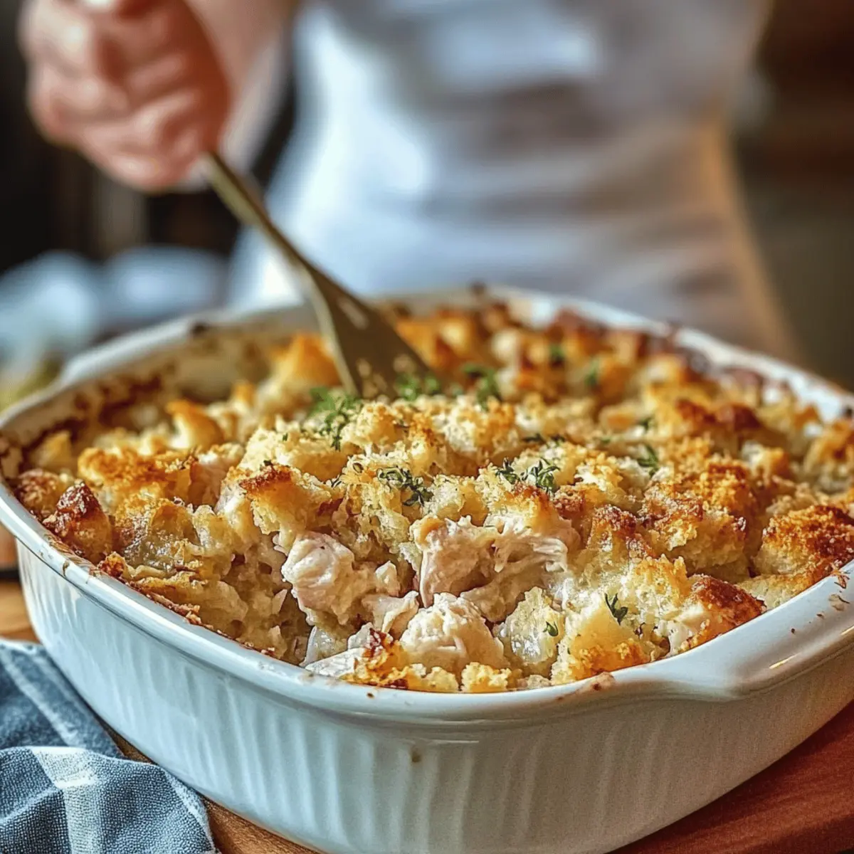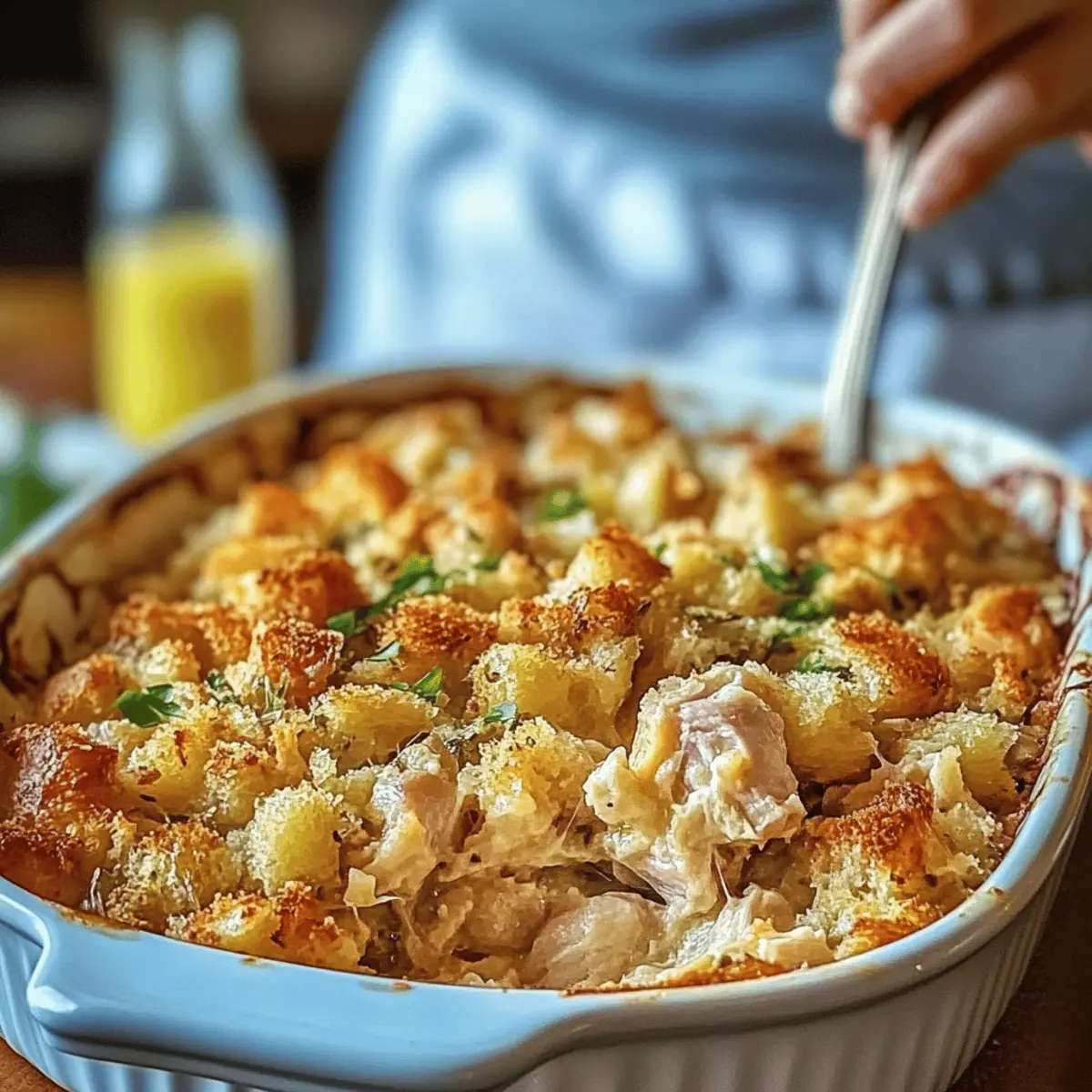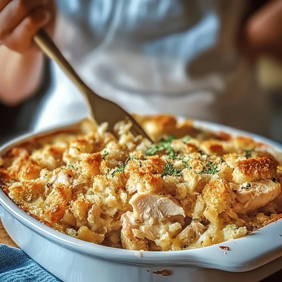 Jump to Recipe Print RecipeAs I opened the oven door, the warm aroma of Dolly’s Chicken and Stuffing Casserole enveloped my kitchen, reminiscent of cozy family gatherings and comfort food cravings. This dish, with its tender, shredded chicken swimming in a creamy sauce and topped with savory stuffing, promises not just satisfaction but also a straightforward preparation that fits seamlessly into busy weeknights. One of the best things about this Chicken and Stuffing Casserole is its adaptability—add some cheese for richness or toss in peas for a pop of color and nutrition. Whether you’re feeding a hungry family or hosting friends, this customizable, hearty casserole will surely become a cherished staple. So, what are you waiting for? Let’s dive into making this delightful, crowd-pleasing dish! Why is Chicken and Stuffing Casserole Perfect? Comforting Warmth: This dish wraps you in a cozy hug, making it ideal for chilly evenings. Effortless Preparation: Just a handful of ingredients means you can whip it up in no time. Customizable Goodness: Want to mix it up? Add cheese or swap in turkey or ham for a delicious twist! Feeding a Crowd: Perfect for family dinners or potlucks, everyone will come back for seconds. Make-Ahead Magic: Prep it in advance and pop it in the oven when you’re ready, making entertaining a breeze. Chicken and Stuffing Casserole Ingredients For the Casserole 3 cups cooked and shredded chicken – Provides the main protein; rotisserie chicken works well for convenience. 1 (10.5-ounce) can cream of chicken soup – Adds creaminess; substitute with any cream soup if desired. 1 (10.5-ounce) can cream of mushroom soup – Adds richness and depth; can be replaced with cream of celery or potato soup. 1 cup sour cream – Enhances creaminess and tang; use dairy-free yogurt for a dairy-free option. ½ cup milk – Thins the mixture; substitute half-and-half for a richer texture. 1 teaspoon onion powder – Adds flavor. 1 teaspoon garlic powder – Contributes aromatic flavor. ½ teaspoon dried thyme – Imparts a herbal note. ½ teaspoon black pepper – Adds spice. ½ teaspoon salt – Enhances overall flavor; adjust to taste. 1 (6-ounce) box of stuffing mix (such as Stove Top) – Provides the backbone of the casserole; use gluten-free stuffing for gluten-free versions. ½ cup melted butter – Binds the stuffing mix. 1 ½ cups chicken broth – Adds moisture and flavor. Optional Add-Ins 1 cup shredded cheddar cheese – Adds richness; can be substituted with dairy-free cheese or omitted for a lighter version. ½ cup frozen peas – Adds color and nutrition; can include chopped carrots or celery for variation. This Chicken and Stuffing Casserole combines convenience with comfort, making it an ideal dish for any occasion! Step‑by‑Step Instructions for Chicken and Stuffing Casserole Step 1: Preheat and Prepare the Dish Begin by preheating your oven to 350°F (175°C). While it’s warming up, take a 9×13-inch baking dish and grease it lightly with cooking spray or butter to prevent the casserole from sticking. This will create a perfect base for your tasty Chicken and Stuffing Casserole, ensuring it bakes evenly and comes out easily once done. Step 2: Combine the Chicken Mixture In a large mixing bowl, combine the 3 cups of cooked and shredded chicken with the cream of chicken soup, cream of mushroom soup, sour cream, and milk. Add the onion powder, garlic powder, dried thyme, salt, and black pepper. Stir everything together until the mixture is smooth and well blended. This creamy combination will form the heart of your delicious casserole. Step 3: Spread the Chicken Layer Once your chicken mixture is well combined, pour it into the prepared baking dish. Use a spatula to spread it evenly across the bottom, creating a smooth, uniform layer. This base of the Chicken and Stuffing Casserole will be bursting with flavor, ensuring that every bite is as delightful as the last. Step 4: Prepare the Stuffing Topping In a separate bowl, mix the box of stuffing mix with the melted butter and chicken broth until it’s well combined and moistened. The stuffing will absorb some of the moisture, creating a rich, flavorful topping. This is the crowning glory of your casserole, adding texture and warmth to the dish. Step 5: Assemble the Casserole Spread the stuffing mixture evenly over the top of the chicken layer in the baking dish. If you’d like, sprinkle shredded cheddar cheese over the stuffing for an extra cheesy finish. This addition can enhance the overall flavor of your Chicken and Stuffing Casserole, making it even more indulgent. Step 6: Bake to Perfection Place the casserole in your preheated oven and bake uncovered for 35-40 minutes. Keep an eye on it; you’ll know it’s ready when the top layer is golden brown and the edges are bubbling. This bubbling action will indicate that the flavors have melded together beautifully. Step 7: Cool Before Serving Once the casserole is done baking, carefully remove it from the oven and let it rest for 5-10 minutes. This resting time allows the casserole to set and makes it easier to serve. As you wait, enjoy the mouthwatering aroma filling your kitchen, a sure sign of the comforting meal you’ve just created. What to Serve with Dolly’s Chicken and Stuffing Casserole When you serve Dolly’s Chicken and Stuffing Casserole, elevate the dining experience with these delightful accompaniments that perfectly balance flavors and textures. Creamy Mashed Potatoes: These buttery delights pair well with the casserole’s creamy texture, providing a comforting contrast that will satisfy every bite. Fresh Garden Salad: Crisp greens topped with a light vinaigrette add freshness, cutting through the richness of the casserole and bringing a lovely crunch to each forkful. Garlic Green Beans: Sautéed in a bit of olive oil, these tender green beans deliver a subtle garlicky goodness and a hint of brightness, enhancing the dish’s comforting 