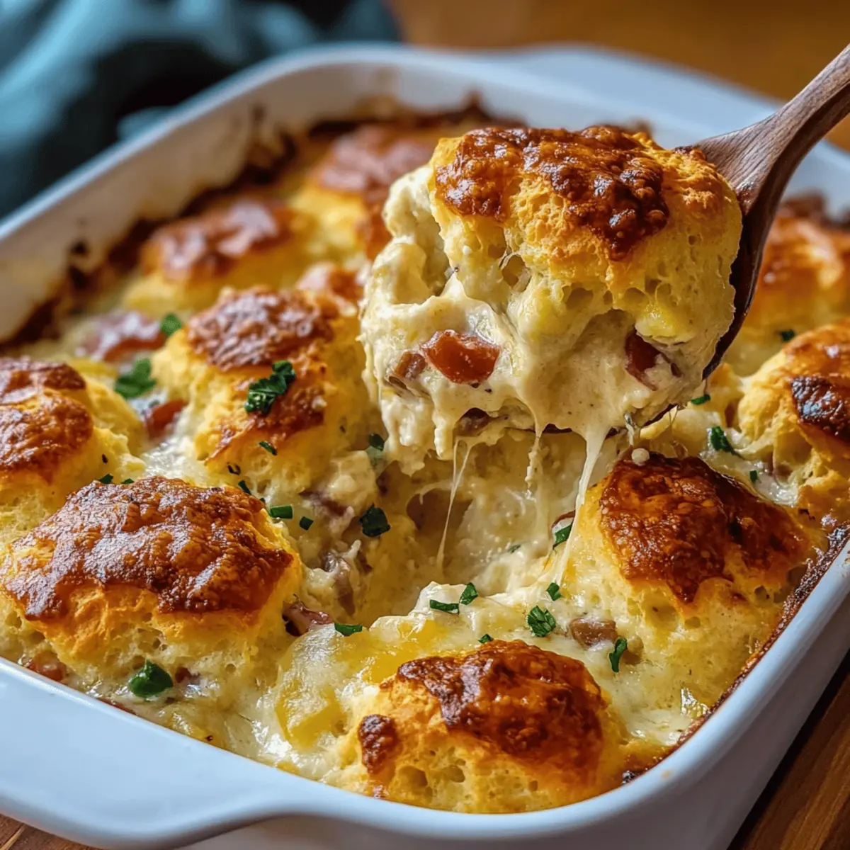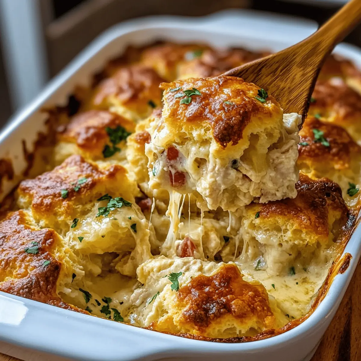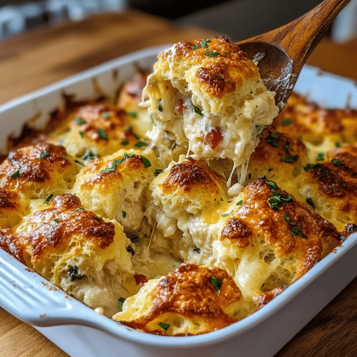 Jump to Recipe Print RecipeAs I rifled through my pantry, that familiar stomach grumble drove me to whip up something comforting yet effortless. Enter the Chicken Bubble Biscuit Bake Casserole—a delightful medley of tender chicken, fluffy biscuits, and a creamy sauce that marries ease with flavor! This recipe transforms a handful of simple ingredients into a heartwarming dish that comes together in just 10 minutes of prep time, making it perfect for busy weeknight dinners or casual gatherings. It’s a family-friendly staple that invites creative twists, whether you’re tossing in extra veggies or trying out different cheeses. Are you ready to dive into a bowl of warmth and jazz up your dinner routine? Let’s make this casserole together! Why Is This Casserole a Must-Try? Effortless Preparation: With only 10 minutes of hands-on time, you can easily whip this up on a busy weeknight. Creamy, Flavorful Goodness: The blend of tender chicken and a rich, creamy sauce delivers comfort in every bite. Endless Customization: Feel free to swap ingredients—try adding fresh veggies or different cheeses for a unique twist! Family-Friendly Appeal: Even picky eaters can’t resist the fluffy biscuits and cheesy goodness, making it a crowd-pleaser. Make-Ahead Convenience: Prep in advance and refrigerate, making it perfect for spontaneous gatherings or hassle-free dinners. Get inspired with variations like the Cheesy Ranch Version or a spicy Buffalo Chicken Twist to keep things exciting! Chicken Bubble Biscuit Bake Casserole Ingredients For the Filling Cooked Chicken – Provides protein and substance; rotisserie chicken works great for quick prep. Cream of Chicken Soup – Forms the creamy base; substitute with cream of mushroom or cream of celery for a twist. Sour Cream – Adds tanginess and creaminess; Greek yogurt can replace sour cream for a lighter option. Milk – Thins the mixture slightly and enhances creaminess; use any milk of choice. Frozen Mixed Vegetables – Adds nutrition and color; can substitute with fresh vegetables like peas or broccoli. Garlic Powder – Enhances flavor; fresh garlic can be used for a stronger taste. Onion Powder – Adds depth; yellow onion can be sautéed and added for a different flavor profile. Salt & Pepper – Essential seasonings to enhance overall flavor; adjust according to taste. For the Biscuit Topping Refrigerated Biscuit Dough – The base for the fluffy casserole topping; cut into quarters to ensure even baking. Shredded Cheese – Provides gooeyness and flavor; cheddar is traditional, or use mozzarella for a milder taste. Melted Butter – Optional for brushing on top for added richness. Dive into the cozy warmth of this Chicken Bubble Biscuit Bake Casserole recipe that promises comfort and satisfaction with every bite! Step‑by‑Step Instructions for Chicken Bubble Biscuit Bake Casserole Step 1: Preheat Your Oven Begin by preheating your oven to 350°F (175°C). While the oven warms up, grab a 9×13-inch baking dish and lightly grease it with cooking spray or butter to prevent sticking. Setting the stage with a well-prepared dish ensures that your Chicken Bubble Biscuit Bake Casserole comes out perfectly golden and bubbly! Step 2: Create the Filling In a large mixing bowl, combine the cooked chicken, cream of chicken soup, sour cream, milk, frozen mixed vegetables, garlic powder, onion powder, salt, and pepper. Stir the mixture until it becomes smooth and creamy, ensuring that all ingredients meld together beautifully. This filling is the heart of your casserole, offering rich flavor and comforting goodness. Step 3: Incorporate the Biscuits Next, gently fold in the quartered biscuit pieces into your filling mixture. Be careful not to break the biscuits too much—each piece should be fully coated in the creamy goodness. This step is crucial, as the biscuits will puff up and form a delightful topping as they bake in your Chicken Bubble Biscuit Bake Casserole. Step 4: Assemble the Casserole Pour the chicken and biscuit mixture into your pre-greased baking dish, spreading it out evenly. This allows for even baking and ensures every bite is equally delicious. Sprinkle a generous amount of shredded cheese on top for that irresistible gooey texture. This layer will create a beautifully melty finish when it’s baked. Step 5: Bake to Perfection Cover the baking dish with aluminum foil and place it in the preheated oven. Bake for 20 minutes. After this initial time, carefully remove the foil to let the casserole continue baking for another 10-15 minutes. You’ll know it’s done when the biscuits are puffed up and golden brown, and the filling is bubbling around the edges. Step 6: Add a Finishing Touch If you desire an extra touch of richness, brush the top of the casserole with melted butter right after removing it from the oven. This step is optional but gives a lovely shine and flavor. Allow the Chicken Bubble Biscuit Bake Casserole to cool slightly before serving to enhance its flavors and let everything settle beautifully. Chicken Bubble Biscuit Bake Casserole Variations Feel free to explore these delightful options to make your casserole uniquely yours! Cheesy Ranch Version: Add a packet of ranch seasoning to the creamy base for a zesty kick. This gives an extra layer of flavor that pairs beautifully with the rich filling. Buffalo Chicken Twist: Incorporate buffalo sauce and use mozzarella cheese for spice. This fiery spin will thrill those who love a little heat in their comfort food. Veggie Lover’s Bake: Add in steamed broccoli, carrots, or peas for extra nutrition. Not only do they bring vibrant colors, but they also enhance that comforting, wholesome appeal of the dish. Loaded Casserole: Include cooked bacon crumbles or sprinkle green onions on top before serving. This adds a hearty crunch and a beautiful finish that elevates the overall dish. Turkey Swap: Use leftover turkey from holidays instead of chicken. This is a fantastic way to re