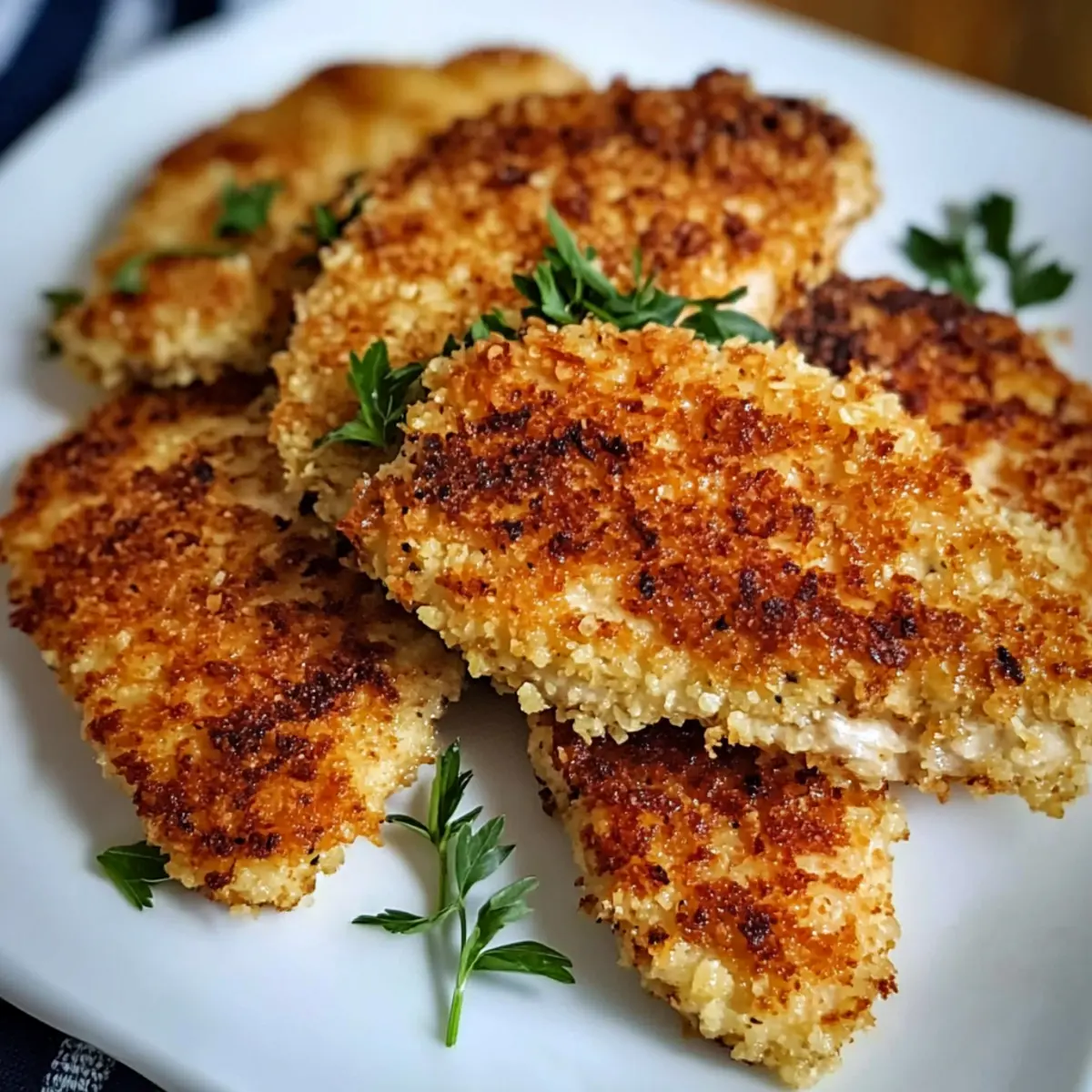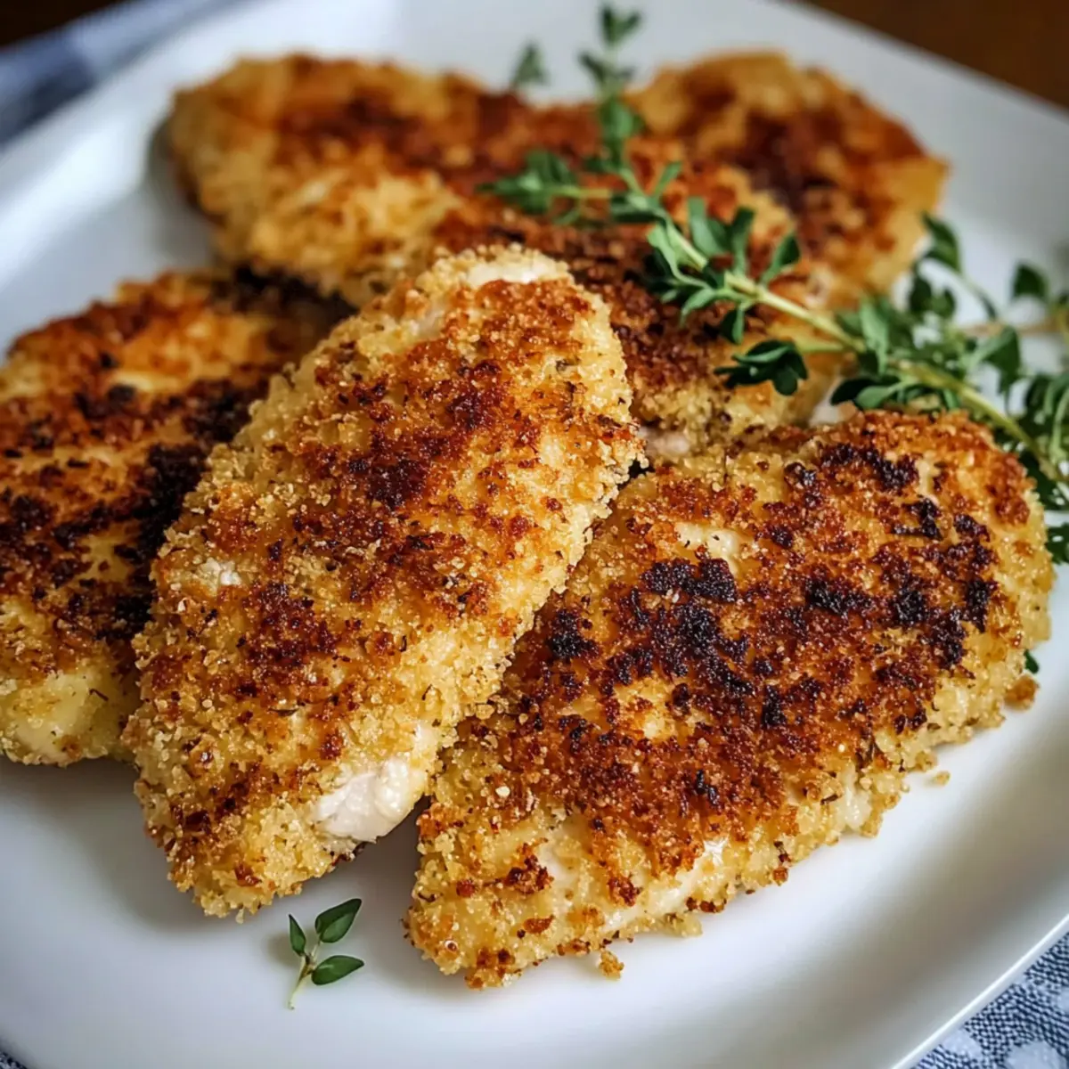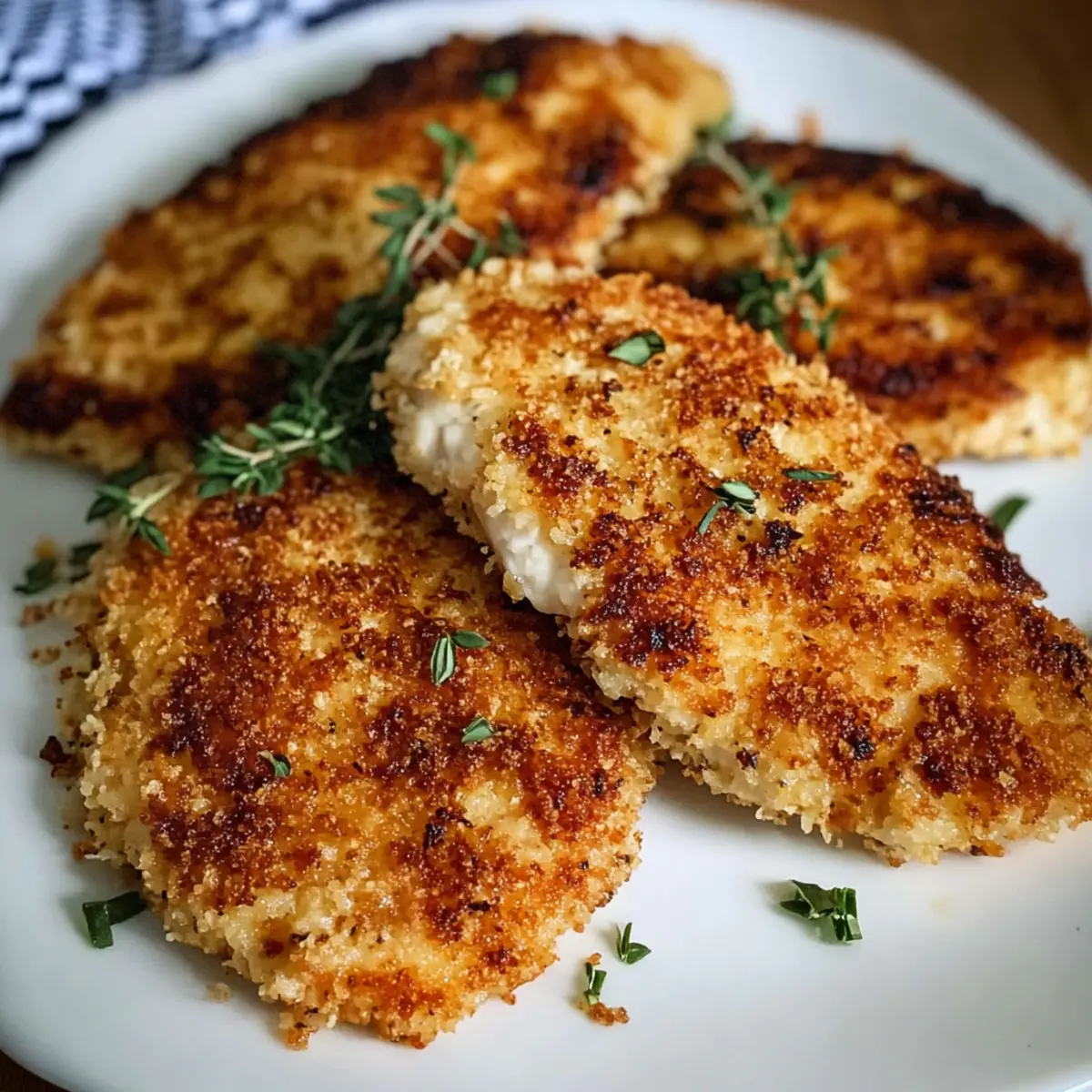 Jump to Recipe Print RecipeThe sizzle of chicken cooking in a hot skillet never fails to ignite a sense of comfort and anticipation in my kitchen. Today, I’m excited to share my super simple recipe for Chicken Cutlets that are incredibly crispy on the outside and so tender inside, you could cut them with just a fork! Made with everyday pantry staples, these cutlets are not only a quick solution for busy weeknights but also a crowd-pleaser that the whole family will adore. Pair them with creamy cauliflower mac and cheese or bright southern green beans for a wholesome meal that feels just right. Digging into these delicious cutlets will have you wondering why you ever settled for fast food! Are you ready to experience the joy of homemade? Let’s dive in! Why are these Chicken Cutlets a must-try? Irresistibly Crispy: The Panko breadcrumbs create a light and crunchy texture that’s simply addictive. Tender & Juicy: With just the right technique, these cutlets turn out fork-tender every time. Quick & Easy: Toss these together in under 30 minutes, perfect for busy evenings! Family-Friendly Meal: These cutlets please even the pickiest eaters, making them a surefire hit at the dinner table. Versatile Serving Options: Pair with marinara or ranch for a fun dipping experience, or whip up a side like Poblano Chicken Tacos for a complete feast! Get ready to make this delightful dish your new go-to for weeknight dinners! Chicken Cutlet Ingredients For the Chicken Cutlets • Boneless Skinless Chicken Breasts – The main protein source; pounded for quick cooking. • All-Purpose Flour – Provides a crispy coating; can substitute with gluten-free flour for a gluten-free version. • Large Eggs – Binds the breadcrumbs to the chicken for a perfect crust. • Panko Breadcrumbs – Creates a light and crispy texture; regular breadcrumbs can be used but won’t have the same crunch. • Grated Parmesan Cheese – Adds flavor and enhances crispiness; use nutritional yeast for a dairy-free option. • Italian Seasoning – Infuses herby depth into each bite. • Garlic Powder – Delivers savory notes. • Sea Salt – Enhances the overall flavor profile. • Freshly Ground Black Pepper – Adds a touch of warmth to the dish. • Olive Oil – Essential for frying; vegetable oil is a suitable substitute. Step‑by‑Step Instructions for Chicken Cutlets Step 1: Pound the Chicken Begin by placing the boneless skinless chicken breasts between two sheets of plastic wrap. Using a meat mallet, pound the chicken to an even thickness of about ¼ to ½ inch. This ensures that the chicken cuts will cook uniformly, preventing any part from being undercooked or overcooked. Set the pounded chicken aside while you prepare the breading station. Step 2: Prepare the Breading Station Set up your breading station with three shallow bowls. In the first bowl, add all-purpose flour and season it with a pinch of salt. In the second bowl, beat the large eggs until fully combined, creating a smooth mixture. In the third bowl, mix together panko breadcrumbs, grated Parmesan cheese, Italian seasoning, garlic powder, sea salt, and freshly ground black pepper for a flavorful coating. Step 3: Dredge the Chicken Take a piece of the pounded chicken and dredge it in the flour, ensuring it is evenly coated. Gently shake off any excess flour before dipping it into the beaten eggs, allowing the egg to cover the chicken entirely. Finally, coat the chicken in the breadcrumb mixture, pressing down lightly to adhere the crumbs. Repeat this process for all chicken cutlets. Step 4: Heat the Skillet In a large cast-iron skillet, heat 2 tablespoons of olive oil over medium-high heat. Wait until the oil shimmers slightly, indicating it’s hot enough for frying. An ideal temperature will help create that irresistible crispy exterior on your chicken cutlets. Ensure the skillet is large enough to prevent overcrowding—this is crucial for achieving maximum crispness. Step 5: Fry the Chicken Cutlets Carefully place the breaded chicken cutlets into the hot skillet, cooking in batches if needed. Fry for about 4–5 minutes on each side, or until golden brown and crispy. Use kitchen tongs to gently flip the cutlets, checking for a beautiful golden color. Make sure to monitor the cooking process closely to retain that perfect texture. Step 6: Check for Doneness As the final step, ensure each chicken cutlet reaches an internal temperature of 165°F for safety and thorough cooking. You can use an instant-read thermometer to verify this. Once cooked through, remove the cutlets from the skillet, letting them drain on paper towels to absorb excess oil. This will help maintain their crispiness until serving. Expert Tips for Chicken Cutlets Pound Evenly: Make sure to pound the chicken to an even thickness. This prevents uneven cooking and ensures all pieces turn out tender. Avoid Overcrowding: When frying, don’t overcrowd the skillet. Giving each cutlet enough space helps maintain the oil temperature, resulting in crispy chicken cutlets. Check Internal Temperature: Always check that the internal temperature reaches 165°F. This ensures your chicken is cooked safely and is fork-tender. Use Fresh Ingredients: Fresh eggs and quality Parmesan enhance the flavors and the overall texture of your chicken cutlets, making them extra delicious. Cool Properly: After frying, drain the cutlets on a paper towel to absorb excess oil. This helps keep them crispy until you’re ready to serve. Chicken Cutlets: Exciting Variations Feel free to switch things up with these delightful variations that’ll elevate your chicken cutlets to new culinary heights. Gluten-Free: Swap regular flour for a gluten-free flour blend, allowing everyone to enjoy the crispy goodness without worries. Dairy-Free: Use nutritional yeast in place of Parmesan for a cheesy flavor that’s completely dairy-free and still delicious! Spicy Twist: Add a teaspoon of cayenne pepper or paprika to the breadcr