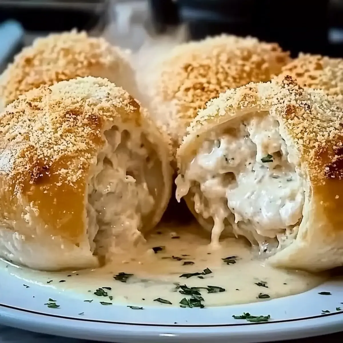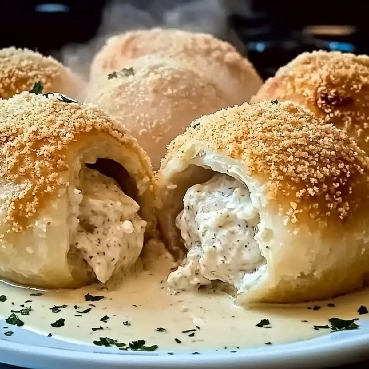 Jump to Recipe Print RecipeThe sizzling sound of butter in a hot pan is more than just noise; it’s a siren call to all food lovers! As I prepared to craft my Chicken Pillows in Creamy Parmesan, the anticipation was palpable. These delightful pockets of flaky crescent dough, cradling a savory chicken and cream cheese filling, promise to transform any meal into a comforting feast. What I adore about this recipe is its incredible versatility—whether you’re craving a quick weeknight dinner or a gourmet dish to impress guests, it’s effortlessly adaptable. Plus, with options like Low-Carb and Dairy-Free variations, there’s a delicious alternative for everyone at the table. Are you ready to fill your home with the warmth and aroma of these irresistible Chicken Pillows? Why are Chicken Pillows a Game-Changer? Unmatched Versatility: This recipe shines with its ability to cater to various dietary preferences. Enjoy a classic version, or swap in mushrooms for a hearty take, or try the delightful Spinach & Cheese option for a nutrient boost. Quick and Easy: In just under 30 minutes, you can serve up a dish that feels gourmet, making it perfect for busy weeknights when time is short. Crowd-Pleasing Flavor: The savory chicken and creamy Parmesan combine for a satisfying bite that leaves everyone asking for seconds. Comfort Food Done Right: There’s nothing quite like biting into a warm, flaky pocket filled with creamy goodness to transport you back to your childhood meals. Meal Prep Friendly: Make a batch and freeze for a hassle-free dinner later; just bake straight from the freezer! Pair with a light salad for a fresh contrast, or serve alongside Garlic Parmesan Chicken for extra indulgence. Chicken Pillows in Creamy Parmesan Ingredients • The essential elements for your creamy creation! For the Filling Shredded Chicken – Provides the main protein and flavor; use rotisserie chicken for a convenient shortcut. Cream Cheese – Adds creaminess and richness; ensure it’s softened for better mixing. Green Onions – Introduces fresh flavor and crunch; chives can be substituted for a milder taste. For the Dough Crescent Roll Dough – Forms the outer layer for a flaky texture; puff pastry is a great alternative but may require adjusted baking time. Breadcrumbs – Adds a delightful crunch; using seasoned breadcrumbs enhances flavor. For the Creamy Sauce Butter – Enhances flavor and aids in browning; olive oil can be used for a lighter option. Flour – Thickens the creamy sauce; corn starch works for a gluten-free version. Chicken Broth – Provides depth to the sauce; vegetable broth is a great substitute for a vegetarian option. Half-and-Half – Contributes creaminess to the sauce; coconut cream is an excellent dairy-free alternative. Parmesan Cheese – Offers a distinct flavor; freshly grated Parmesan takes it to the next level. Garlic Powder, Salt, Pepper – Essential seasonings that elevate the overall flavor of the dish. With this collection of ingredients, you’re all set to create your Chicken Pillows in Creamy Parmesan—a truly delightful comfort food that will have everyone savoring every bite! Step‑by‑Step Instructions for Chicken Pillows in Creamy Parmesan Step 1: Preheat the Oven Begin by preheating your oven to 375°F (190°C) and line a baking sheet with parchment paper. This step ensures that your Chicken Pillows cook evenly and develop a lovely golden color. The anticipation builds as your oven heats up, filling your home with warmth. Step 2: Mix the Filling In a medium-sized bowl, combine shredded chicken, softened cream cheese, chopped green onions, salt, and pepper. Use a fork to mix everything together until it’s well-blended and creamy. This savory filling is the heart of your Chicken Pillows, so take a moment to get it just right. Step 3: Prepare the Dough Unroll the crescent roll dough onto a clean surface and separate it into individual triangles. Work swiftly to avoid letting the dough get too warm, as you want it to be easy to handle. Each triangle will envelop the delicious filling, creating those perfect Chicken Pillows in Creamy Parmesan. Step 4: Assemble the Pillows Spoon about 2 tablespoons of the filling onto the wide end of each dough triangle. Gently fold the dough over the filling and pinch the edges tightly to seal them, ensuring no filling escapes during baking. The pillows should have a lovely, snug shape that promises deliciousness inside. Step 5: Butter and Bread Melt some butter in the microwave and brush it generously over the tops of each Chicken Pillow. Then, sprinkle seasoned breadcrumbs on top, ensuring they are well-coated to add a delightful crunch. This step enhances the texture and flavor of your Chicken Pillows and adds that appealing finish. Step 6: Bake Place the assembled Chicken Pillows on your prepared baking sheet, making sure they are spaced apart for even baking. Slide them into the preheated oven and bake for 20-25 minutes, or until they turn a beautiful golden brown. The enticing aroma filling your kitchen will tell you they are almost ready. Step 7: Make the Sauce While the Chicken Pillows are baking, prepare the creamy Parmesan sauce. In a saucepan, melt 2 tablespoons of butter over medium heat. Whisk in an equal amount of flour until smooth, then gradually add chicken broth and half-and-half, stirring continuously until the mixture thickens. This creamy sauce will elevate your Chicken Pillows to new heights. Step 8: Serve Once your Chicken Pillows are baked to perfection, let them cool for a few minutes. Drizzle the creamy Parmesan sauce generously over the top before serving. Gather your loved ones around the table to enjoy this delectable meal together, and savor each bite of your wonderful Chicken Pillows in Creamy Parmesan. How to Store and Freeze Chicken Pillows Refrigerator: Store leftover Chicken Pillows in an airtight container for up to 4 days. Make sure they have cooled completely before sealing to maint