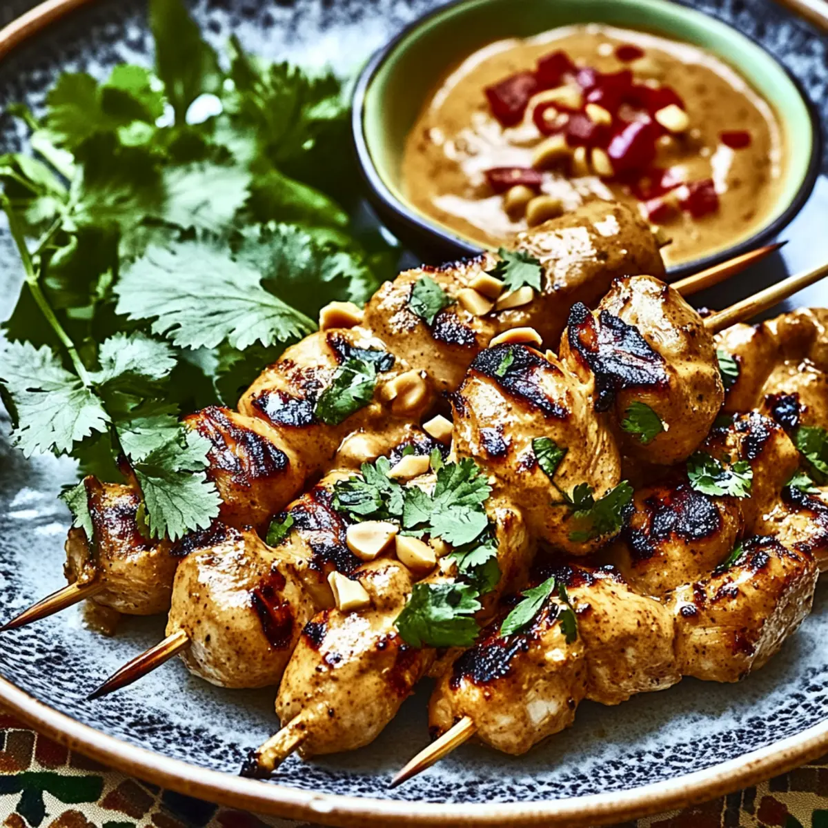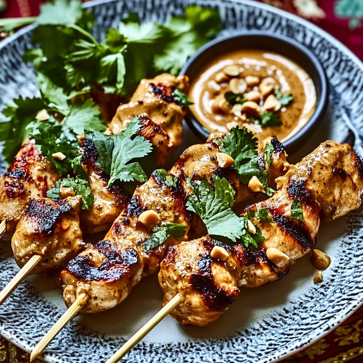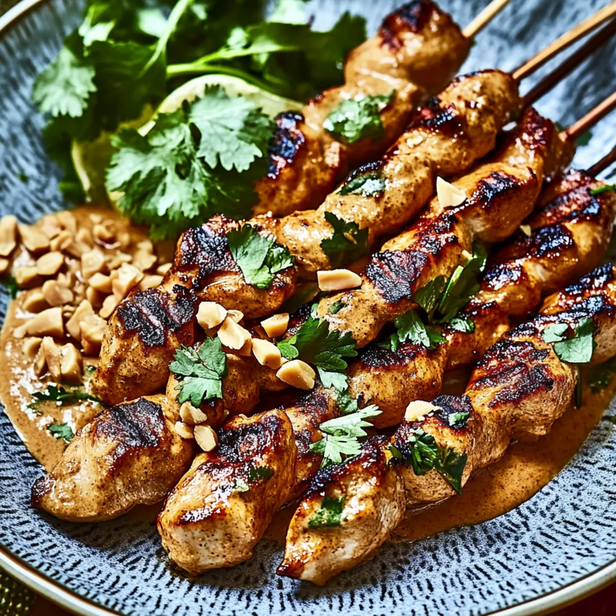 Jump to Recipe Print RecipeAs the grill heats up, the tantalizing aroma of marinated chicken begins to fill the air, making your mouth water in anticipation. Today, I’m excited to share my recipe for Indonesian Chicken Satay with Peanut Sauce, a dish that’s not only a feast for the senses but also an absolute crowd-pleaser. With just a few simple ingredients, these tender chicken skewers transform into a flavorful experience perfect for weekend barbecues or weeknight meals. The best part? This recipe boasts a quick prep time and can easily become a family favorite, leaving fast food well behind. Ready to impress your taste buds and your loved ones? Let’s dive into a world of smoky, savory goodness! Why You’ll Adore This Chicken Satay? Aromatic Marinade: The flavorful blend of soy sauce, coconut milk, and fresh lime juice seeps into the chicken, creating juicy skewers that burst with taste. Quick Prep Time: With minimal effort, you can have these ready to grill in no time, making it a fantastic option for busy weekdays or last-minute gatherings. Versatile Dish: Looking to switch it up? Substitute chicken with tofu or shrimp, or even toss in some grilled veggies for a nutritious boost. Crowd-Pleasing Treat: Whether it’s a backyard barbecue or a cozy family dinner, this delectable Chicken Satay with Peanut Sauce is sure to impress everyone at the table. Rich, Creamy Sauce: Drizzle your skewers with our luscious peanut sauce for a deliciously nutty finish that complements the charred flavor beautifully. Chicken Satay with Peanut Sauce Ingredients • Here’s what you’ll need to create this mouthwatering Chicken Satay with Peanut Sauce. For the Chicken Marinade Boneless, Skinless Chicken Breasts – A tender protein that soaks up flavors beautifully; adjust the quantity based on the number of servings. Fresh Garlic – Adds aromatic depth to the marinade; opt for firm cloves for optimal flavor. Low-Sodium Soy Sauce – Lends savory umami richness; choosing low-sodium helps maintain a healthy balance. Coconut Milk – Perfectly enhances flavor while tenderizing the chicken; use canned coconut milk for the richest taste. Brown Sugar – Introduces a touch of sweetness that beautifully balances the savory elements. Fresh Lime Juice – Brightens and elevates the dish with its zesty freshness; always use freshly squeezed for the best flavor. For the Peanut Sauce Peanut Butter – The star ingredient of the creamy sauce; smooth or crunchy can be used based on your texture preference. Coconut Milk (for sauce) – Ensures the sauce remains silky and velvety; essential for that perfect creamy consistency. Sriracha Sauce – Adds customizable heat to the sauce; adjust according to your spice preference for the ultimate flavor depth. Get ready to enjoy a delicious journey with these ingredients that bring the essence of Indonesia right to your kitchen! Step‑by‑Step Instructions for Irresistible Indonesian Chicken Satay with Creamy Peanut Sauce Step 1: Marinate the Chicken In a large mixing bowl, combine boneless, skinless chicken breasts with low-sodium soy sauce, coconut milk, minced garlic, freshly squeezed lime juice, brown sugar, and a sprinkle of pepper. Toss the chicken pieces to coat well in the marinade, ensuring they are fully submerged. Cover the bowl and refrigerate it for at least 1 hour, allowing the flavors to infuse deeply into the chicken for maximum taste. Step 2: Prepare Skewers While the chicken marinates, prepare your skewers. If you’re using wooden skewers, soak them in water for about 30 minutes to prevent burning during grilling. This step is critical for a successful grilling experience with your chicken satay. Once soaked, set the skewers aside, ready for threading with the marinated chicken. Step 3: Thread Chicken onto Skewers After marinating, remove the chicken from the refrigerator. Take each piece and thread it evenly onto the soaked skewers, making sure to leave a little space between pieces for even cooking. You should use about 4-5 pieces of chicken per skewer. This step is vital for ensuring that your chicken satay cooks uniformly on the grill. Step 4: Grill the Skewers Preheat your grill to medium-high heat, aiming for around 400°F (200°C). Once heated, place the chicken skewers on the grill, cooking for 5-7 minutes on each side. Watch for grill marks and the chicken to become charred, indicating they are nearly done. Ensure that the internal temperature of the chicken reaches 165°F (74°C) for optimal doneness and safety. Step 5: Make Peanut Sauce As the chicken cooks, prepare the creamy peanut sauce. In a medium bowl, mix together creamy or crunchy peanut butter with canned coconut milk until smooth and well-combined. Add Sriracha sauce according to your taste preference—start with a teaspoon and adjust for heat. The sauce should be rich and thick, perfect for drizzling over your chicken satay. Step 6: Serve with a Drizzle Once the chicken skewers are grilled to perfection, remove them from the heat and let them rest for a couple of minutes. Serve the skewers on a platter, generously drizzling the creamy peanut sauce over the top. Garnish with chopped peanuts or fresh cilantro for an added touch of flavor and color, enhancing the delightful presentation of your chicken satay. Make Ahead Options These Indonesian Chicken Satay with Peanut Sauce are ideal for meal prep, saving you precious time on busy weeknights! You can marinate the chicken up to 24 hours in advance, ensuring every bite is bursting with flavor. Simply combine the chicken with soy sauce, coconut milk, garlic, lime juice, brown sugar, and pepper, then refrigerate in an airtight container. The peanut sauce can also be prepared ahead of time—store it in the refrigerator for up to 3 days; just give it a quick stir and warm it slightly before serving. When you’re ready to feast, thread the marinated chicken onto skewers, grill them as instructed, and enjoy a delicious meal with 