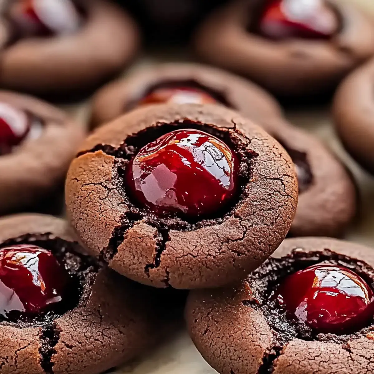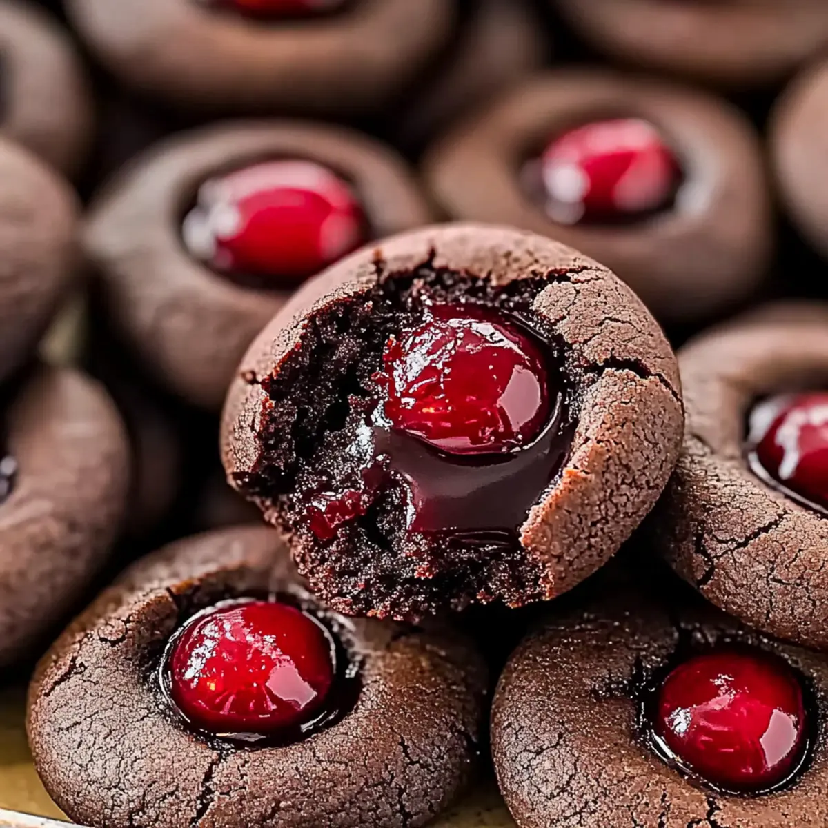 Jump to Recipe Print RecipeThe unmistakable aroma of warm chocolate reminds me of cozy evenings spent in the kitchen, whipping up delicious treats. Enter the Fudgy Chocolate Cherry Cookies, a delightful fusion of rich cocoa and bright cherry preserves that promise a mouthwatering experience in every bite. This recipe is a game-changer, crafted effortlessly in under 30 minutes (excluding chilling time) and packed with versatility that makes it perfect for any occasion, whether it’s Valentine’s Day or just a cozy night in. Not only do these cookies melt in your mouth with their fudgy texture, but they are also customizable with vegan options, allowing everyone to join in on the bliss. Ready to uncover the secret to the perfect cookie? Let’s dive in! Why Are These Chocolate Cherry Cookies Irresistible? Decadent Experience: Each bite of these cookies delivers a rich chocolate flavor fused with a burst of sweet cherry preserves, creating a taste sensation that is simply unforgettable. Quick to Make: With less than 30 minutes of hands-on time, you’ll have fresh, warm cookies ready to impress family and friends in no time! Versatility at Its Finest: Enjoy these as-is, or explore exciting variations—try a Vegan Swap or even add a pinch of spice for a kick! Gourmet Touch: The velvety ganache center elevates these cookies to gourmet status, making them perfect for any occasion or just because you deserve a treat. Crowd-Pleasing Appeal: From parties to cozy nights in, these cookies are sure to win hearts, whether served with vanilla ice cream or fresh berries for a delightful contrast! Chocolate Cherry Cookies Ingredients • Dive into the sweetness of these delightful treats with the essential components below! For the Cookie Dough All-Purpose Flour – Provides structure; swap with gluten-free flour for a gluten-free version. Dutch-Process Cocoa Powder – Adds a deep chocolate flavor; regular cocoa can be substituted without losing richness. Baking Powder – Helps cookies rise for that perfect texture; if you’re in a pinch, baking soda will work too. Sea Salt – Enhances flavor; regular table salt can easily take its place. Unsalted Butter – Brings richness and moisture; opt for dairy-free butter for a vegan alternative. Light Brown Sugar – Contributes sweetness and texture; granulated sugar works as a substitution. Granulated Sugar – Offers sweetness and lightness; coconut sugar is another fantastic alternative. Egg Yolks – Imparts a lush richness; omit for a vegan version or replace with flax eggs. Vanilla Extract – Elevates flavors; for a twist, almond extract adds a unique profile. For the Ganache Filling Chopped Dark Chocolate – Forms the heavenly ganache center; feel free to switch to white or milk chocolate for a different experience. Heavy Cream – Creates a silky ganache; use coconut cream for a dairy-free delight. Cherry Preserves – Adds fruity sweetness and a vibrant flavor; any berry jam can be used in its place. This delectable combination of ingredients is what makes these Chocolate Cherry Cookies irresistible. Enjoy baking! Step‑by‑Step Instructions for Chocolate Cherry Cookies Step 1: Prepare Dry Ingredients In a medium bowl, whisk together 1 ½ cups of all-purpose flour, ½ cup of Dutch-process cocoa powder, ½ teaspoon of baking powder, and a pinch of sea salt. Ensure there are no lumps in the mixture for a smooth cookie texture. Set this dry mixture aside while you work on the wet components. Step 2: Cream Butter and Sugars In a large mixing bowl, add ½ cup of softened unsalted butter along with ½ cup of light brown sugar and ½ cup of granulated sugar. Using a hand mixer, beat these ingredients on medium speed for about 2-3 minutes until the mixture is light and fluffy. This is crucial for the fudgy texture of your Chocolate Cherry Cookies. Step 3: Add Eggs and Vanilla Now, introduce 2 large egg yolks and 1 teaspoon of vanilla extract to the butter and sugar mixture. Mix on low speed until everything is smoothly combined, taking care not to overmix. The mixture should be creamy and fragrant, preparing a luscious base for your cookies. Step 4: Combine Mixtures Gradually add the dry ingredient mixture to the wet ingredients, mixing gently on low speed until just combined. You want to see a soft dough forming; be cautious not to overwork the dough to keep the fudge-like consistency of your Chocolate Cherry Cookies intact. Step 5: Shape Cookies With your hands, portion the dough into 32 evenly sized balls, about 1 inch in diameter. Then, use a measuring spoon to make a small indent in the center of each ball. Place them on a baking sheet lined with parchment paper and chill in the refrigerator for 1 hour to help maintain their shape while baking. Step 6: Bake Preheat your oven to 350°F (175°C). Once preheated, bake the chilled cookie dough for 9-11 minutes until the edges look set, and the centers are still soft. If the indent has closed up, gently reshape it with the measuring spoon halfway through baking. This step is key for the fudgy factor. Step 7: Cool and Prepare Ganache While the cookies are baking, chop 4 ounces of dark chocolate and place it in a heatproof bowl. In a small saucepan, heat ½ cup of heavy cream over medium heat until just simmering, then pour it over the chocolate. Let it sit for 2 minutes before stirring until smooth. Finally, mix in ¼ cup of cherry preserves for a sweet burst. Step 8: Fill Cookies Allow the baked cookies to cool on the baking sheet for 5 minutes before transferring them to a wire rack. Once completely cool, use a spoon to fill the indented centers with the cherry chocolate ganache. Place the cookies in the refrigerator for 10-15 minutes to set the ganache for a rich, decadent finish. Chocolate Cherry Cookies Variations Feel free to personalize your Chocolate Cherry Cookies to delight your taste buds even more with these fun twists! Vegan Option: Substitute dairy-free butter and use flax eggs or appl