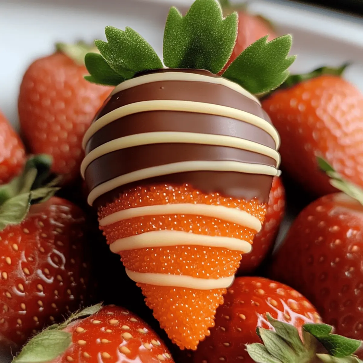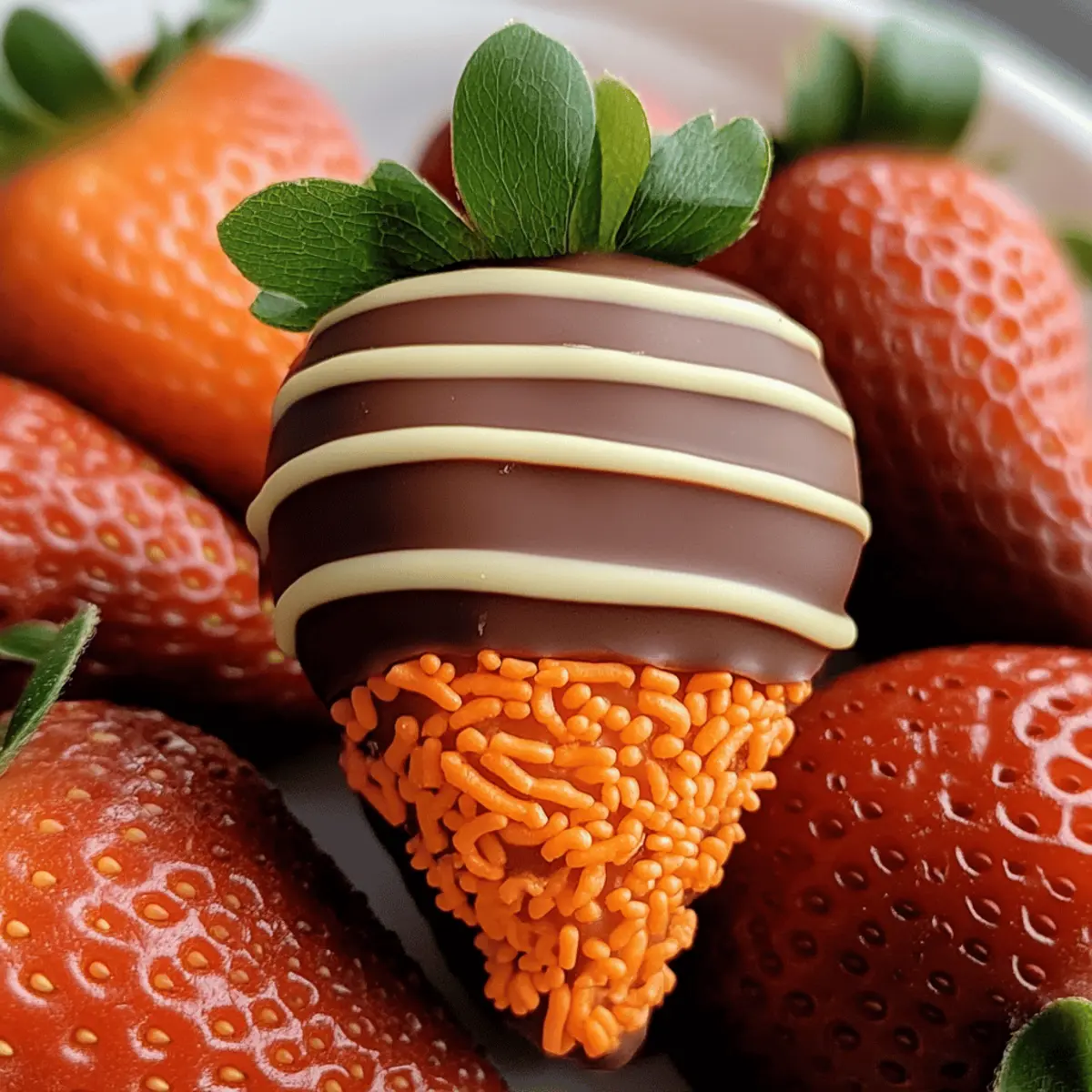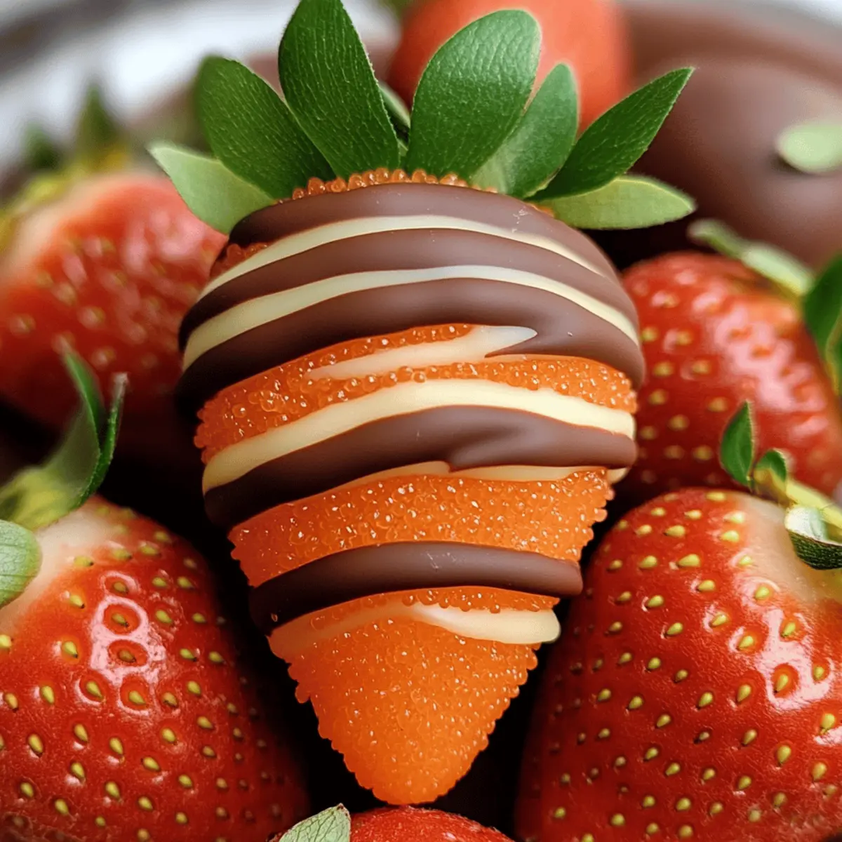 Jump to Recipe Print RecipeSpring is here, and with it comes a canvas of vibrant colors that inspire creativity in the kitchen! It was during one charming afternoon that I stumbled upon the idea of making Chocolate Strawberry Carrots—a dessert that delights not only the taste buds but the eyes as well. These whimsical treats combine juicy strawberries with a rich chocolate shell, making them a fun dessert perfect for Easter celebrations or just brightening up any day. The best part? They’re incredibly simple to prepare and customizable, inviting you to play around with flavors and decor. Picture them as cheerful additions to your dessert table, each bite a celebration of spring! So, what unique twist will you add to this delightful recipe? Why Are Chocolate Strawberry Carrots So Irresistible? Fun and Creative: These playful treats spark joy in both kids and adults, making dessert time feel like a celebration. Easy to Make: With just a few steps, you can whip up a batch in no time, perfect for busy cooks! Customizable Options: Get creative by swapping strawberries for other fruits or changing the chocolate type to match any occasion. Visually Stunning: The vibrant orange sprinkles and green candy tops create an eye-catching display that’s perfect for spring gatherings or Easter. Delightful Textures: Enjoy the perfect contrast of juicy strawberries and creamy chocolate that makes each bite a treat to remember. Why not pair them with a delicious Moist Strawberry Shortcake for a stunning dessert spread? Chocolate Strawberry Carrots Ingredients For the Strawberries Strawberries – Fresh, ripe strawberries provide the sweet base for these delightful Chocolate Strawberry Carrots. For the Chocolate Coating Chocolate – Use high-quality dark or milk chocolate for a rich and smooth coating that elevates the flavor. For the Decoration Orange Sprinkles (optional) – These sprinkles mimic carrot texture; you can substitute with edible glitter or colored sugar for a fun twist. Green Candy (optional) – Gummy candies or fondant help to create the leafy tops of the carrots, adding an extra playful touch. Indulge in these whimsical Chocolate Strawberry Carrots and bring a burst of spring color to your dessert table! Step‑by‑Step Instructions for Chocolate Strawberry Carrots Step 1: Prep Strawberries Begin by washing your fresh strawberries under cold water, ensuring they are clean from any residues. Gently pat them dry with a paper towel, taking care not to remove the stems, which enhance the carrot-like appearance. This step is vital for achieving a perfect coverage when you dip them in chocolate, as moisture can cause the chocolate to slide off. Step 2: Melt Chocolate In a microwave-safe bowl or a double boiler, place your high-quality dark or milk chocolate. Heat the chocolate in 30-second intervals in the microwave, stirring vigorously between each session, until it is completely smooth and glossy, which usually takes about 1-2 minutes. For the double boiler method, stir continuously until melted. Careful not to burn the chocolate to ensure the best flavor for your Chocolate Strawberry Carrots. Step 3: Coat Strawberries Once your chocolate is melted and smooth, it’s time to dip the strawberries. Holding the stem, dunk each strawberry into the warm chocolate, allowing it to coat completely. Let the excess chocolate drip off back into the bowl, creating a beautifully covered treat. It’s essential to work quickly, as the chocolate begins to set as it cools. Step 4: Apply Sprinkles Immediately after dipping each strawberry, sprinkle orange sugar or colored sprinkles over the chocolate while it’s still wet. This quick action will ensure that the sprinkles adhere properly, mimicking the texture of a carrot. The vibrant decor adds a playful pop to your Chocolate Strawberry Carrots, making them visually appealing for any festive occasion. Step 5: Add Green To complete the carrot look, gently press green candies or fondant onto the tops of the chocolate-covered strawberries. This final touch helps to represent the leafy tops, granting each of your Chocolate Strawberry Carrots that fun, whimsical character. Be sure to do this while the chocolate is still slightly warm for better adhesion. Step 6: Set and Cool Carefully place each decorated strawberry on a parchment-lined baking sheet, ensuring they’re spaced apart to avoid sticking together. Allow the Chocolate Strawberry Carrots to set completely at room temperature for about 30 minutes or speed up the process by placing them in the refrigerator for about 15 minutes. Once set, they are ready to be enjoyed or beautifully displayed at your next gathering. What to Serve with Chocolate Strawberry Carrots? Spring is the perfect time for delightful desserts, and pairing your Chocolate Strawberry Carrots with just the right accompaniments can elevate your treat into a memorable feast. Creamy Vanilla Ice Cream: The cool creaminess of vanilla ice cream perfectly balances the rich chocolate, creating a delectable combination of flavors. Fluffy Coconut Whipped Cream: Light and airy coconut whipped cream adds a tropical twist that complements the fruitiness of the strawberries. Zesty Lemon Shortbread Cookies: The tangy lemon flavor in these cookies brightens the taste of the chocolate, providing a refreshing contrast to the sweetness. Tart Citrus Salad: A citrus salad featuring oranges and grapefruits offers a bright, refreshing palate cleanser that enhances the spring theme. Minted Chocolate Milkshake: This indulgent drink mixes chocolate and minty freshness, creating a playful pairing that echoes the flavors in your chocolate-covered treats. Fresh Fruit Platter: A colorful assortment of seasonal fruits, like kiwi, pineapple, and blueberries, adds a burst of freshness, balancing the sweetness of the Chocolate Strawberry Carrots. Herbal Iced Tea: Light and refreshing herbal iced tea, such as chamomile or mint, provides a soothing counterpoint to the