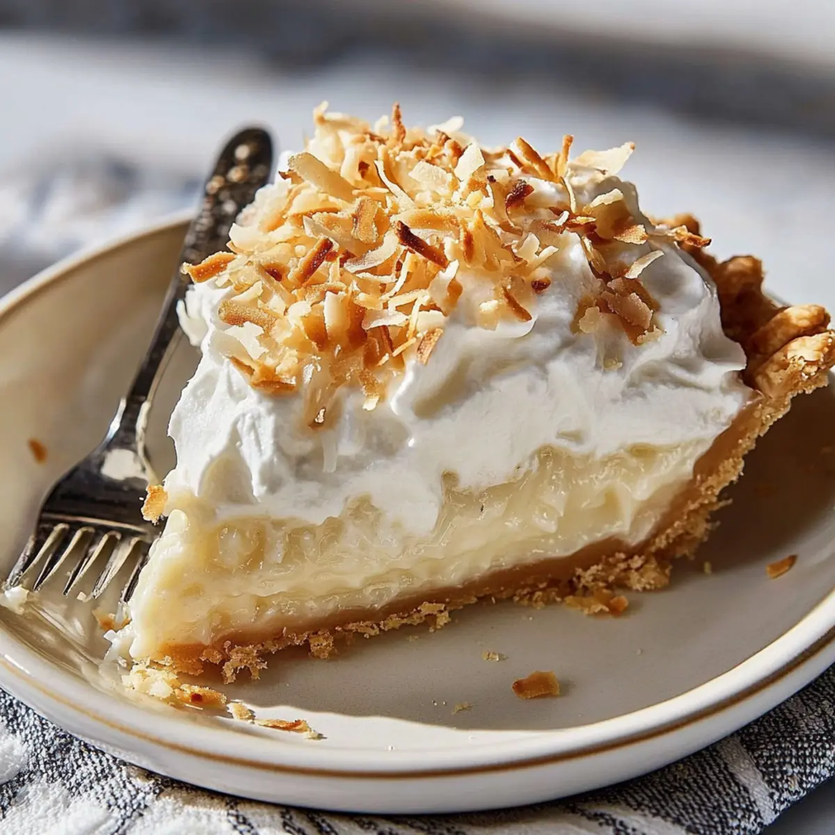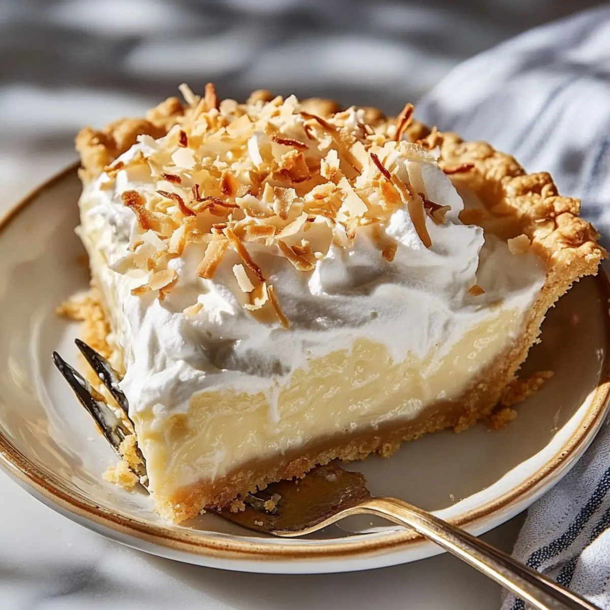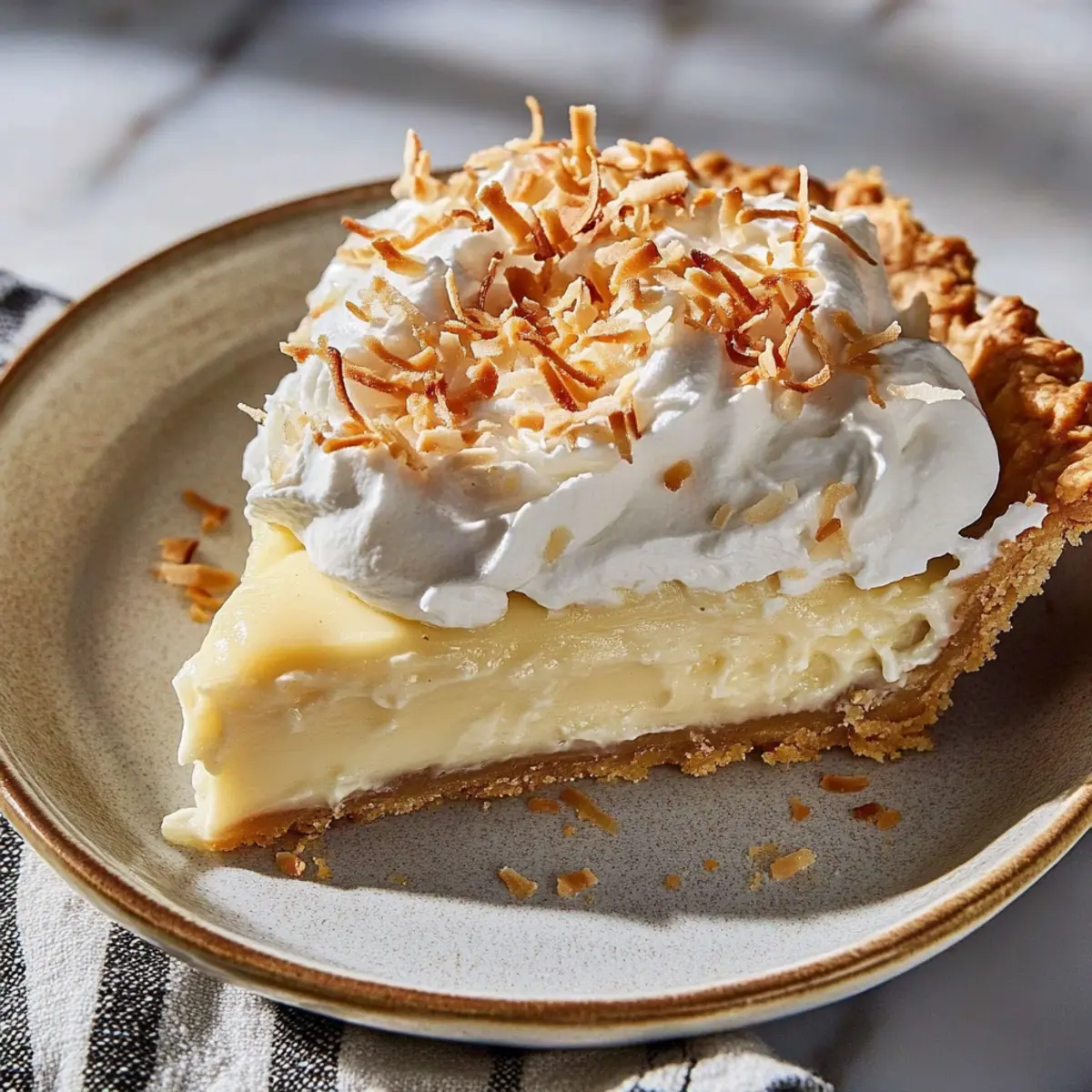 Jump to Recipe Print RecipeAs I whisked the mixture on the stove, the sweet aroma of coconut filled the air, instantly transporting me to a sun-soaked beach with the soothing sound of waves crashing nearby. This Classic Coconut Cream Pie has a knack for whisking away your worries, presenting a silky, lush coconut custard nestled within a flakey crust. Not only is it a visually stunning centerpiece for any gathering, but it’s also refreshingly easy to whip up, making it perfect for both novice cooks and seasoned chefs alike. With its make-ahead friendly nature and delightful creamy texture, this tropical dessert ensures your next brunch or family dinner will be both memorable and satisfying. Are you ready to dive into a slice of paradise? Why is this Coconut Cream Pie a Must-Try? Irresistible Creaminess: The rich, silky coconut custard delivers a mouthwatering texture that’s nothing short of heavenly. Endless Variations: Feeling adventurous? Easily transform this classic with options like a chocolate coconut pie or a zesty key lime twist, ensuring everyone finds their favorite flavor! Effortless Elegance: This pie doesn’t just taste great; it’s a stunning centerpiece that will wow your guests. Serve it chilled for an impressive finish to any meal, from casual brunches to elegant dinner parties. Make-Ahead Friendly: Prepare this dish in advance, making it a stress-free dessert option for busy hosts. Just whip the cream before serving for a light, airy topping that seals the tropical experience! Coconut Cream Pie Ingredients • Essential ingredients for paradise in a pie! For the Crust 9-inch Pie Shell – A homemade crust adds the perfect buttery touch, but a store-bought option is convenient and works just fine. For the Custard Sweetened Shredded Coconut – This ingredient packs the intense coconut flavor that makes the Coconut Cream Pie irresistible; to enhance flavor, toast it before adding. Whole Milk – Essential for creating a rich, creamy custard; using low-fat wares may impact the texture. Heavy Cream – Adds richness to the custard; swapping it for coconut cream results in a delightful dairy-free alternative. Granulated Sugar – Sweetens the custard while also aiding in the thickening process. Cornstarch – A key thickening agent ensuring the custard achieves that luscious, smooth consistency. Salt – A pinch balances the sweetness and elevates flavor. Large Egg Yolks – The secret to a rich custard; they also help in thickening the mixture. Unsalted Butter – Adds a glossy finish and enhances richness; the perfect partner for coconut. Vanilla Extract – This enhances the flavor profile, beautifully complimenting the coconut. For the Topping Heavy Whipping Cream – Must contain at least 36% fat for optimal fluffiness in your whipped cream topping. Powdered Sugar – Lightly sweetens and stabilizes the whipped cream, making it a perfect contrast to the custard. Step‑by‑Step Instructions for Coconut Cream Pie Step 1: Prepare the Crust Begin by preheating your oven to 350°F (175°C). If you’re using a store-bought pie shell, place it directly on a baking sheet. For a homemade crust, roll it out and fit it into a 9-inch pie dish. To prevent a soggy bottom, line it with parchment paper and fill with pie weights or dried beans. Blind-bake for 15-18 minutes, or until the crust is golden brown. Remove from the oven and let cool completely. Step 2: Toast the Coconut While the crust is cooling, spread the sweetened shredded coconut evenly on a baking sheet. Place the sheet in your preheated oven and toast for about 5-7 minutes, stirring occasionally, until golden brown and fragrant. Keep a close eye on it to prevent burning. This step enriches the flavor of your Coconut Cream Pie and adds delightful texture to the filling. Step 3: Make the Custard In a medium saucepan, whisk together granulated sugar, cornstarch, and salt until well combined. Gradually add the whole milk and heavy cream, whisking continuously to avoid lumps. Heat over medium heat, stirring constantly, for about 5-7 minutes until the mixture thickens and bubbles gently. Remove from heat. In a separate bowl, temper the egg yolks by slowly whisking in some of the hot mixture, then whisk the egg yolk mixture back into the saucepan. Stir in the butter, vanilla extract, and most of the toasted coconut until well blended. Step 4: Chill the Custard Pour the creamy coconut custard into the cooled pie crust, smoothing the top with a spatula for an even finish. Cover it with plastic wrap to prevent a skin from forming and refrigerate for at least 4 hours, or until fully set. This chilling time is crucial for your Coconut Cream Pie to achieve that perfect sliceable consistency. Step 5: Prepare the Whipped Cream Once your custard is set, it’s time to whip the cream. In a mixing bowl, combine the heavy whipping cream and powdered sugar. Using an electric mixer, whip on medium-high speed until stiff peaks form, which should take about 3-5 minutes. Be careful not to overbeat, as this can lead to a grainy texture. Gently fold in a splash of vanilla extract for added flavor. Step 6: Garnish and Serve Using a spatula, evenly spread the whipped cream over the chilled custard layer, creating a lovely topping for your Coconut Cream Pie. To finish, sprinkle the reserved toasted coconut on top for a beautiful presentation. Slice and serve chilled, optionally garnishing with mint leaves or fresh berries for a delightful touch. What to Serve with Coconut Cream Pie The perfect Coconut Cream Pie deserves delightful companions to create a memorable meal experience. Tropical Fruit Salad: A colorful mix of fresh pineapple, mango, and kiwi enhances the tropical vibe, balancing the richness of the pie. The natural sweetness and juiciness of the fruits make it a refreshing contrast. Creamy Vanilla Ice Cream: The classic combination of coconut and creamy vanilla is irresistible. A scoop of vanilla ice cream alongside your pie adds