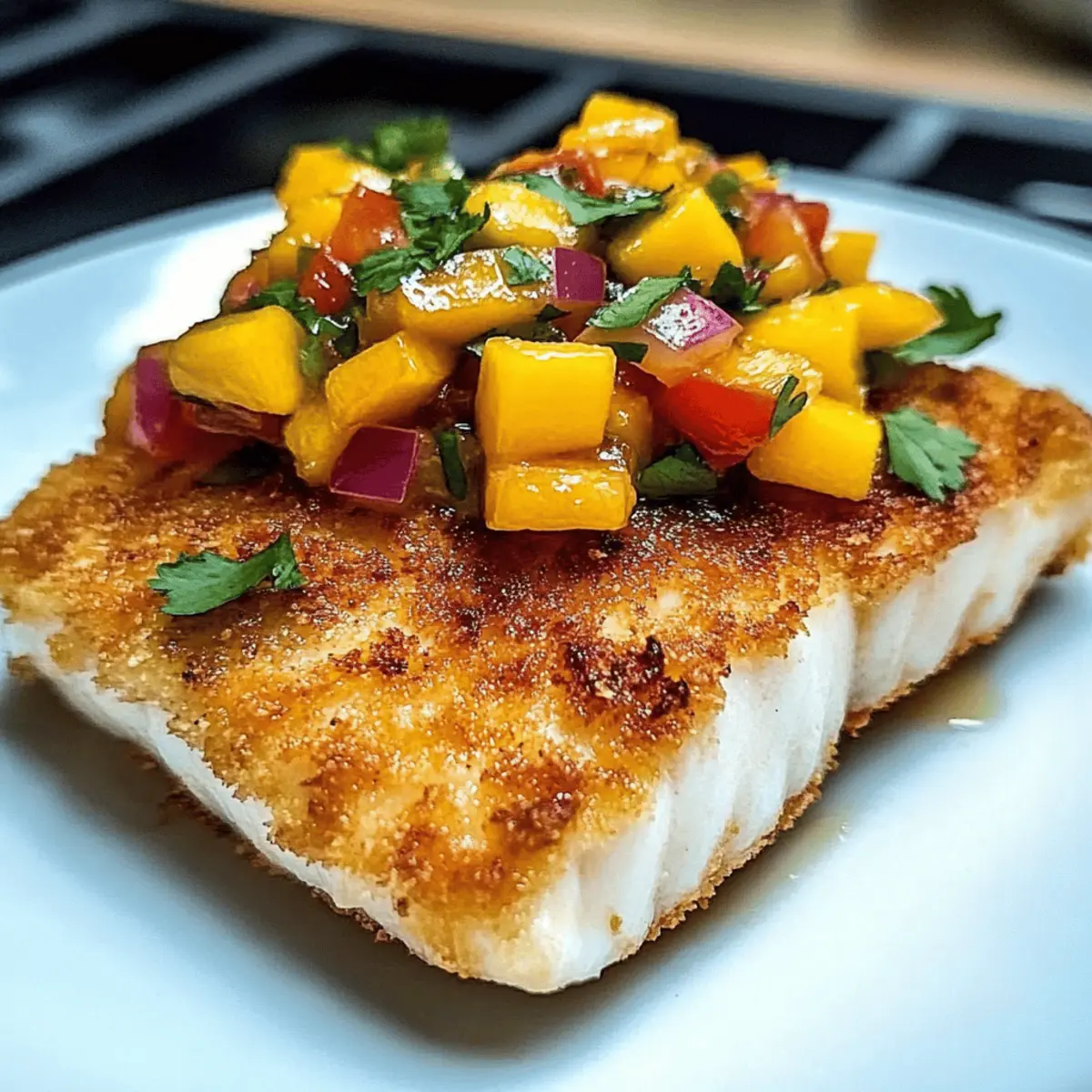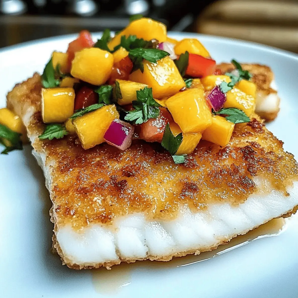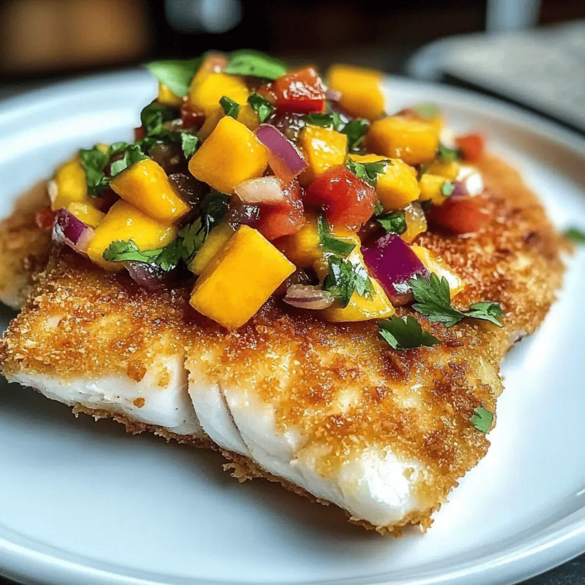 Jump to Recipe Print RecipeAs I stood in my kitchen, the sweet aroma of ripe mango mingling with the nutty scent of toasted coconut whisked me away to a sun-soaked beach. It’s hard to resist the tropical allure of Coconut Crusted Fish with Mango Salsa! This dish features flaky, tender fish encrusted in a crunchy coconut layer, topped with a fresh and zesty salsa that adds a burst of flavor. Not only is it a crowd-pleaser, but it’s also quick to whip up, ready in just 30 minutes – ideal for busy weeknights or casual get-togethers. With the option to choose different fish and salsa combinations, you can customize it to suit your taste and impress your guests. Are you ready to create a slice of paradise on your plate? Why is this recipe a tropical must-try? Elevated Taste: The stunning combination of crispy coconut and juicy fish makes each bite a tropical delight. Quick Preparation: Whip up this dish in just 30 minutes, perfect for busy weeknights or lazy weekends. Versatile Options: Use any fish you love—like salmon or cod—and switch up your salsa with ingredients like avocado or pineapple for unique flavor twists. Crowd-Pleasing: Serve this vibrant meal at gatherings or family dinners, and watch it disappear in no time! Pair it with some delicious Mango Muffins Passion for a tropical feast. Nutritional Boost: Packed with protein and healthy fats, this dish not only satisfies your taste buds but nourishes your body too. Coconut Crusted Fish with Mango Salsa Ingredients For the Fish Fish Fillets – Tilapia or cod provides a mild flavor that’s perfect for this dish, but feel free to explore salmon or snapper for a tasty twist. All-Purpose Flour – Dredging the fish prior to coating helps lock in moisture; substitute with gluten-free flour for a gluten-free option. Eggs – These act as a binder for the coconut crust; a flax egg works well for a vegan variant. For the Coconut Crust Shredded Coconut – Offers a crunchy tropical flavor; you can swap it out for panko breadcrumbs if you seek a different texture. Breadcrumbs – Adds extra crunch to the crust; use gluten-free breadcrumbs for a gluten-free dish. Salt – Essential for enhancing the flavor of your coconut crust; adjust based on your preference. Black Pepper – Freshly ground yields the best flavor; remember to taste as you go! Garlic Powder – For a hint of depth; consider using fresh minced garlic for an even bolder flavor. Paprika – Adds a touch of smokiness and vibrant color; switch to smoked paprika for added complexity. For the Mango Salsa Mango – The star of the salsa, choose ripe mangoes for the sweetest bite; you can add diced pineapple for a fun twist! Red Onion – Provides a crunchy texture and distinct flavor; green onions can be a milder alternative. Red Bell Pepper – Adds sweetness and color, but feel free to experiment with other bell pepper colors. Jalapeño – Packs a bit of heat; modify the amount to suit your spice tolerance. Lime – Brightens up the salsa and cuts through the richness of the fish; lemon is a perfect substitute if needed. Experience the joy of making this Coconut Crusted Fish with Mango Salsa, and let your culinary adventure begin! Step‑by‑Step Instructions for Coconut Crusted Fish with Mango Salsa Step 1: Prep Coatings Start by setting up your dredging station with three shallow dishes. In the first, combine shredded coconut, breadcrumbs, salt, black pepper, garlic powder, and paprika. In the second dish, beat the eggs until well mixed. Finally, place all-purpose flour in the third dish. Make sure everything is within easy reach for your Coconut Crusted Fish assembly. Step 2: Dredging Fish Take each fish fillet and first coat it evenly in flour, shaking off any excess. Next, dip the floured fillet into the beaten eggs, ensuring it’s fully covered. Finally, press the fish firmly into the coconut mixture, coating both sides well. This coating process will create that delightful crunchy texture for your Coconut Crusted Fish, making it irresistible. Step 3: Heat Oil In a large skillet, pour in enough oil to cover the bottom by about 1/4 inch and place it over medium heat. Allow the oil to heat until it shimmers, which usually takes about 5 minutes. To check if it’s ready, drop in a small piece of coating; if it sizzles immediately, the oil is perfect for frying your coconut crusted fish. Step 4: Fry Fish Carefully place the coated fish fillets in the hot oil, making sure not to overcrowd the skillet. Cook for 4-5 minutes on one side until golden brown and crispy. Gently flip the fillets and cook for another 4-5 minutes on the other side until they are cooked through and their internal temperature reaches 145°F. Transfer the cooked fish to a paper towel-lined plate to drain excess oil. Step 5: Prepare Salsa While the fish is frying, grab a mixing bowl and combine diced mango, red onion, red bell pepper, jalapeño, lime juice, and a pinch of salt. Toss everything together gently to blend the flavors, ensuring the salsa stays chunky and vibrant. The freshness of this mango salsa will perfectly complement your Coconut Crusted Fish, adding a tropical twist to every bite. Step 6: Serve Assemble your delicious meal by placing the crispy coconut crusted fish on plates, then generously top with the fresh mango salsa. Serve immediately to enjoy the contrast of warm, flaky fish with the cool, zesty salsa. This Coconut Crusted Fish with Mango Salsa is not only a feast for the eyes but also a delightful taste of the tropics at your dining table! How to Store and Freeze Coconut Crusted Fish with Mango Salsa Fridge: Store any leftover Coconut Crusted Fish in an airtight container for up to 2 days. Reheating in a skillet helps maintain its crispy texture. Freezer: For best quality, freeze cooked fish fillets in a single layer on a baking sheet, then transfer to a freezer bag for up to 2 months. Mango Salsa: Store in the fridge for up to 3 days; be aware that the texture may soften.