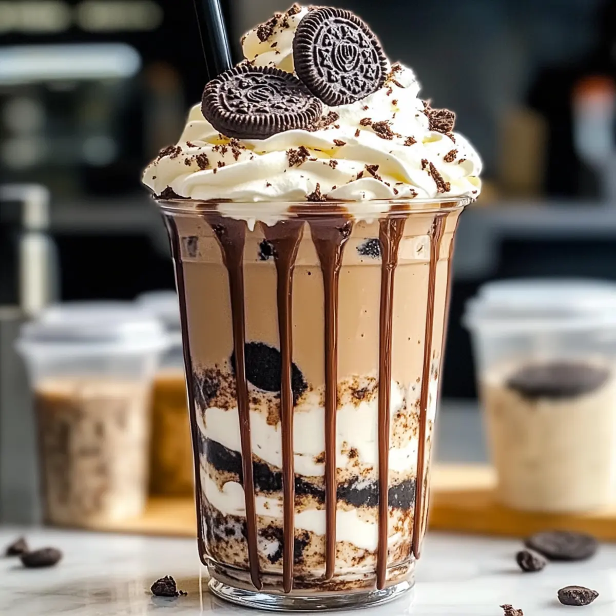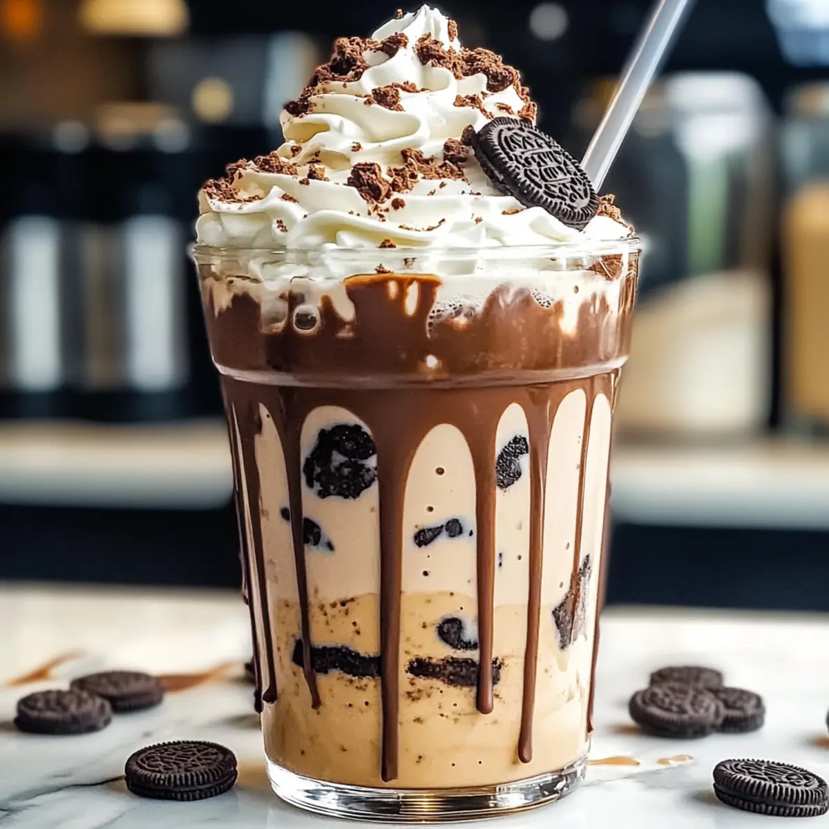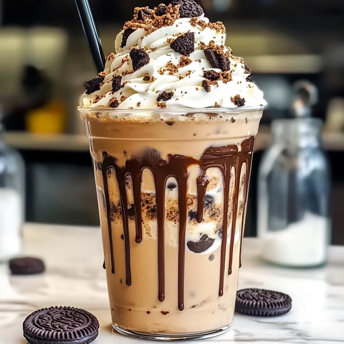 Jump to Recipe Print RecipeAs I stepped into a bustling café recently, the rich aroma of fresh coffee combined with the sweet scent of cookies instantly transported me back to childhood delights. That moment inspired me to recreate a beloved treat at home: the Cookies & Cream Frappuccino. This luscious drink marries the nostalgic crunch of Oreo cookies with a creamy, dreamy base, making it the perfect indulgent dessert drink for a warm afternoon or a cozy night in. What’s more, this recipe is quick to whip up, and you can easily customize it to suit your dietary preferences, including a delightful dairy-free version! Ready to discover how you can blend this café classic into your kitchen? Let’s jump into the delicious details! Why is this frappuccino a must-try? Indulgent flavor: The perfect blend of Oreo cookies and creamy texture creates a decadent treat that satisfies any sweet tooth. Quick preparation: With simple steps, you can have this café-style drink ready in minutes, perfect for busy days. Customizable ingredients: Easily swap in almond or oat milk for a delicious dairy-free option, or experiment with flavored syrups for a twist. Crowd pleaser: This Cookies & Cream Frappuccino is sure to impress friends and family during gatherings or cozy nights in—just like when you serve it alongside Chocolate Chip Cookies! Nostalgic treat: Enjoying this frappuccino will take you back to childhood, making it a delightful dessert drink to savor any time. Cookies & Cream Frappuccino Ingredients For the Base Ice Cubes – Adds thickness and chill to the frappuccino; more ice means a thicker texture to enjoy. Milk – Provides creaminess; whole milk is recommended, but almond or oat milk works beautifully for a dairy-free version. Sugar – Sweetens the drink; feel free to adjust to your liking for the perfect balance of sweetness. Vanilla Extract – Enhances the overall flavor; you can skip this if you prefer a less sweet drink. For the Flavor Oreo Cookies – The star of the drink; regular Oreos are classic, but be adventurous and try different flavors for variety! Chocolate Syrup – Adds sweetness and a beautiful visual; a thicker syrup is best for that luscious drizzle. For the Topping Whipped Cream – Adds richness and indulgence; consider using non-dairy whipped toppings for a vegan option. Additional Oreo Cookies – Crushed or whole for garnishing; they add texture and make the drink even more appealing. Have fun blending up this Cookies & Cream Frappuccino, and remember—you can always customize it to suit your taste buds! Step‑by‑Step Instructions for Cookies & Cream Frappuccino Step 1: Combine Ingredients In a blender, add 2 cups of ice cubes, 1 cup of milk (whole or dairy-free), 2 tablespoons of sugar, ½ teaspoon of vanilla extract, and 8 Oreo cookies. Ensure all the ingredients are well-distributed, as this will ensure a smooth and creamy Cookies & Cream Frappuccino. Step 2: Blend Blend on high for about 30-60 seconds, or until you achieve a smooth consistency. Pause midway to scrape down the sides if needed, which helps incorporate all the ingredients thoroughly. Your mixture should look thick and creamy, with small pieces of Oreo throughout for that delightful texture. Step 3: Prepare Glass Take a tall glass and drizzle chocolate syrup along the inside walls. Tilt the glass while pouring the syrup to create a beautiful swirl effect that adds an appealing presentation to your Cookies & Cream Frappuccino. Aim for an even coating as it enhances both the look and flavor. Step 4: Pour & Serve Once your blend is smooth and creamy, carefully pour the frappuccino mixture into your prepared glass. Watch as it fills up, creating layers of luscious cookie and cream goodness. Make sure to leave some space at the top for garnishing, allowing for an indulgent finish. Step 5: Garnish Top your Cookies & Cream Frappuccino with a generous dollop of whipped cream. For an extra touch, sprinkle crushed or whole Oreo cookies on top. This not only adds visual appeal but also enhances the classic cookie flavor, making your drink irresistibly tempting. Make Ahead Options These Cookies & Cream Frappuccino ingredients are perfect for meal prep enthusiasts looking to save time! You can combine the ice, milk, sugar, vanilla extract, and Oreo cookies in your blender and store the mixture in the refrigerator for up to 24 hours. To maintain the creamy texture, make sure to blend it again right before serving, adding a few extra ice cubes if needed. The chocolate syrup can also be prepped by drizzling it in the glasses ahead of time, keeping them ready for a refreshing treat. This way, when you’re ready to enjoy your frappuccino, all it takes is a quick blend and a garnish of whipped cream for delightful café-style results! Expert Tips for the Best Cookies & Cream Frappuccino Blend Thoroughly: Ensure all ingredients are well-blended, pausing to scrape down the sides if needed. This prevents chunkiness and gives you that smooth Cookies & Cream Frappuccino texture. Adjust Sweetness: Taste your frappuccino before serving. You can always add more sugar if you prefer a sweeter experience—just remember to blend again! Thicker Texture: For a richer, thicker frappuccino, consider using less milk or adding extra ice. It will enhance the creamy, indulgent feel without sacrificing flavor. Experiment with Flavors: Don’t hesitate to customize! Adding flavored syrups like hazelnut or even trying different Oreo flavors can elevate your drink to new heights. Garnishing Delight: Top your frappuccino with whipped cream and extra crushed Oreo cookies for both taste and presentation. It makes for a stunning finish that’ll impress everyone! How to Store and Freeze Cookies & Cream Frappuccino Room Temperature: Best enjoyed fresh, but if necessary, allow to sit out for no more than 1 hour. After that, the texture will begin to deteriorate. Fridge: Store any leftover frappuccino in an airtight container for up