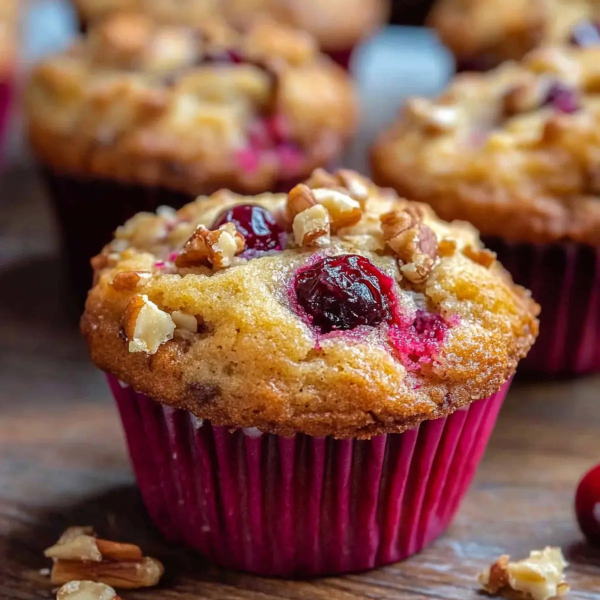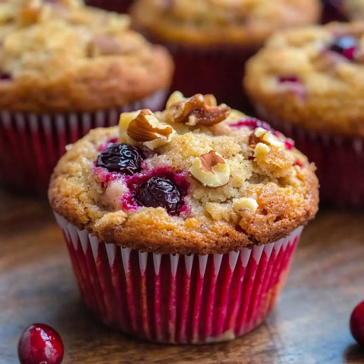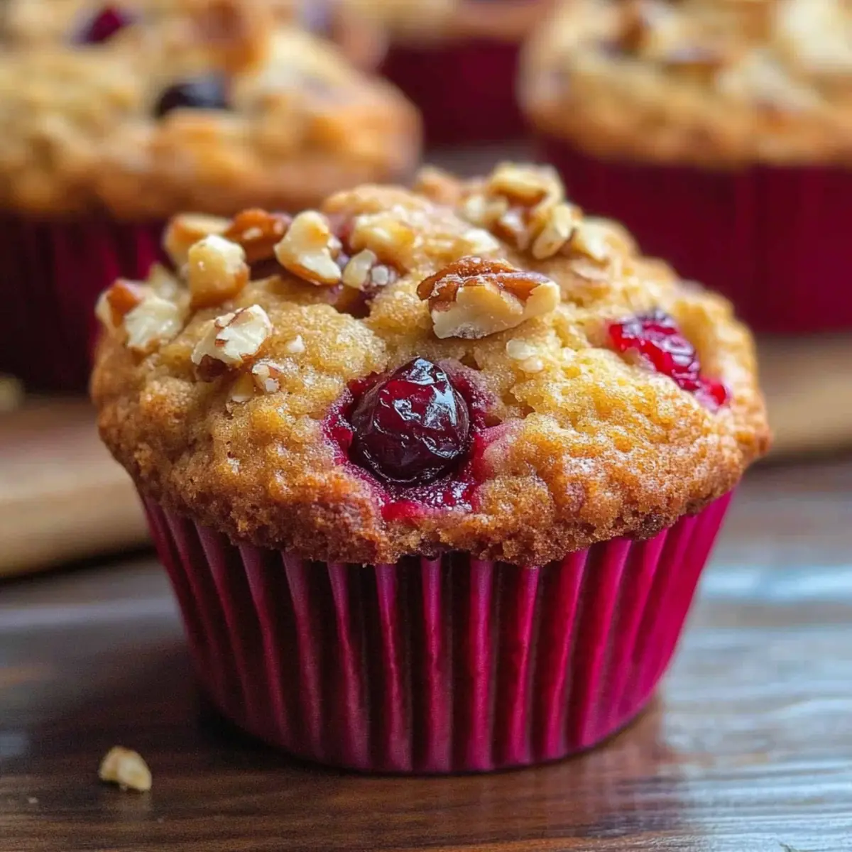 Jump to Recipe Print RecipeAs the brisk autumn air begins to weave its way through our kitchens, there’s nothing quite like the aroma of freshly baked treats to warm the soul. Today, I’m excited to share my recipe for Cranberry Muffins with Walnuts and Oats, a perfect harmony of sweetness and tartness that embodies the cozy season. These delightful muffins are not only a treat for the taste buds but also incredibly easy to prepare, making them an ideal breakfast on-the-go or a thoughtful homemade gift. With the added benefit of being freezer-friendly, you can whip up a batch now and enjoy that warm, comforting feeling whenever the craving strikes. So, are you ready to bring a little warmth and joy into your kitchen? Why Choose Cranberry Muffins? Unique Flavor Combination: These Cranberry Muffins blend tart cranberries with crunchy walnuts and hearty oats for a deliciously unique treat. Quick and Easy: With a simple prep process, you can have a batch ready in no time. Perfect for busy mornings! Freezer Friendly: Make a large batch and freeze them for an easy snack or breakfast option whenever you need it. Health & Wholesome: Packed with oats and Greek yogurt, these muffins are a guilt-free delight, making them perfect for health-conscious individuals. Versatile Delight: Enjoy them fresh, or gift them during holidays as thoughtful homemade gifts. Pair them with a warm drink for a cozy vibe, just like the delightful Pumpkin Cream Muffins that offer a seasonal twist! Cranberry Muffins with Walnuts and Oats Ingredients For the Muffin Batter • All-purpose flour – Provides structure and texture; substitute with whole wheat flour for a denser muffin. • Salt – Enhances flavor; use fine sea salt for better distribution. • Baking powder – Acts as a leavening agent; ensure it’s fresh for maximum rise. • Baking soda – Helps with browning and rise; important to measure accurately. • Rolled oats – Adds chewiness and fiber; quick oats can be used in a pinch but may alter texture. • Egg – Binds ingredients and adds moisture; can substitute with a flax egg for a vegan option. • Granulated sugar – Sweetens the muffins; could reduce amount for a less sweet muffin. • Brown sugar – Adds moisture and a hint of caramel flavor; can replace with coconut sugar for a healthier option. • Greek yogurt – Adds moisture and tang; can swap with sour cream or buttermilk. • Vegetable oil – Provides fat for tenderness; melted coconut oil can be used as an alternative. • Frozen cranberries – Adds tartness and moisture; use fresh cranberries if preferred; dried cranberries can also work. For the Streusel Topping • Flour – Creates the crumbly texture; can replace with almond flour for gluten-free muffins. • Sugar – Sweetens the topping; brown sugar adds depth but can be swapped with granulated sugar. • Cinnamon – Infuses warmth and flavor; adjust to taste for a spicier kick. • Butter – Binds the topping together; coconut oil can be used for a dairy-free option. • Walnuts – Adds crunch and nuttiness; omit for a nut-free version or try pecans for a different flavor. Create these delightful Cranberry Muffins with Walnuts and Oats and experience the perfect blend of comfort and taste! Step‑by‑Step Instructions for Cranberry Muffins with Walnuts and Oats Step 1: Preheat Oven Begin by preheating your oven to 400°F (200°C) to ensure it’s perfectly hot for baking. While the oven warms up, line a muffin tin with paper liners to prevent sticking and make clean-up a breeze. This setup will get you ready for those delicious Cranberry Muffins with Walnuts and Oats. Step 2: Prepare Dry Ingredients In a mixing bowl, sift together all-purpose flour, salt, baking powder, and baking soda, whisking them to evenly combine. Next, stir in the rolled oats to add a wholesome texture to your muffins. Set this dry mixture aside, allowing the flavors to mingle while you prepare the wet ingredients. Step 3: Cream the Sugars and Egg In another bowl, cream one egg with granulated sugar and brown sugar until the mixture is light and fluffy, which should take about 2-3 minutes. This process adds air to the batter, ensuring your muffins rise beautifully. Scrape down the sides of the bowl to incorporate all the sugars for a consistent taste in your Cranberry Muffins. Step 4: Mix in Wet Ingredients Add Greek yogurt and vegetable oil to the sugar and egg mixture, stirring until fully blended. The yogurt adds moisture, while the oil contributes to the muffins’ tenderness. Make sure everything is combined smoothly, scraping down the bowl as needed to ensure no lumps remain, setting the stage for a wonderful batter. Step 5: Combine Wet and Dry Mixtures Gently fold the dry mixture into the wet ingredients until just combined, being careful not to overmix, which could make your muffins dense. You want a few flour streaks to remain. Next, carefully fold in the frozen cranberries, allowing their tartness to complement the sweetness of the batter beautifully. Step 6: Fill Muffin Cups Scoop the muffin batter into the prepared muffin cups, filling each about two-thirds full for a nice rise. As you fill the cups, the anticipation of those fragrant Cranberry Muffins with Walnuts and Oats will fill your kitchen. Wipe any batter spills around the edges for a neat finish before adding the streusel topping. Step 7: Make the Streusel Topping In a small bowl, prepare the streusel by mixing together flour, sugar, cinnamon, softened butter, and chopped walnuts. Use your fingers or a fork to combine until the mixture resembles coarse crumbs. This crunchy streusel will add a delightful texture to your muffins, making every bite even more irresistible. Step 8: Add Streusel and Bake Sprinkle the streusel topping generously over the muffin batter, ensuring an even distribution for that extra crunch. Place the muffin tin in the preheated oven and bake for 20 minutes or until a toothpick inserted into the cent