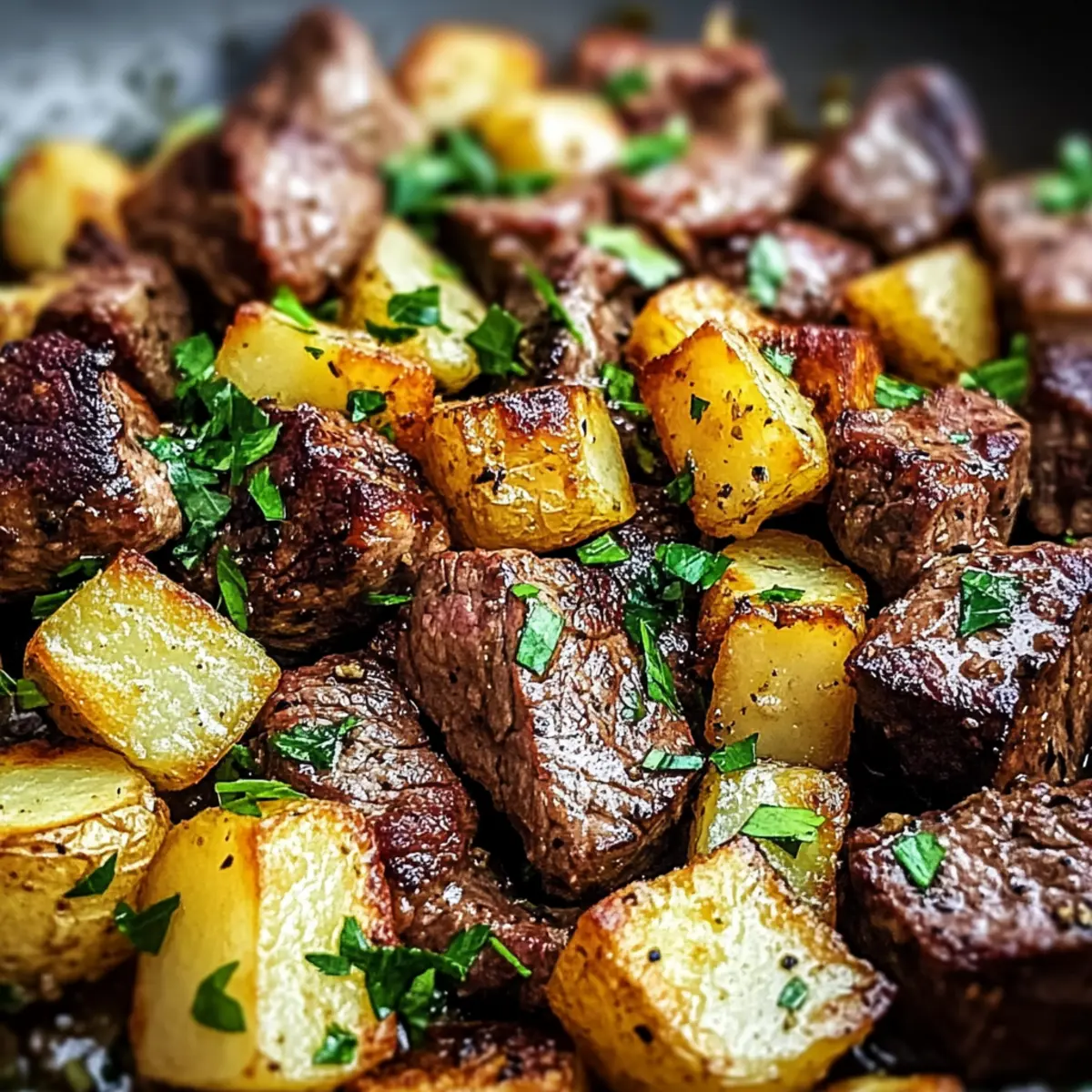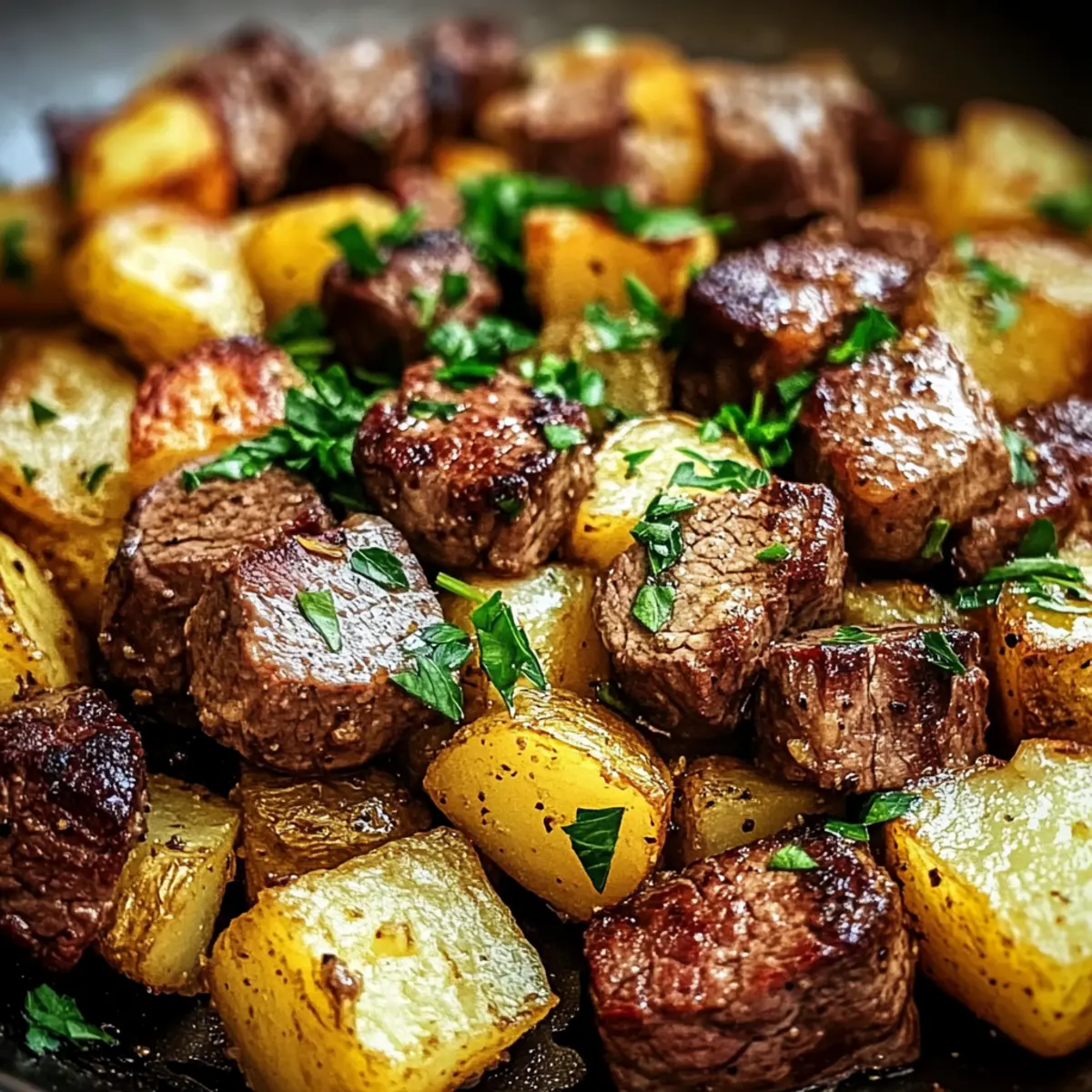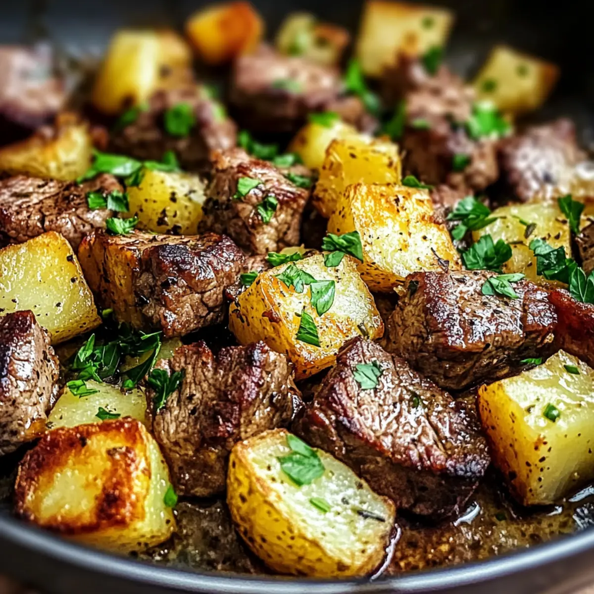 Jump to Recipe Print RecipeAs the sizzle of steak fills the kitchen, I can’t help but smile at the magic happening in my skillet. In just under 30 minutes, we’ll create Creamy Garlic Butter Steak Bites and Potatoes—a one-pan wonder that’s about to transform your weeknight meals. The combination of juicy, tender sirloin and crispy, golden potatoes enveloped in rich garlic butter is not just delicious; it’s a game-changer for busy evenings. Picture serving it at your next gathering, impressing friends and family alike without breaking a sweat. This dish not only streamlines your cooking process, but it’s also perfect for those evenings when time is short but your cravings are high. Ready to dive into a comforting meal that will leave everyone asking for seconds? Why Is This Recipe So Appealing? Simplicity: This recipe is a breeze to whip up, requiring minimal prep and just one pan—perfect for busy weeknights. Rich, Flavorful Sauce: The creamy garlic butter sauce elevates the dish, providing a comforting and indulgent experience. Crowd-Pleasing: With the robust taste of steak and crispy potatoes, everyone at your dinner table will be begging for more. Versatile Options: Feel free to swap in seasonal veggies, like zucchini or asparagus, to create your own unique twist. Quick Cooking Time: Made in under 30 minutes, it’s designed for those who crave a home-cooked meal but are short on time. Don’t forget to pair it with a fresh salad like our Cheddar Garlic Herb Potato Soup for a complete meal experience! Creamy Garlic Butter Steak Bites Ingredients For the Steak & Potatoes • Olive Oil – Adds fat for sautéing and enhances flavors; can be replaced with vegetable oil. • Ghee – Provides a rich buttery flavor; feel free to swap with unsalted butter or clarified butter. • Potatoes (Yukon Gold) – Offers a creamy texture and crispiness; substitute with red or fingerling potatoes if desired. • Minced Garlic – Adds depth and aroma; opt for fresh garlic, but garlic powder works in a pinch—just reduce the amount. • Salt & Pepper – Essential for seasoning; always adjust to taste. For the Herbs • Thyme – This herb enhances flavor beautifully; can be exchanged with rosemary or Italian seasoning as per your preference. • Oregano – Complements the dish well; feel free to swap with other fresh herbs for a different taste. For Garnish • Fresh Parsley – Adds a pop of color and freshness; can be omitted or replaced with chives for a different flair. Enjoy whipping up these Creamy Garlic Butter Steak Bites and Potatoes that will surely impress! Step‑by‑Step Instructions for Creamy Garlic Butter Steak Bites and Potatoes Step 1: Heat the Skillet Begin by heating a large cast iron skillet over medium heat, adding 2 tablespoons of olive oil and 2 tablespoons of ghee. Allow the fat to warm until it shimmers, which should take around 2 minutes. This step is crucial for achieving that perfect sear on your steak bites and crispy potatoes. Step 2: Cook the Potatoes Next, add your cubed Yukon Gold potatoes to the skillet along with minced garlic, thyme, oregano, salt, and pepper. Stir well to coat the potatoes in the rich fat. Cook for approximately 8–10 minutes, allowing them to brown and become tender. You’ll know they’re ready when they’re golden and fork-tender; then set them aside. Step 3: Sear the Steak Increase the skillet heat to medium-high and add the remaining 2 tablespoons of ghee. Once melted, toss in the seasoned steak cubes, spreading them out in a single layer. Sear undisturbed for 2 minutes without moving them, allowing a nice crust to form. Continue cooking for about 2-3 more minutes, stirring occasionally, until the steak reaches your desired doneness. Step 4: Combine Ingredients Gently return the cooked potatoes back into the skillet with the steak. Stir to combine all the delicious flavors, letting them mingle for an additional minute over medium heat. The potatoes will soak up the garlic butter sauce while the steak stays juicy. Step 5: Garnish and Serve Finally, remove the skillet from heat and garnish with freshly chopped parsley to add a pop of color and freshness. Serve your Creamy Garlic Butter Steak Bites and Potatoes hot, and watch how this one-pan wonder becomes the highlight of your meal! What to Serve with Creamy Garlic Butter Steak Bites and Potatoes Amp up the magic of your dinner table with delightful sides that complement this rich and hearty dish. Steamed Green Beans: Their crisp texture and vibrant color offer a refreshing contrast that balances the richness of the steak bites. Caesar Salad: A classic favorite, the creamy dressing and crunchy croutons enhance the cozy vibe of a home-cooked meal. Garlic Bread: Perfect for soaking up the delicious garlic butter sauce, this side adds an irresistible aroma and buttery goodness to your meal. Roasted Brussels Sprouts: Their slight bitterness and caramelized sweetness bring depth to the dish, providing a delightful taste harmony with every bite. Creamy Coleslaw: A tangy, textural contrast that refreshes the palate; it’s a crunchy counterpart that cuts through the richness of the steak and potatoes. Red Wine: Accentuate the savory flavors of your creamy garlic butter steak bites with a full-bodied red wine, enhancing your dining experience. Chocolate Mousse: Finally, finish off your meal with a luscious dessert that satisfies every sweet craving with its creamy and decadent texture. How to Store and Freeze Creamy Garlic Butter Steak Bites Fridge: Store leftovers in an airtight container and refrigerate for up to 3 days. When ready to eat, ensure you reheat thoroughly to avoid any food safety issues. Freezer: If you want to keep your Creamy Garlic Butter Steak Bites longer, freeze them in a freezer-safe container for up to 2 months. For best taste, store all components separately if possible. Reheating: To reheat, place in an oven preheated to 350°F (175°C) for 15-20 minutes, or
