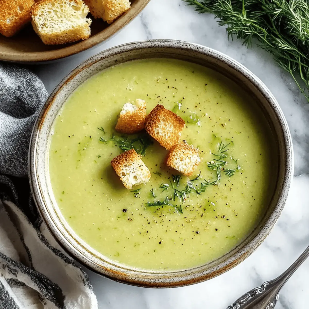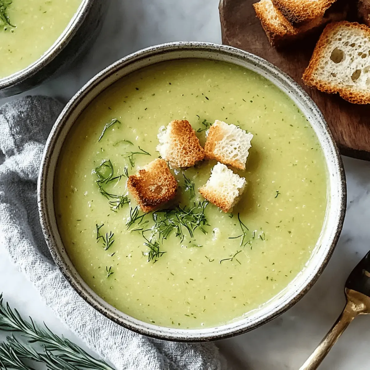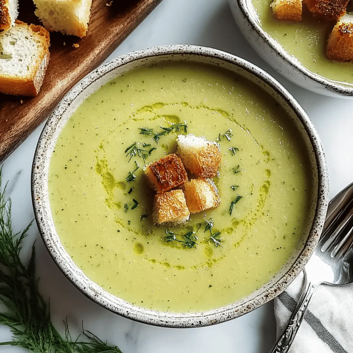 Jump to Recipe Print RecipeAs the first chill of autumn sweeps through the air, I find myself yearning for cozy meals that warm both the body and soul. Enter my Creamy Zucchini Soup, a delightful blend of garden-fresh ingredients crafted into a dish that’s not only vegetarian but also incredibly quick and easy to whip up. With a velvety texture and a burst of flavors from simple ingredients, this soup is a perfect remedy for those seeking comfort without the fuss. Plus, it’s a fantastic way to show off the bounty from your vegetable garden, transforming humble zucchini into a nourishing hug in a bowl. Curious to discover how to create this creamy delight? Let’s dive into the recipe! Why is This Soup So Irresistible? Cozy Comfort: With each spoonful of this Creamy Zucchini Soup, you’ll feel wrapped in warmth and comfort, perfect for those chilly evenings. Fresh Ingredients: Crafted with garden-fresh zucchini and a hint of lemon, it’s a vibrant way to celebrate seasonal produce. Quick & Easy: Ready in just 30 minutes, this recipe suits busy weeknights and spontaneous gatherings. Versatile & Flavorful: Customize it with fresh herbs or spices based on your palette—basil or dill can elevate this dish beautifully! Nutrient-Packed: Celebrate health with hearty cannellini beans, adding protein without the hassle of heavy dairy. Give your meals a cozy upgrade with this delightful soup! It pairs wonderfully with crusty bread or a side salad for a complete dinner experience. If you’re looking for more comforting options, try our Cheddar Garlic Soup or a hearty Crock Pot Soup! Creamy Zucchini Soup Ingredients To whip up this delightful dish, gather these essential ingredients! For the Soup Base Olive Oil – Provides healthy fats and aids in sautéing. Large Yellow Onion – Adds sweetness and depth to the soup’s flavor. Garlic (3 cloves, minced) – Enhances the aromatic profile; use fresh for the best results. Zucchini (4 cups, chopped) – The star ingredient offering a mild, fresh taste; can substitute with yellow squash. Vegetable Broth (4 cups) – Serves as the savory base liquid; chicken broth can be substituted for a non-vegetarian version. Kosher Salt (1 tsp) – Essential for seasoning; adjust to taste. Black Pepper (½ tsp) – Adds warmth; adjust based on your spice preference. Dried Thyme (½ tsp) – Introduces an earthy aroma; can be substituted with fresh thyme if available. For Creaminess Cannellini Beans (1 can, rinsed) – Provides creaminess and protein without much dairy; consider white kidney beans as an alternative. Fresh Lemon Juice (1 tbsp) – Brightens the flavor; always opt for fresh over bottled. Heavy Cream (¼ cup, optional) – Adds richness; substitutes include full-fat coconut milk or a dollop of Greek yogurt. For Garnish Croutons (optional) – Perfect for garnish and added crunch. Now that you have the ingredients ready, let’s get cooking and create a warm bowl of Creamy Zucchini Soup! Step‑by‑Step Instructions for Creamy Zucchini Soup Step 1: Sauté the Veggies In a Dutch oven, heat a tablespoon of olive oil over medium heat. Add the chopped large yellow onion and cook for 5-7 minutes, stirring occasionally, until translucent and softened. Then, add three minced garlic cloves and sauté for an additional minute, allowing the delightful aromas to fill your kitchen. Step 2: Simmer the Soup Pour in four cups of chopped zucchini, four cups of vegetable broth, one teaspoon of kosher salt, half a teaspoon of black pepper, and half a teaspoon of dried thyme into the pot. Bring the mixture to a boil, then reduce the heat and let it simmer uncovered for 15-20 minutes, or until the zucchini is tender and bright green. Step 3: Blend Until Smooth Once the zucchini is cooked through, add one can of rinsed cannellini beans to the pot. Using an immersion blender, blend the soup until completely smooth and creamy, enjoying the transformation of your Creamy Zucchini Soup as it becomes velvety and inviting. Step 4: Finish and Serve Stir in one tablespoon of fresh lemon juice for a burst of brightness, along with a quarter cup of optional heavy cream for added richness. Taste and adjust the seasoning if necessary, then ladle your warm soup into bowls. Serve hot, garnished with croutons or fresh herbs for an extra touch. Creamy Zucchini Soup Variations Feel free to get creative and make this creamy delight truly yours! Dairy-Free: Substitute heavy cream with full-fat coconut milk or a dollop of almond yogurt for a rich, dairy-free version. Protein Boost: Mix in cubed tofu or more rinsed cannellini beans to enhance nourishment and keep you fuller for longer. Herb Twist: Experiment with fresh herbs like basil or dill to elevate the flavor profile and add a lovely fresh aroma. Spice It Up: Add a pinch of red pepper flakes or a dash of cayenne for a mild kick, perfect for those who love a hint of heat. Roasted Flavor: For a deeper taste, roast the zucchini beforehand; the caramelization will enhance the overall flavor of the soup. Nutty Touch: Stir in a few tablespoons of tahini or almond butter for added creaminess and a touch of nuttiness. Zesty Lemon: Amp up the brightness by adding more fresh lemon juice and maybe even a dash of lemon zest to ignite your taste buds. Chunky Version: If you prefer texture, reserve some sautéed zucchini before blending. This adds heartiness and visual appeal. Pair your flavorful variations with a side of crusty bread or a refreshing salad to create a delightful meal! If you’re in the mood for another comforting bowl, why not try our Creamy Italian Ground Chicken Soup for a delightful twist? How to Store and Freeze Creamy Zucchini Soup Refrigerator: Store leftovers in an airtight container for up to 3 days. This keeps your Creamy Zucchini Soup fresh and ready for quick servings. Freezer: To freeze, pour the cooled soup into freezer-safe containers or bags, leaving some space for expansion. It can be stored for up to 2 months. T