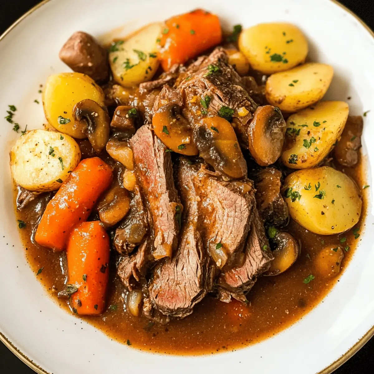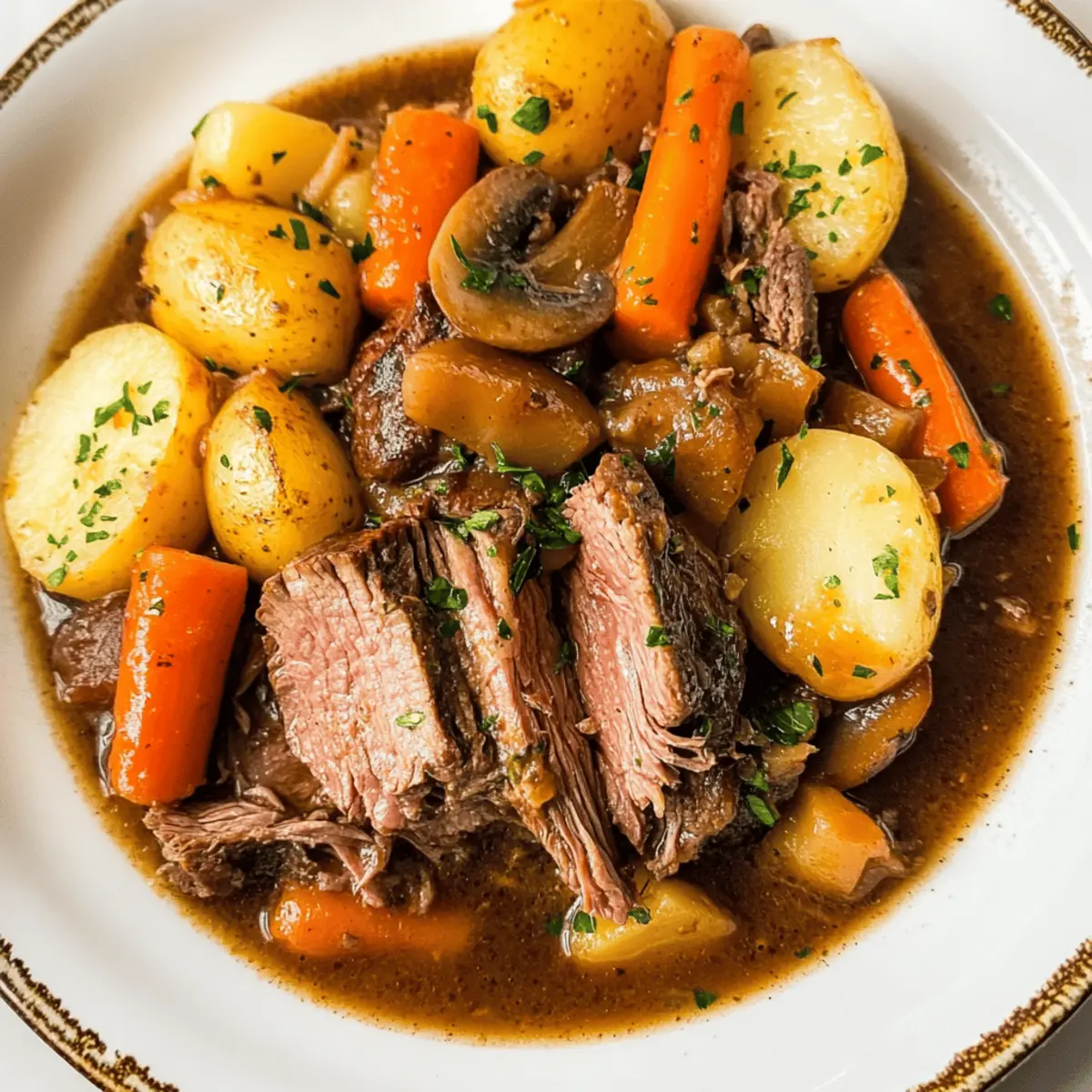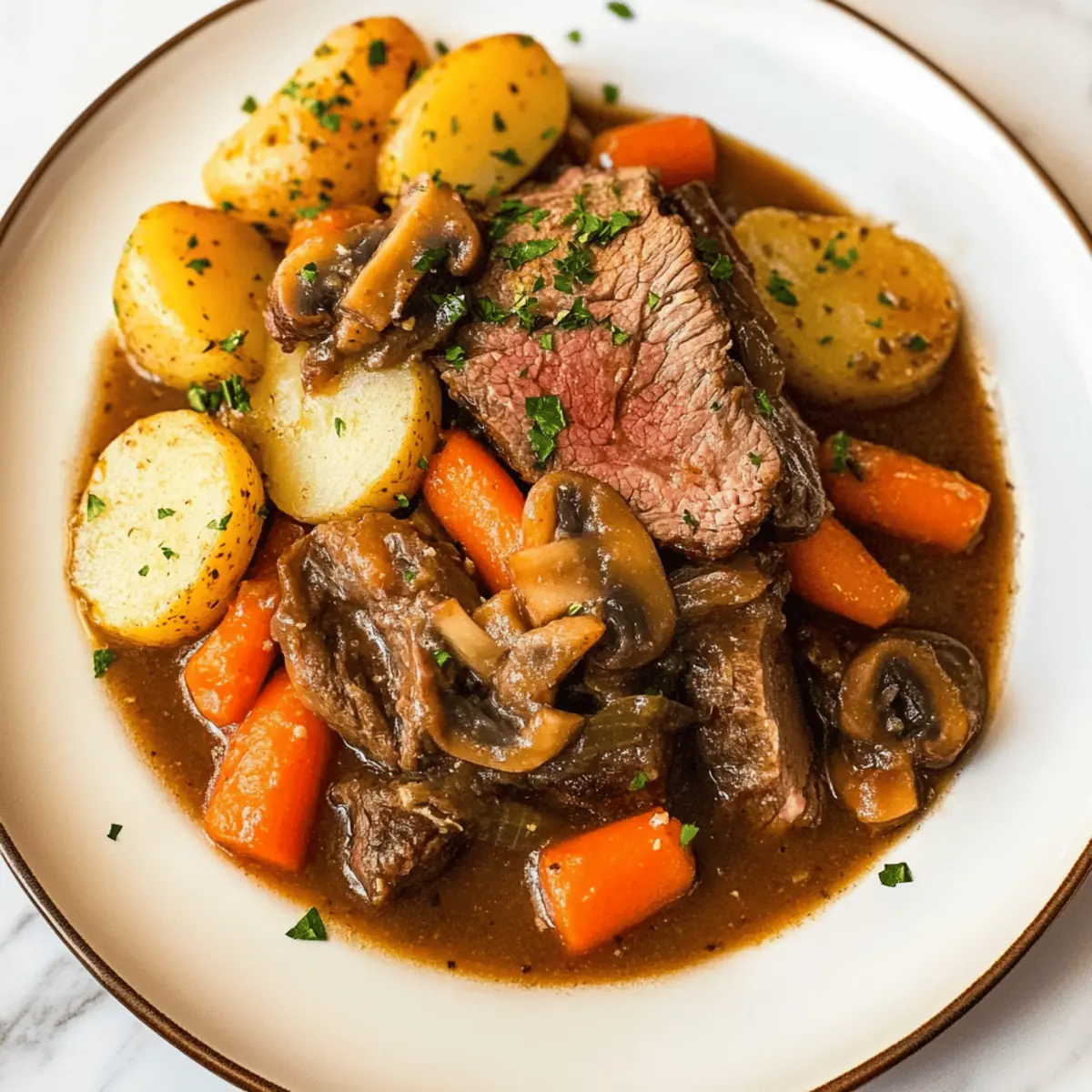 Jump to Recipe Print RecipeThere’s a special kind of joy that comes from the tantalizing aroma that fills your home when cooking a Crockpot Pot Roast. As the savory blend of tender beef, hearty potatoes, and vibrant vegetables simmers away, you’re not just creating a meal; you’re crafting a warm embrace that draws everyone to the dinner table. This comforting, set-it-and-forget-it recipe is perfect for busy weeknights or weekend gatherings, allowing you to enjoy quality time with loved ones while the slow cooker does all the work. Plus, it’s a hearty dish that keeps you satisfied without any fuss! Are you ready to bring this classic dish to life and impress friends and family with minimal effort? Let’s dive into the details! Why is This Pot Roast a Must-Try? Ease of Preparation: Simply throw your ingredients into the crockpot and let it work its magic while you go about your day. Irresistible Aroma: The delightful scent of savory beef and fresh herbs wafts through your home, making it impossible for anyone to resist gathering around the table. Comforting Meal: This Crockpot Pot Roast is the epitome of hearty comfort food, creating a welcome warmth on chilly nights. Crowd-Pleasing Flavor: Packed with bold flavors and tender textures, it’s sure to impress family and friends—perfect for gatherings or cozy dinners alike. Versatile Options: Feel free to switch up the veggies or try different roasts such as brisket for unique flavors, or complement it with sides like creamy mashed potatoes or crusty bread, just like everyone enjoys with Crockpot Breakfast Casserole for a great start! Crockpot Pot Roast Ingredients For the Roast Chuck Roast – The heart of your dish, providing robust flavor and becoming tender as it cooks slowly. Substitute with top round roast for a leaner option. For the Vegetables Potatoes – Add heartiness; choose russet, Yukon gold, or red potatoes for variety. Can omit if serving with mashed potatoes. Carrots – Bring sweetness and color; peel and slice before adding to the mix. Yellow Onion – Enhances the depth of flavor; dice finely to distribute throughout the dish. Sliced Mushrooms – Optional, adds texture and flavor; consider using button or cremini for a rustic touch. For the Gravy Beef Stock – Creates a rich gravy base; can be substituted with chicken or vegetable stock if needed. Worcestershire Sauce – Adds a layer of umami depth, highly recommend for an extra flavor boost. For Seasoning Minced Garlic & Garlic Powder – Combine both for a robust and delicious garlic kick. Onion Powder – Complements the fresh onion, enriching the savory notes. Dried Oregano & Thyme – Earthy herbs that elevate the dish; fresh herbs can be a delightful substitute. Salt & Black Pepper – Essential for seasoning; adjust according to your taste preferences. For Thickening Cornstarch – Used at the end to thicken the gravy to your desired consistency; mix with water before adding. This Crockpot Pot Roast is perfect for those who crave comfort food with minimal effort! Step‑by‑Step Instructions for Crockpot Pot Roast Step 1: Season the Roast Start by generously seasoning the chuck roast with salt and black pepper, ensuring an even coating for maximum flavor. Place the seasoned roast into your 7-quart crockpot as a solid foundation for your Crockpot Pot Roast. Step 2: Add the Vegetables Next, surround the roast with diced potatoes, sliced carrots, and diced yellow onion. These vegetables will absorb the rich flavors as they cook, contributing to the comforting essence of your pot roast. Spread them evenly around the meat for optimal cooking. Step 3: Prepare the Gravy Mixture In a mixing bowl, combine beef stock, Worcestershire sauce, minced garlic, onion powder, dried oregano, and thyme. Whisk these ingredients together to create a flavorful broth. Pour the mixture over the roast and vegetables in the crockpot, allowing the ingredients to meld beautifully. Step 4: Set the Cooking Time Cover the crockpot with its lid and set it to cook on low for 7-8 hours, or on high for 6-7 hours. This gentle cooking process helps break down the meat’s fibers, resulting in a fall-apart tender Crockpot Pot Roast that everyone will love. Step 5: Thicken the Gravy About 15 minutes before serving, mix cornstarch with water in a small bowl until smooth. Add this mixture to the crockpot and stir gently to incorporate. This will help thicken the gravy, making it deliciously rich and velvety. Step 6: Add Optional Mushrooms Stir in the sliced mushrooms, if using, for an extra depth of flavor and unique texture. Let the pot roast cook for an additional 10-15 minutes, allowing the mushrooms to soften and the gravy to reach your desired thickness. Step 7: Serve and Enjoy Once the cooking time is complete, carefully remove the lid and serve your warm Crockpot Pot Roast. Ladle out generous portions of the tender beef and vegetables, making sure to include rich gravy over the top for that comforting finish. How to Store and Freeze Crockpot Pot Roast Fridge: Store leftovers in an airtight container for up to 5 days. Make sure the pot roast has cooled completely before sealing to retain freshness. Freezer: Freeze the cooled pot roast for up to 3 months. Divide it into portions for easy reheating later. Wrap tightly or use freezer-safe bags to prevent freezer burn. Reheating: Thaw overnight in the refrigerator before reheating. Warm gently on the stove or in the microwave, adding a splash of beef stock if needed to restore moisture and flavors. Make-Ahead Tip: Consider making a larger batch of this Crockpot Pot Roast to enjoy later. It saves time and offers delicious meals for busy days! What to Serve with Crockpot Pot Roast? There’s nothing quite like the magic of a hearty meal centered around a Crockpot Pot Roast, a warm and inviting centerpiece that begs for delicious accompaniments. Creamy Mashed Potatoes: The ultimate comfort food that pairs beautifully with the rich gravy, maki