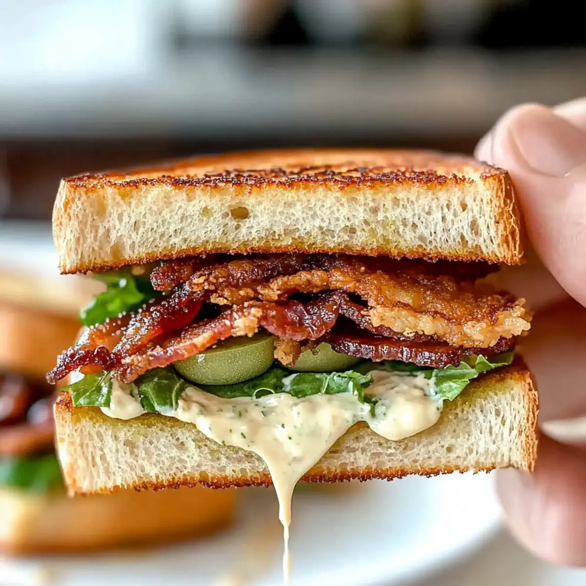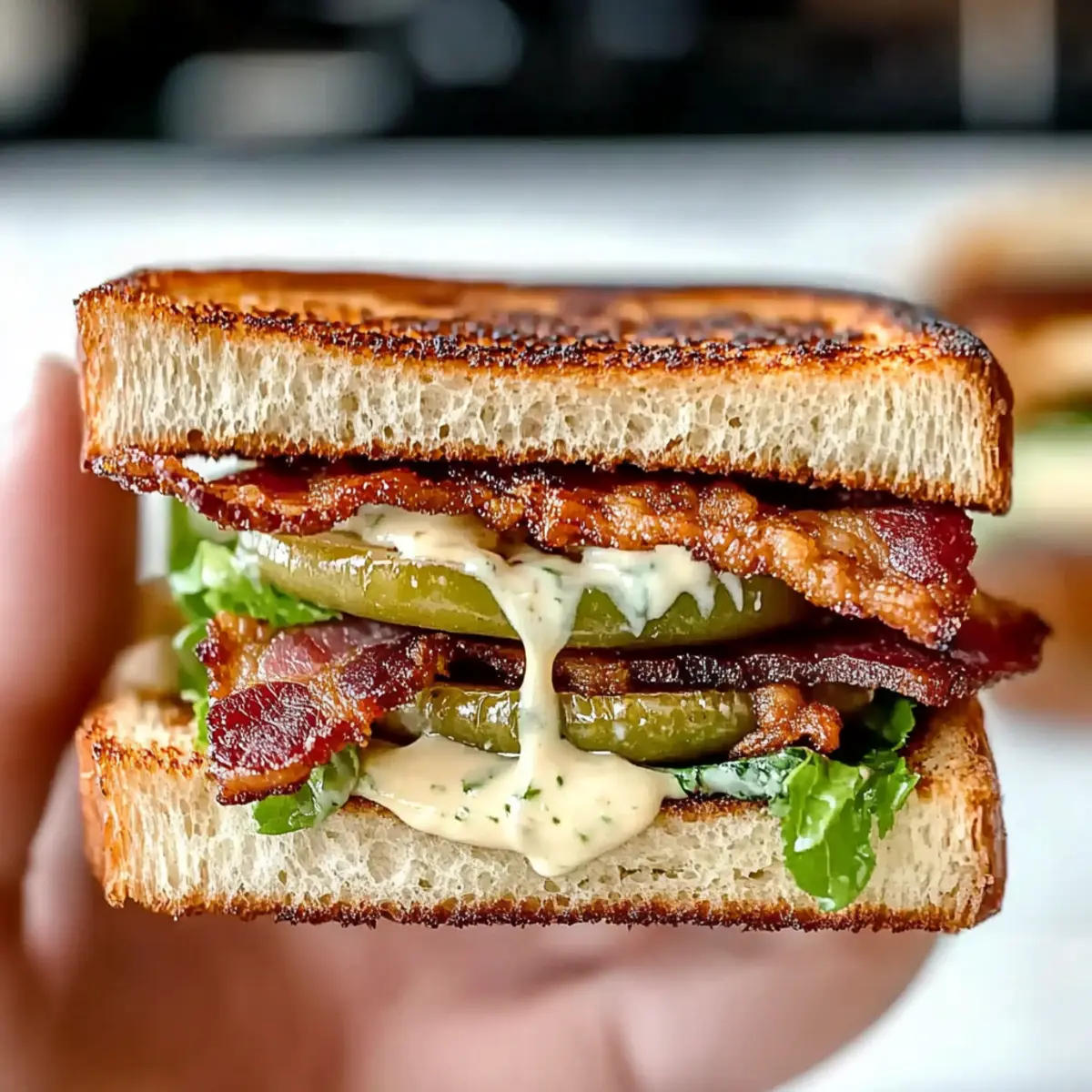 Jump to Recipe Print RecipeAs I sank my teeth into a Crunchy Fried Green Tomato BLT Sandwich, the world outside faded away, leaving just the perfect blend of textures and flavors. This mouthwatering twist on a classic delivers the satisfying crunch of fried green tomatoes, crispy bacon, and vibrant lettuce, all nestled between warm, toasted bread. Not only is this Southern delight a quick and easy dish to whip up, but it also brings a touch of comfort to your lunch or dinner that fast food simply can’t match. Whether you’re savoring it at a backyard barbecue or making it a weekday staple, this sandwich is destined to become a favorite in your kitchen. Ready to dive into this culinary adventure and impress your loved ones? Why is this sandwich irresistible? Crispiness like no other: Each bite of the Crunchy Fried Green Tomato BLT offers an irresistible crunch, perfectly complemented by the crispy bacon. Southern Comfort: This twist on a classic BLT embodies the heart of Southern cuisine, bringing warmth and nostalgia to your table. Quick & Easy: Get a gourmet experience without spending hours in the kitchen. Customizable Flavors: Tailor this delight with unique ingredient swaps, like avocado in place of bacon. Serve it with a refreshing Tomato Salad Refreshing or classic potato salad for a full meal. Crowd-Pleasing Appeal: Whether you’re hosting friends or enjoying a family dinner, this sandwich is sure to impress! Crunchy Fried Green Tomato BLT Sandwich Ingredients • Get ready to gather your ingredients for this Southern classic that you’ll crave daily! For the Sandwich Green Tomatoes – Provide a delightful crunch and tangy flavor; use unripe beefsteak or early girl varieties. Bacon – Adds savory richness; substitute turkey bacon for a lighter twist. Lettuce – Fresh and crisp; opt for iceberg or romaine for the best texture. Bread – The foundation of your sandwich; choose sturdy options like sourdough or Texas toast. For the Breading Cornmeal – Creates that signature crispy coating for the fried tomatoes. Flour – Helps form a perfect crust; use all-purpose flour for best results. Milk & Egg – Whisk together to create an egg wash that helps breading adhere. For the Seasoning Seasonings (Salt, Pepper, Cayenne Pepper, Sugar) – Enhance the flavor profile of the fried tomatoes and can be adjusted to your taste. For the Sauce Mayo – Provides that creamy finish in the sandwich; swap for Greek yogurt or vegan mayo for a healthful alternative. Prepare to dive into the delightful layers of flavor and texture in this Crunchy Fried Green Tomato BLT Sandwich! Step‑by‑Step Instructions for Crunchy Fried Green Tomato BLT Sandwich Step 1: Cook the Bacon Start by heating a large skillet over medium heat. Add bacon strips and cook for 6-8 minutes, turning occasionally until they’re crispy and golden brown. Make sure to keep an eye on them to prevent burning. Once done, transfer the bacon to a paper towel-lined plate to absorb excess grease and set it aside while you prepare the other ingredients. Step 2: Slice the Tomatoes Using a sharp knife, slice the green tomatoes into 1/4 to 1/3 inch thick slices. This thickness ensures a crispy bite while maintaining a firm texture during frying. Arrange the slices on a cutting board, taking a moment to appreciate their beautiful vibrant green color, which will surely shine in your Crunchy Fried Green Tomato BLT Sandwich. Step 3: Prepare the Egg Wash In a medium bowl, whisk together about half a cup of milk and one large egg until the mixture is smooth and homogenous. This egg wash will help the breading stick to the tomato slices. Make sure it’s well combined, and set it aside as you prepare the breading mixture in the next step. Step 4: Mix the Breading In another bowl, combine 3/4 cup of cornmeal, 1/4 cup of all-purpose flour, and season generously with salt, pepper, cayenne pepper, and a touch of sugar. Stir the mixture until it’s well-blended. The cornmeal will provide the signature crunch, setting the stage for your mouthwatering Crunchy Fried Green Tomato BLT Sandwich. Step 5: Heat the Oil Pour about 1/2 inch of oil into the skillet you used for the bacon and heat it over medium-high heat. You want the oil to shimmer and reach around 350°F for the perfect frying temperature. To test if it’s ready, drop a small amount of the breading mixture into the oil; it should sizzle immediately. Step 6: Bread the Tomato Slices Dip each tomato slice into the egg wash, letting the excess liquid drip off. Next, dredge it in the seasoned cornmeal mixture, ensuring an even coating on both sides. Gently shake off any excess breading as you place them on a plate. This double dip will ensure each bite of your Crunchy Fried Green Tomato BLT Sandwich has a delightful crunch. Step 7: Fry the Tomatoes Carefully place the breaded tomato slices in the hot oil, frying them in batches for about 3-4 minutes on each side. You’re looking for a beautiful golden-brown color and a sound of sizzling as they cook. Once done, transfer the fried slices onto paper towels to drain any excess oil, ensuring they stay crisp. Step 8: Whip Up the Sauce In a small jar or bowl, mix about half a cup of mayonnaise with a pinch of salt, pepper, and any additional seasonings you prefer. Shake or stir well until it’s smooth and creamy. This sauce will add a luscious touch to your Crunchy Fried Green Tomato BLT Sandwich, balancing the savory flavors beautifully. Step 9: Assemble the Sandwiches To assemble your sandwiches, start by toasting slices of sturdy bread like sourdough or Texas toast. Then spread a generous layer of your creamy sauce on one side of each slice. Layer on crisp lettuce, followed by the golden fried green tomato slices, and finish with the crispy bacon. Top with another slice of bread, slice in half, and get ready to savor every bite! Make Ahead Options The Crunchy Fried Green Tomato BLT Sandwich is ideal for meal prep enthusiasts! You can slice 