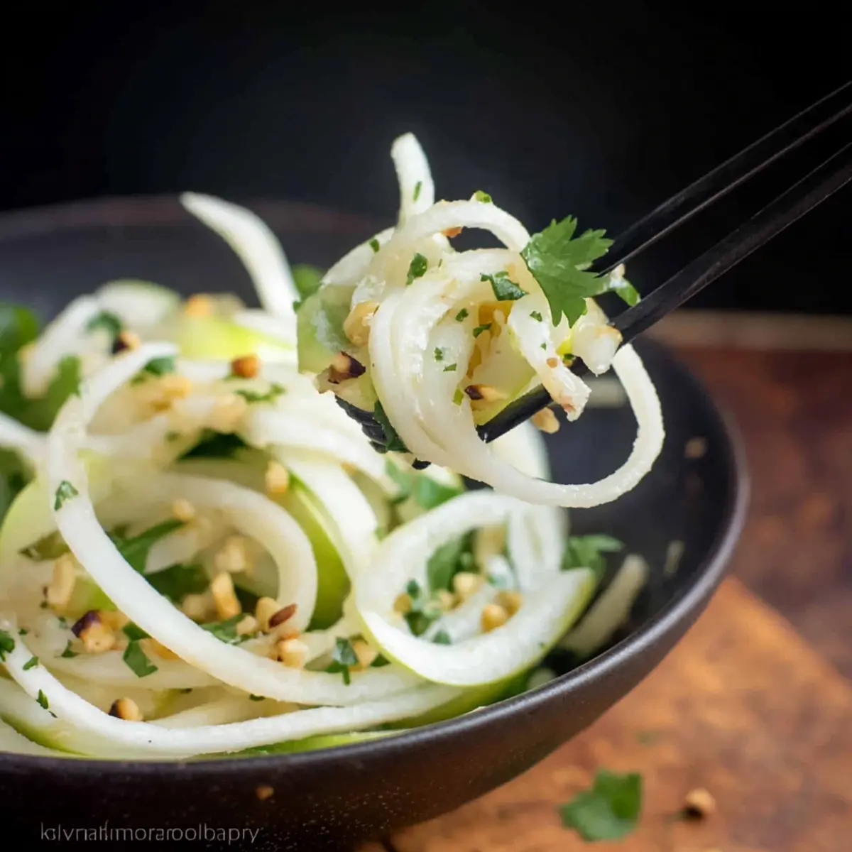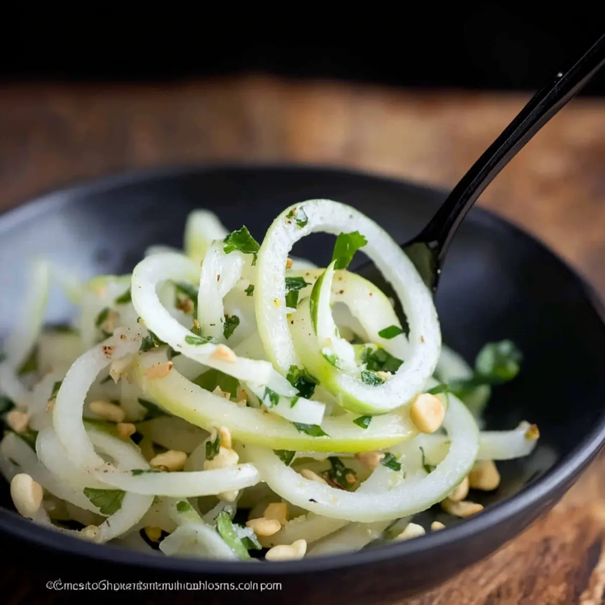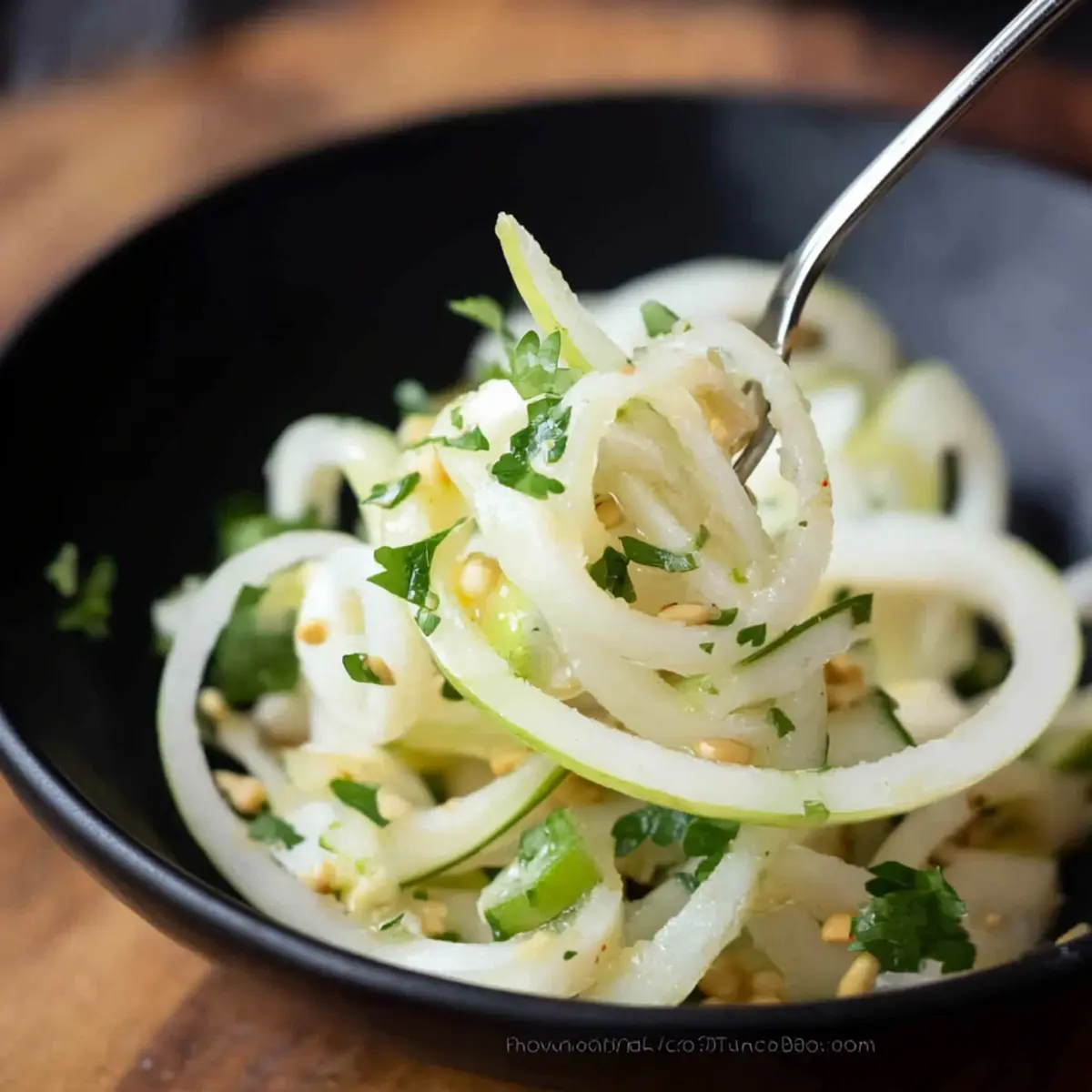 Jump to Recipe Print RecipeAs the seasons change, I’m always on the lookout for vibrant dishes that bring freshness to the table. Enter my Daikon Salad with Green Apple and Pepitas—a quick-prep gem that is not only gluten-free and vegan but also downright invigorating! The crispness of the spiralized daikon harmonizes beautifully with the tart crunch of green apple, while pepitas add a delightful nuttiness to every bite. Perfect for busy days or as a refreshing side at gatherings, this salad comes together in just 15 minutes. Imagine serving it alongside grilled meats or seafood, elevating your meals effortlessly. Are you ready to transform your taste buds with this delightful salad? Why is This Salad a Must-Try? Quick preparation: In just 15 minutes, you can whip up this refreshing salad, making it ideal for busy weeknights or impromptu gatherings. Vibrant flavors: The combination of crisp daikon, tart green apple, and nutty pepitas creates a flavor explosion that will have everyone asking for seconds! Healthy choice: Gluten-free and vegan, this salad is packed with nutrients and healthy fats, perfect for those seeking lighter options. Versatile pairing: Serve it as a side with grilled chicken or fish, or enjoy it alone for a light lunch. Don’t forget to check out my Tzatziki Cucumber Salad for another great side dish that’s equally refreshing! Daikon Salad with Green Apple Ingredients For the Salad • Daikon – Adds a refreshing crunch; use Japanese daikon for the best texture. • Granny Smith Apple – Offers a tartness that brightens the dish; substitute with Fuji apples for extra sweetness. • Fresh Parsley – Adds a pop of color and freshness; cilantro can be used if you prefer a different herbaceous flavor. • Pepitas (Unsalted) – Provide protein and a satisfying crunch; sunflower seeds are a nut-free alternative. For the Dressing • Avocado Oil – Provides healthy fats with a subtle flavor; you can swap for olive oil if you want a richer taste. • Rice Vinegar – Adds brightness and acidity; use apple cider vinegar for a bolder flavor profile. • Clementine Juice – Brings a hint of natural sweetness and citrus; orange juice works well as a substitute. • Lime Juice – Enhances the citrus flavor and acidity; feel free to omit for a milder taste. Optional Add-ins • Shredded Carrots or Bell Peppers – Perfect for adding a splash of color and extra flavor. • Sliced Jalapeños or Chili Flakes – Great for those who prefer a spicy kick! • Cooked Quinoa or Chickpeas – For added protein and texture, making the salad even heartier. This Daikon Salad with Green Apple and Pepitas is a vibrant, nutritious delight that you’ll want to make again and again! Step‑by‑Step Instructions for Daikon Salad with Green Apple and Pepitas Step 1: Make the Dressing In a medium bowl, combine 3 tablespoons of avocado oil, 2 tablespoons of rice vinegar, 2 tablespoons of clementine juice, and 1 tablespoon of lime juice. Finely chop about ¼ cup of fresh parsley and whisk it all together until well-blended. The dressing should be slightly thickened and aromatic, ready to enhance the flavors of your Daikon Salad. Step 2: Prepare the Vegetables Using a spiralizer, spiralize one medium-sized daikon radish and one Granny Smith apple. If you don’t have a spiralizer, you can use a julienne peeler or sharpened knife to cut them into thin strips or matchsticks. The daikon should be crunchy and the apple vibrant, lending a beautiful array of textures to your salad. Step 3: Combine the Salad Ingredients In a large mixing bowl, combine the spiralized daikon and apple. Drizzle the prepared dressing over the top and toss gently to ensure each piece is evenly coated. This should take about a minute; you want the daikon and apple to shine with the citrusy goodness from the dressing. Step 4: Add the Pepitas Sprinkle ¼ cup of unsalted pepitas onto the salad mixture and give it a light toss. The pepitas will add delightful crunch and a burst of protein to your Daikon Salad with Green Apple and Pepitas. The salad should look colorful and inviting, with the green pepitas contrasting beautifully against the white and green vegetables. Step 5: Let the Salad Rest Allow the salad to sit at room temperature for about 5 minutes. This resting time lets the flavors meld beautifully, enhancing the overall taste of your dish. Just be cautious not to let it sit for too long, as you want to maintain the crispiness of the daikon and apple. Step 6: Serve and Enjoy Once the flavors have melded, serve the Daikon Salad with Green Apple and Pepitas immediately as a refreshing side. This salad pairs beautifully with grilled fish or chicken, adding a fresh and vibrant note to your meal. Enjoy the explosion of flavors in every delightful bite! What to Serve with Refreshing Daikon and Green Apple Salad with Pepitas Elevate your dining experience by crafting the perfect meal around this vibrant salad that sings of freshness and flavor. Grilled Salmon: The rich, flaky texture of grilled salmon beautifully contrasts with the crispness of the salad, adding depth to your meal. Sushi Rolls: Pairing this salad with sushi brings a pleasing balance of freshness and umami, making for a delightful fusion of flavors. Quinoa Pilaf: A warm, hearty quinoa pilaf adds a nutty flavor and protein, creating a satisfying and nutritious plate. Lemon Herb Grilled Chicken: The zesty seasoning of lemon herb chicken complements the bright notes of the salad, providing a well-rounded flavor profile. Grilled meats offer a satisfying heartiness that pairs well with the salad’s crispness. Chilled White Wine: A glass of chilled Sauvignon Blanc harmonizes with the citrus notes in the salad while refreshing your palate. Mango Sorbet: For dessert, this light and fruity option cleanses the palate while echoing the salad’s bright flavors. Daikon Salad with Green Apple Variations Customize your salad experience with these delightful twists a