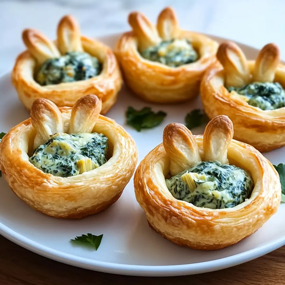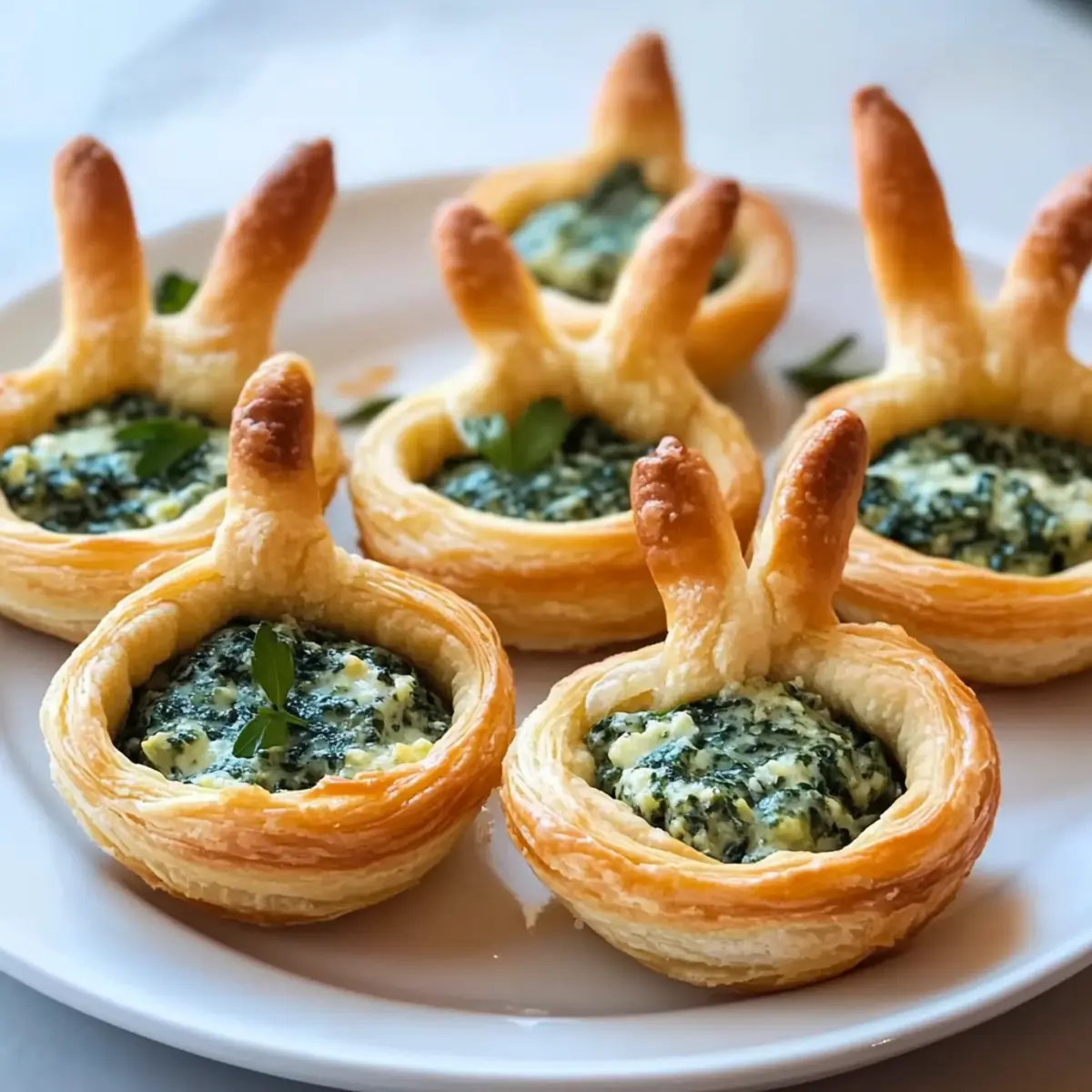 Jump to Recipe Print RecipeSpringtime brings a delightful spirit, and what better way to celebrate than with adorable Easter Bunny Crescent Bites? These charming little nibbles are more than just a feast for the eyes; they’re a quick and easy appetizer that bursts with a creamy spinach-artichoke filling. In under 30 minutes, you can whip up these festive treats that are perfect for both kids and adults alike—making them the ideal addition to your holiday gatherings. Not only do they add a touch of whimsy to your table, but they also allow you to serve gourmet flavors without the fuss of a complicated recipe. Are you ready to hop into the kitchen and create these fun bites that will surely impress your family and friends? Why Are Easter Bunny Bites So Adorable? Appealing Presentation: The whimsical bunny shape adds charm, making them a fun centerpiece for your spring festivities. Quick & Easy: With just 30 minutes of prep time, these bites fit perfectly into your busy schedule. Kid-Friendly Flavor: The creamy spinach-artichoke filling is flavorful yet mild, appealing to even the pickiest of eaters. Versatile Filling: While the spinach-artichoke concoction is a crowd favorite, feel free to experiment with variations like buffalo chicken for a delightful twist! You might also enjoy these Garlic Salmon Bites for a savory option. Perfect for Gatherings: Whether it’s a holiday brunch or casual get-together, these bites are sure to be a hit, pleasing adults and children alike. Easter Bunny Crescent Bites Ingredients • Get ready to whip up something delightful! For the Dough Crescent Roll Dough – Offers a buttery, flaky base perfect for creating those adorable bunny shapes. For the Filling Fresh Herbs (Parsley or Chives) – Add a pop of color and freshness to elevate your bites. Artichoke Hearts – Canned for convenience; they bring a tangy texture to the filling—just drain and chop! Frozen Spinach – Packed with nutrition; remember to squeeze out excess moisture to keep the bites from getting soggy. Onion – Finely diced; it adds savory depth to enhance your creamy spinach-artichoke filling. Cream Cheese – Provides a rich and creamy base for a deliciously indulgent filling. Sour Cream – Balances out flavors with a hint of tanginess, helping to achieve a silky consistency. Parmesan Cheese – This salty, nutty addition enriches the flavor profile of your Easter Bunny Crescent Bites. Garlic – A must-have for that essential flavor boost in your creamy filling. Salt – Just a pinch helps to harmonize and elevate all the flavors in the filling. Step‑by‑Step Instructions for Easter Bunny Crescent Bites Step 1: Preheat the Oven Begin by preheating your oven to 350°F (175°C). While the oven warms up, prepare a mini-muffin tin by spraying it lightly with nonstick spray. Next, line a baking sheet with parchment paper to catch any drips or spills from the bunny ears and to keep your workspace tidy during the preparation of your Easter Bunny Crescent Bites. Step 2: Prepare the Dough Unroll the crescent roll dough carefully, ensuring you don’t tear it. Press the seams together to create a single sheet, then cut the dough into 2-3 inch circles that will fit snugly into your muffin cups. This step is crucial; the adorable shape of the bites will help them stand out on your holiday appetizer table. Step 3: Shape the Bunny Ears Utilizing the scraps from the dough, cut out bunny ears about 1-1.5 inches tall. Aim for an elongated oval shape with a wider base for better stability. Place these ear-shaped pieces on the prepared parchment sheet and get ready to bake them until they are off to a golden start! Step 4: Bake Bunny Ears and Dough Cups Place the muffin tin and the parchment with ears into the preheated oven. Bake the ears for about 3-5 minutes or until they are slightly golden and firm. Meanwhile, let the crescent cups bake for 8-10 minutes, rotating pans halfway through to ensure even baking—this will give your Easter Bunny Crescent Bites the perfect golden crust. Step 5: Create Wells in the Cups Once both the bunny ears and dough cups are done baking, remove them from the oven and let them cool for a minute. Gently press down the center of each dough cup with a small glass or your fingers to create a well, perfect for holding the delicious spinach-artichoke filling—this step is vital for a balanced bite! Step 6: Prepare the Spinach-Artichoke Filling In a mixing bowl, combine the chopped artichoke hearts, thawed and drained spinach, finely diced onion, cream cheese, sour cream, grated Parmesan cheese, minced garlic, and a pinch of salt. Mix until combined and creamy, ensuring your filling has a smooth consistency while retaining a rich, savory flavor for your Easter Bunny Crescent Bites. Step 7: Assemble the Bites Now, it’s time to fill your delicious cups! Spoon the creamy spinach-artichoke mixture generously into each well, ensuring they’re filled to the top. Next, insert the bunny ears at the back of each filled cup, creating an adorable presentation that is sure to charm your family and friends. Step 8: Garnish and Serve For a final touch, sprinkle fresh herbs like parsley or chives over the filled Easter Bunny Crescent Bites. This not only adds a pop of color but enhances the flavors as well. Serve them warm, and watch your guests smile with delight as they enjoy these festive bite-sized treats! Make Ahead Options These Easter Bunny Crescent Bites are perfect for meal prep enthusiasts looking to save time on festive occasions! You can prepare the spinach-artichoke filling up to 3 days in advance; just store it in an airtight container in the refrigerator to keep it fresh and prevent any moisture buildup. Additionally, you can bake the crescent cups and bunny ears a day ahead and store them at room temperature, ensuring they stay crisp. When you’re ready to serve, simply fill the cups with the creamy mixture and insert the bunny ears before placing them in the 