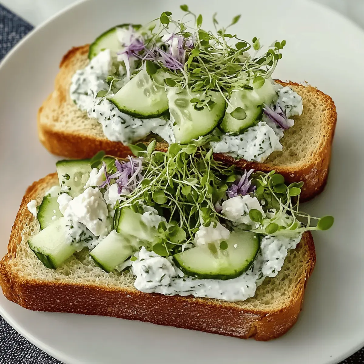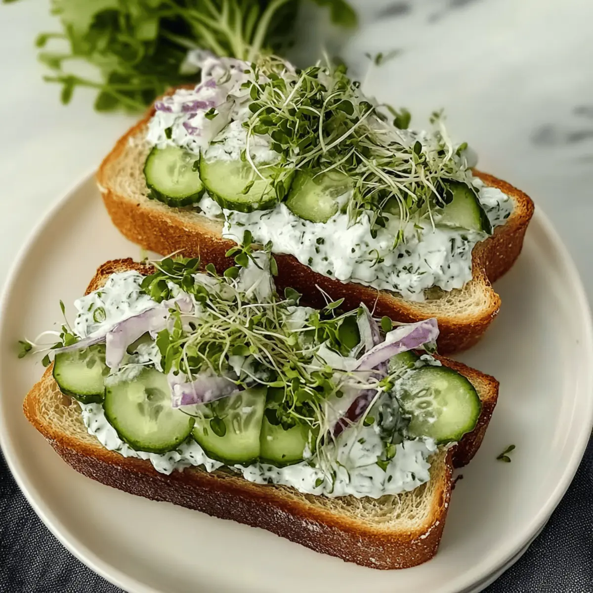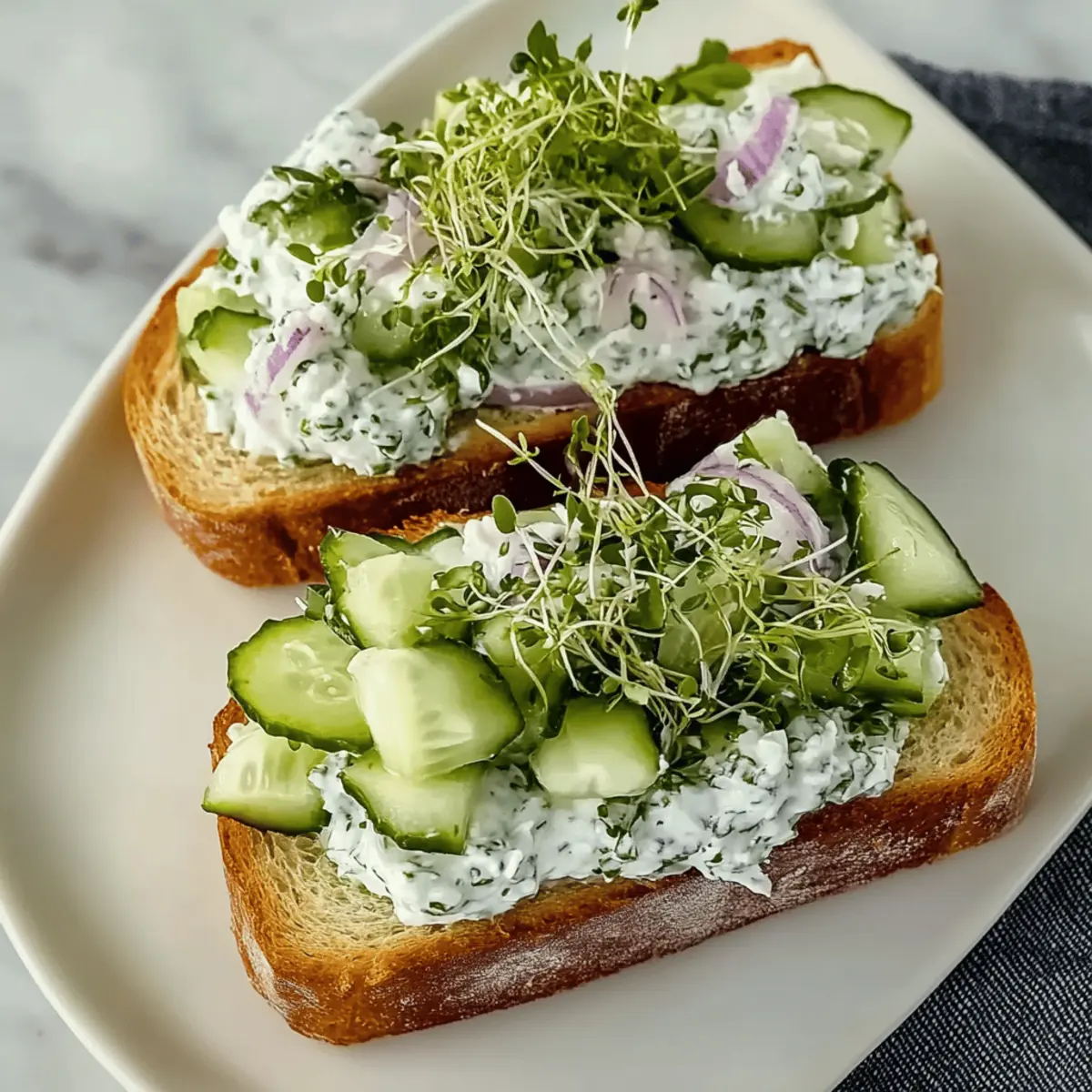 Jump to Recipe Print Recipe“Did you ever find yourself staring blankly at your lunch options, wishing for something fresh and vibrant?” That’s where my Easy Cucumber Salad Sandwiches come to the rescue! These delightful creations are not only a breeze to whip up but they also flaunt a refreshing crunch that makes lunchtime feel like a mini celebration. Packed with crisp cucumbers and a creamy yogurt-feta spread, they provide a satisfying meal without the heaviness. Plus, their customizable nature means you can play around with your favorite herbs and spreads, tailoring them to fit your mood or dietary needs. So, if you’re ready to step away from fast food and enjoy a burst of freshness instead, let’s dive into this easy recipe that’s bound to brighten your day. What unique twist will you add to these sandwiches? What makes these sandwiches so special? Quick and Easy: These sandwiches come together in no time, perfect for those busy weekdays when you still want something delicious and fresh. Customizable Delight: With options for herbs and spreads, you can easily cater this recipe to suit your taste or even dietary needs! Try adding a hint of dill or swap in cream cheese for a twist. Refreshing Crunch: Each bite of these Easy Cucumber Salad Sandwiches offers an irresistible crunch, making it feel like you’re enjoying a lovely garden in every mouthful. Light yet Satisfying: Experience a filling lunch without the heaviness. Enjoy them with a side of fresh fruit or potato chips for a gratifying meal that won’t slow you down! Make Ahead Friendly: You can prepare the cucumber filling in advance and assemble the sandwiches just before serving, ensuring optimal freshness and taste. For another fresh idea, check out my Cucumber Sweet Pepper recipe for a delightful side dish! Easy Cucumber Salad Sandwiches Ingredients For the Sandwich Filling English Cucumbers – A refreshing crunch is essential; regular garden cucumbers can be used if peeled and seeded. Salt – Draws out moisture to keep cucumbers crisp and prevent sogginess. Yogurt – Adds creaminess and a tangy touch to the spread. Feta Cheese – Provides a savory flavor that complements the cucumbers perfectly. Fresh Herbs – Customize with your favorites like dill or chives for an extra flavor boost. Lemon Zest and Juice – Brightness and acidity enhance the overall taste. Black Pepper – A simple seasoning to elevate your filling. For the Assembly Bread (toasted) – Choose your favorite type (like whole grain) to hold everything together. Sprouts – Optional, but they bring an extra crunch and freshness to each sandwich. Onion – Adds a slight bite; feel free to omit or swap for green onions if preferred. These Easy Cucumber Salad Sandwiches aren’t just tasty; they’re a blank canvas for your culinary creativity! Step‑by‑Step Instructions for Easy Cucumber Salad Sandwiches Step 1: Prepare Cucumbers Begin by dicing your English cucumbers into small, bite-sized pieces. Place them in a colander and sprinkle with salt to draw out excess moisture; let them sit for about 15 minutes. This step is crucial, as it helps keep your Easy Cucumber Salad Sandwiches crisp and prevents sogginess. Step 2: Make Filling While the cucumbers are draining, grab a mixing bowl and combine your yogurt, crumbled feta cheese, fresh herbs, lemon zest, lemon juice, and black pepper. Stir vigorously until all ingredients are well incorporated into a creamy mixture. This will serve as the zesty and flavorful filling for your sandwiches. Step 3: Dry Cucumbers After the 15-minute wait, drain the cucumbers to remove the accumulated water and gently pat them dry using paper towels. This ensures your filling remains fresh and doesn’t end up watery. You want your cucumbers to retain their crunch for the Easy Cucumber Salad Sandwiches. Step 4: Combine Add the well-drained cucumbers to the yogurt and feta mixture in your bowl. With a spatula or spoon, carefully fold the cucumbers into the mixture until they are evenly coated. This delicious blend should now be ready to bring extraordinary flavor to your sandwiches. Step 5: Assemble Sandwiches Take your choice of toasted bread and layer it with a handful of sprouts for added crunch. Generously spread the cucumber filling over the sprouts, then add some thinly sliced onions if desired. Top off with another slice of bread to seal in all those delicious flavors. Step 6: Serve Cut each sandwich in half diagonally to showcase the beautiful filling inside. Serve immediately to enjoy the utmost freshness of your Easy Cucumber Salad Sandwiches, either as a light lunch or a refreshing snack. Feel free to plate them with your favorite sides for a complete meal! What to Serve with Easy Cucumber Salad Sandwiches Looking to elevate your lunch experience? Let’s explore some delightful pairings that bring out the best in these refreshing sandwiches. Creamy Potato Salad: This classic side dish adds a smooth, comforting texture and rich flavors, perfectly contrasting the crispness of the sandwiches. Fresh Fruit Salad: A medley of seasonal fruits complements the lightness of the sandwiches, offering a sweet balance that invigorates your palate. Chips and Dip: Serve with a side of crunchy tortilla chips and tangy salsa or guacamole for a fun and satisfying texture contrast. Herbed Quinoa Salad: A light, protein-packed salad full of grains, veggies, and herbs enriches your lunch while keeping it vibrant and fresh. Iced Lemonade: A refreshing drink that combines tartness with sweetness, providing a perfect thirst-quencher alongside your Easy Cucumber Salad Sandwiches. Chocolate-Dipped Strawberries: For a sweet finish, these elegant treats offer a touch of indulgence without being overly heavy, rounding out a delightful meal. Tips for the Best Cucumber Salad Sandwiches Salt Smartly: Sprinkle salt generously on diced cucumbers to draw out moisture, but don’t forget to rinse them afterward to avoid over-salting. Laye