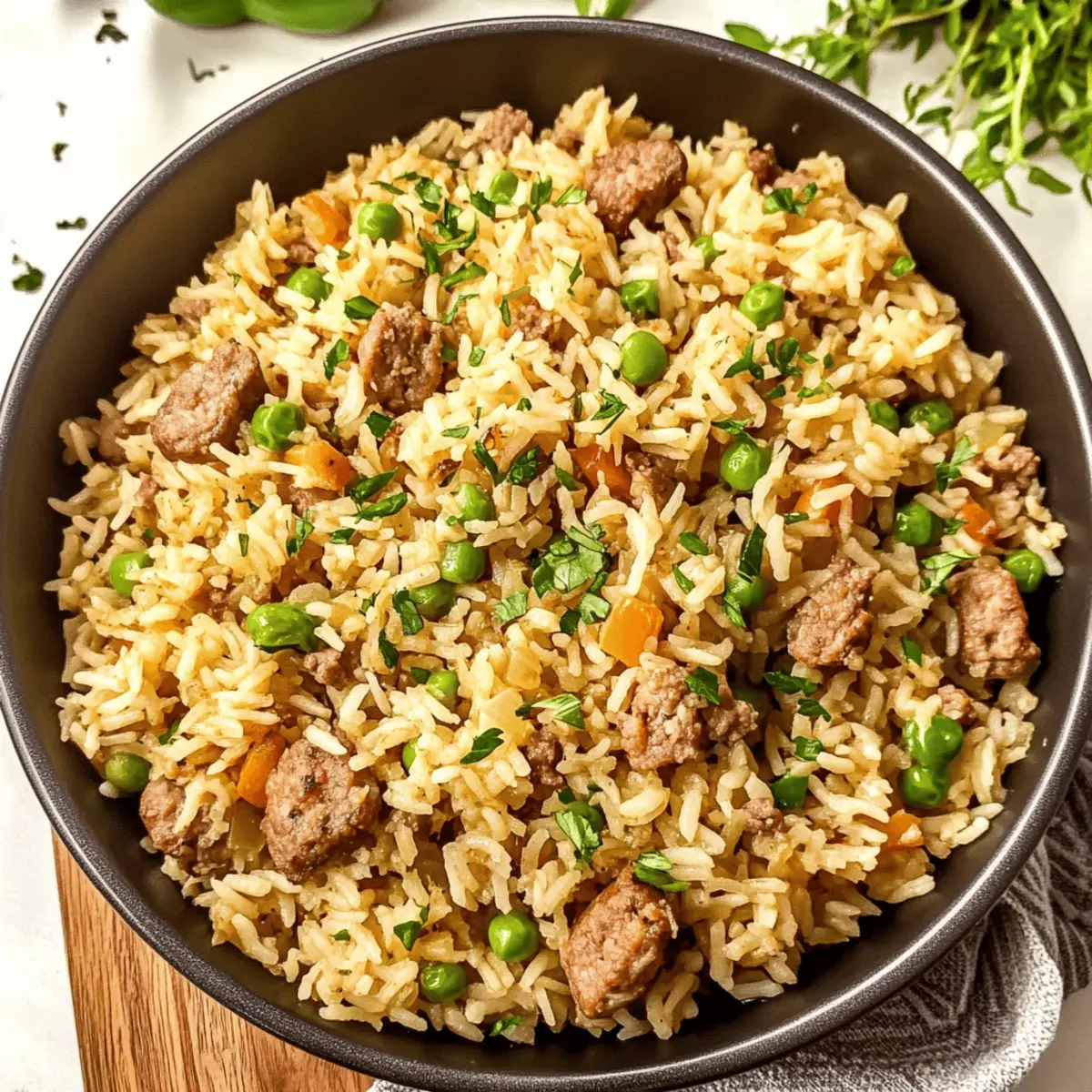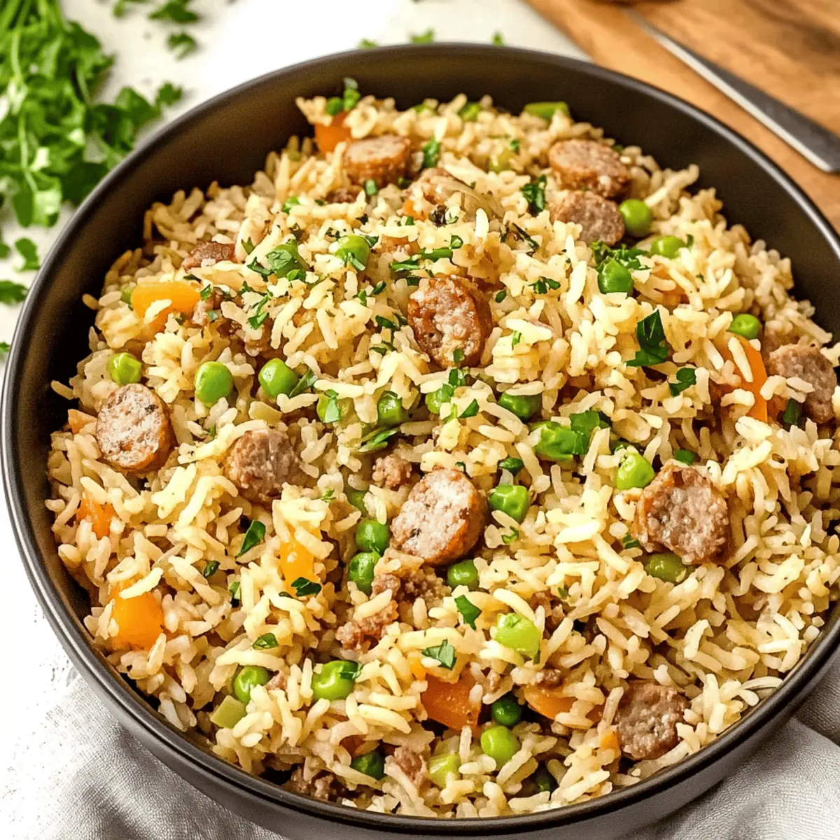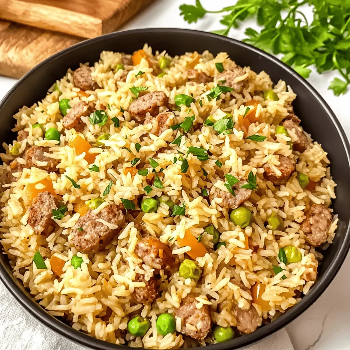 Jump to Recipe Print RecipeAs the aroma of sizzling sausage and caramelizing onions fills my kitchen, I can’t help but smile at the memories this dish evokes. My Easy Dirty Rice with Sausage is a twist on a classic Cajun recipe, celebrating those vibrant flavors that warm the soul while being a breeze to make. In just under 30 minutes, you’ll have a hearty, gluten-free meal that satisfies without the fuss. The beauty of this dish lies in its versatility; whether you prefer savory turkey sausage or a meat-free option like crumbled tofu, it’s tailored to suit your taste. Plus, it’s a one-pan wonder, making cleanup almost effortless! Have I tempted your taste buds yet? Let’s dive into this simple, satisfying recipe. Why is This Dirty Rice Recipe Unforgettable? Simplicity: This Easy Dirty Rice with Sausage is ready in just 30 minutes, perfect for busy nights when you crave flavor without the fuss. Versatile Options: Whether you choose hearty sausage or a veggie option with crumbled tofu, this dish caters to all diets, keeping everyone happy. Robust Flavors: Bursting with Cajun spices, the combination of savory sausage, colorful vegetables, and aromatic herbs creates a delightful blend that’s sure to impress. One-Pan Wonder: With everything cooked in a single skillet, cleanup is a breeze, allowing you more time to enjoy your meal. Crowd-Pleaser: Serve it alongside cornbread or a refreshing salad for a complete, satisfying dinner that even picky eaters will love! For more delicious recipes, check out these Cheesy Sausage Muffins and Rotel Sausage Dip. Easy Dirty Rice with Sausage Ingredients For the Sausage Sausage – Provides savory protein and flavor; substitute with turkey or chicken sausage for a lighter option. For the Vegetables Onions – Adds sweetness and aromatic depth; yellow onions work well, but white or red can be used as alternatives. Green Bell Peppers – Key for traditional flavor and color; can substitute with red or yellow bell peppers for varying sweetness. Celery – Contributes crunch and fresh taste; essential for the dish’s signature flavor profile. Garlic Cloves – Enhances aroma and taste; adjust quantity based on personal preference. For the Seasoning Cajun Spice – Provides characteristic heat and flavor; it’s crucial for authentic dirty rice; adjust for spiciness level. Salt – Enhances overall flavor; adjust based on the type of broth used. Black Pepper – Adds heat and flavor; can be omitted or adjusted based on taste preference. Thyme – Offers herbal notes; fresh thyme is preferable, but dried works too. For the Rice Long Grain Rice – Main carbohydrate source, providing structure; substitutable with basmati or jasmine rice. Chicken Broth – Adds moisture and depth of flavor; ensure it’s certified gluten-free if needed. For the Garnish Scallions – Used for garnish, adding freshness and color; can be substituted with parsley or chives. Now you’re all set to create this easy dirty rice with sausage, packed with flavors that will surely meet your cravings! Step‑by‑Step Instructions for Easy Dirty Rice with Sausage Step 1: Cook the Sausage In a large nonstick skillet, heat the pan over medium heat and add your choice of sausage, breaking it into small pieces with a spatula. Cook for about 5–7 minutes, or until the sausage is browned and no longer pink. Once cooked, use a slotted spoon to remove the sausage and set it aside, leaving a little fat in the pan for extra flavor. Step 2: Sauté Vegetables In the same skillet, add diced onions, chopped green bell peppers, and sliced celery. Sauté the vegetables over medium heat for about 3–5 minutes until they begin to soften and the onions become translucent. The vibrant colors of the vegetables will signal it’s time to move on to enhance the flavors further. Step 3: Add Garlic and Spices Stir in minced garlic, Cajun spice, salt, and black pepper into the sautéed vegetables. Cook everything together for an additional 30 seconds, allowing the garlic to become fragrant and the spices to bloom. The aromas will fill your kitchen, letting you know that you’re on track for a delightful Easy Dirty Rice with Sausage. Step 4: Combine Rice and Liquid Next, add washed long grain rice to the skillet, stirring to coat it with the spicy vegetable mixture. Pour in chicken broth, adding fresh thyme and bay leaves for depth of flavor. Once combined, return the cooked sausage to the skillet and stir everything together until evenly mixed. Step 5: Cook the Rice Increase the heat to high and bring the mixture to a boil. After it reaches a rolling boil, cover the skillet with a lid, reduce the heat to low, and let it simmer for about 18 minutes. The rice should absorb the liquid and become tender; check that it has a fluffy texture and that any liquid has evaporated. Step 6: Garnish and Serve Once the rice is cooked, remove the skillet from heat and let it sit for a few minutes. Fluff the rice with a spoon, discarding the bay leaves, and garnish with freshly chopped scallions for a pop of color. Your Easy Dirty Rice with Sausage is now ready to be served, bringing a warm and hearty meal to your family table! What to Serve with Easy Dirty Rice with Sausage? Elevate your dining experience by pairing this vibrant dish with sides that complement its rich flavors and hearty texture. Cornbread: The sweet and crumbly texture of cornbread balances the heat of the dirty rice, making for a delightful pairing. Simple Green Salad: Fresh greens tossed with a light vinaigrette provide a refreshing contrast to the savory sausage, enhancing the overall meal. Roasted Vegetables: A medley of seasonal roasted vegetables adds a crispy texture and subtle sweetness, harmonizing beautifully with the dish. Garlic Bread: Soft and buttery garlic bread is perfect for soaking up any leftover rice, adding a flavorful crunch to each bite. Coleslaw: The crisp and tangy notes of coleslaw create a delicious contrast to the warmth 