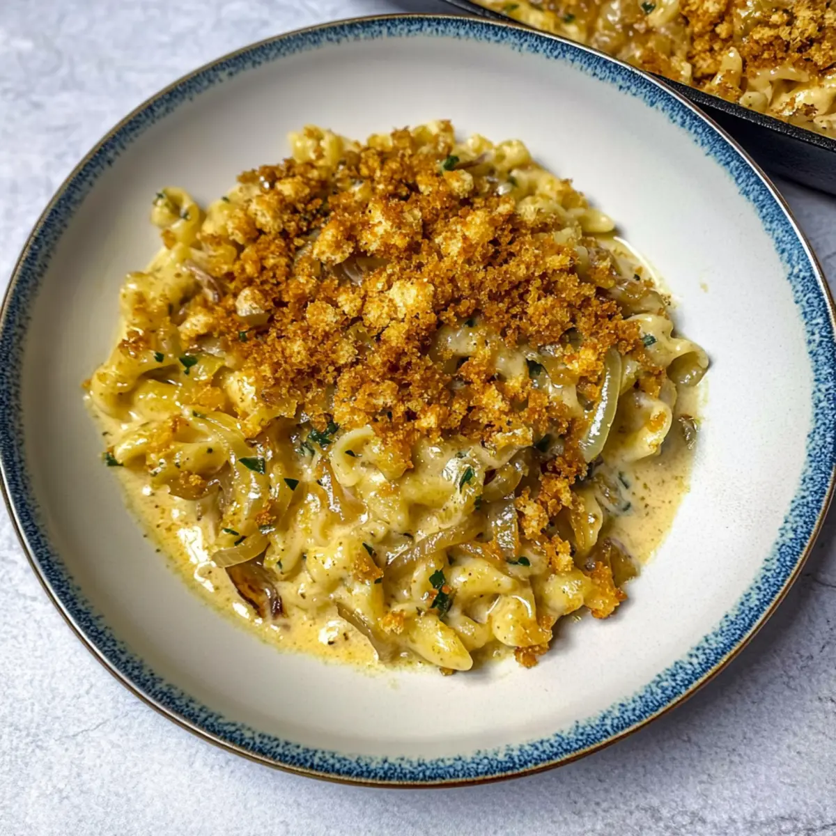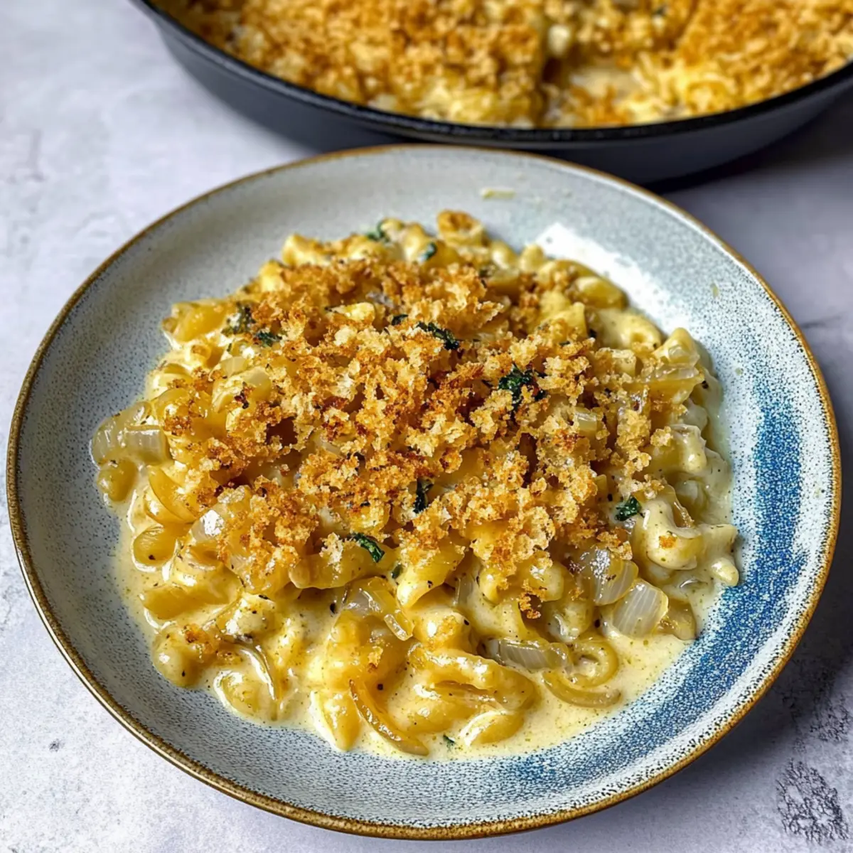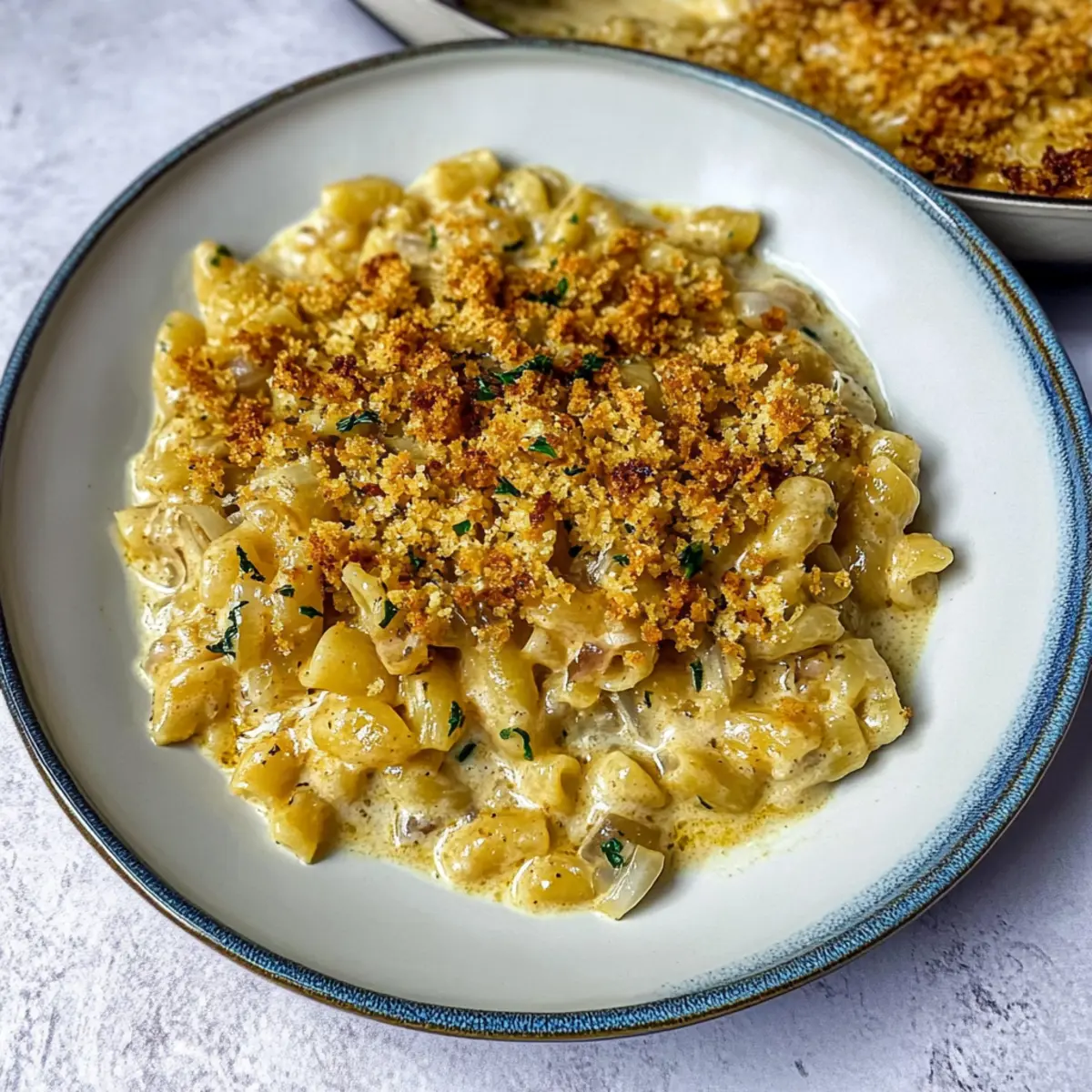 Jump to Recipe Print RecipeThere’s something magical about the smell of onions slowly caramelizing on the stove. As the sweet, golden strands transform in the pan, I can’t help but feel a wave of comfort wash over me—especially when combining them with creamy béchamel in this delightful French Onion Soup Pasta recipe. Perfect for those cozy nights in or festive gatherings, this dish is a hearty, vegetarian-friendly meal that won’t leave you missing the meat. With its quick prep time and delightful crunch from the crispy breadcrumbs, you’ll have a crowd-pleaser in no time. Ready to elevate your pasta game and indulge in pure comfort? Let’s dive into the world of creamy goodness together! Why Try French Onion Soup Pasta? Comforting Flavors: This dish combines the classic richness of French onion soup in a pasta format, making it cozy and satisfying. Ease of Preparation: With minimal steps, this recipe is approachable for cooks of all levels. Prepare to impress without the stress! Versatile Ingredients: Swap out the pasta or play with herbs to make it your own or try a delicious Buffalo Chicken Pasta variation! Quick Cooking Time: Enjoy a hearty meal in under an hour, leaving more time to savor the moments with your loved ones. Crowd-Pleasing Appeal: Ideal for family dinners or gatherings, this dish is bound to become a new favorite among both friends and family! French Onion Soup Pasta Ingredients For the Breadcrumbs • Baguette – Use fresh baguette for the best texture; panko or store-bought breadcrumbs are a great alternative. For the Pasta • Cavatappi Macaroni – The perfect pasta base for capturing the creamy béchamel; feel free to swap with penne or fusilli. For the Onions • Onions (5, thinly sliced) – Yellow onions bring the sweetest flavor; consider cutting back to 3 for a milder taste. For Cooking • Olive Oil – Essential for caramelizing onions and enhancing flavors; can be replaced with any cooking oil you prefer. • Salt – Balances the flavors; choose sea salt or kosher salt for best results. • Pepper – Adds warmth and a touch of spice to the overall dish. • Garlic Powder (1 tablespoon) – Enhances the flavor profile; fresh garlic can also be utilized if desired. For the Béchamel Sauce • Butter – Typically 1-2 tablespoons, essential for creating a silky béchamel; can be omitted if using oil for a dairy-free version. • Flour (1 tablespoon + 3 tablespoons water) – Thickens the béchamel; replace with cornstarch for gluten-free option. • Heavy Cream (3 cups) – Provides richness in the sauce; coconut milk or dairy-free cream are excellent substitutes for a lighter option. • Nutmeg (½ teaspoon) – Adds an aromatic warmth to the dish; it’s optional but recommended! For Flavoring • Beef Broth (½ cup) – Deepens the flavor of the onions; swap with vegetable broth for a vegetarian alternative. • Oregano – Infuses herbal notes; can be replaced with thyme based on your preference. • Smoked Paprika Powder (1 tablespoon) – Adds a delightful smokiness; reduce the amount if you prefer a milder taste. • Sugar (1 teaspoon) – Optional, helps to caramelize onions faster for that beautiful golden color. For Garnishing • Fresh Parsley (chopped) – A bright, fresh touch to finish the dish. • Parmesan Cheese (1 cup, grated) – Adds richness to the béchamel; for a dairy-free version, nutritional yeast or plant-based cheese work wonderfully. Step‑by‑Step Instructions for French Onion Soup Pasta Step 1: Caramelize the Onions Heat 2 tablespoons of olive oil in a large skillet over medium heat. Add 5 thinly sliced yellow onions and sprinkle with a pinch of salt. Sauté the onions for 30-40 minutes, stirring occasionally until they turn a deep golden brown and become soft. If the onions begin to stick, deglaze the pan by adding ½ cup of beef broth for added flavor. Step 2: Prepare the Béchamel Sauce In the same skillet with the caramelized onions, melt 2 tablespoons of butter over medium heat. Once melted, whisk in 1 tablespoon of flour for about 1 minute until light golden. Gradually pour in 3 cups of heavy cream, whisking constantly until the mixture thickens and becomes smooth, about 5–7 minutes. If any lumps form, add a splash of ice-cold water and whisk until again smooth. Step 3: Combine Ingredients Mix ⅔ of the caramelized onions into the béchamel sauce, then stir in 1 cup of grated Parmesan cheese, a sprinkle of salt, pepper, and fresh chopped parsley. Meanwhile, bring a pot of salted water to boil and cook 12 ounces of cavatappi macaroni until al dente. Drain the pasta and gently fold it into the creamy sauce until evenly coated. Step 4: Assemble and Bake Transfer the pasta mixture into a greased baking dish, spreading it evenly. Top with the remaining caramelized onions and a generous layer of crispy breadcrumbs. Preheat your oven to 350°F (175°C) and bake the dish uncovered for 10-15 minutes, or until the top is golden brown and bubbling. Step 5: Serve and Enjoy Once baked to perfection, remove the French Onion Soup Pasta from the oven and allow it to cool slightly. Garnish with additional fresh parsley for a pop of color. Serve immediately alongside a crisp salad or some garlic bread for a comforting meal. Make Ahead Options These Creamy French Onion Soup Pasta are perfect for meal prep! You can caramelize the onions and prepare the béchamel sauce up to 3 days in advance. Simply store them separately in airtight containers in the refrigerator to maintain their quality. When you’re ready to enjoy this comforting dish, cook the pasta fresh and then mix it with the prepped sauces. Assemble the pasta in a baking dish, top it with crispy breadcrumbs, and bake for about 15 minutes until golden. This way, you’ll have a delicious, restaurant-quality meal at your fingertips with minimal effort—perfect for busy weeknights or gatherings! What to Serve with Creamy French Onion Soup Pasta? Elevate your cozy me